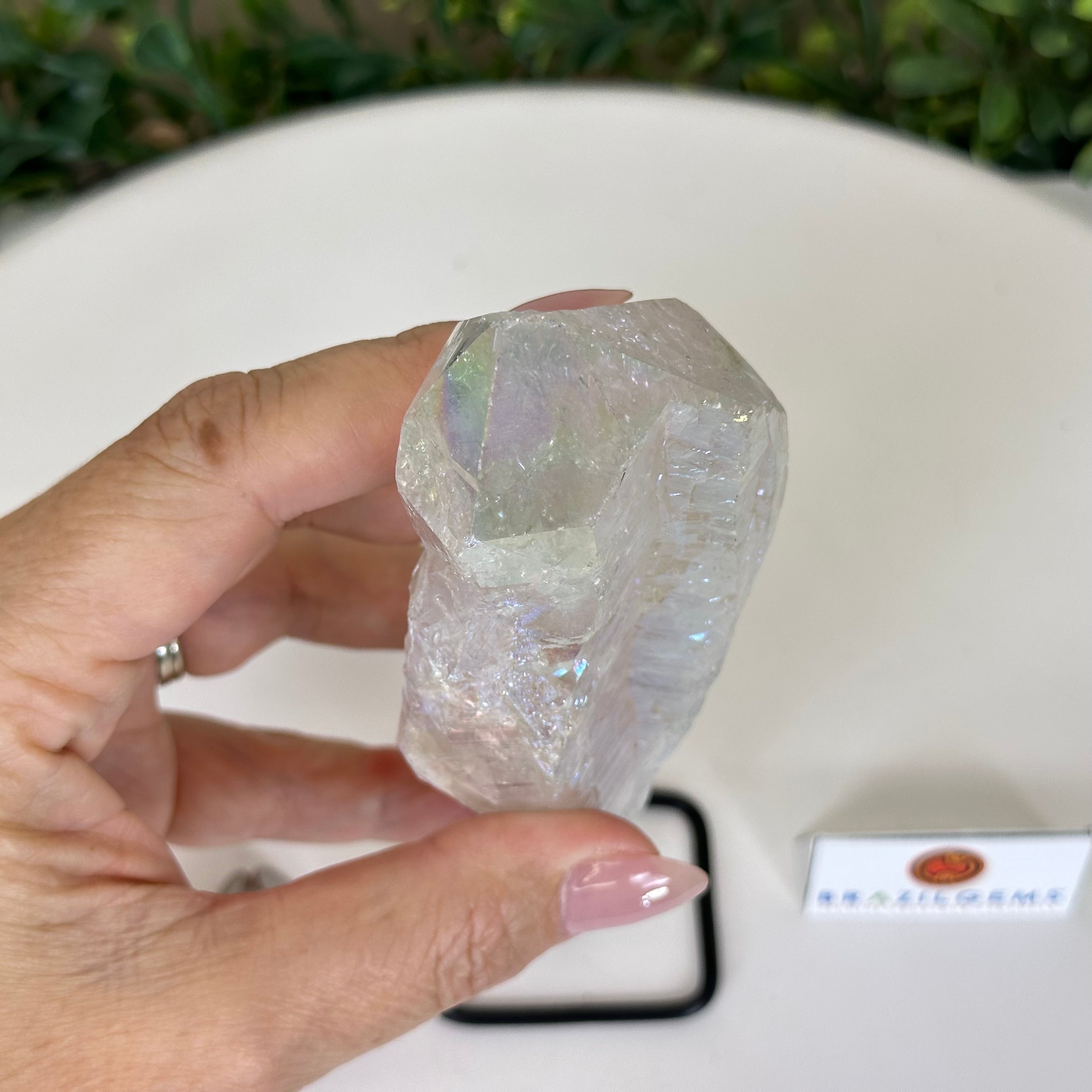 Disclaimer: This is a natural gemstone crystal sold by Brazil Gems® as is and as you see it in its images and video. It is the exact one you will receive. It may contain natural imperfections and/or imperfections, broken edges and repairs from the extraction, mounting and aura-effect bonding processes. The crystal has a hole drilled into the bottom of it so it could be mounted onto its black-painted metal stand. The Angel Aura effect is achieved through a process called vacuum deposition where vaporized metals such as silver and/or platinum are bonded to the natural crystal in a vacuum chamber giving it that iridescent pearlized sheen. At Brazil Gems® we make every effort to get measurements as exact as possible but they are done by human hands and eyes and therefore may have minor discrepancies.