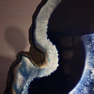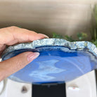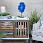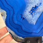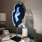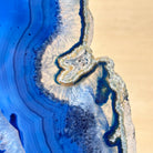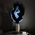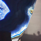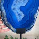 Enhance your decor with this bright slice of Brazilian Blue Agate (dyed blue) beautifully placed on a metal stand by Brazil Gems®. With its striking colors, well defined bands and drusy crystals, this is nature's work of millions of years now available to you.