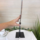 Disclaimer: This is a natural gemstone crystal sold by Brazil Gems® as is and as you see it in its images and video. It is the exact one you will receive. It may contain natural imperfections and/or imperfections, broken edges, scratches, cracks and repairs from the extraction, slicing, polishing, mounting and prepping processes. The metal stand has been handmade to fit this specific gemstone and painted black. At Brazil Gems® we make every effort to get measurements as exact as possible but they are done by human hands and eyes and therefore may have minor discrepancies.