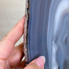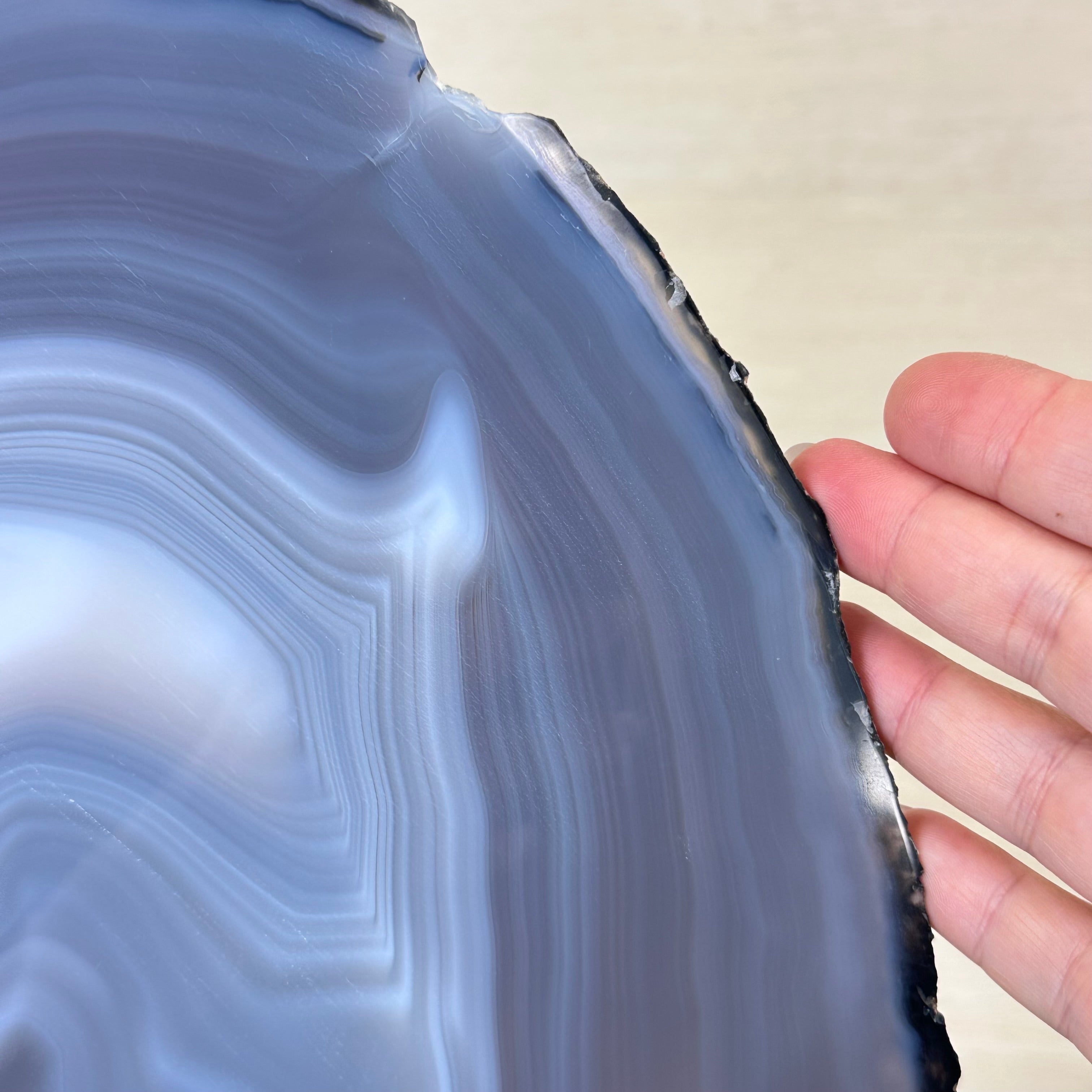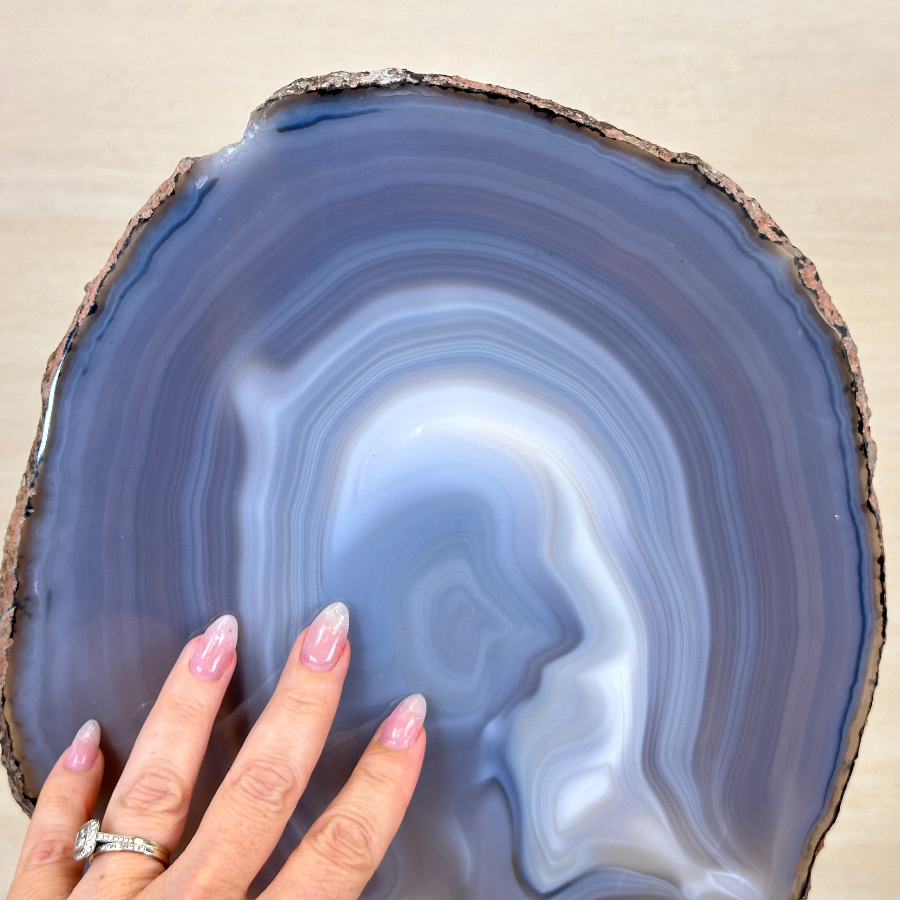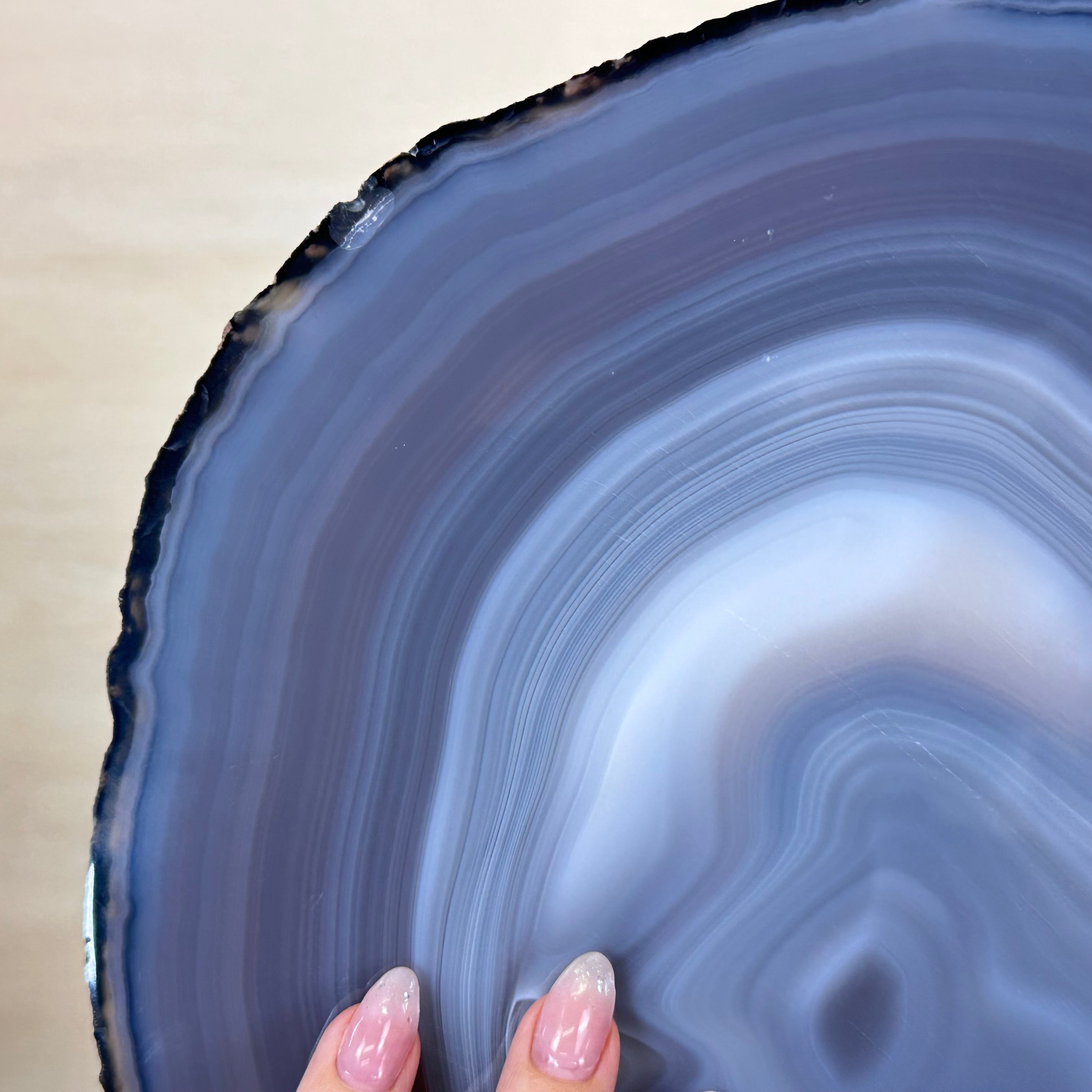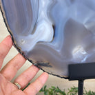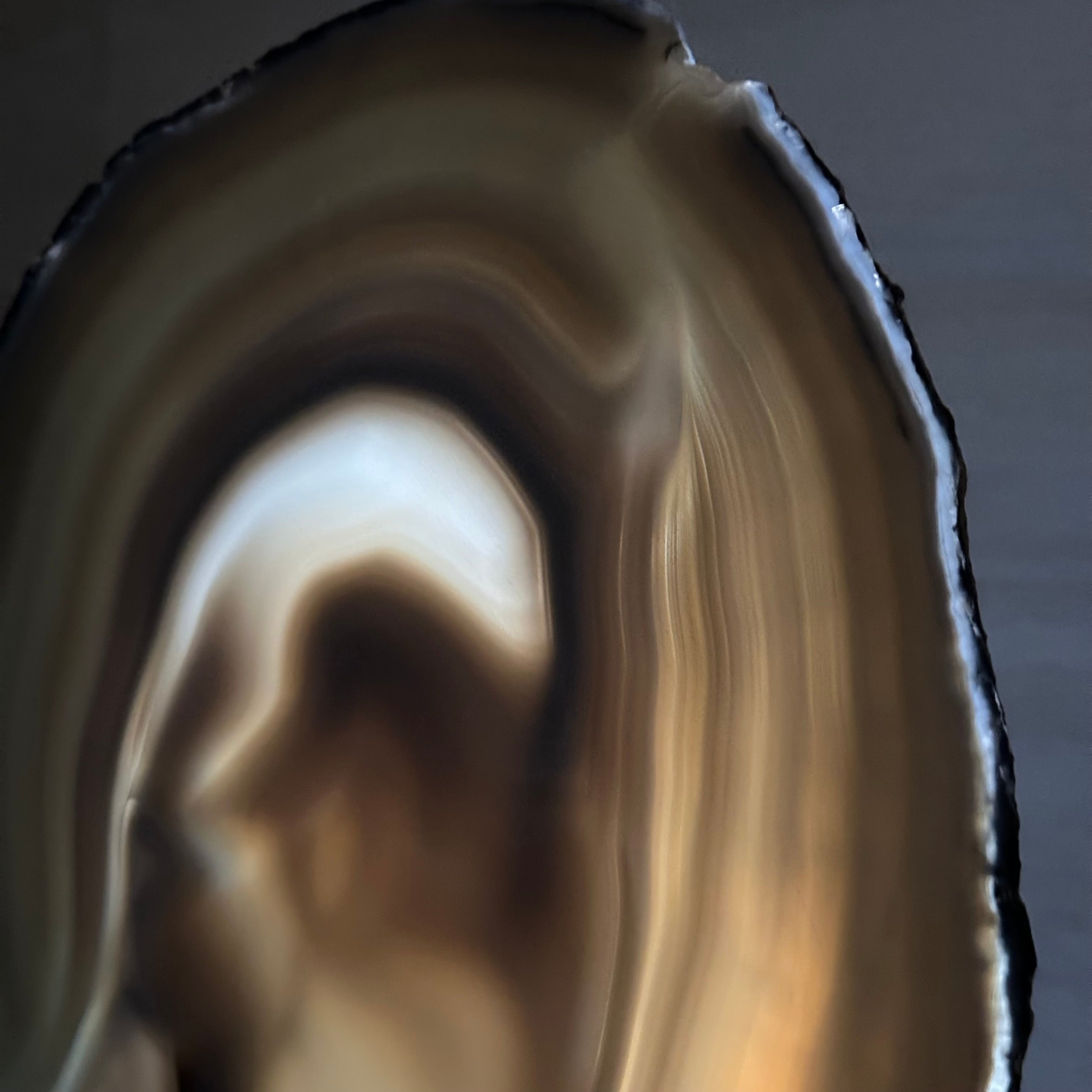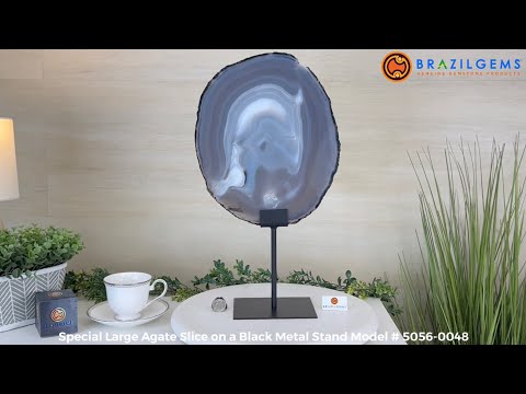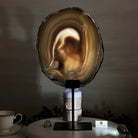 Own a masterpiece of nature with this magnificent Brazilian agate slice—a statement piece that commands attention in any interior. Crafted over millions of years and expertly mounted on a metal stand, this rare gemstone captivates with its mesmerizing bands and luminous color depths. Watch it transform when positioned against natural light or backlit, revealing the translucent beauty that makes agate truly special.