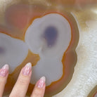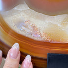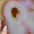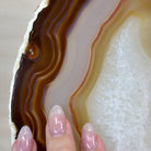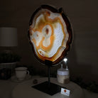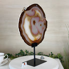 Own a masterpiece of nature with this magnificent Brazilian agate slice—a statement piece that commands attention in any interior. Crafted over millions of years and expertly mounted on a metal stand, this rare gemstone captivates with its mesmerizing bands and luminous color depths. Watch it transform when positioned against natural light or backlit, revealing the translucent beauty that makes agate truly special.