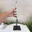 Disclaimer: This is a natural gemstone crystal sold by Brazil Gems® as is and as you see it in its images and video. It is the exact one you will receive. It may contain natural imperfections and/or imperfections, broken edges, scratches, cracks and repairs from the extraction, slicing, polishing, mounting and prepping processes. The metal stand has been handmade to fit this specific gemstone and painted black. At Brazil Gems® we make every effort to get measurements as exact as possible but they are done by human hands and eyes and therefore may have minor discrepancies.