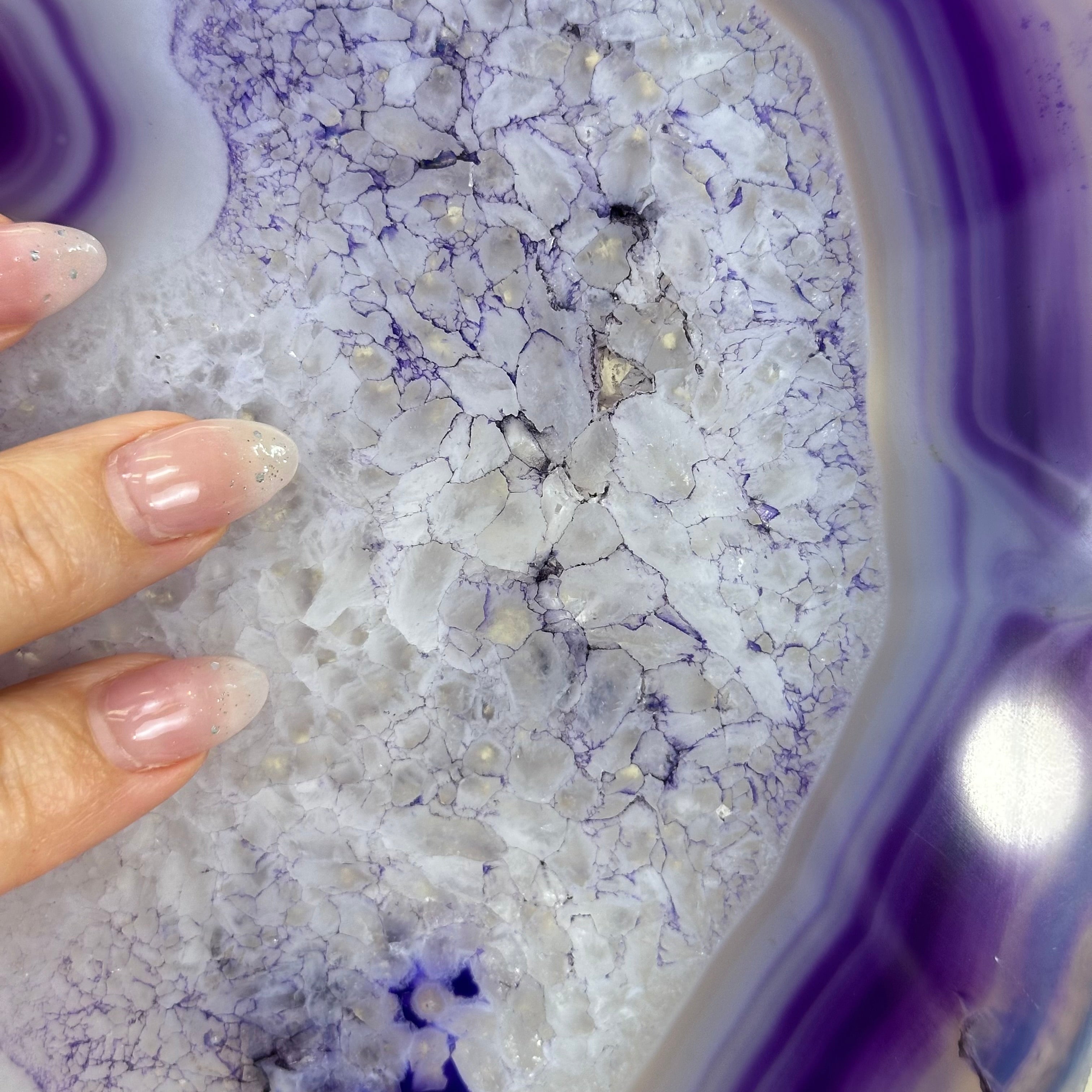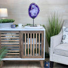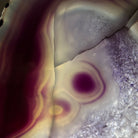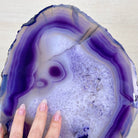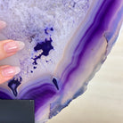 Bright slice of Brazilian Purple Agate (dyed purple) beautifully placed on a metal stand to display and enjoy. This gemstone will enhance any room décor with its striking colors, bands and crystals. Nature's work of millions of years now available to you.