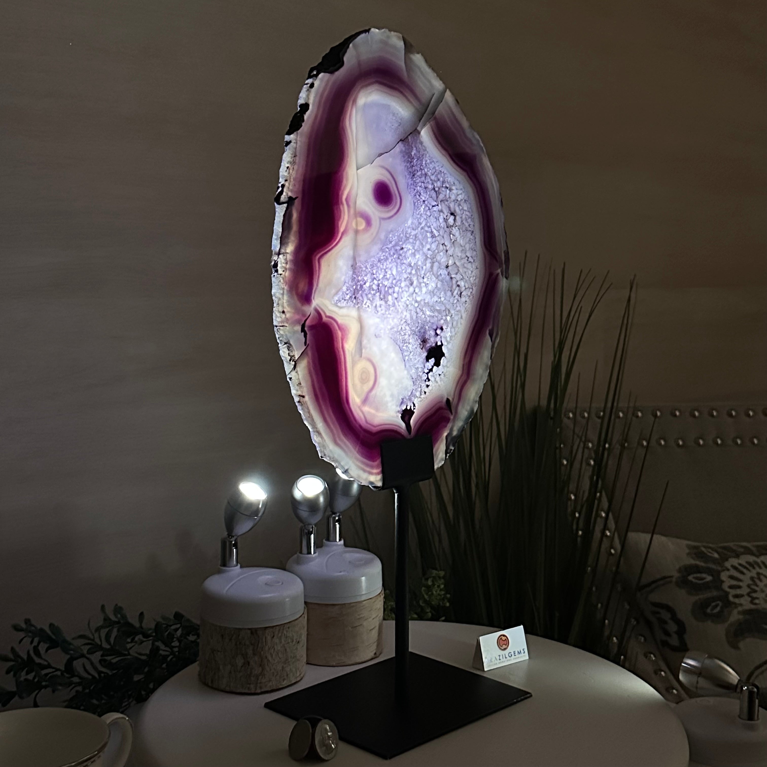 Brazilian Purple Agate Slice on Metal Base, 18.3" Tall #5065PU-055