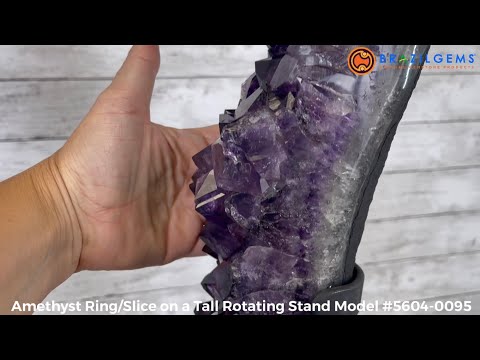 Brazil Gems® brings you this Super Quality Brazilian Amethyst Crystal Portal on a tall black rotating metal base. This amethyst slice has beautiful, large violet amethyst crystals you can enjoy from both sides!