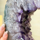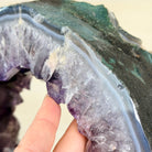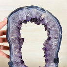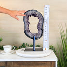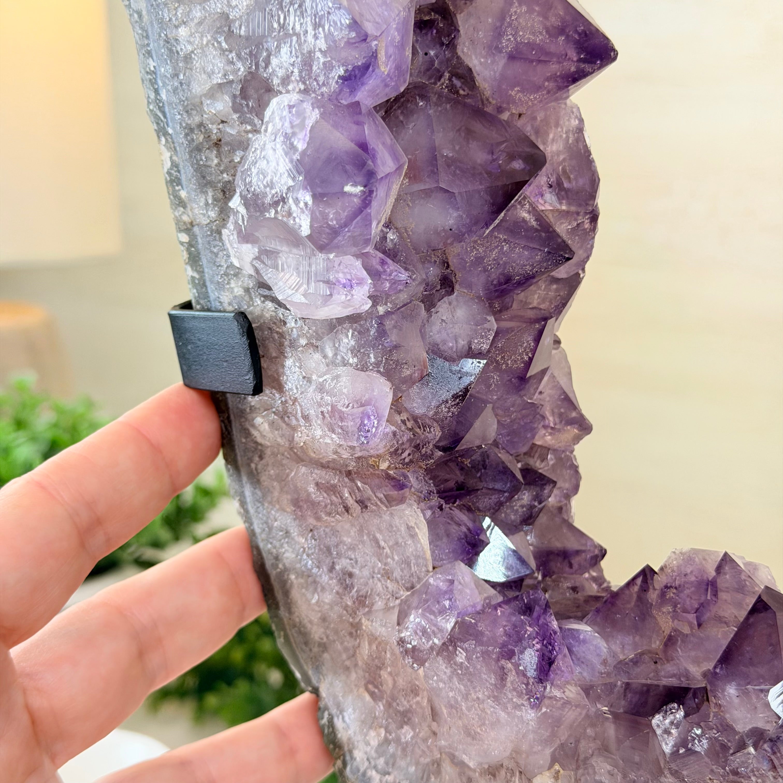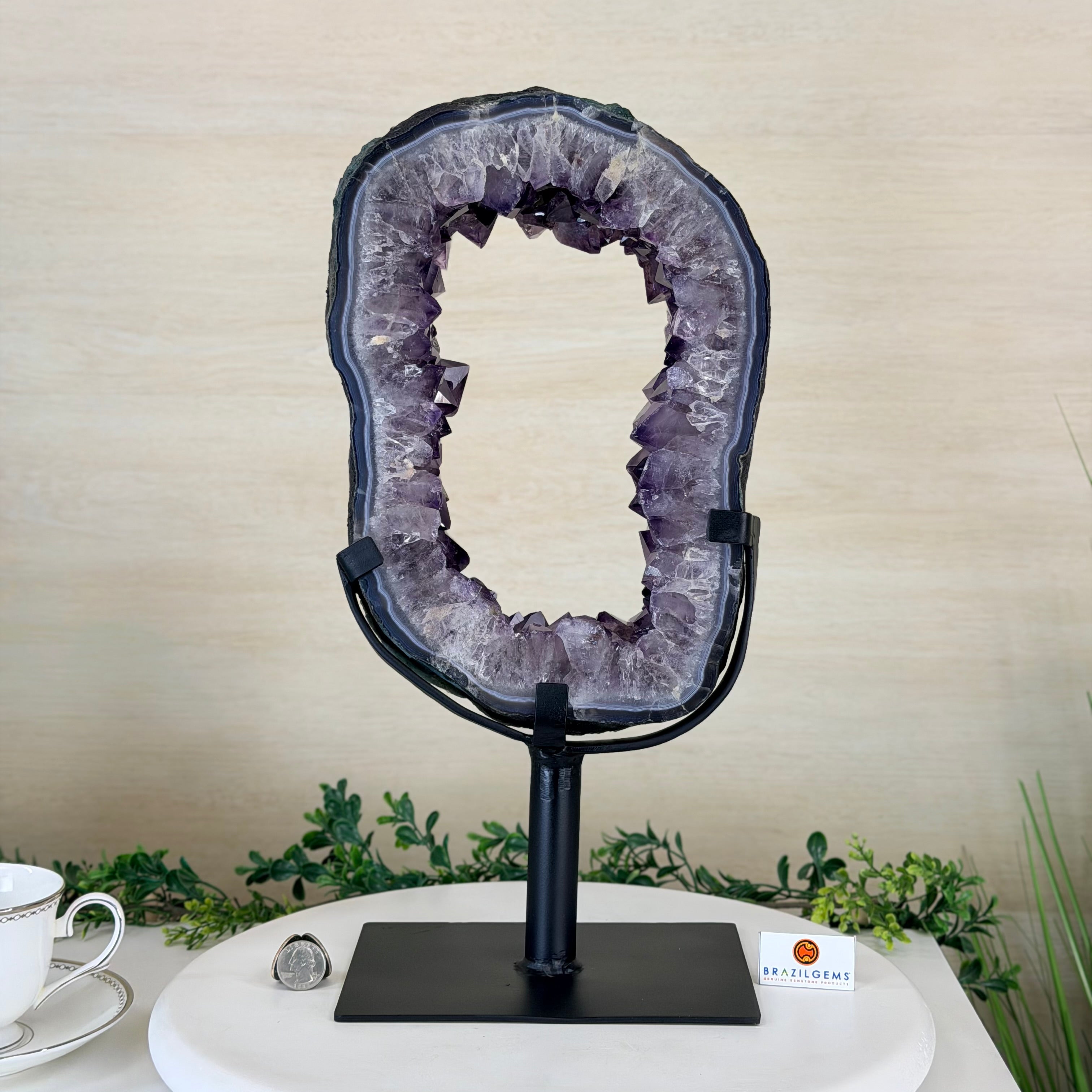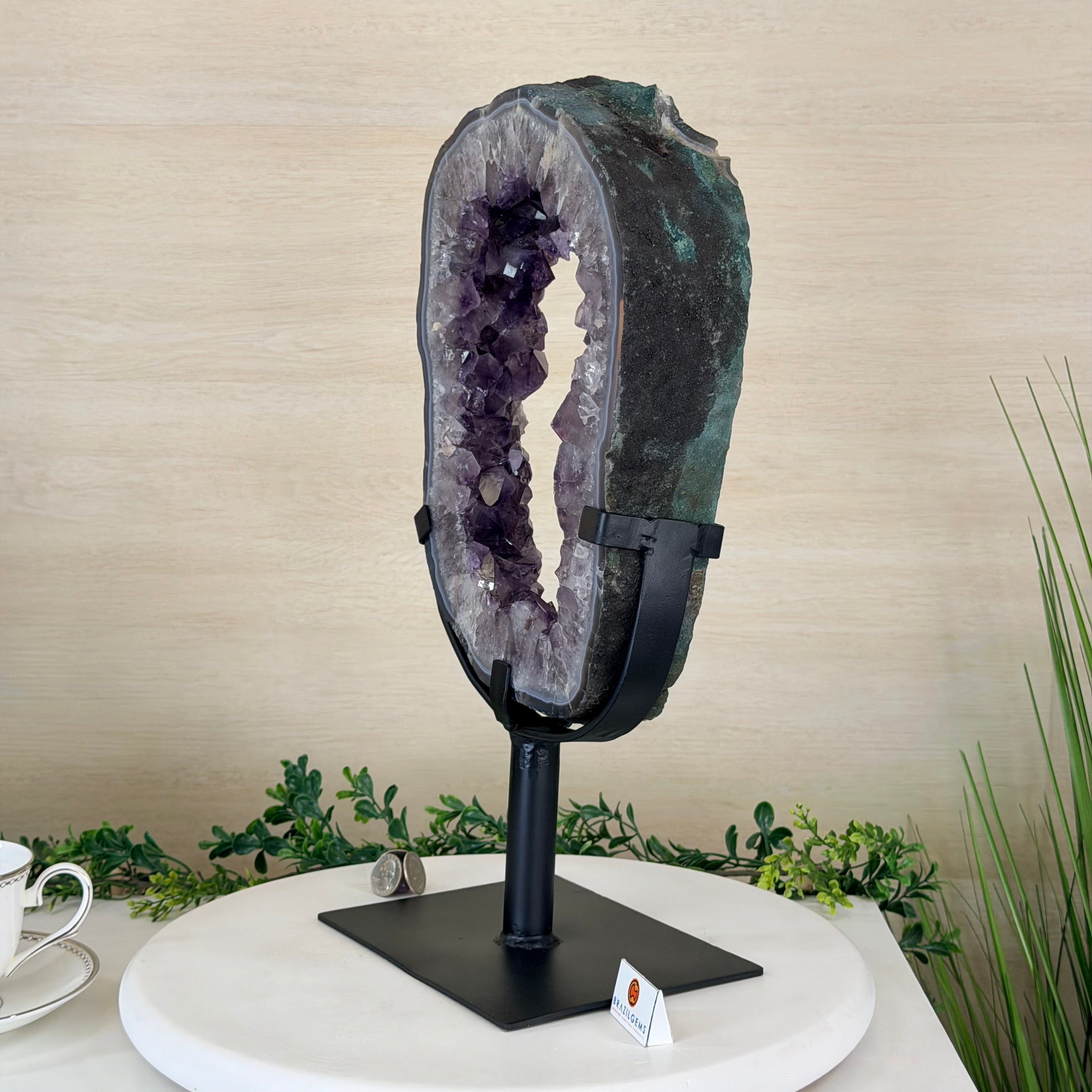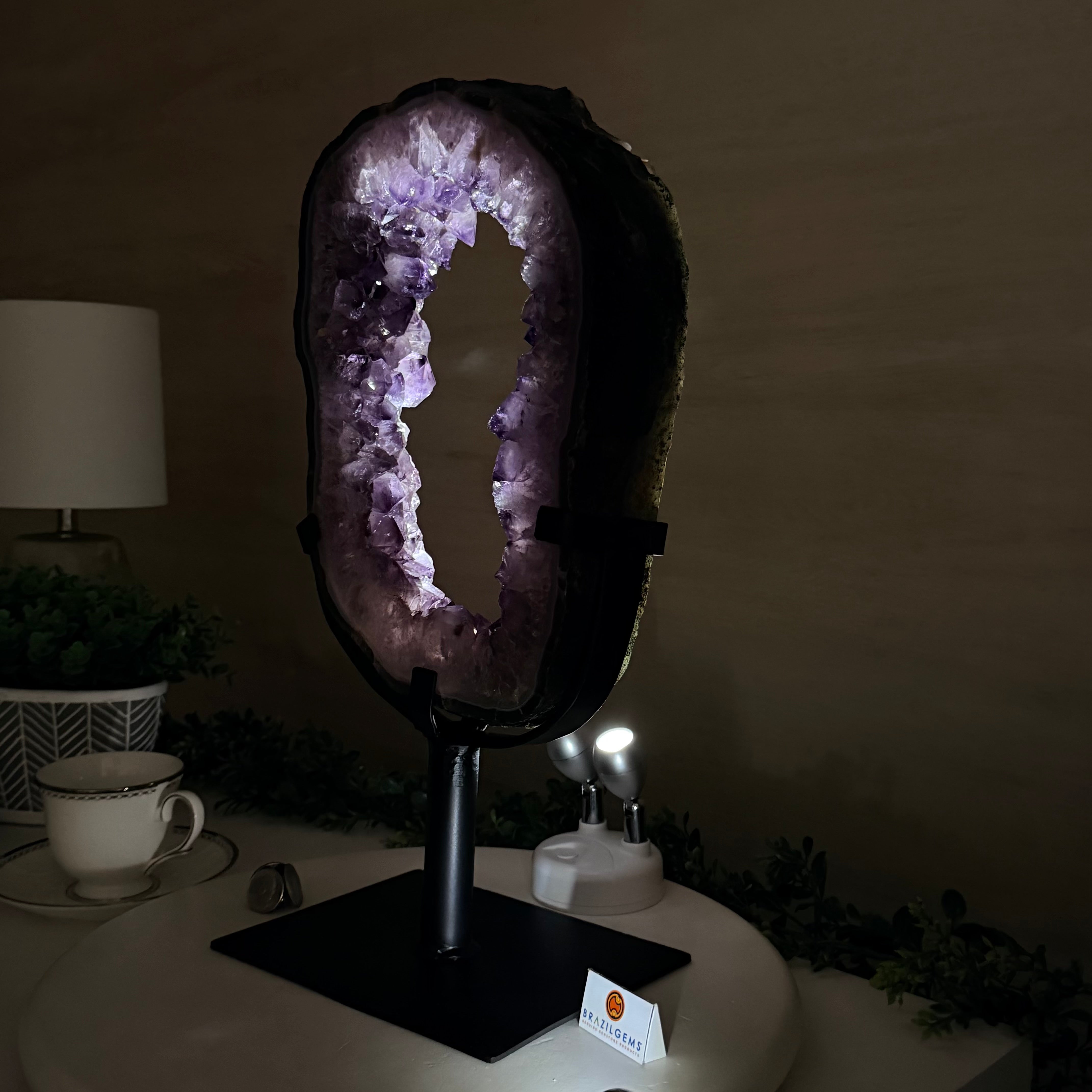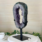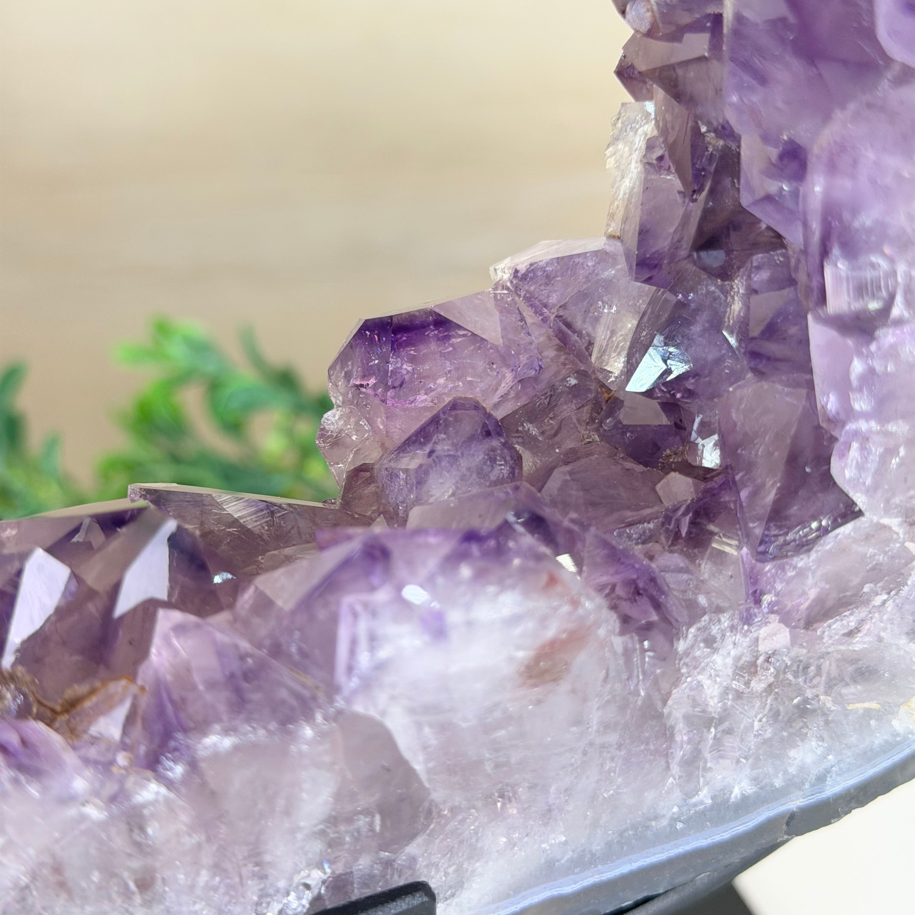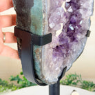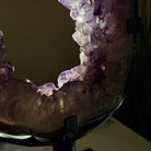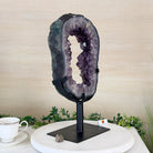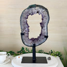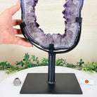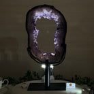 Unveil the charm of this natural Extra Quality Brazilian Amethyst Crystal "Portal" on a black metal fixed stand. Smoothly polished in the front side and rough on the back side, this piece has a natural outer shell. Very special!