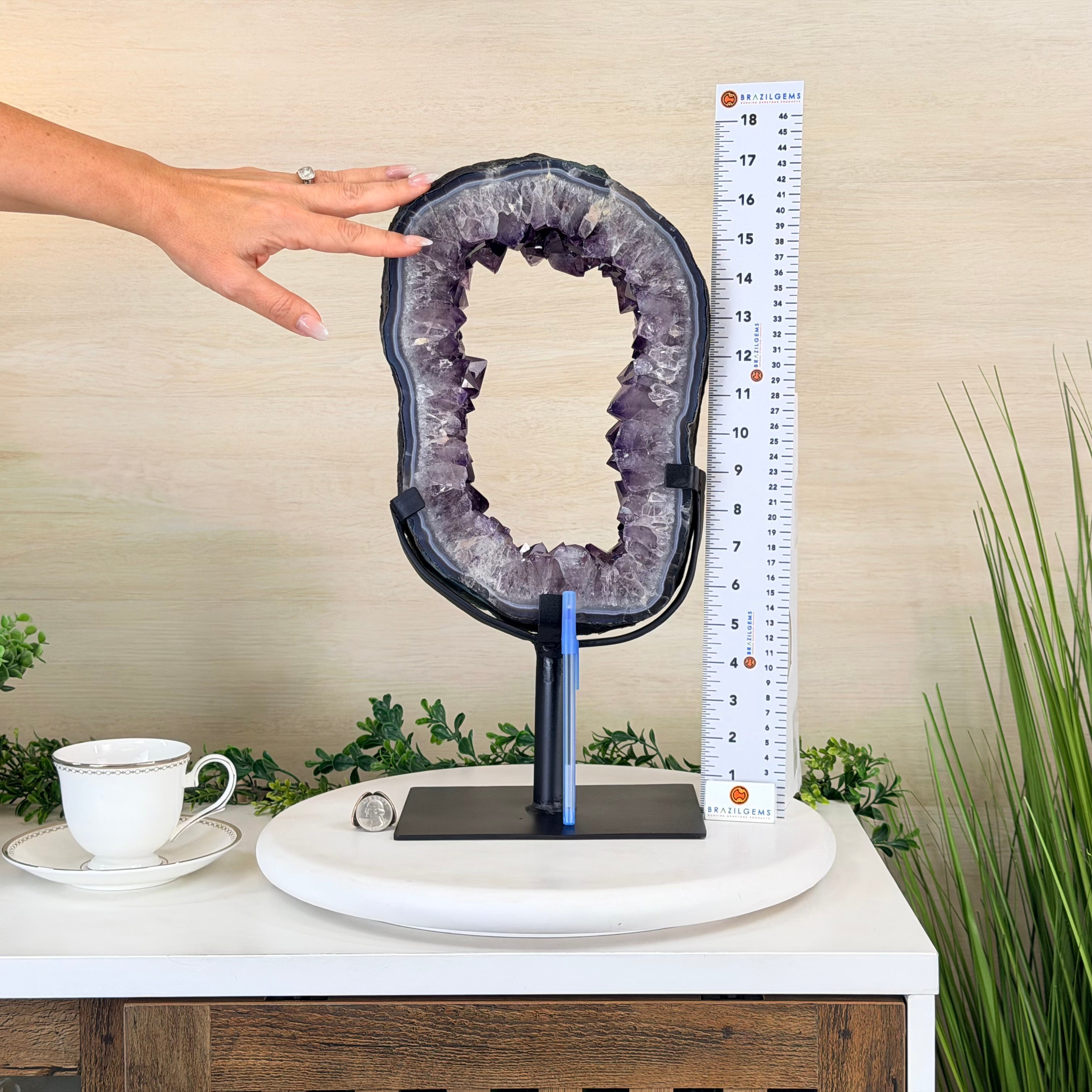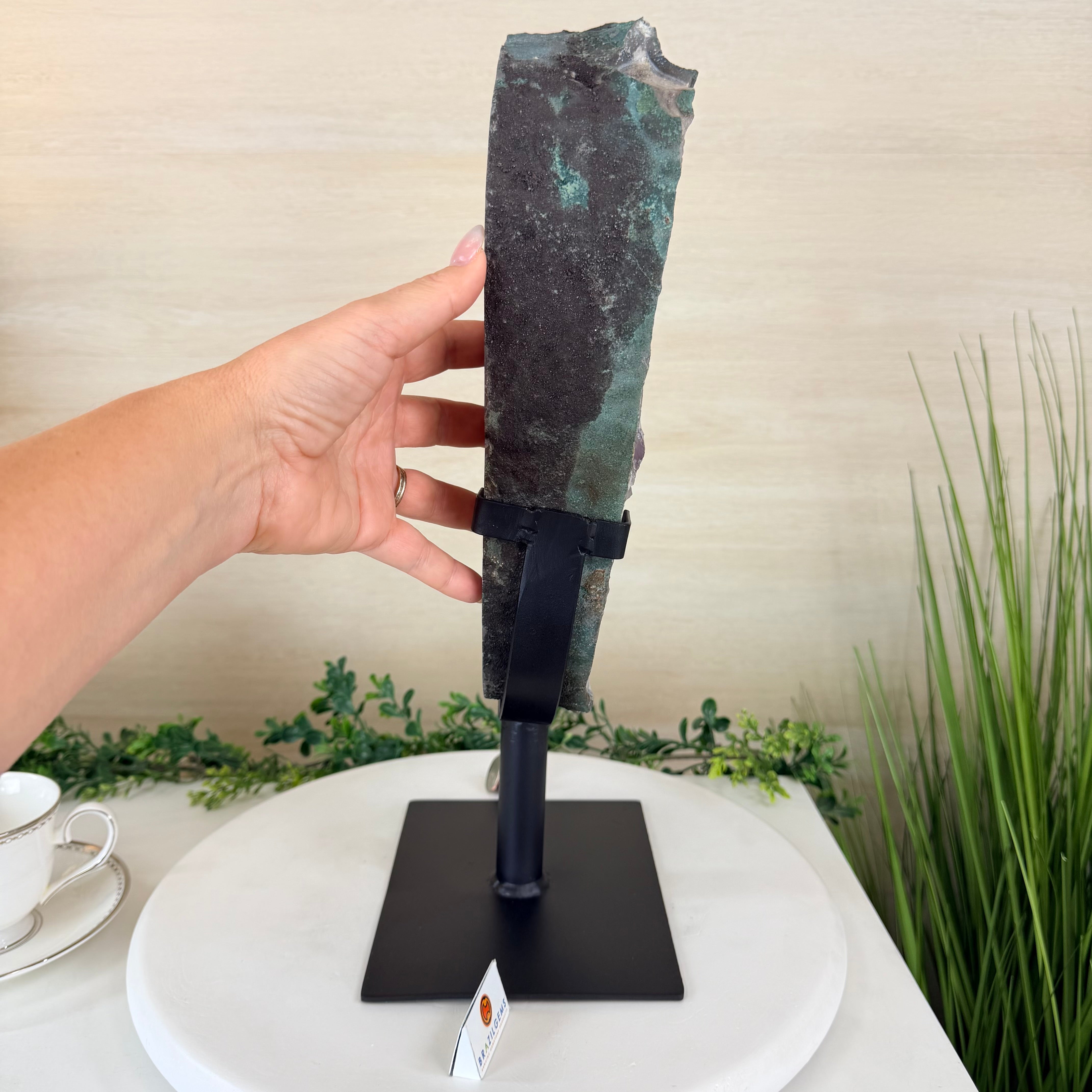 Disclaimer: This is a natural gemstone crystal sold by Brazil Gems® as is and as you see it in its images and video. It is the exact item you will receive. It may contain natural imperfections as well as imperfections, scratches, broken edges and repairs from the extraction, polishing and mounting processes. The base has been custom welded to fit this crystal and painted black.  At Brazil Gems® we make every effort to get measurements as exact as possible but they are done by human hands and eyes and therefore may have minor discrepancies.