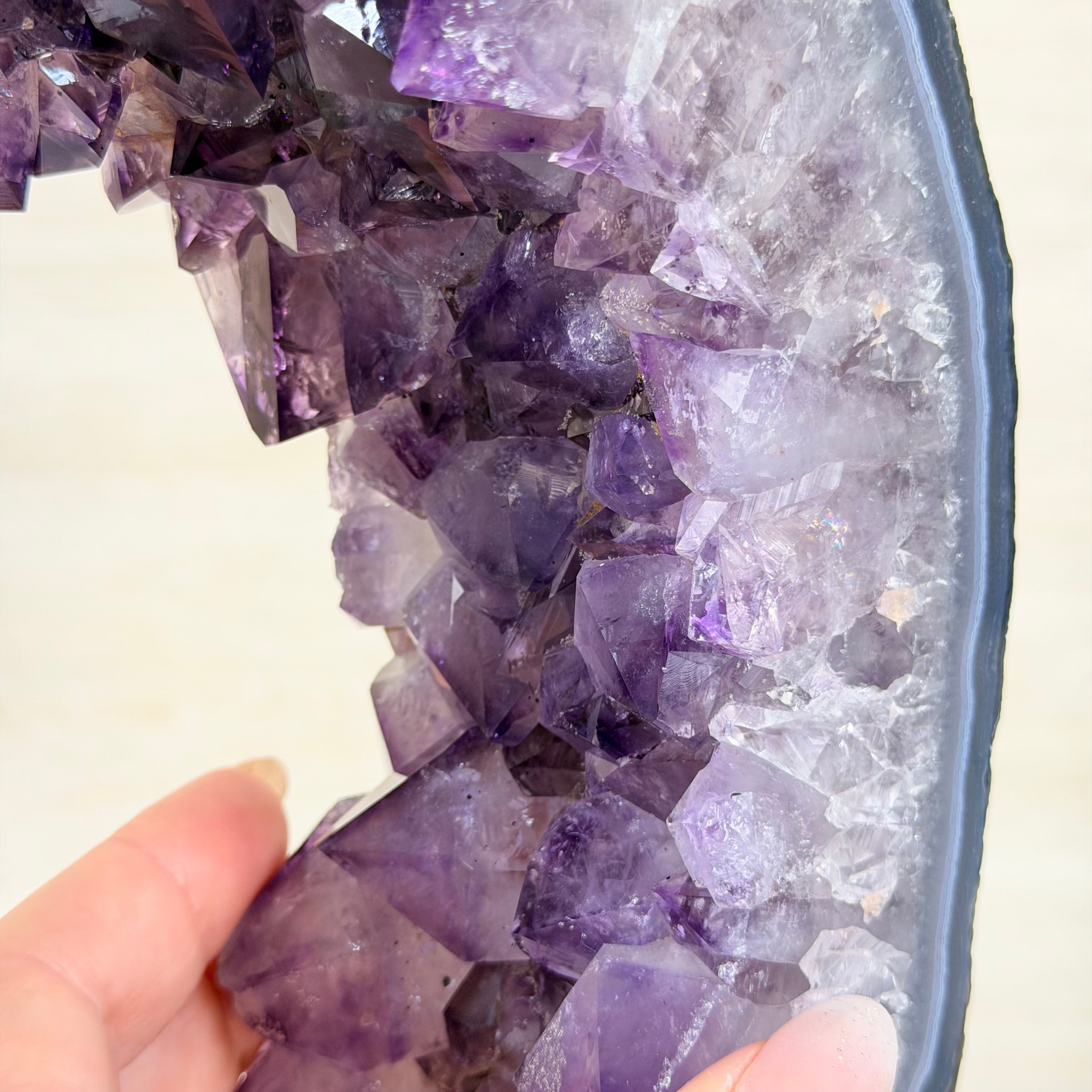 The formation of amethyst is a story of icy beauty crystallizing from a legacy of fire. Basaltic lava can cool with porous cavities that can be 15-feet long. As silica-rich waters run through these cavities, traces of silica leave the seeds of crystalline growth. The water’s iron content gives amethyst its signature purple color. Placement of amethyst in your environment is an invitation to let healing energy and the timelessness of the Earth take your journey to a higher plane. Protect your amethyst stones from direct sunlight to preserve their vibrancy.