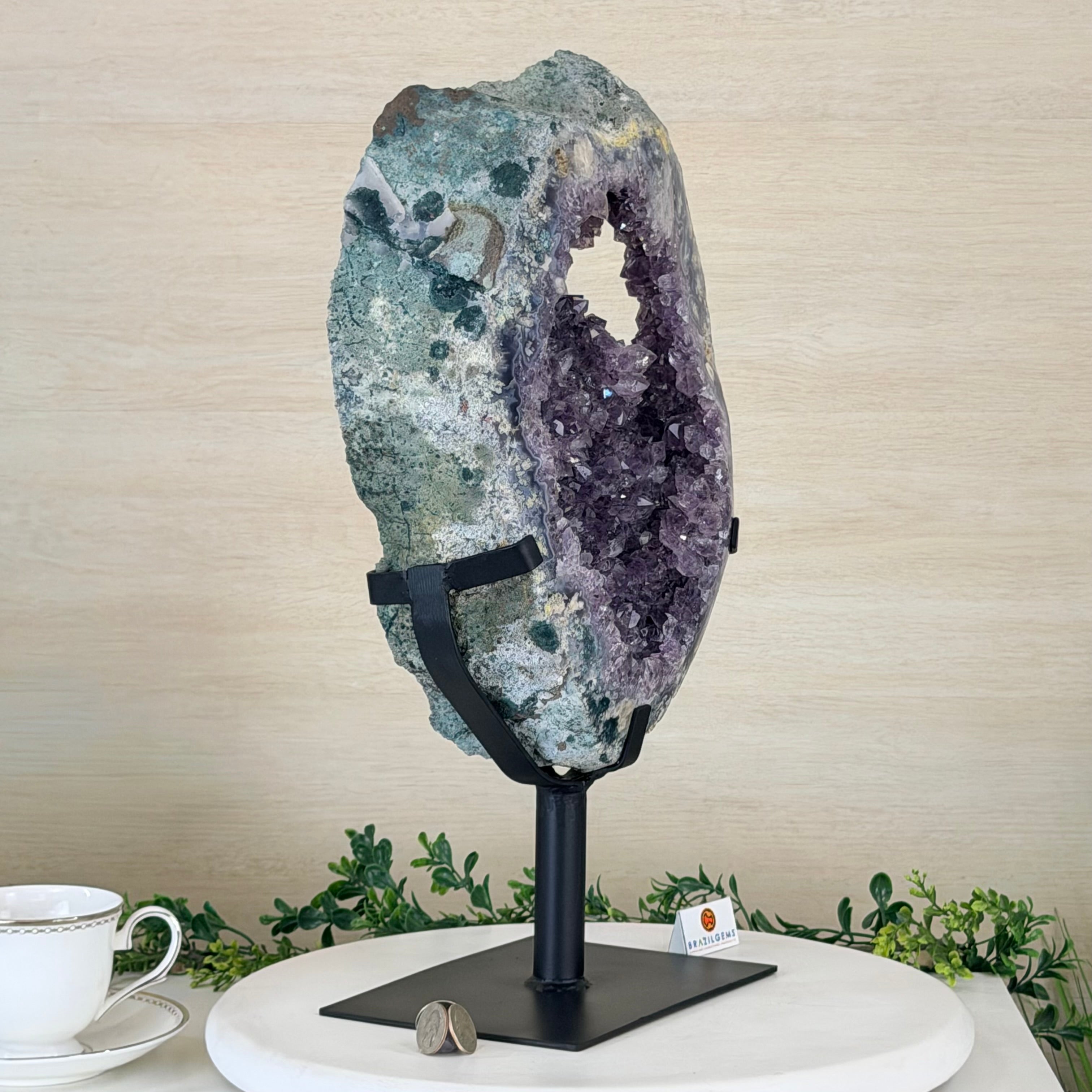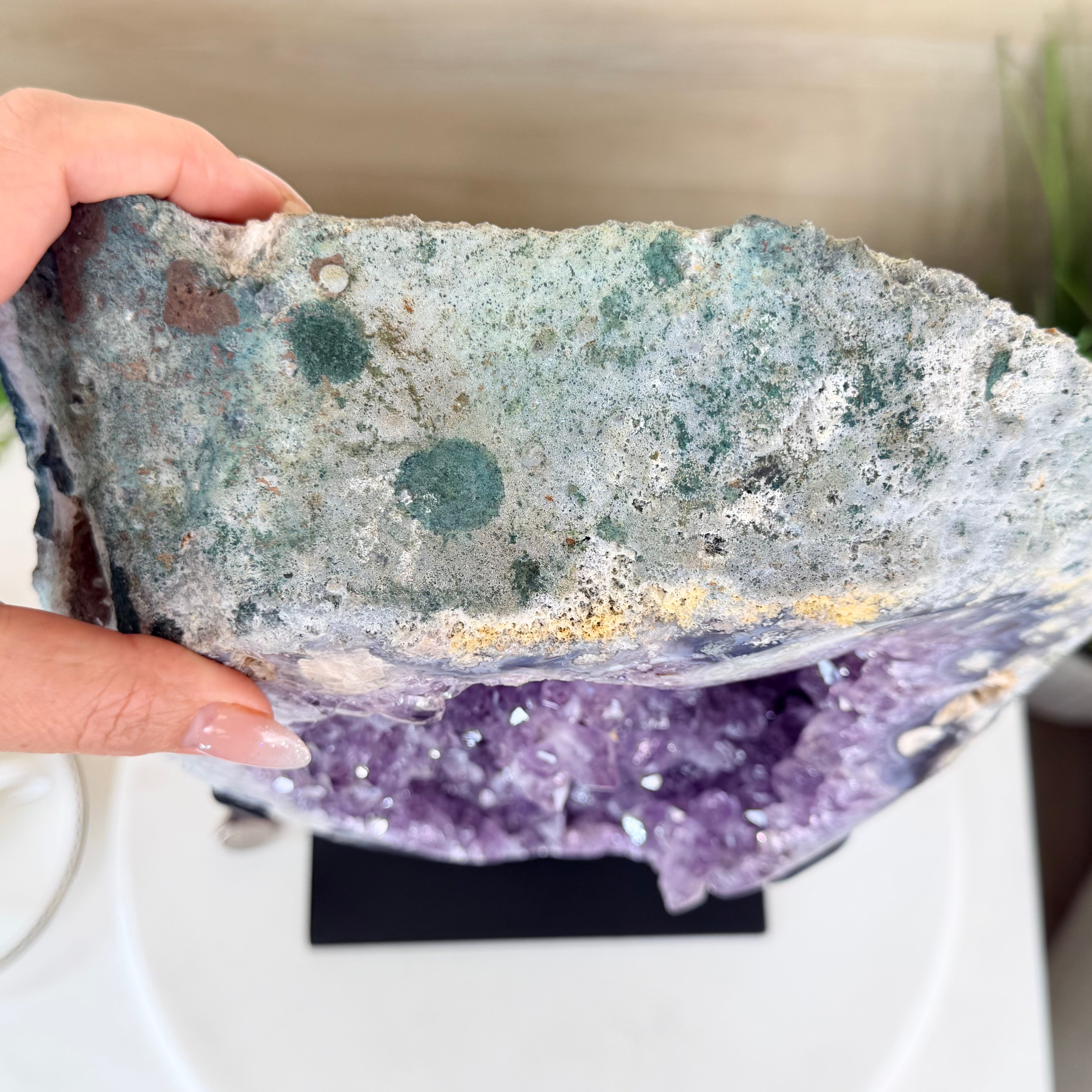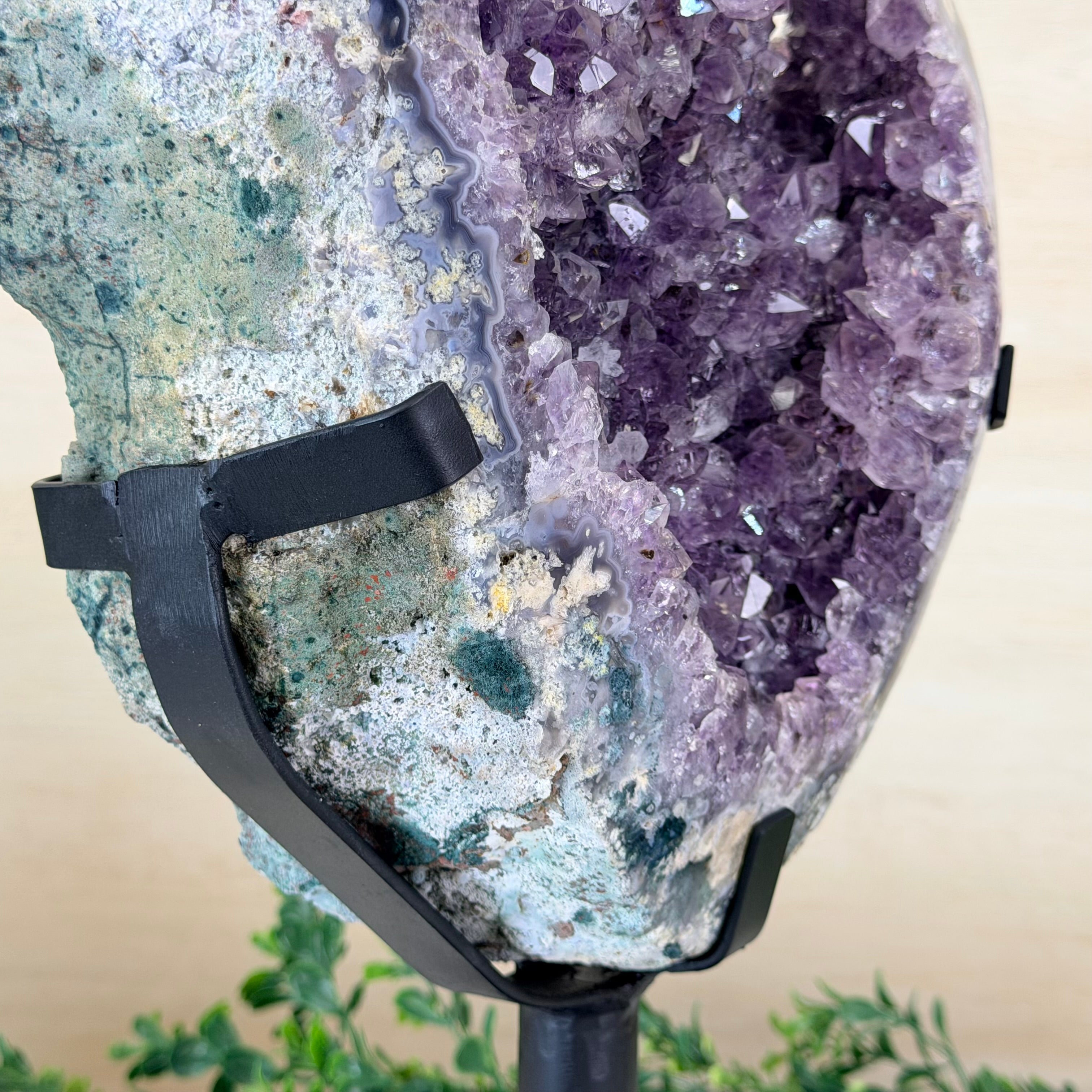 Unveil the charm of this natural Extra Quality Brazilian Amethyst Crystal "Portal" on a black metal fixed stand. Smoothly polished on back sides with a natural outer shell. Very special!
