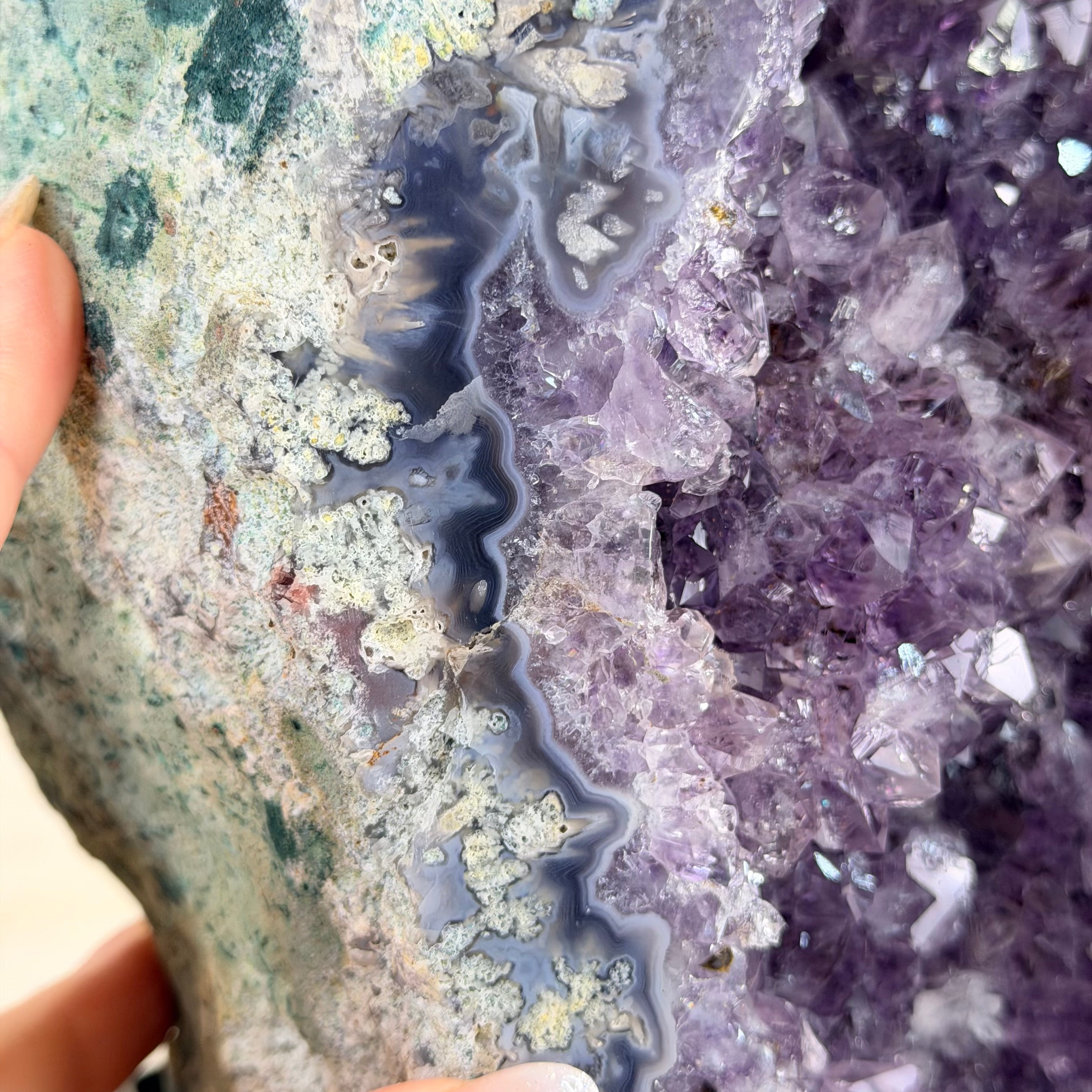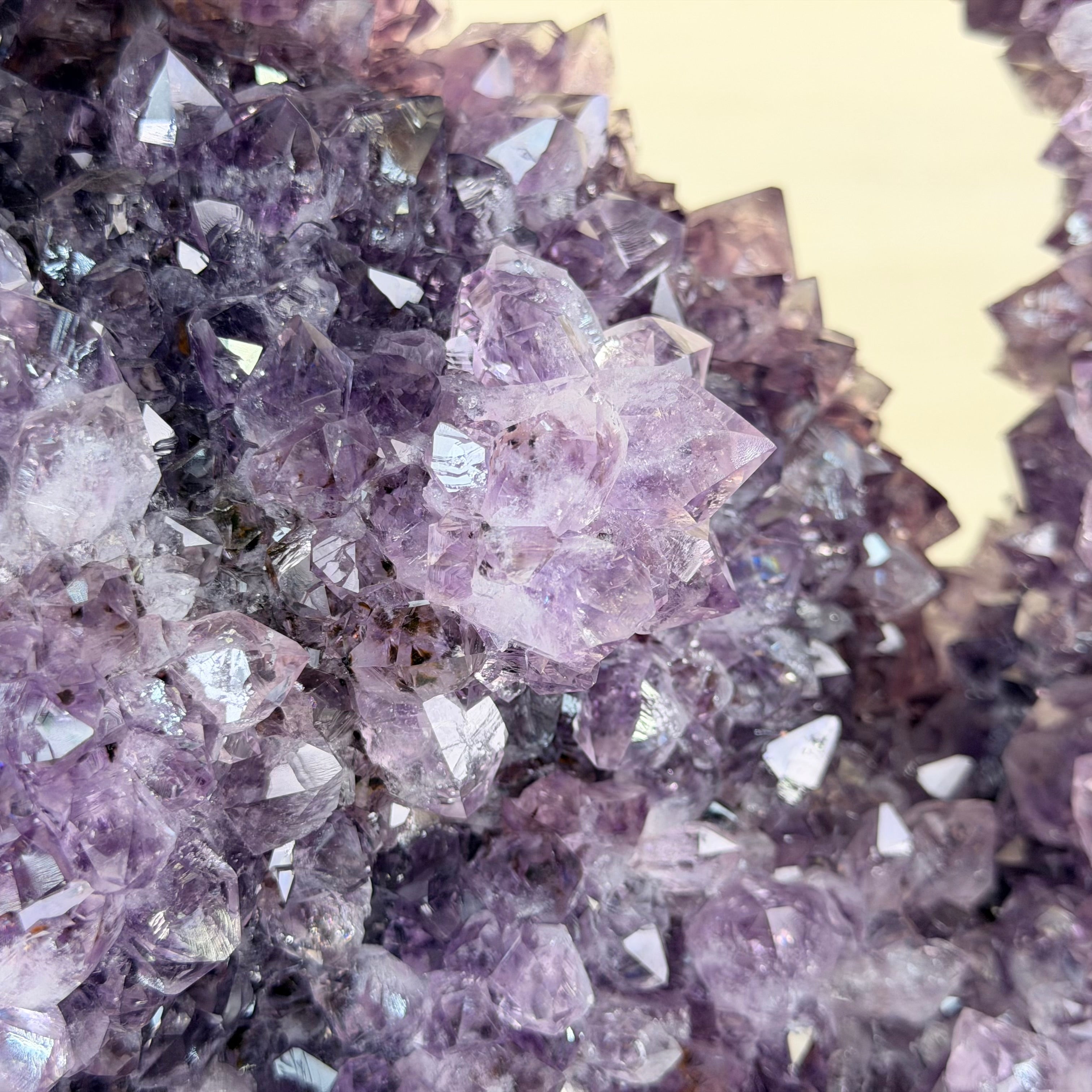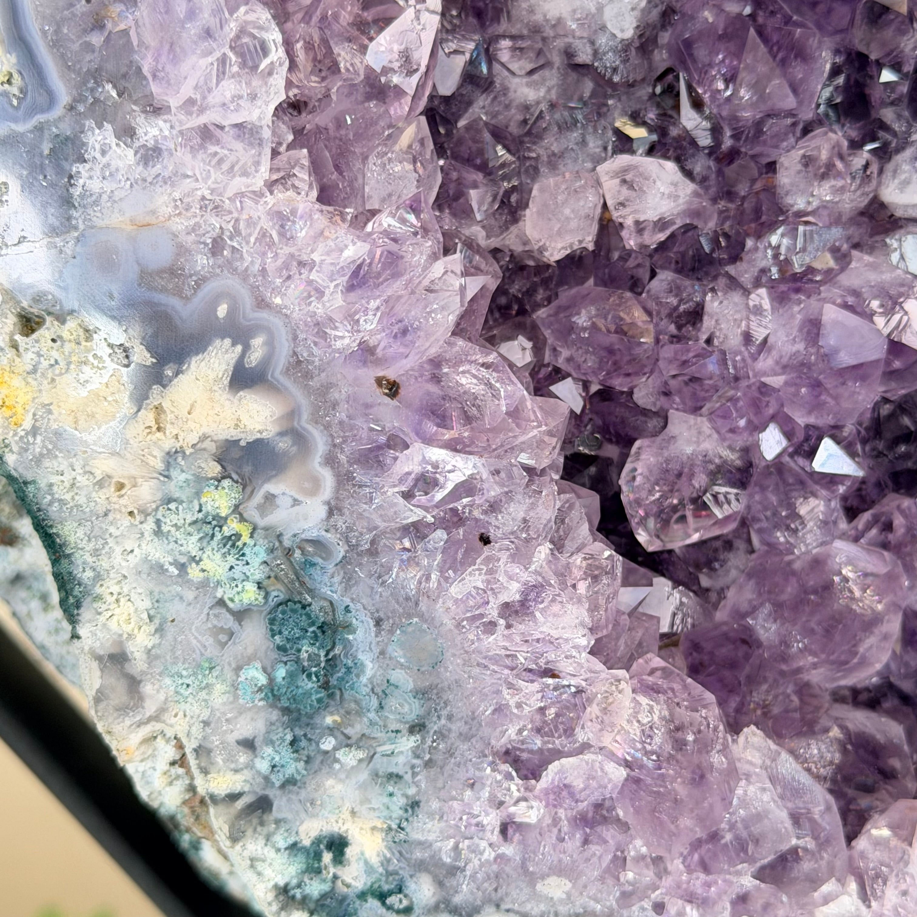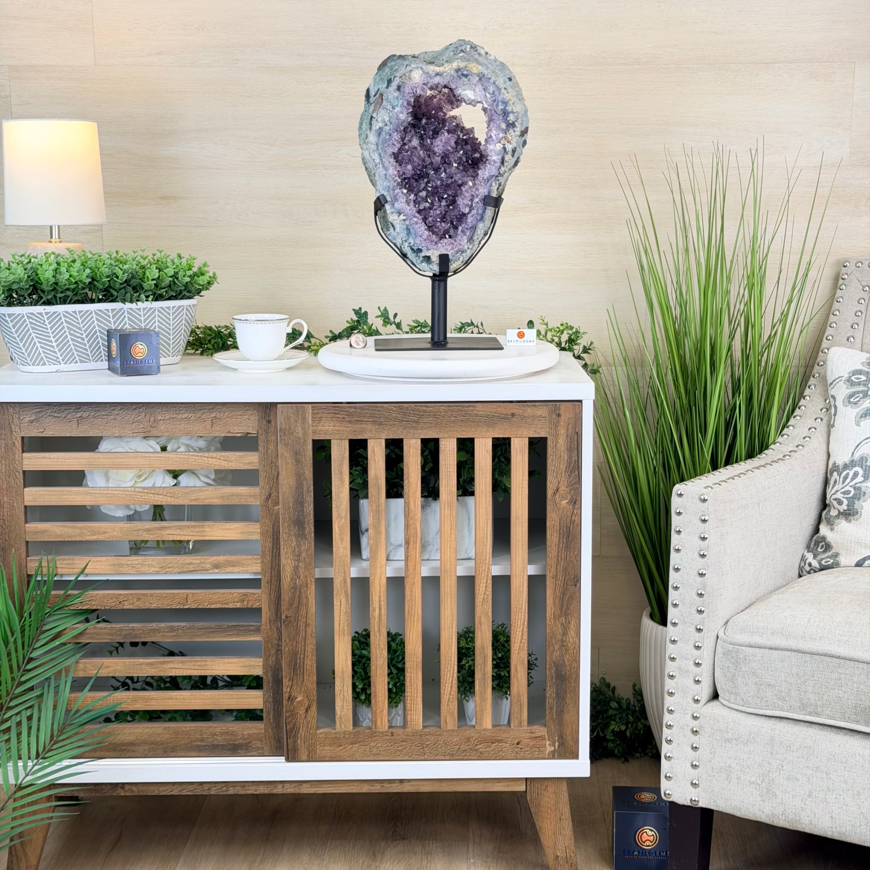Unveil the charm of this natural Extra Quality Brazilian Amethyst Crystal "Portal" on a black metal fixed stand. Smoothly polished on back sides with a natural outer shell. Very special!