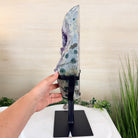 Disclaimer: This is a natural gemstone crystal sold by Brazil Gems® as is and as you see it in its images and video. It is the exact item you will receive. It may contain natural imperfections as well as imperfections, scratches, broken edges and repairs from the extraction, polishing and mounting processes. The base has been custom welded to fit this crystal and painted black. At Brazil Gems® we make every effort to get measurements as exact as possible but they are done by human hands and eyes and therefore may have minor discrepancies.