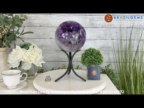 Brazil Gems® brings you this Extra Plus Quality Brazilian Druzy Amethyst Sphere on a black metal stand. Beautifully crafted from a larger geode, this polished piece will become a conversation starter every single time.