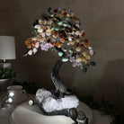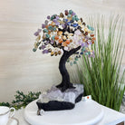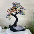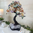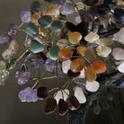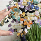 7-Chakra Gemstone Tree on Crystal Cluster Base Handcrafted in Brazil, this striking gemstone tree stands approximately 18" tall and features a sturdy resin trunk with 48 gracefully arched wire branches. Adorned with 240 polished chakra gemstones, it beautifully represents these seven chakras: