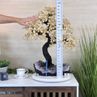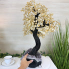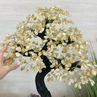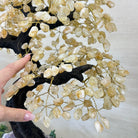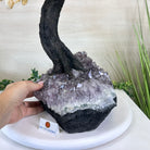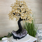 Nature and Artistry combine to create this Large Handmade Gemstone Tree with Citrine Gemstones as leaves. Set atop a large Amethyst cluster base, it has a masterfully detailed trunk and branches crafted from resin in a bonsai tree style and 144 wired branches supporting 720 tumbled gemstones.