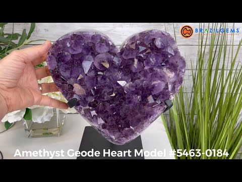 Extra Quality Heart-Shaped Amethyst Geode on a black metal and wood stand. This beautiful gemstone has polished edges and it's backside exposes its natural rough stone on the back. It also features vibrant violet colors and nicely shaped crystal points to admire for years to come. Its polished heart shape will make the ultimate romantic gift to the one you love.
