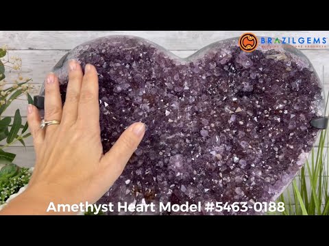 Extra Quality Heart-Shaped Amethyst Geode on a black metal stand. This beautiful gemstone has polished edges and it's backside exposes its natural rough stone on the back. It also features vibrant violet colors and nicely shaped crystal points to admire for years to come. Its polished heart shape will make the ultimate romantic gift to the one you love.