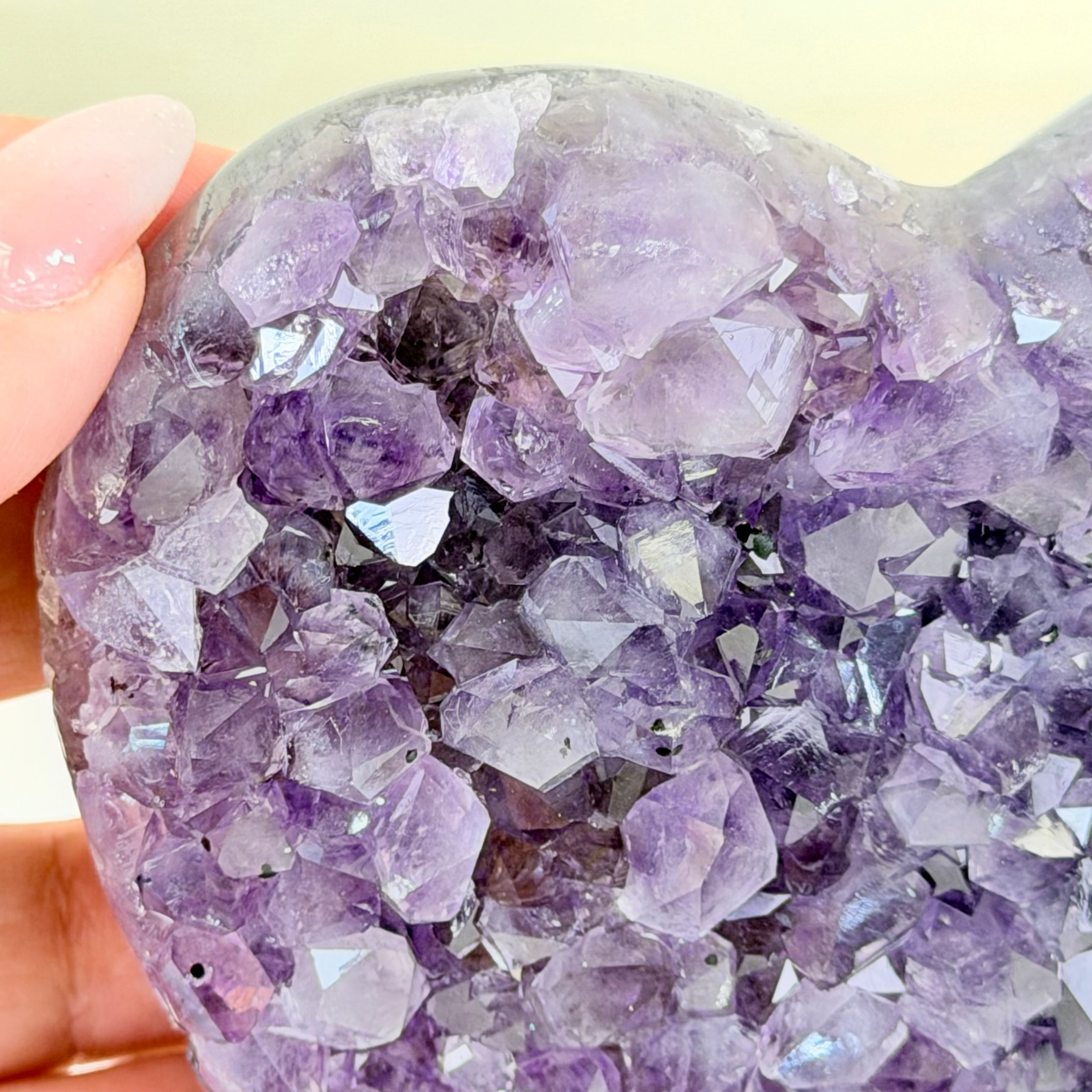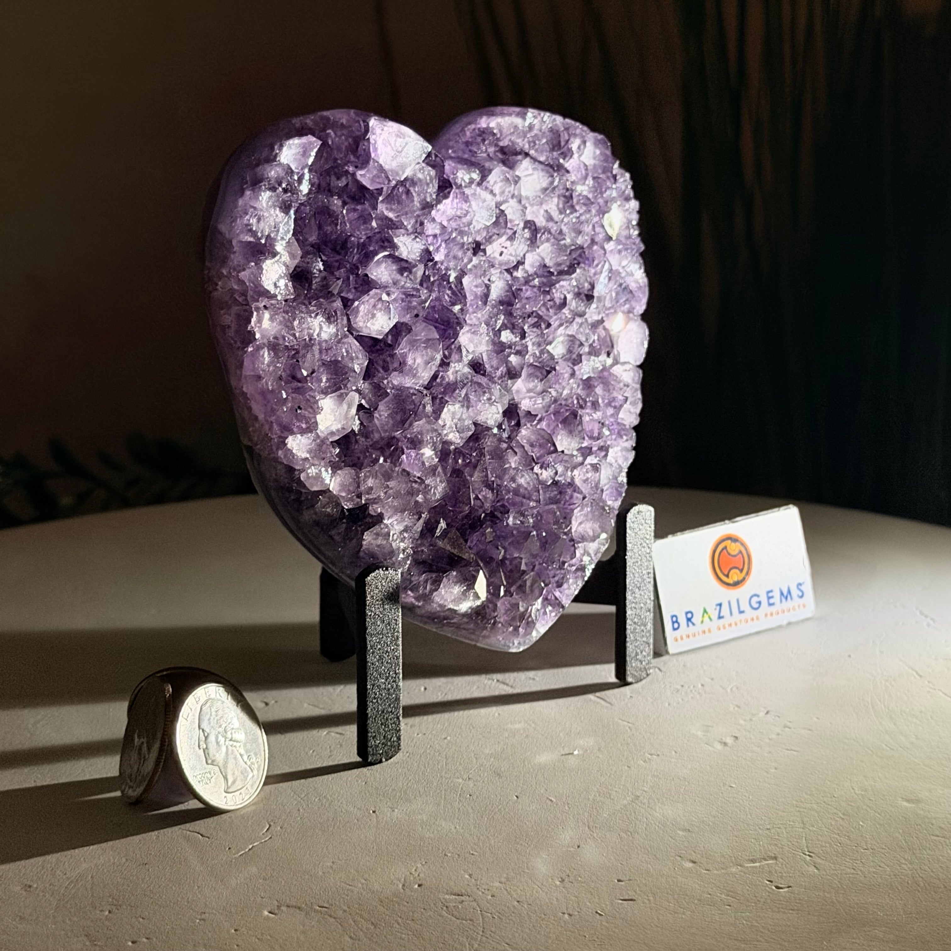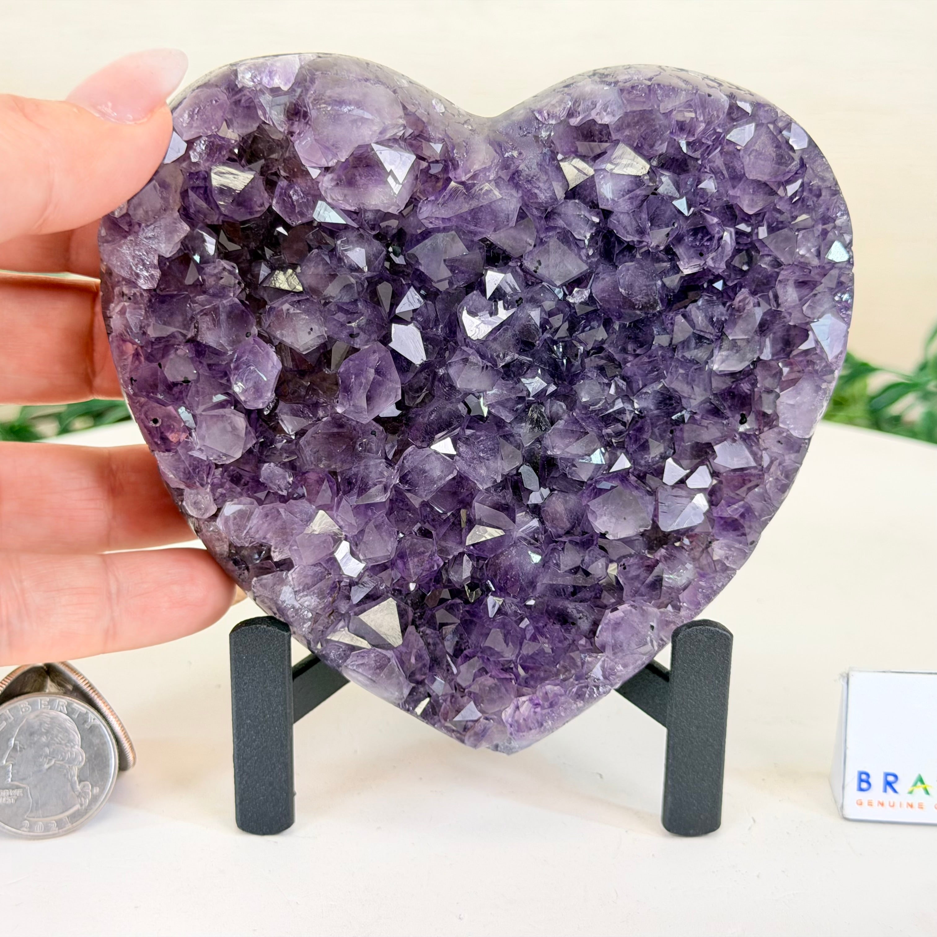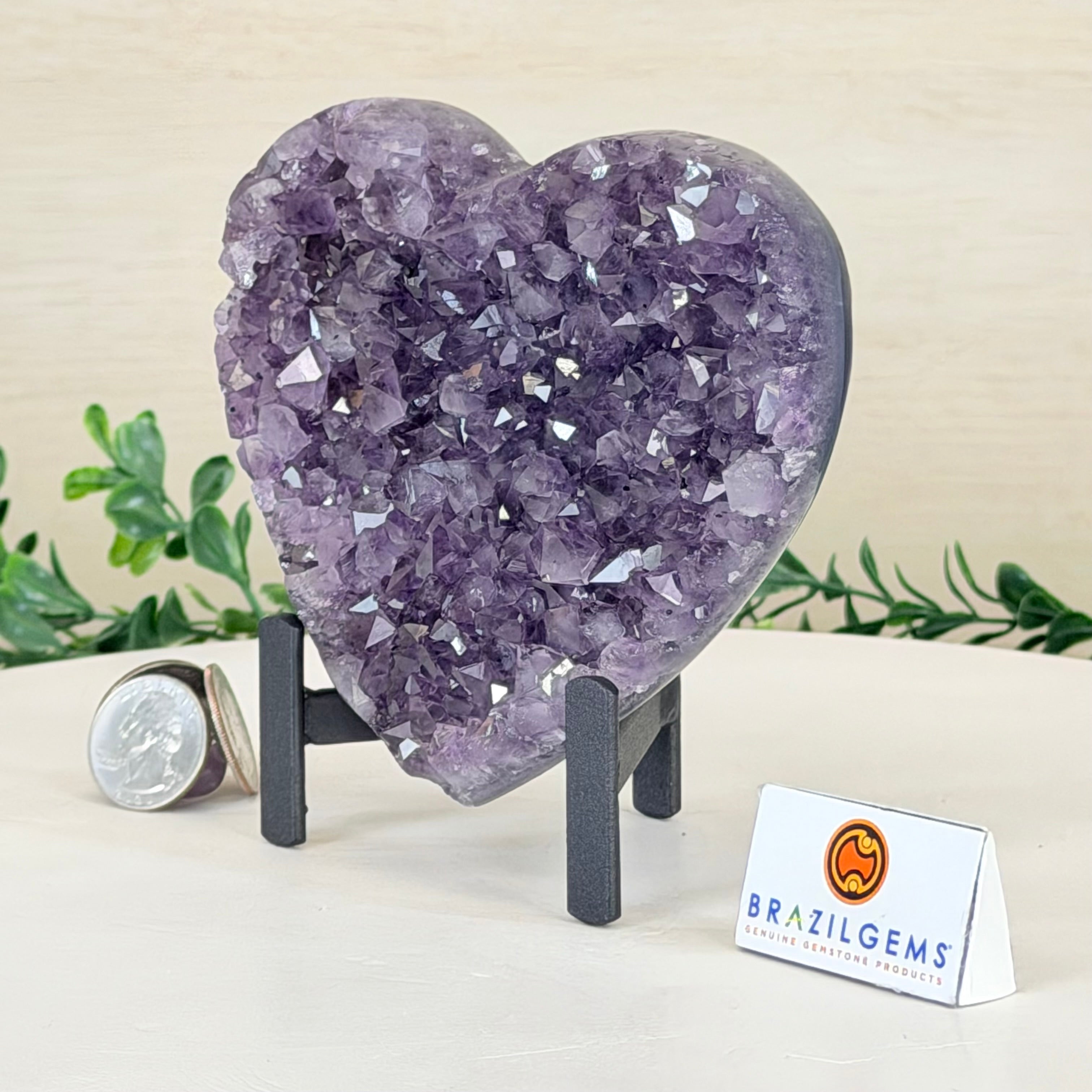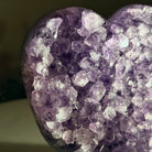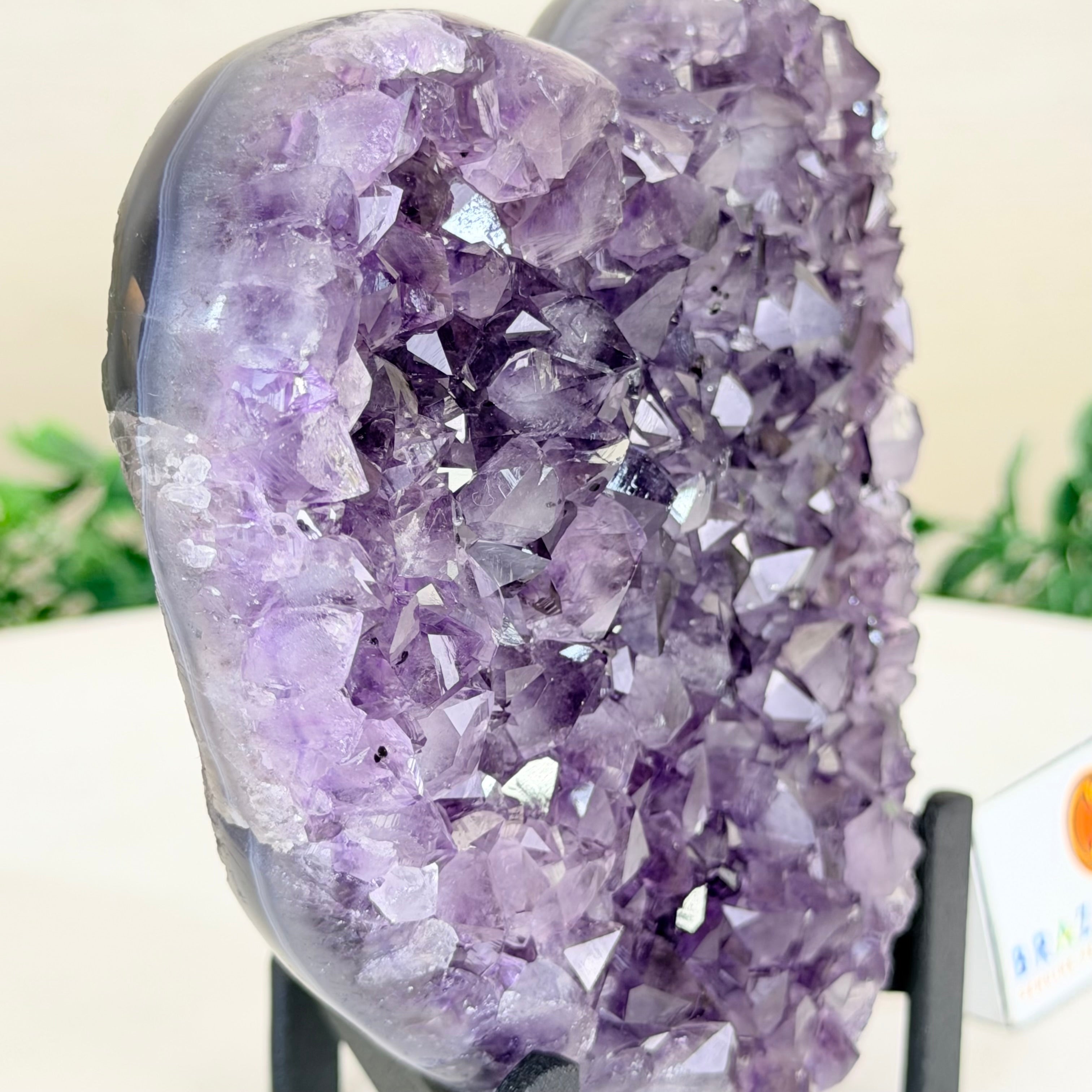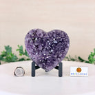 Experience the captivating beauty of this Extra Quality Heart-Shaped Amethyst Geode by Brazil Gems®. Elegantly displayed on a sleek black metal stand, this stunning gemstone showcases polished edges that highlight its vibrant violet hues, while the natural rough stone on the backside adds a touch of raw authenticity. Each crystal point sparkles with the unique, untouched beauty crafted by Mother Nature herself.