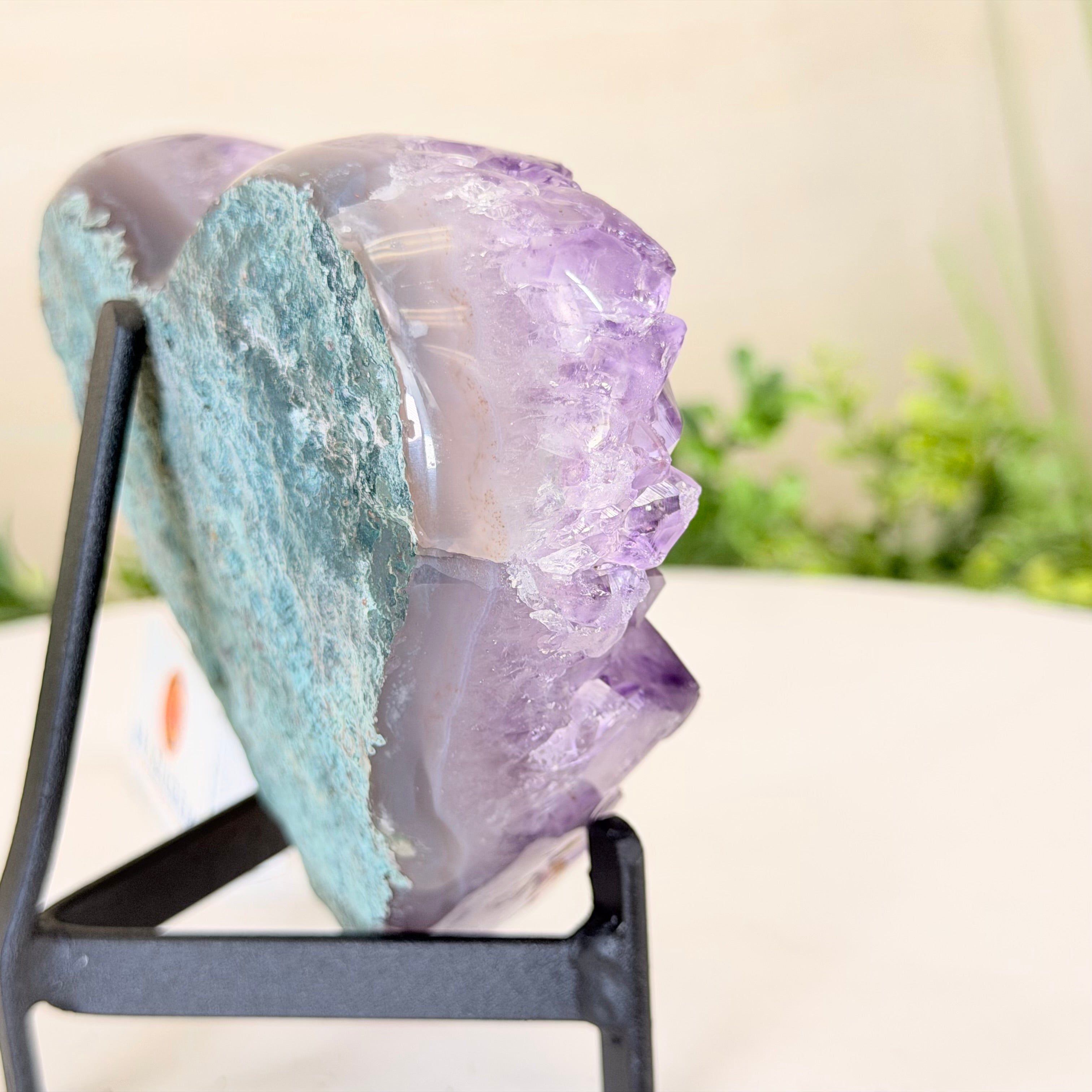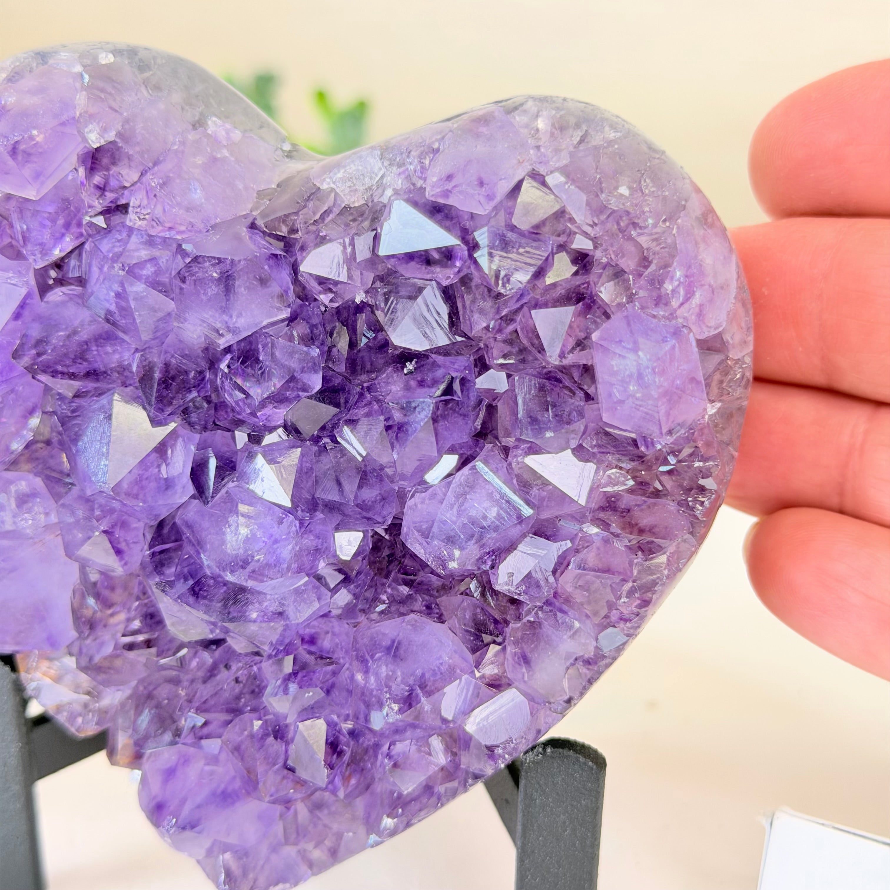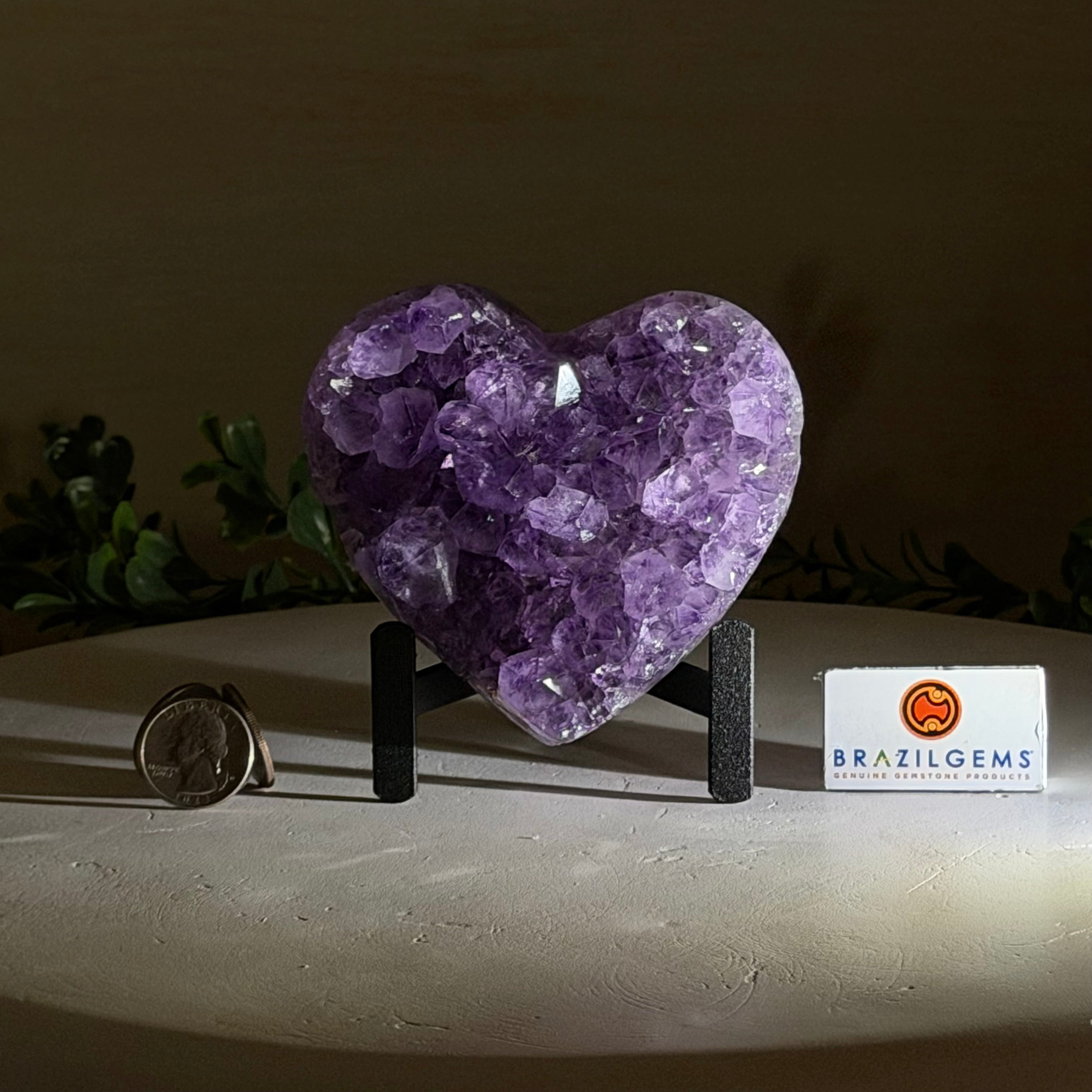 Experience the captivating beauty of this Extra Quality Heart-Shaped Amethyst Geode by Brazil Gems®. Elegantly displayed on a sleek black metal stand, this stunning gemstone showcases polished edges that highlight its vibrant violet hues, while the natural rough stone on the backside adds a touch of raw authenticity. Each crystal point sparkles with the unique, untouched beauty crafted by Mother Nature herself.