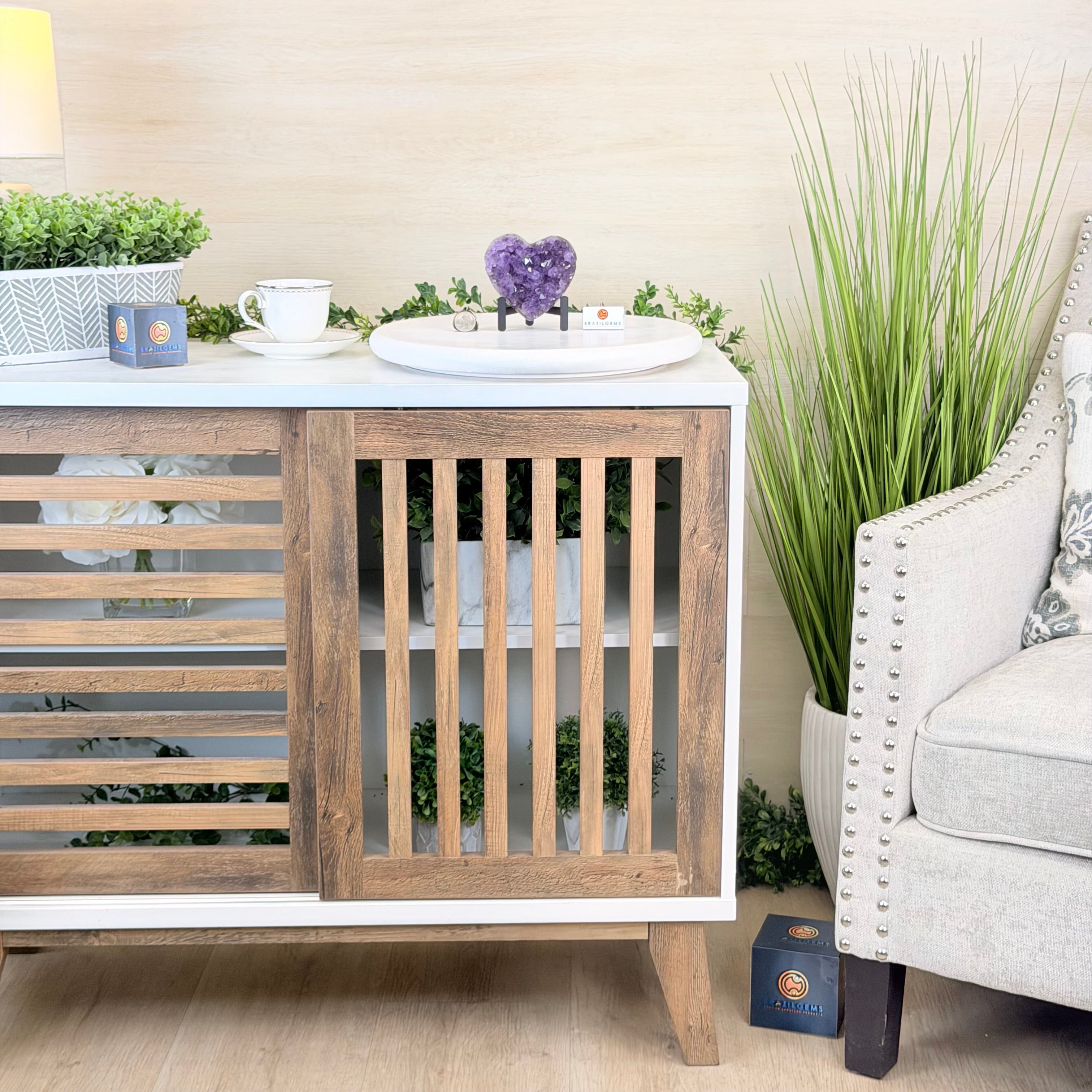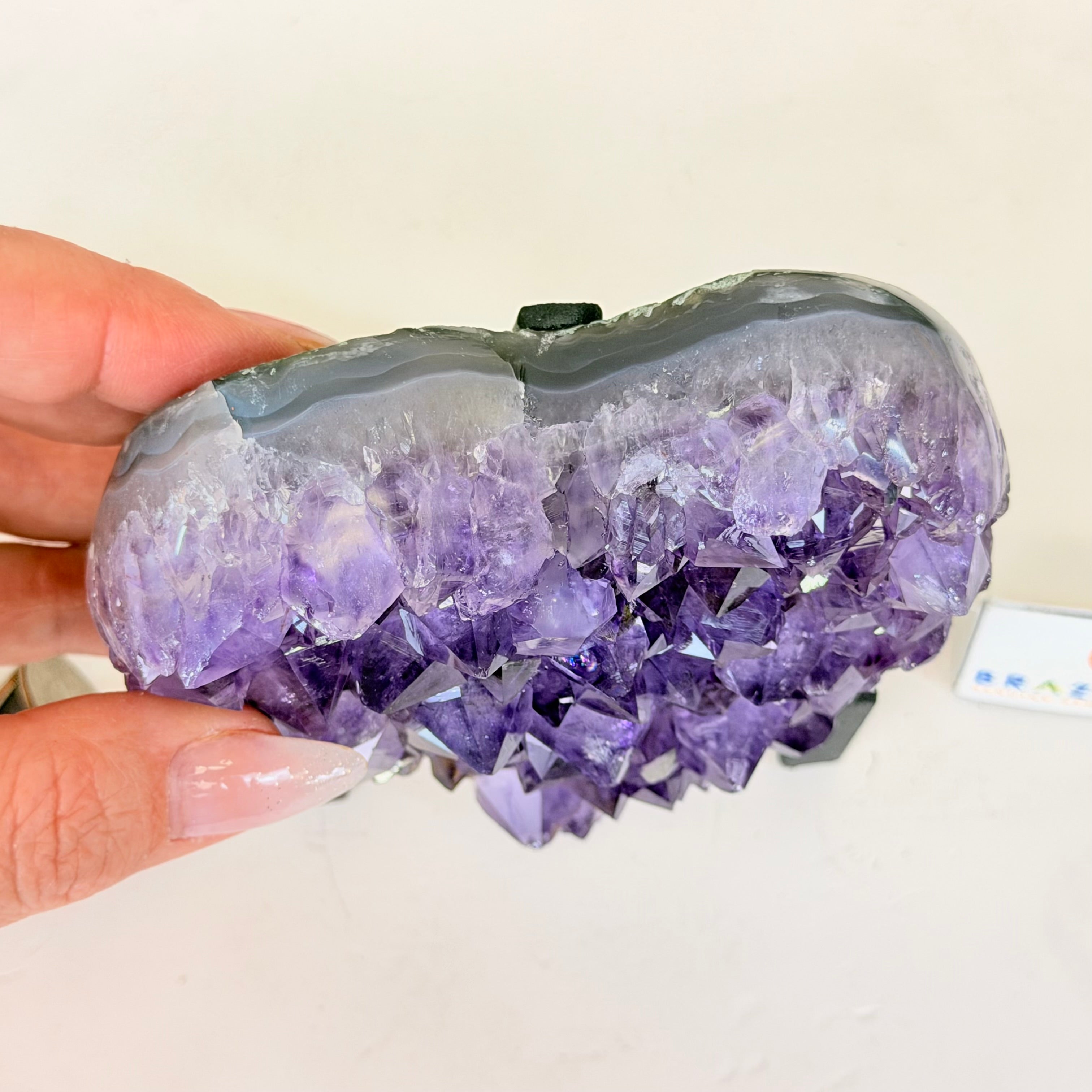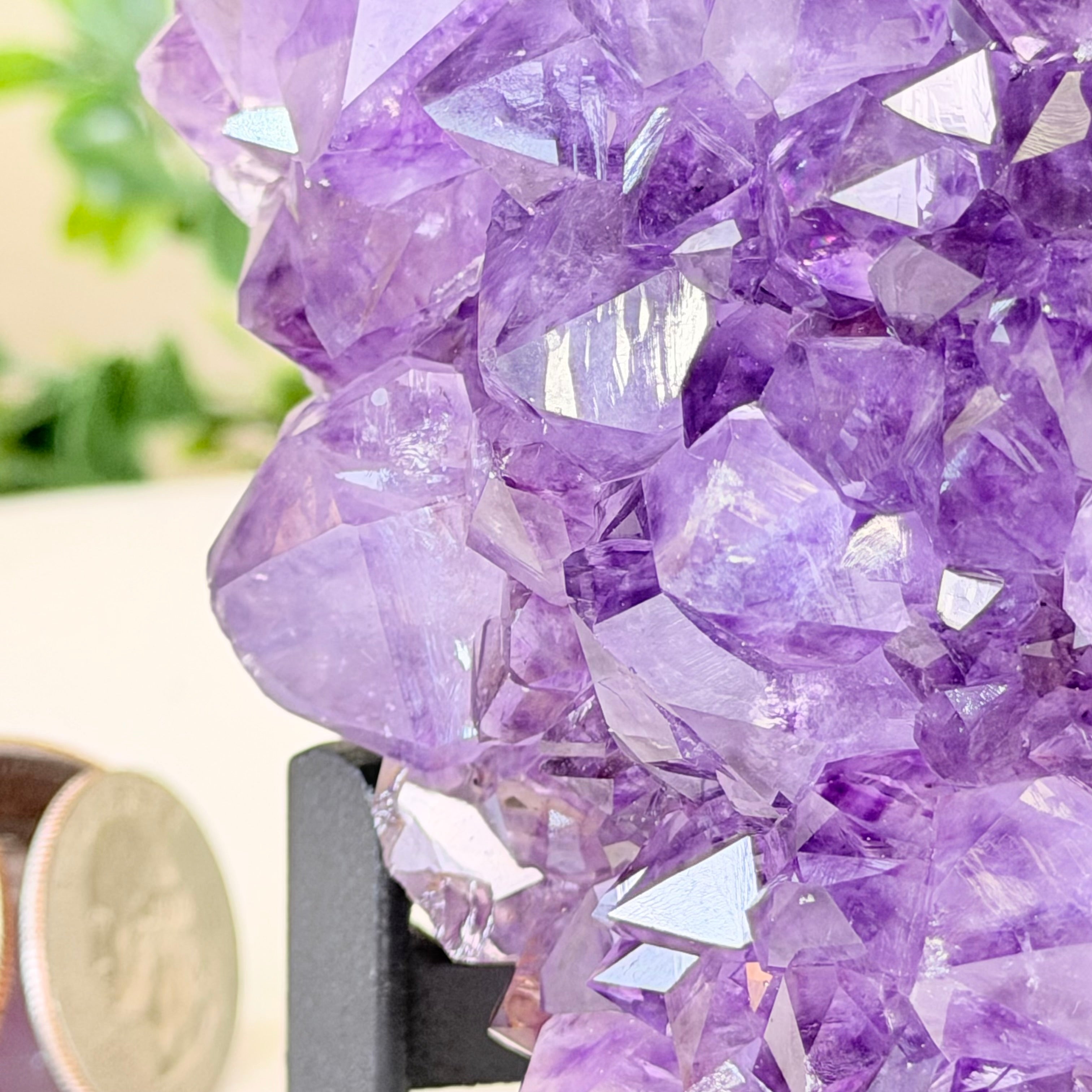 Experience the captivating beauty of this Extra Quality Heart-Shaped Amethyst Geode by Brazil Gems®. Elegantly displayed on a sleek black metal stand, this stunning gemstone showcases polished edges that highlight its vibrant violet hues, while the natural rough stone on the backside adds a touch of raw authenticity. Each crystal point sparkles with the unique, untouched beauty crafted by Mother Nature herself.