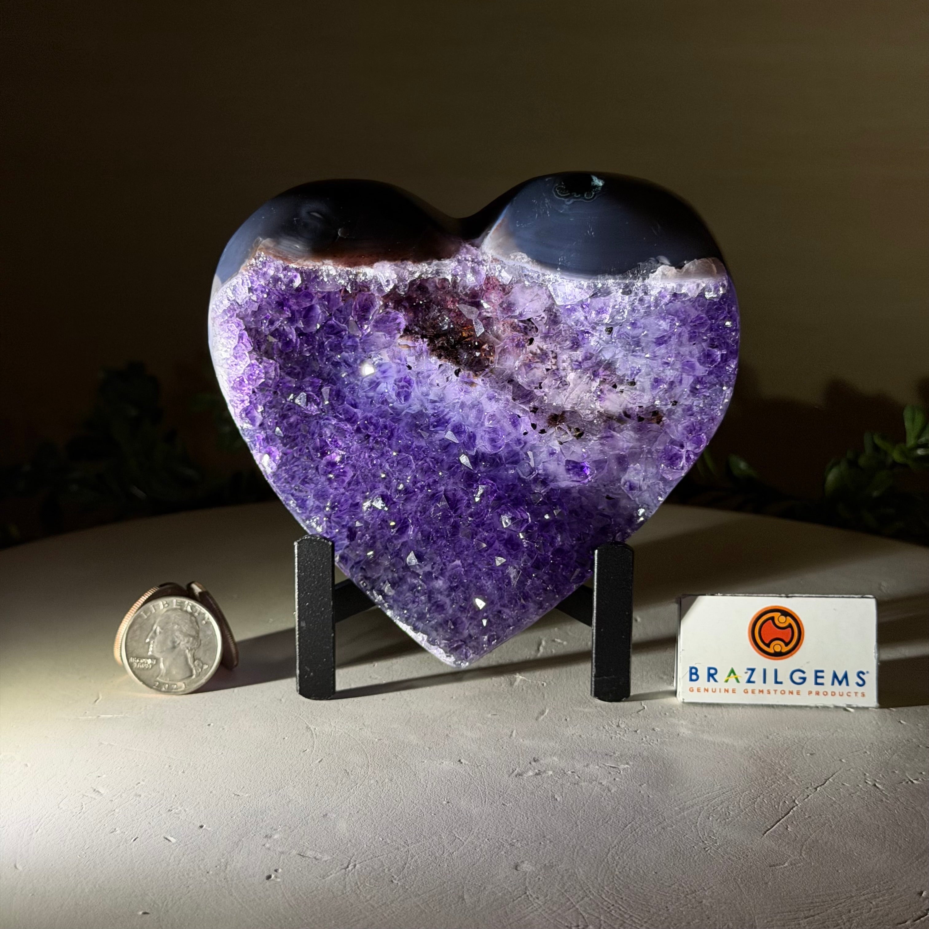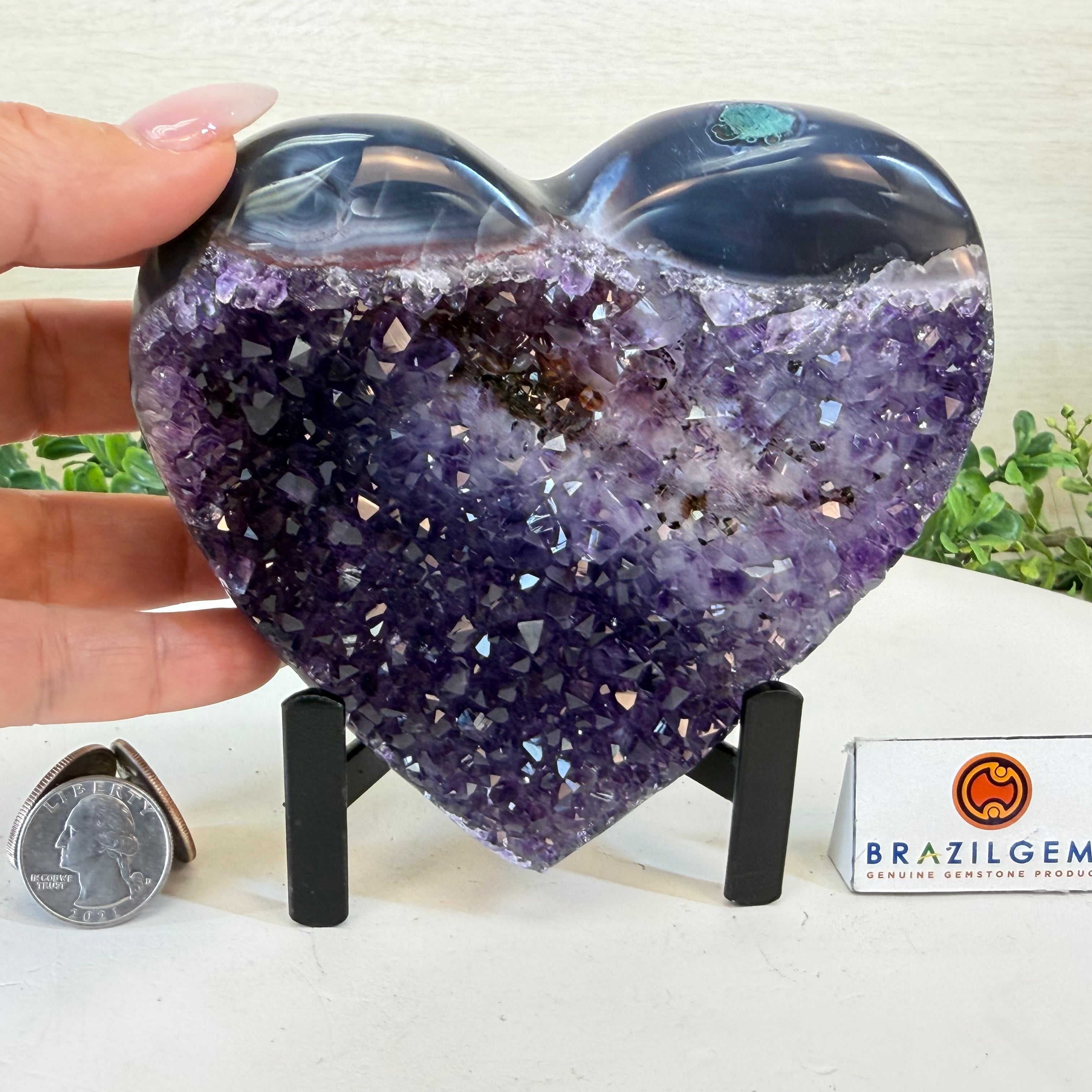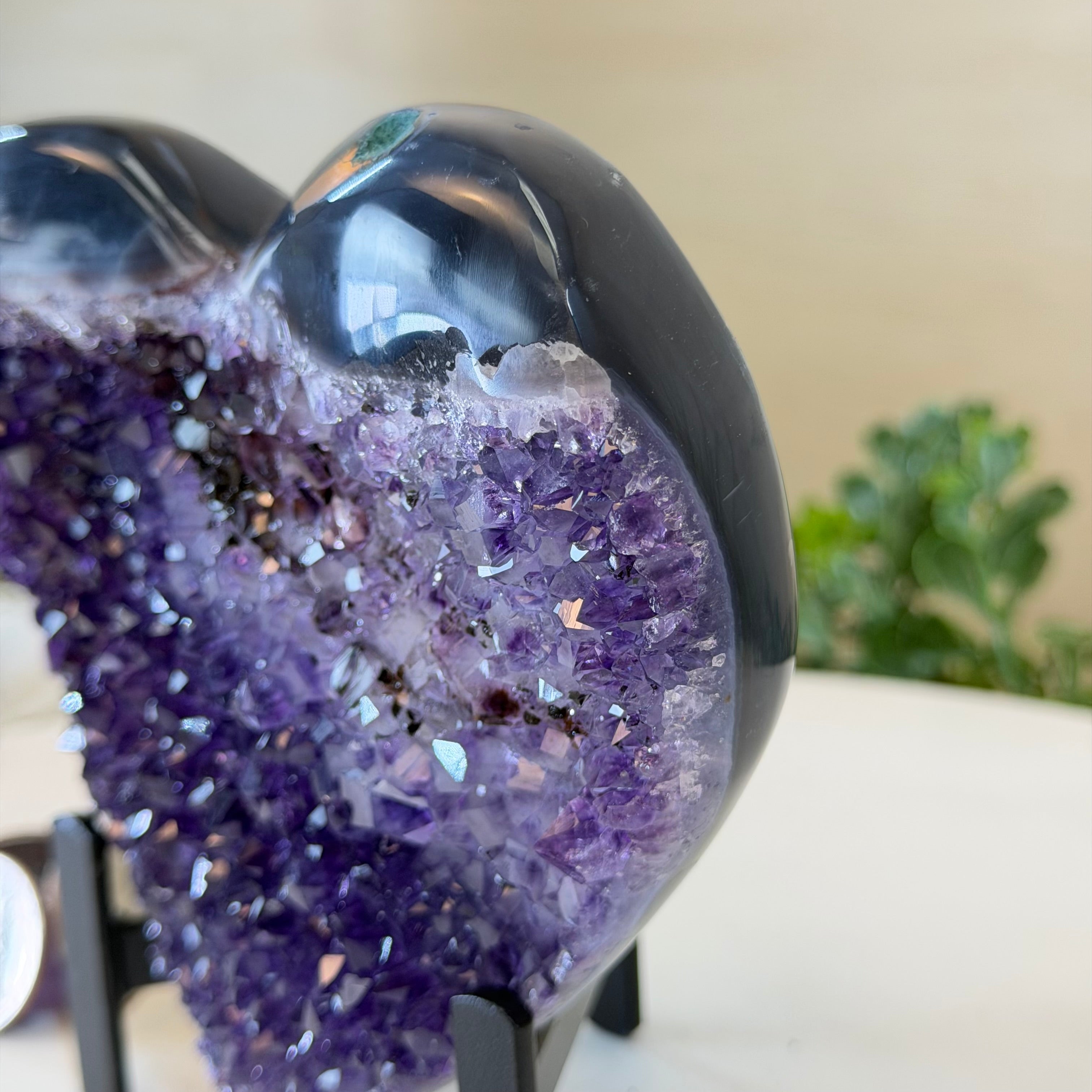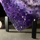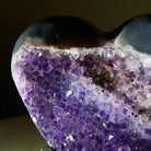 Experience the captivating beauty of this Extra Plus Quality Heart-Shaped Amethyst Geode by Brazil Gems®. Elegantly displayed on a sleek black metal stand, this stunning gemstone showcases polished edges that highlight its vibrant violet hues, while the natural rough stone on the backside adds a touch of raw authenticity. Each crystal point sparkles with the unique, untouched beauty crafted by Mother Nature herself.