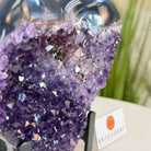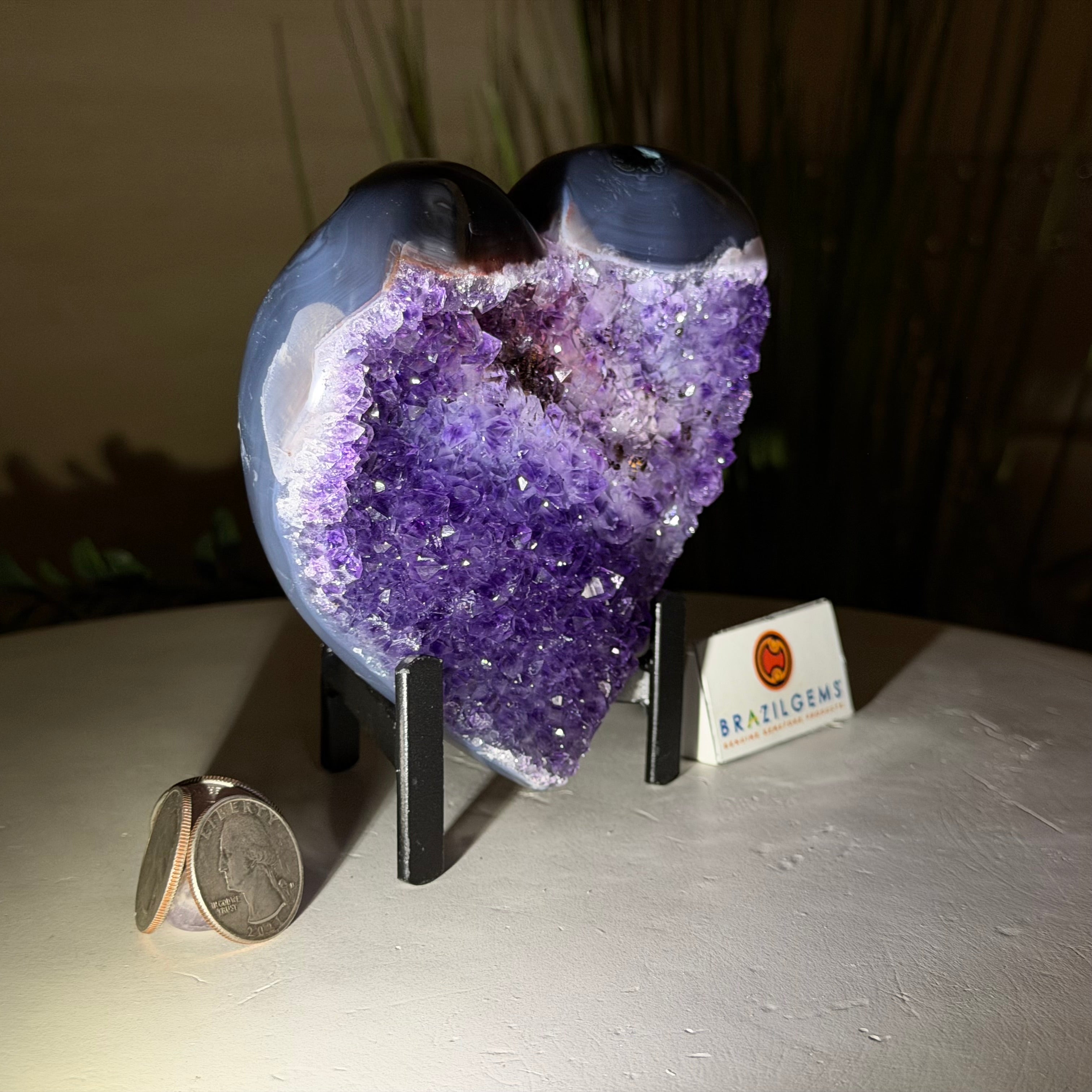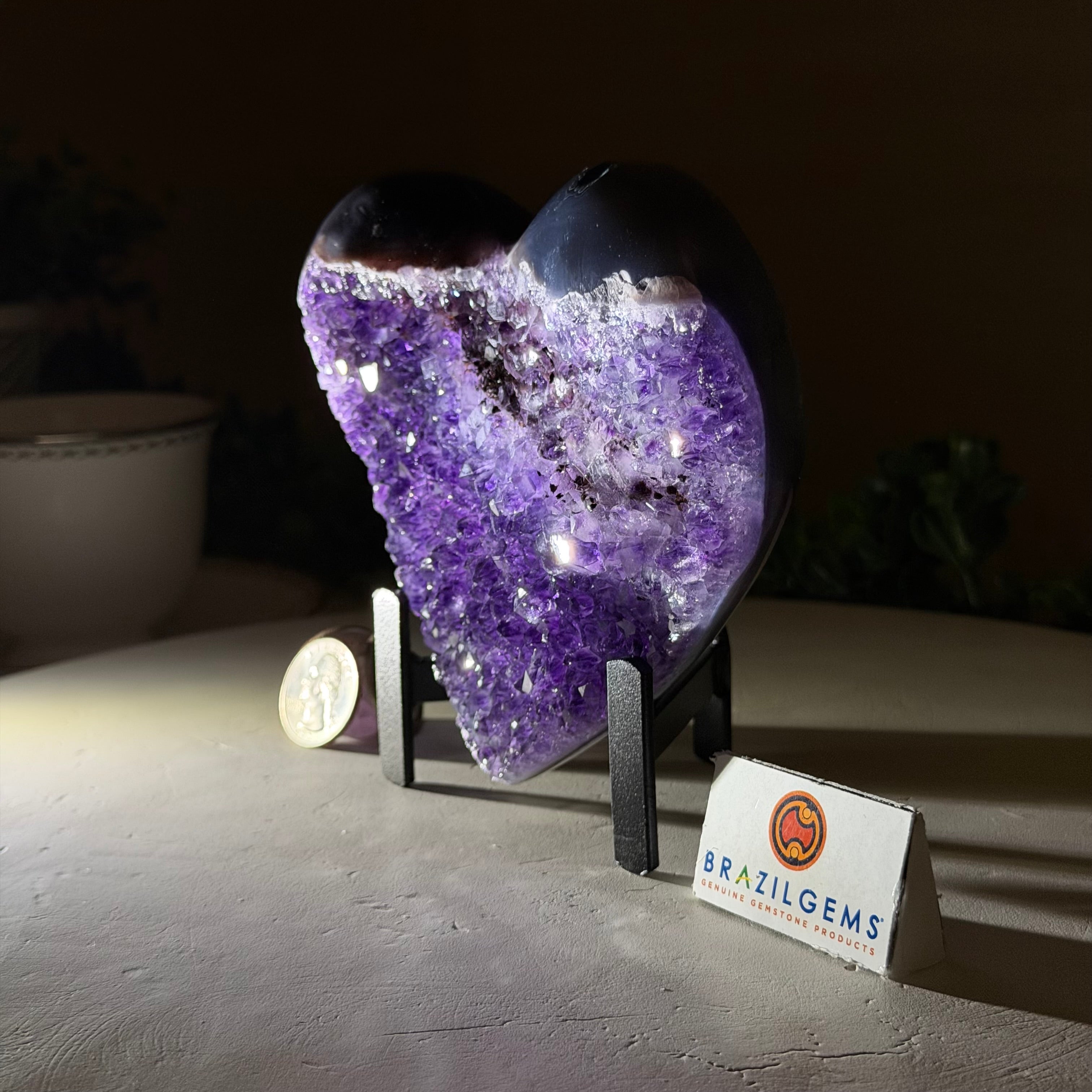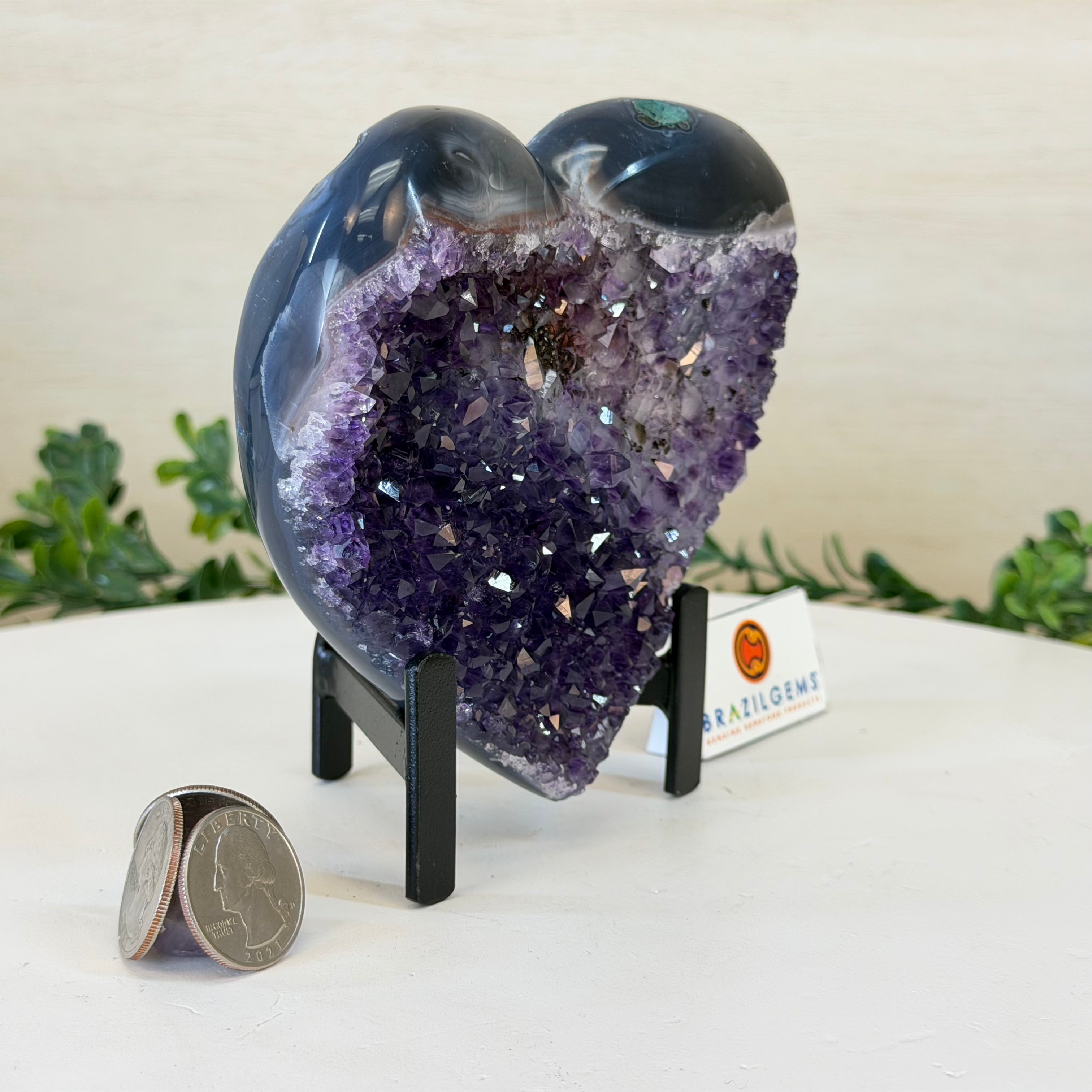 Experience the captivating beauty of this Extra Plus Quality Heart-Shaped Amethyst Geode by Brazil Gems®. Elegantly displayed on a sleek black metal stand, this stunning gemstone showcases polished edges that highlight its vibrant violet hues, while the natural rough stone on the backside adds a touch of raw authenticity. Each crystal point sparkles with the unique, untouched beauty crafted by Mother Nature herself.