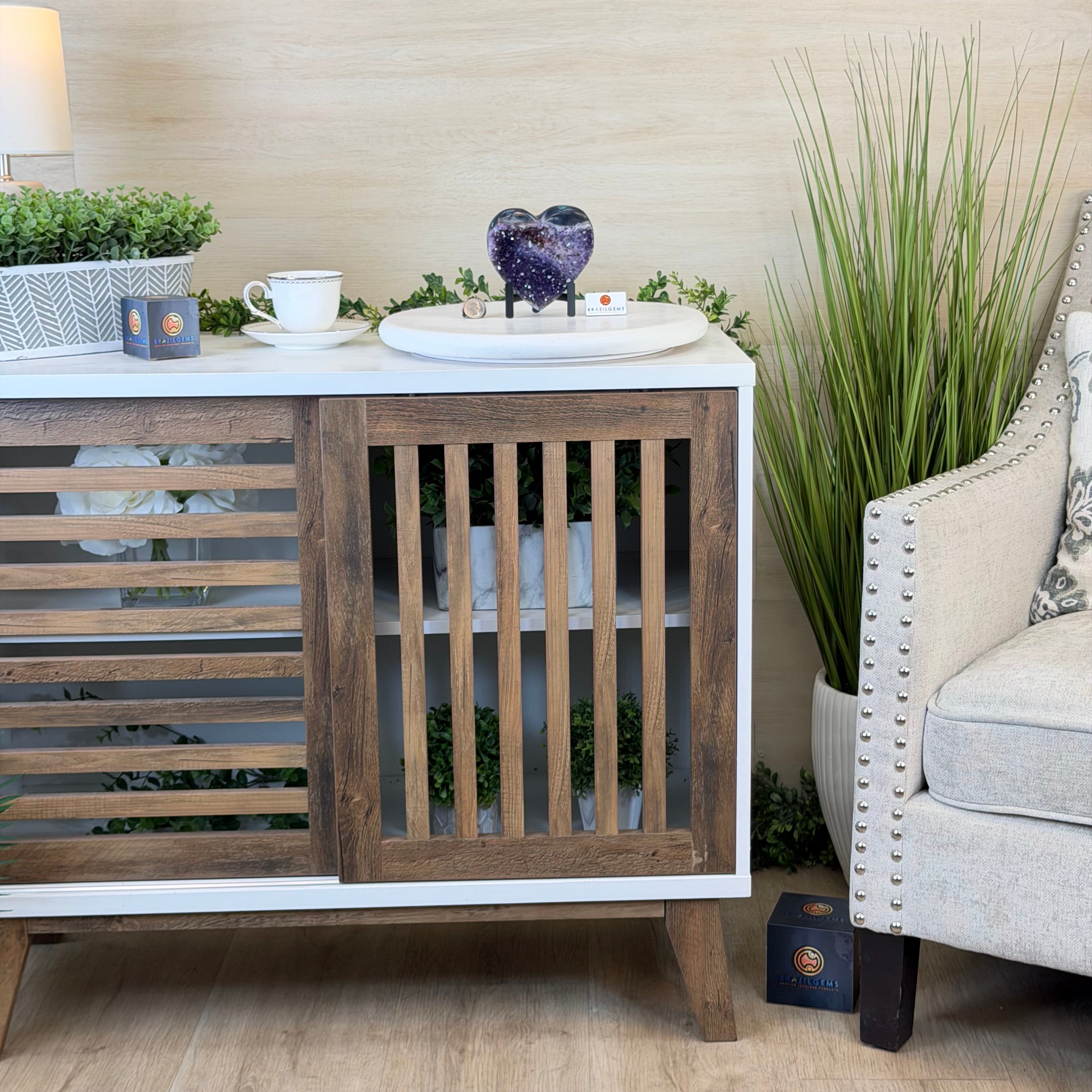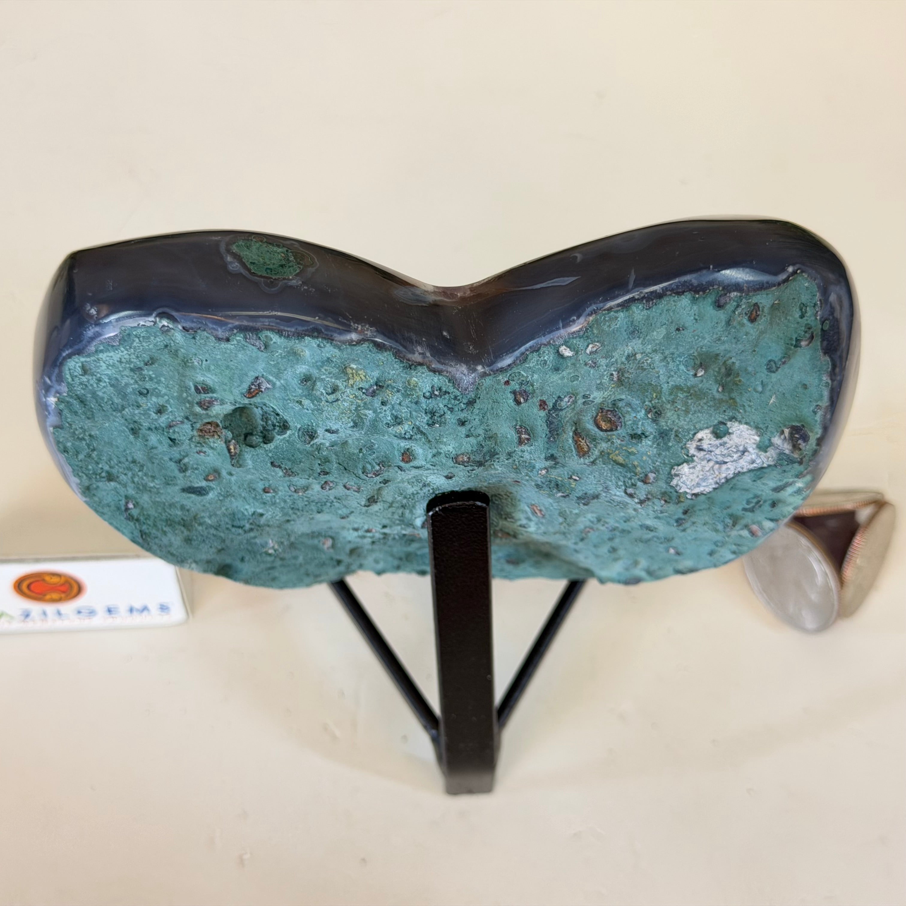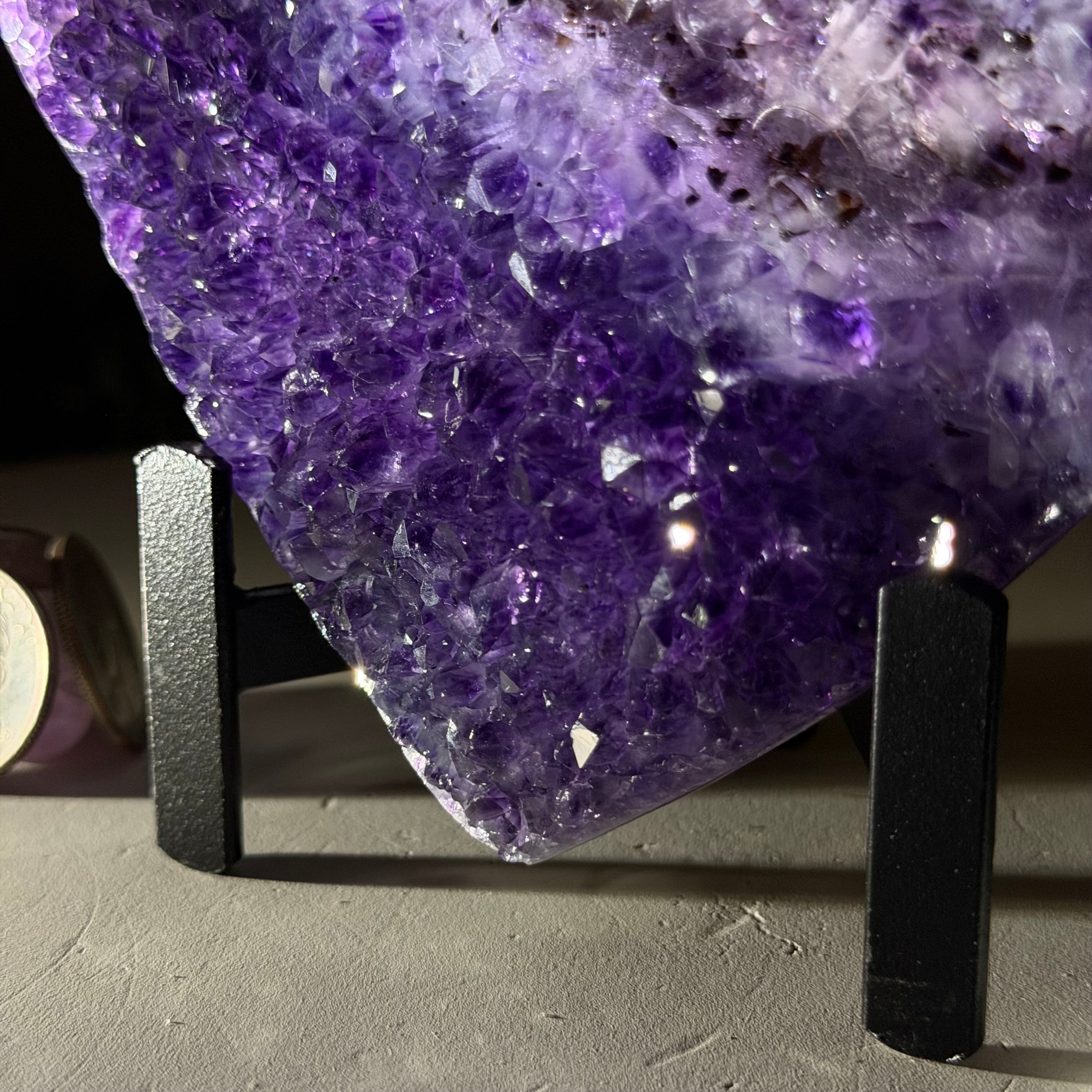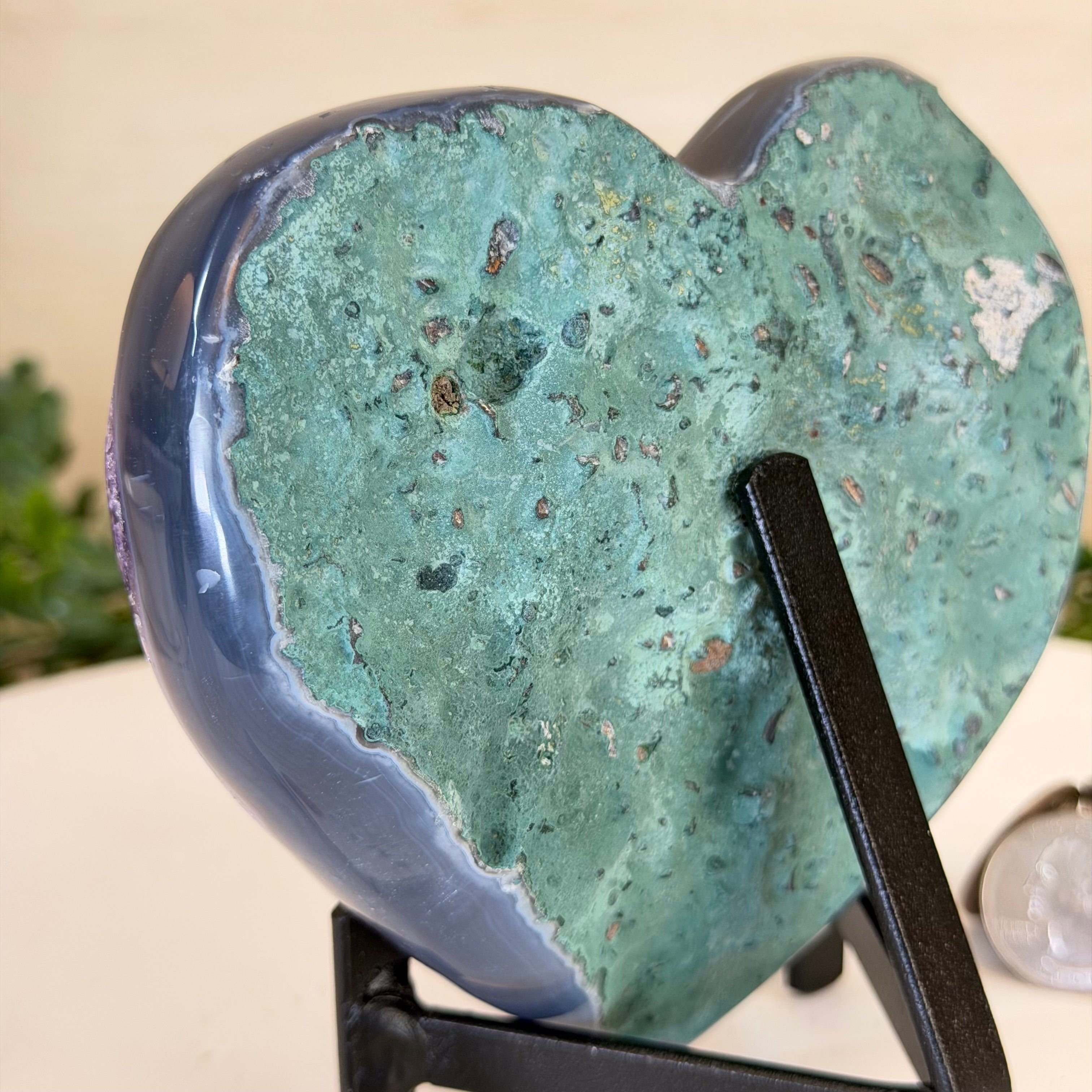 Disclaimer: This is a natural gemstone crystal sold by Brazil Gems® as is and as you see it in its images and video. It is the exact one you will receive. It may contain natural imperfections as well as imperfections, broken edges and repairs from the extraction, polishing, prepping and mounting processes. The metal stand is custom made to fit this gemstone and painted black. At Brazil Gems® we make every effort to get measurements as exact as possible but they are done by human hands and eyes and therefore may have minor discrepancies.