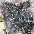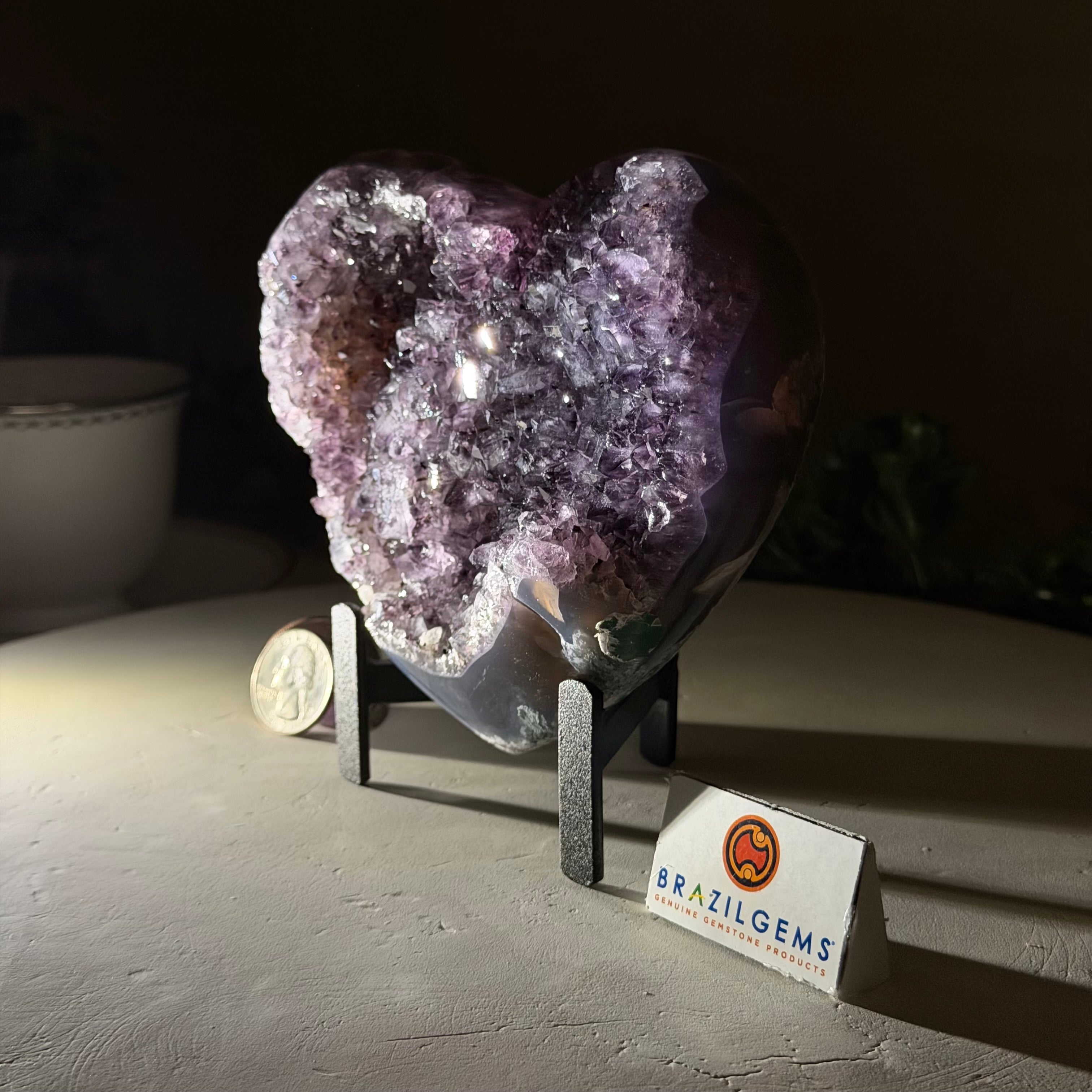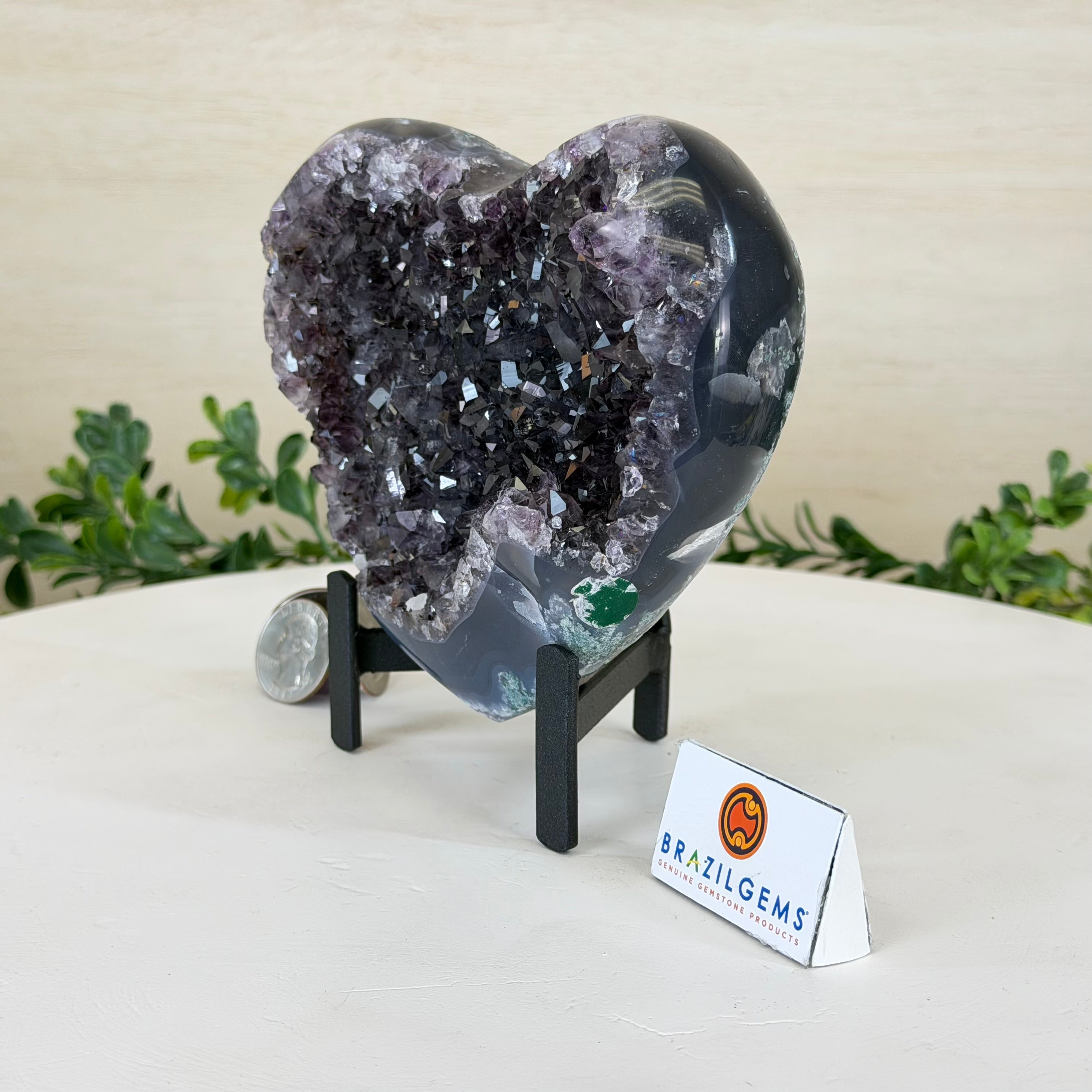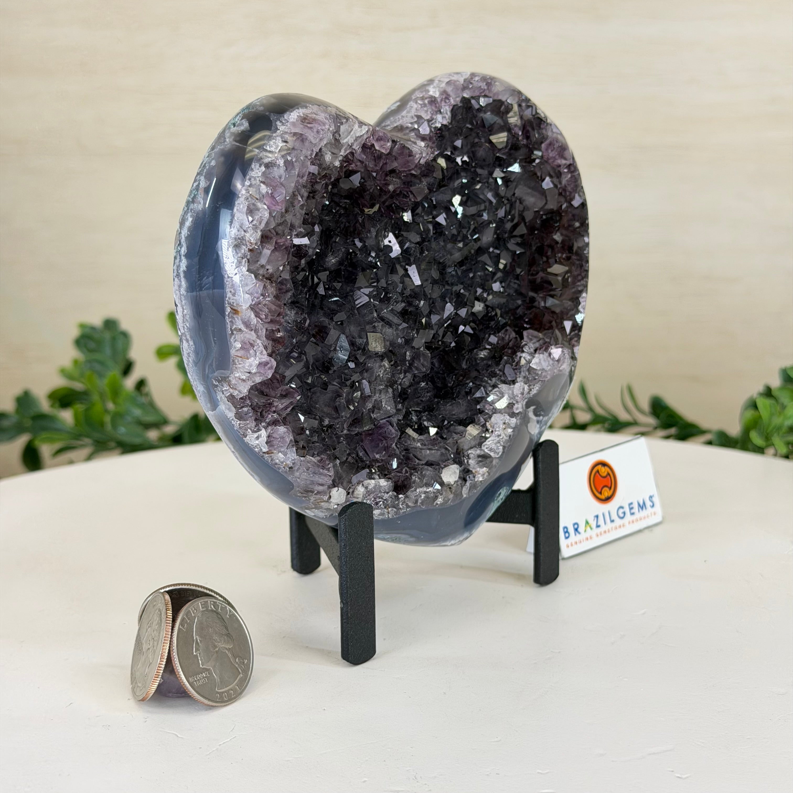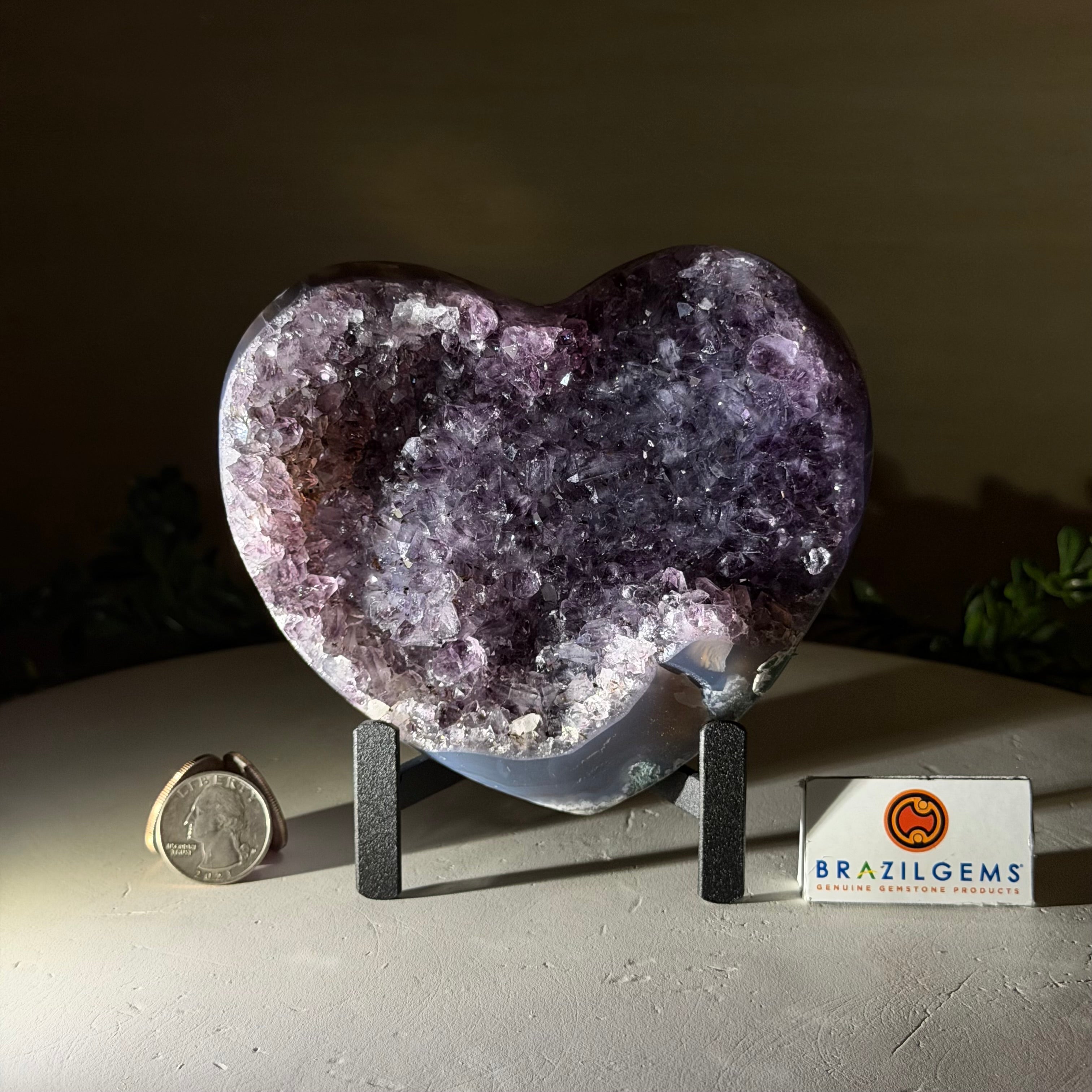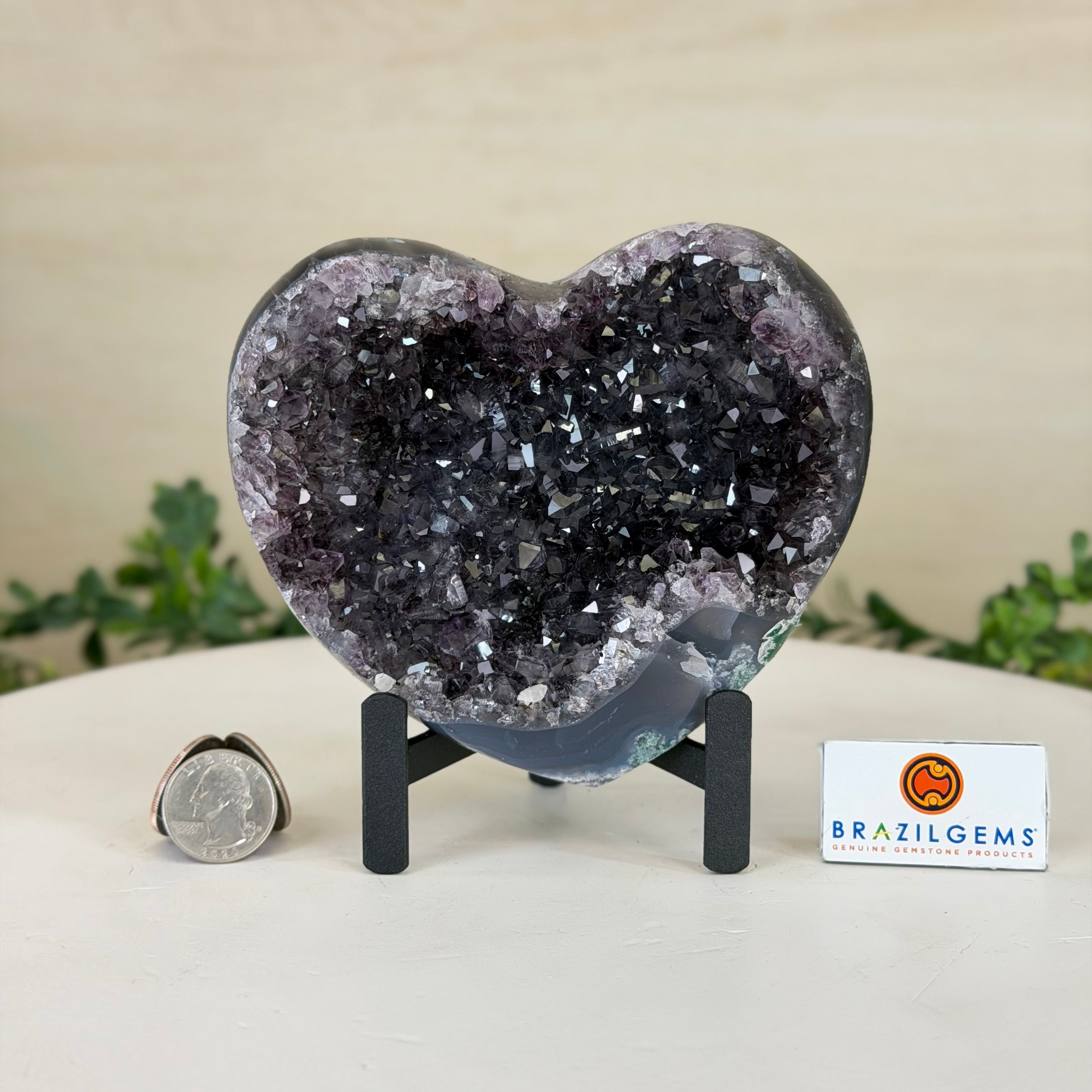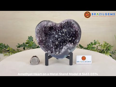 Experience the captivating beauty of this Extra Plus Quality Heart-Shaped Amethyst Geode by Brazil Gems®. Elegantly displayed on a sleek black metal stand, this stunning gemstone showcases polished edges that highlight its vibrant violet hues, while the natural rough stone on the backside adds a touch of raw authenticity. Each crystal point sparkles with the unique, untouched beauty crafted by Mother Nature herself.