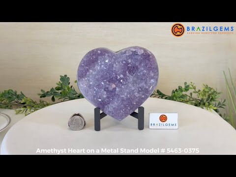 Experience the captivating beauty of this Extra Quality Heart-Shaped Amethyst Geode by Brazil Gems®. Elegantly displayed on a sleek black metal stand, this stunning gemstone showcases polished edges that highlight its vibrant violet hues, while the natural rough stone on the backside adds a touch of raw authenticity. Each crystal point sparkles with the unique, untouched beauty crafted by Mother Nature herself.