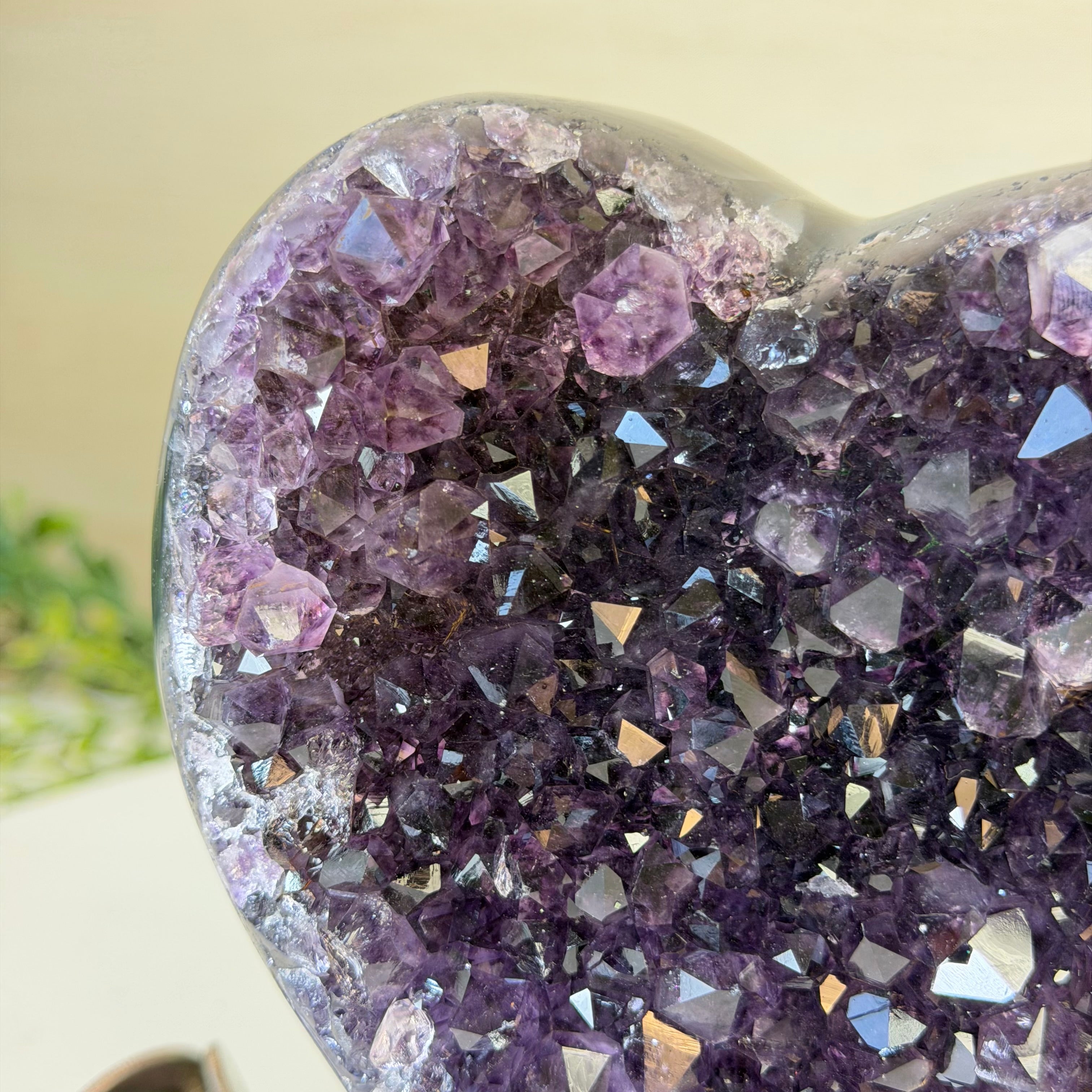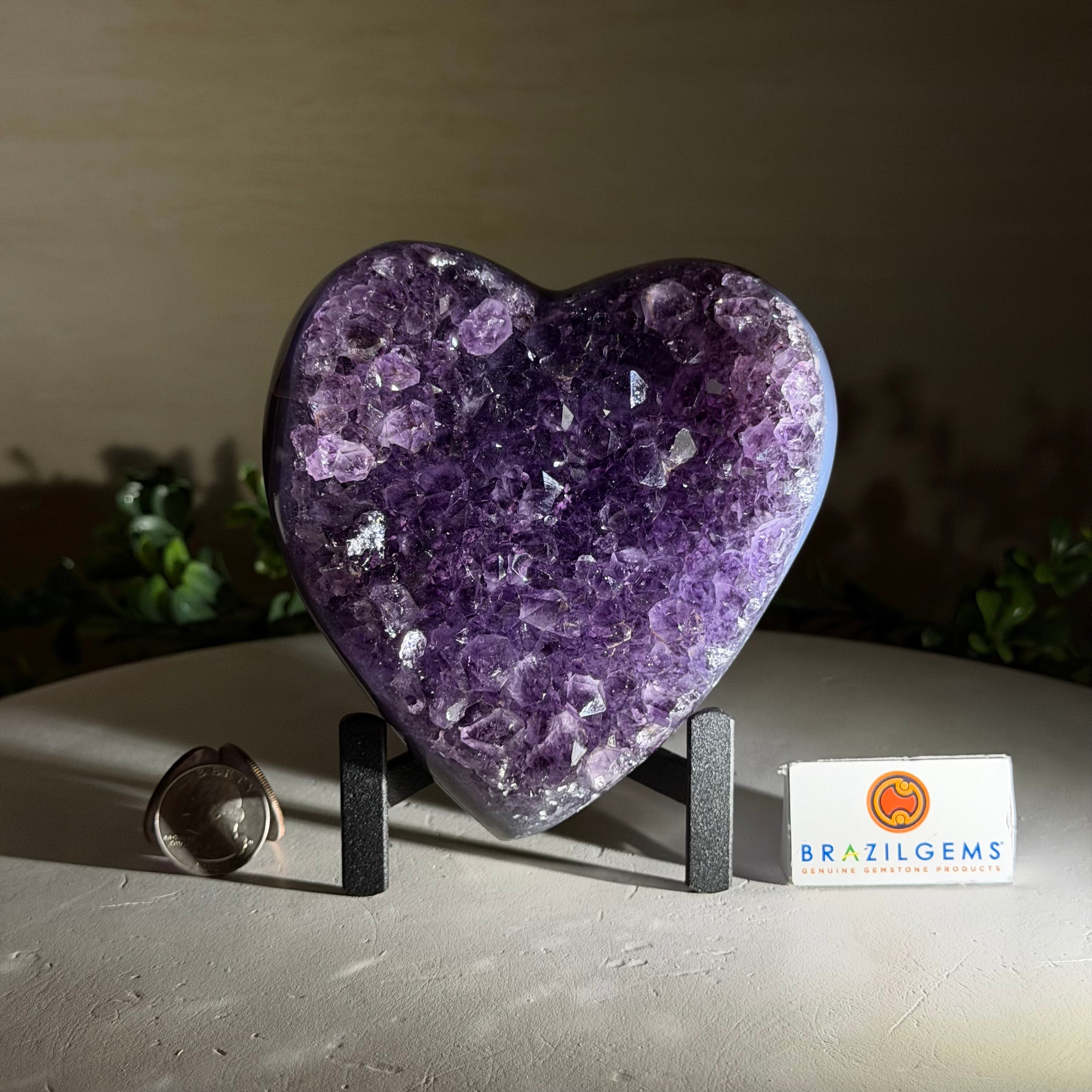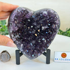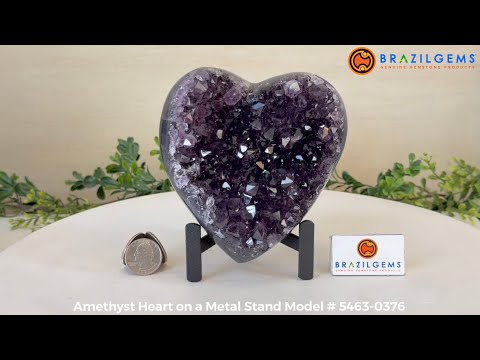 Experience the captivating beauty of this Extra Quality Heart-Shaped Amethyst Geode by Brazil Gems®. Elegantly displayed on a sleek black metal stand, this stunning gemstone showcases polished edges that highlight its vibrant violet hues, while the natural rough stone on the backside adds a touch of raw authenticity. Each crystal point sparkles with the unique, untouched beauty crafted by Mother Nature herself.
