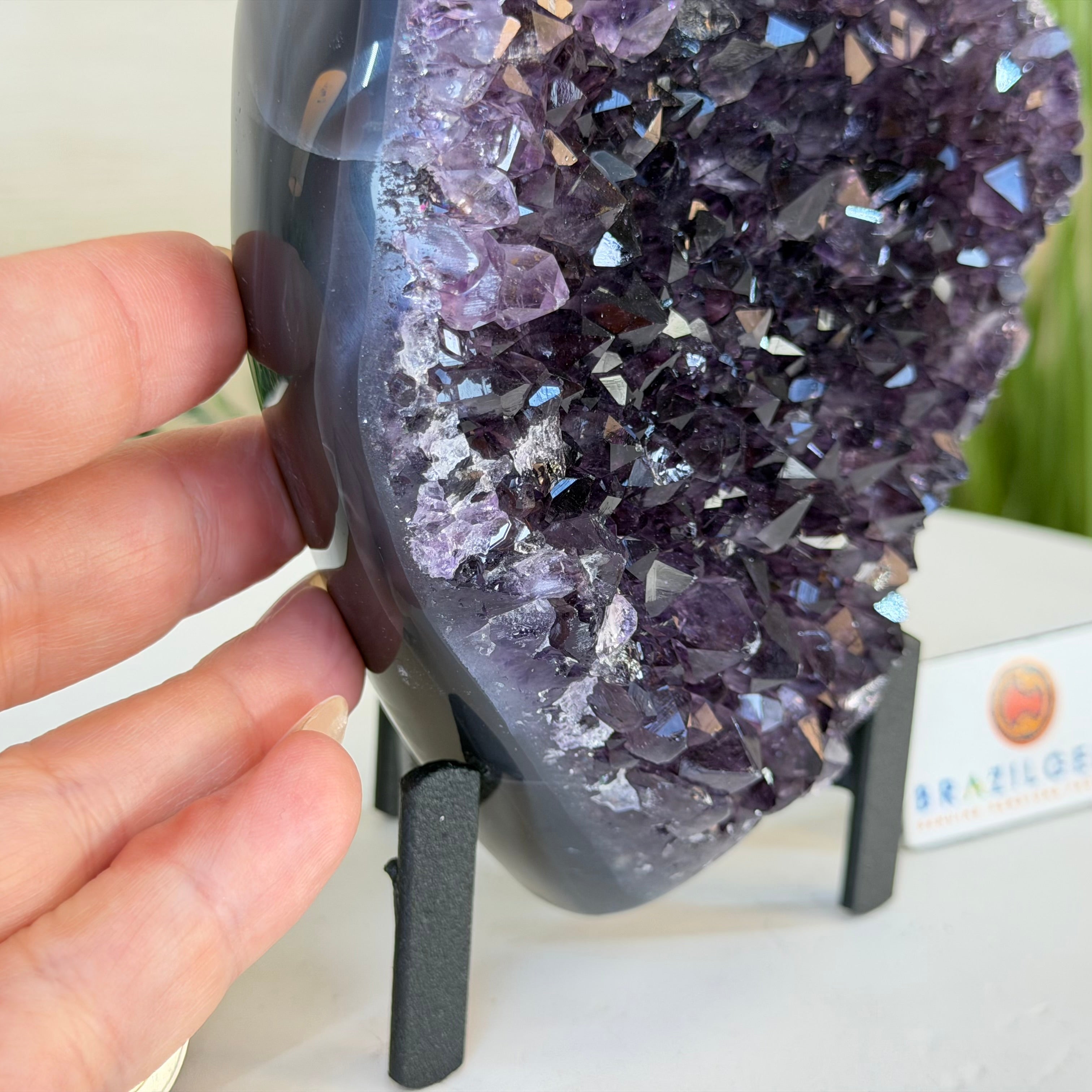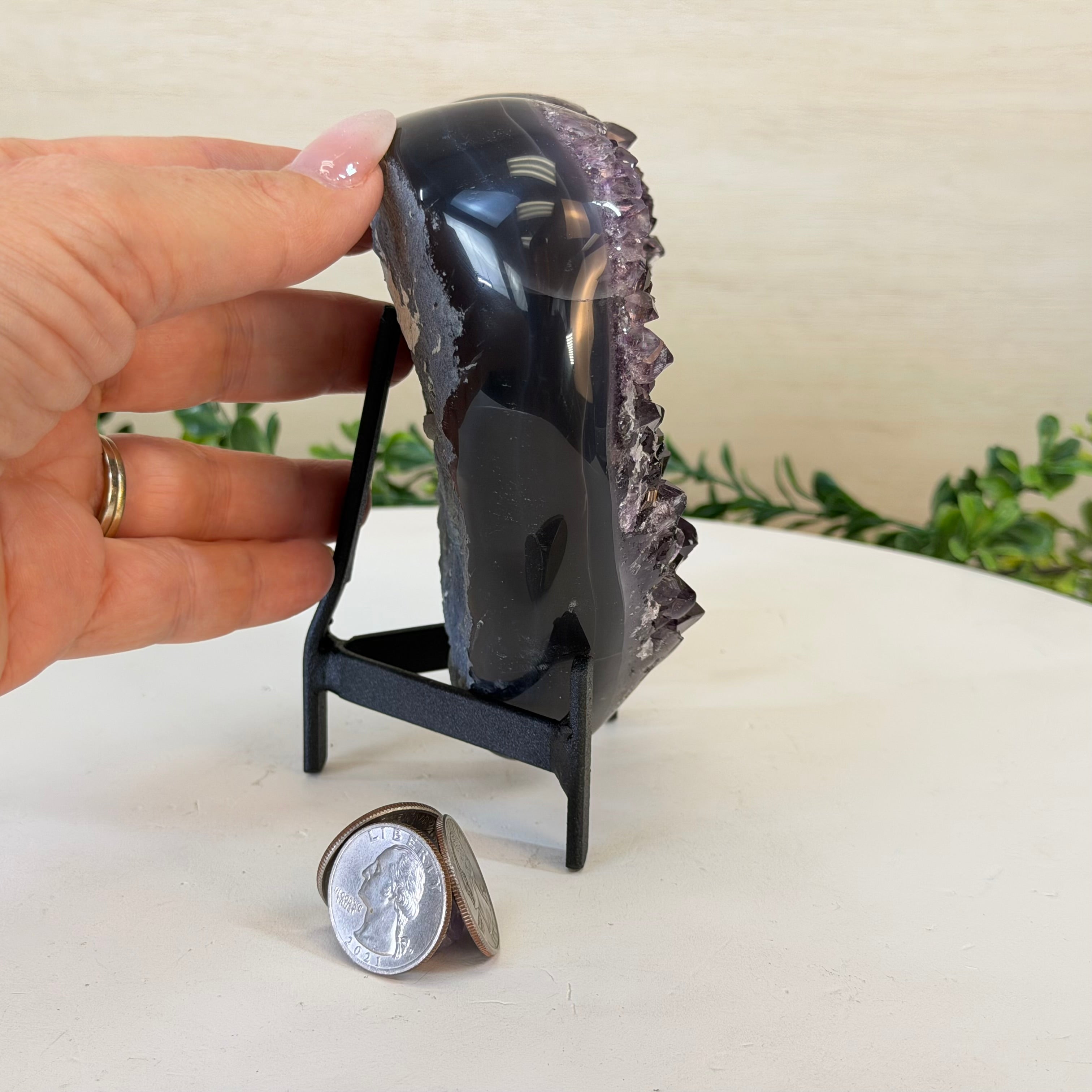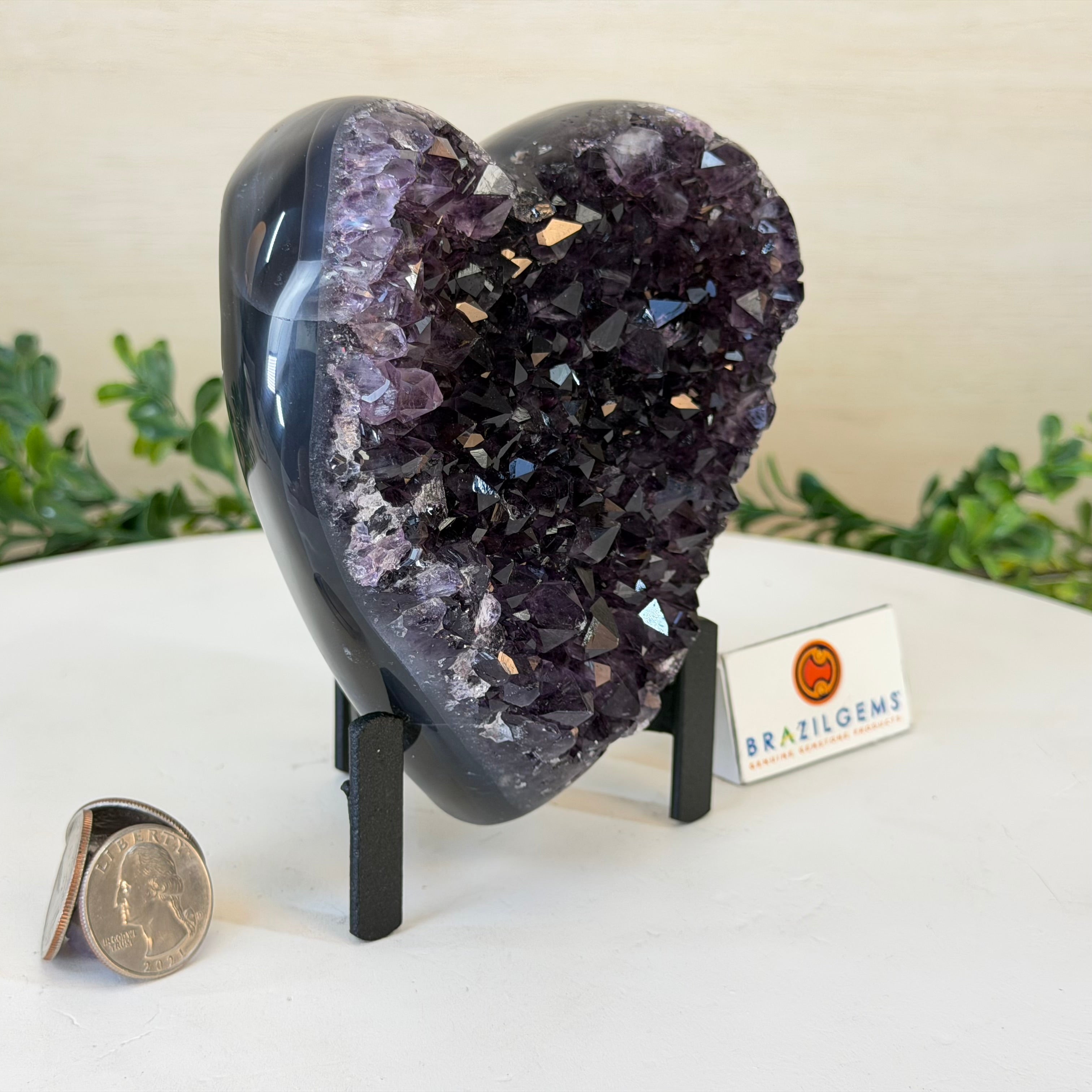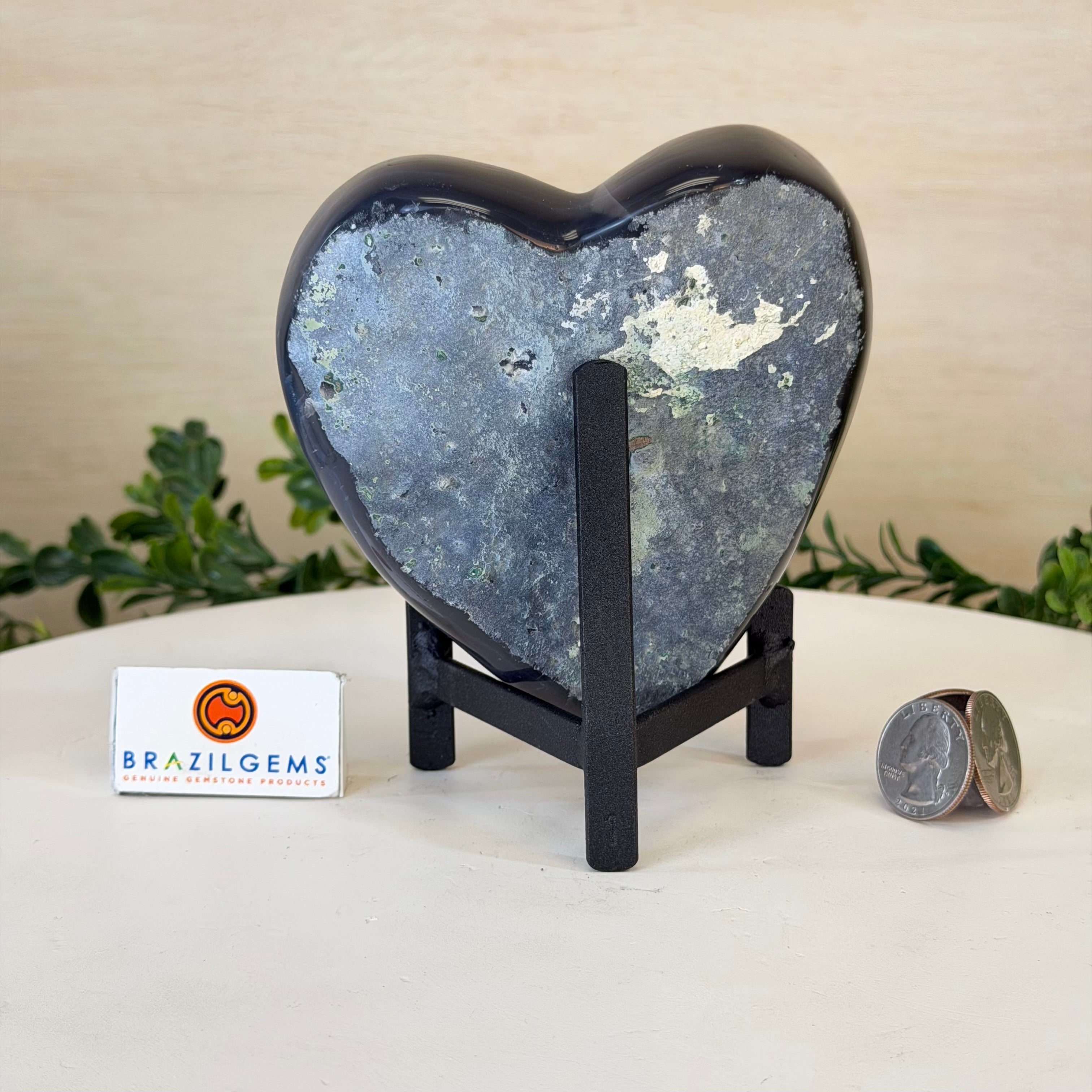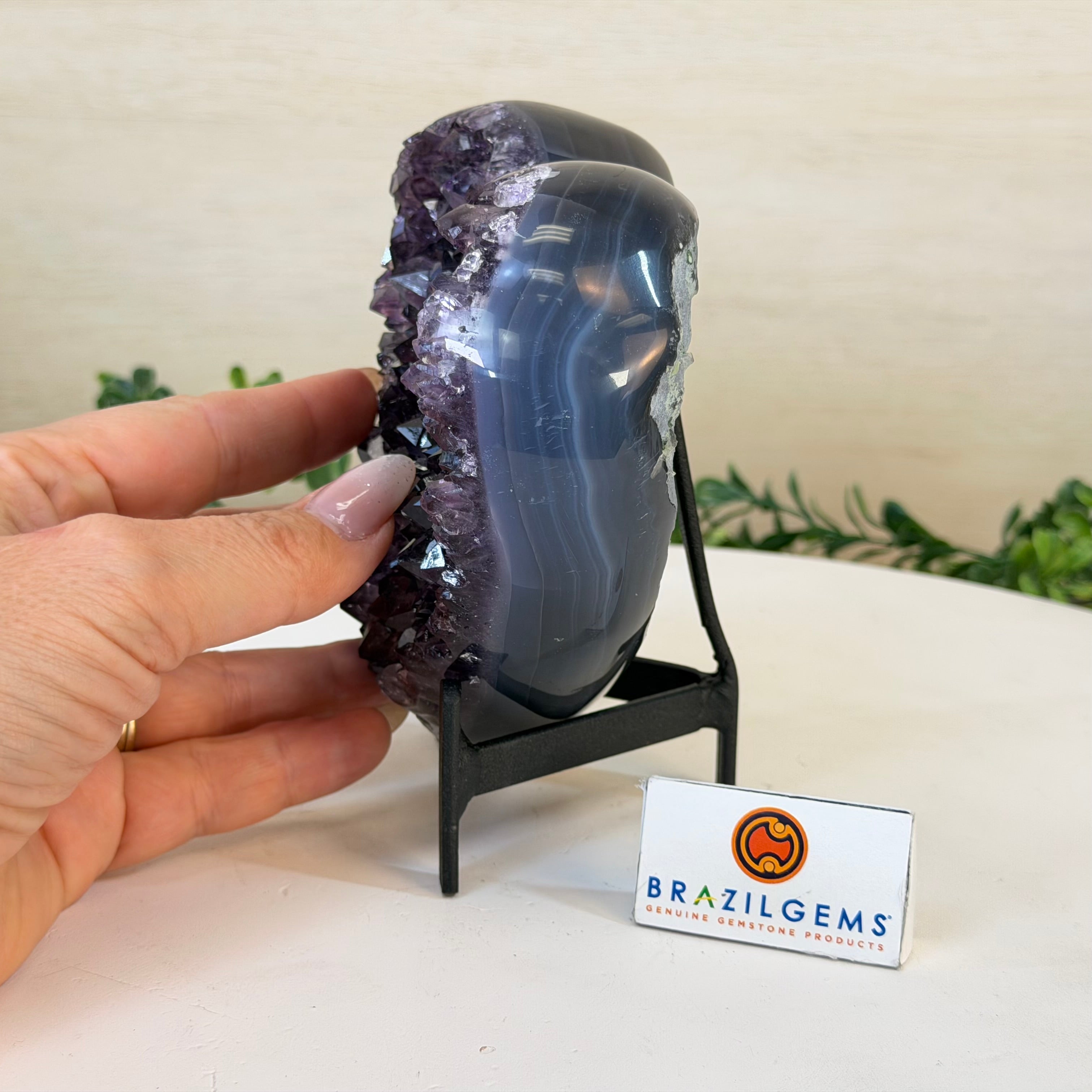 Disclaimer: This is a natural gemstone crystal sold by Brazil Gems® as is and as you see it in its images and video. It is the exact one you will receive. It may contain natural imperfections as well as imperfections, broken edges and repairs from the extraction, polishing, prepping and mounting processes. The metal stand is custom made to fit this gemstone and painted black. At Brazil Gems® we make every effort to get measurements as exact as possible but they are done by human hands and eyes and therefore may have minor discrepancies.