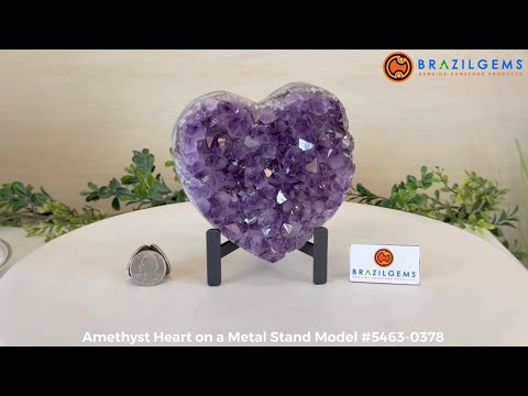 Experience the captivating beauty of this Extra Plus Quality Heart-Shaped Amethyst Geode by Brazil Gems®. Elegantly displayed on a sleek black metal stand, this stunning gemstone showcases polished edges that highlight its vibrant violet hues, while the natural rough stone on the backside adds a touch of raw authenticity. Each crystal point sparkles with the unique, untouched beauty crafted by Mother Nature herself.