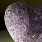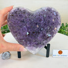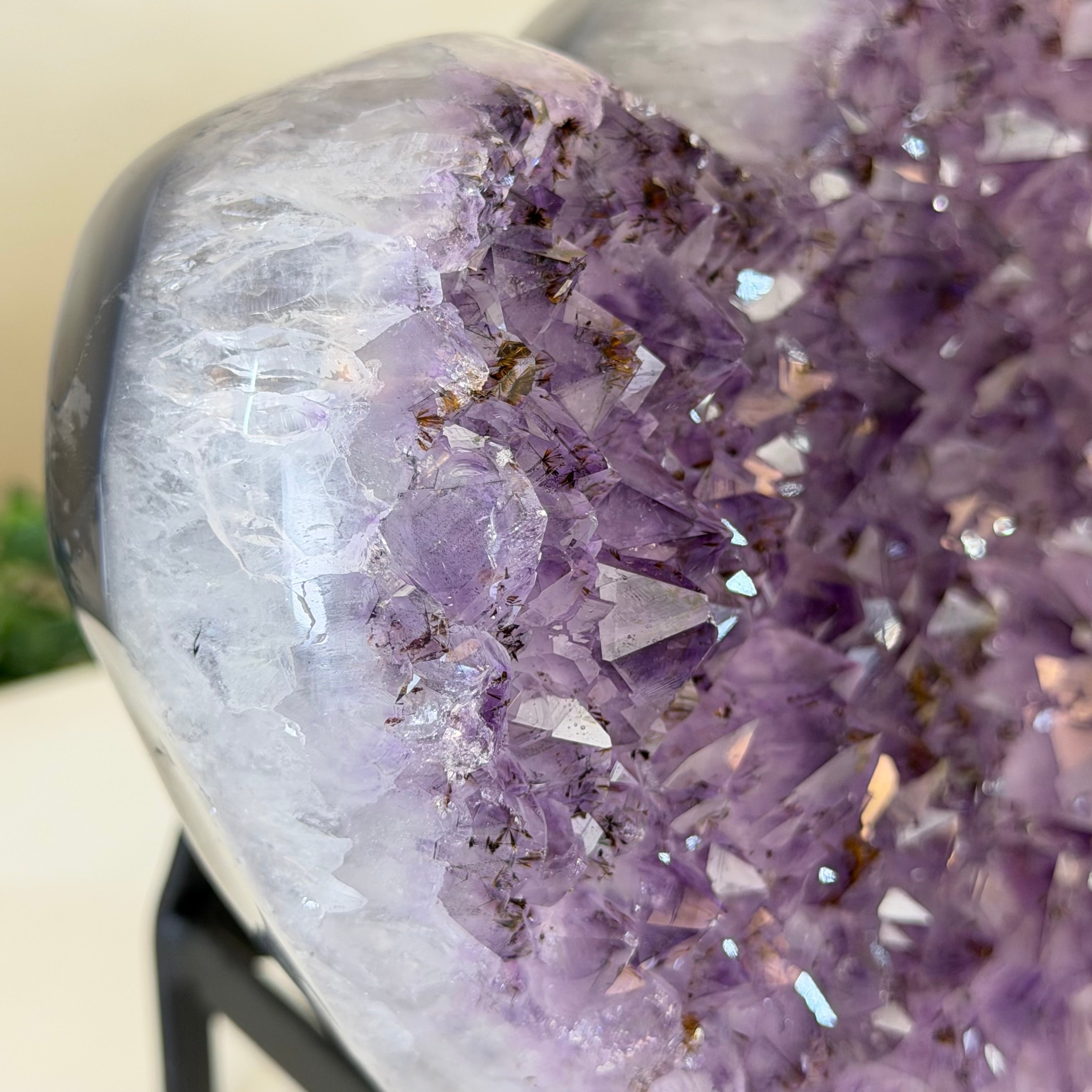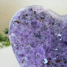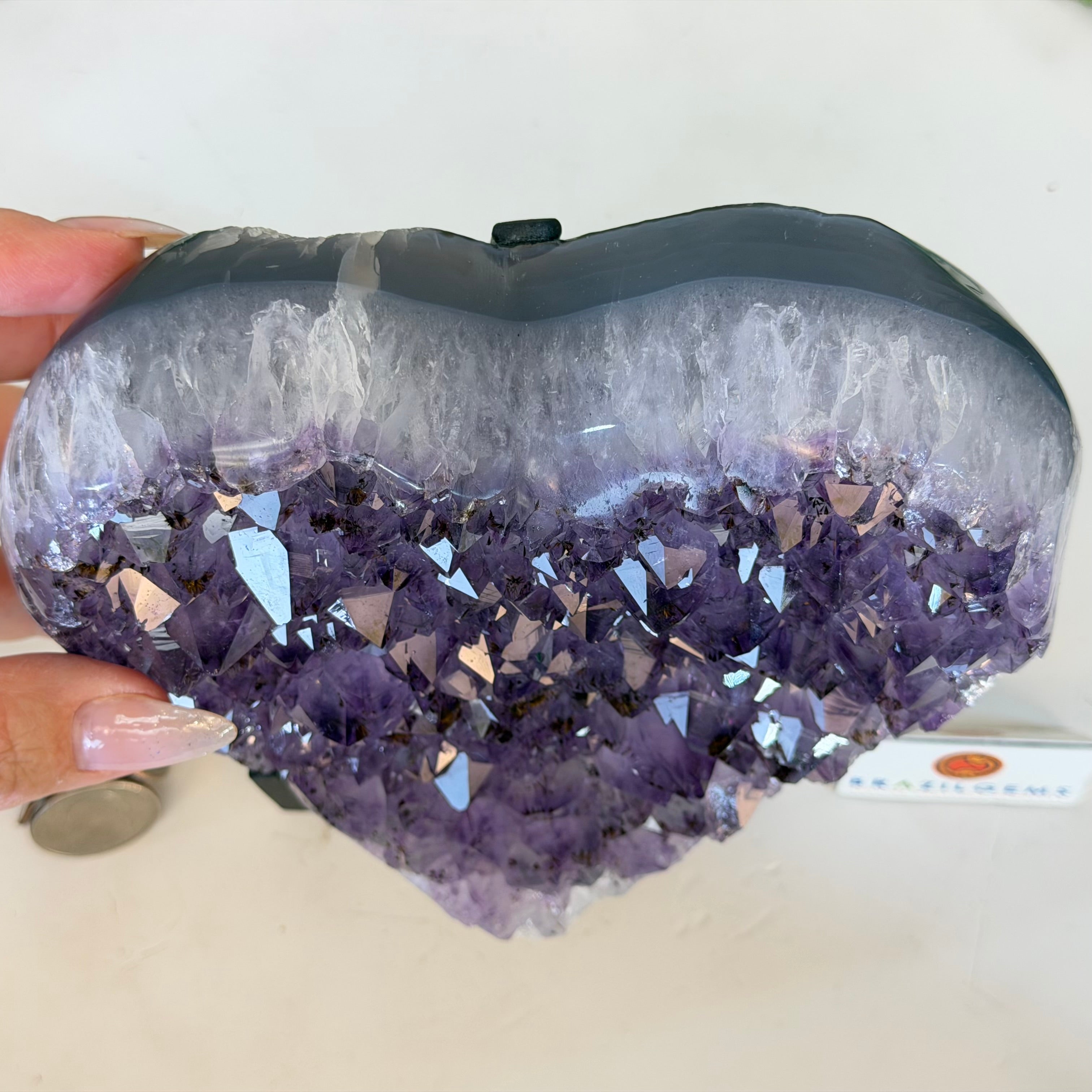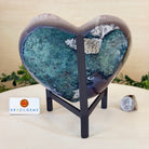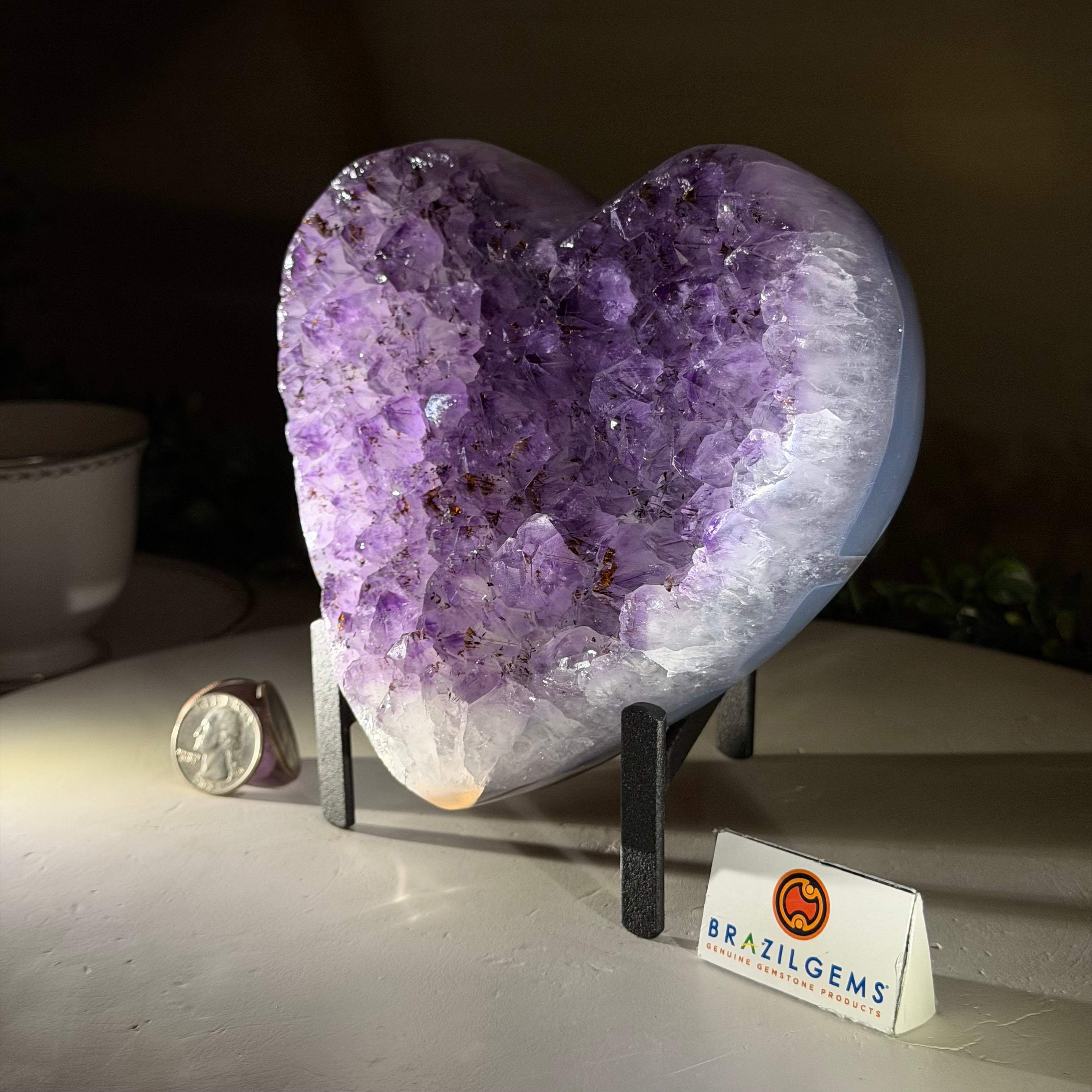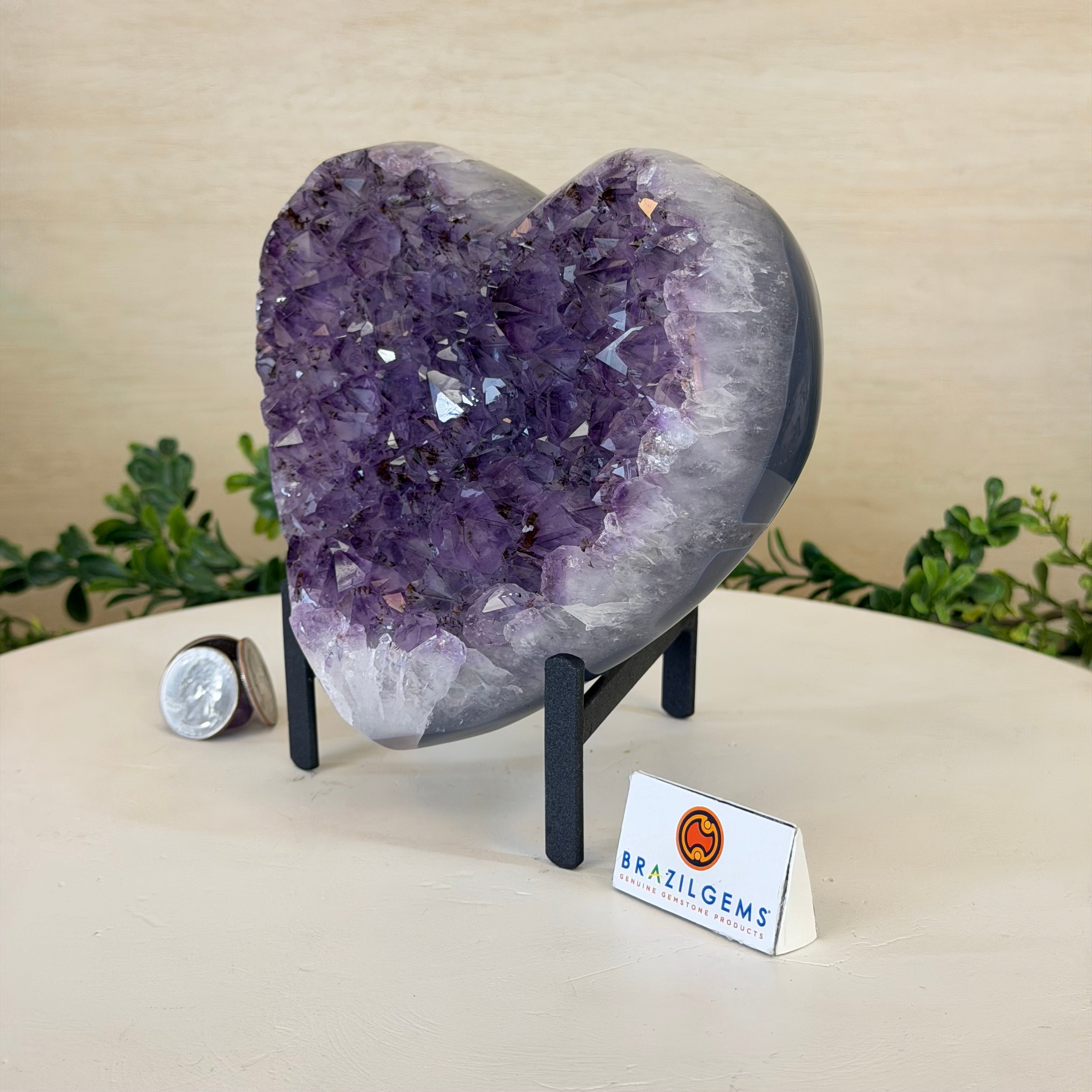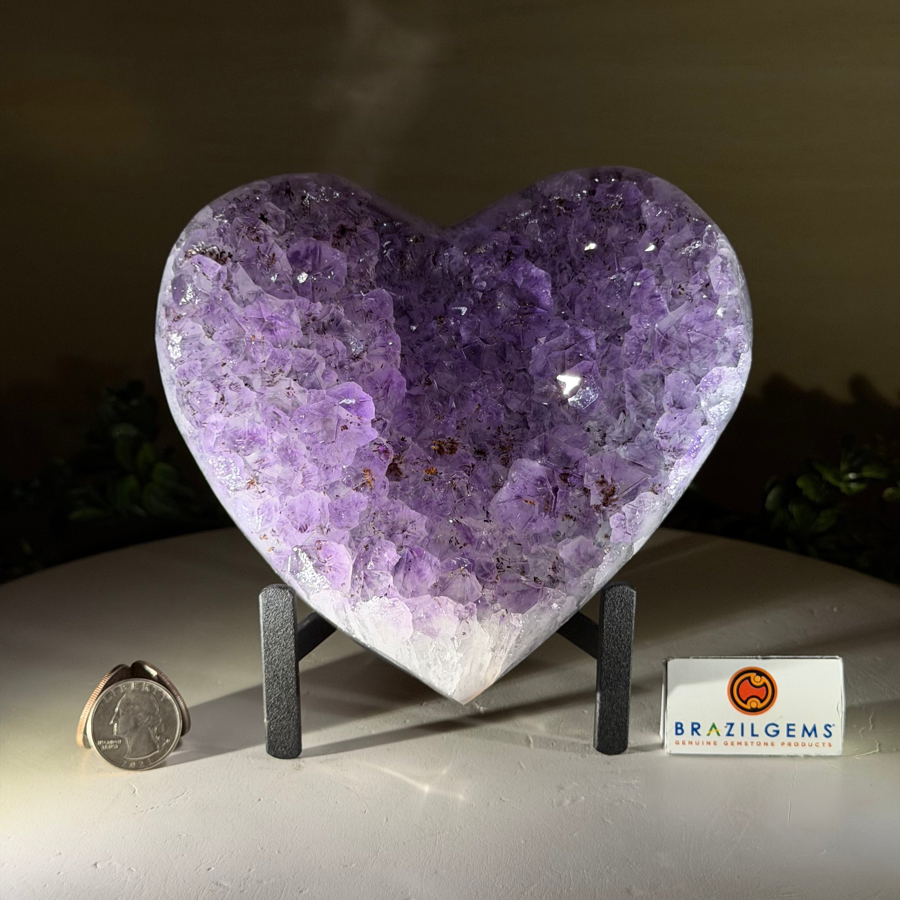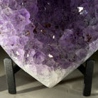 Experience the captivating beauty of this Extra Plus Quality Heart-Shaped Amethyst Geode by Brazil Gems®. Elegantly displayed on a sleek black metal stand, this stunning gemstone showcases polished edges that highlight its vibrant violet hues, while the natural rough stone on the backside adds a touch of raw authenticity. Each crystal point sparkles with the unique, untouched beauty crafted by Mother Nature herself.