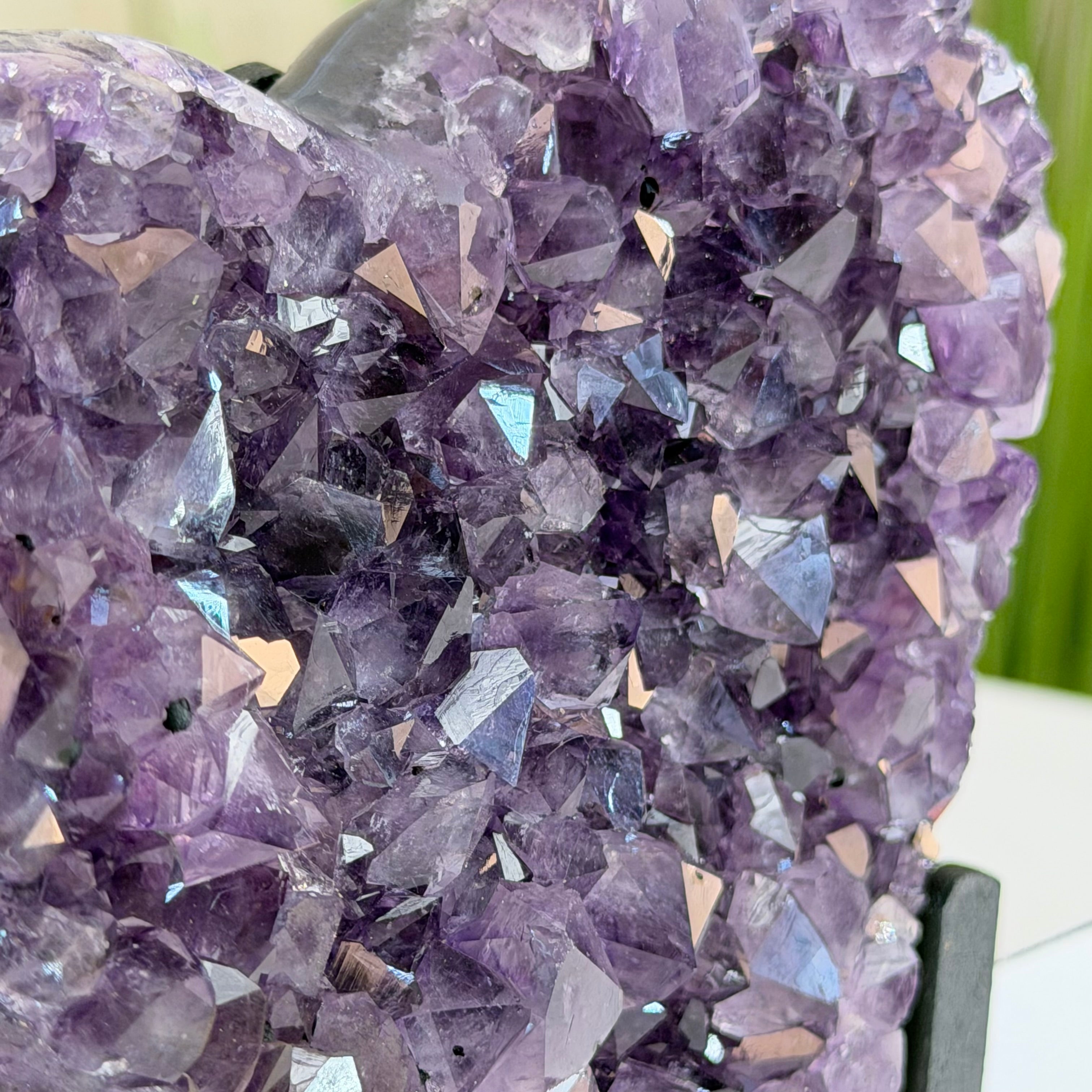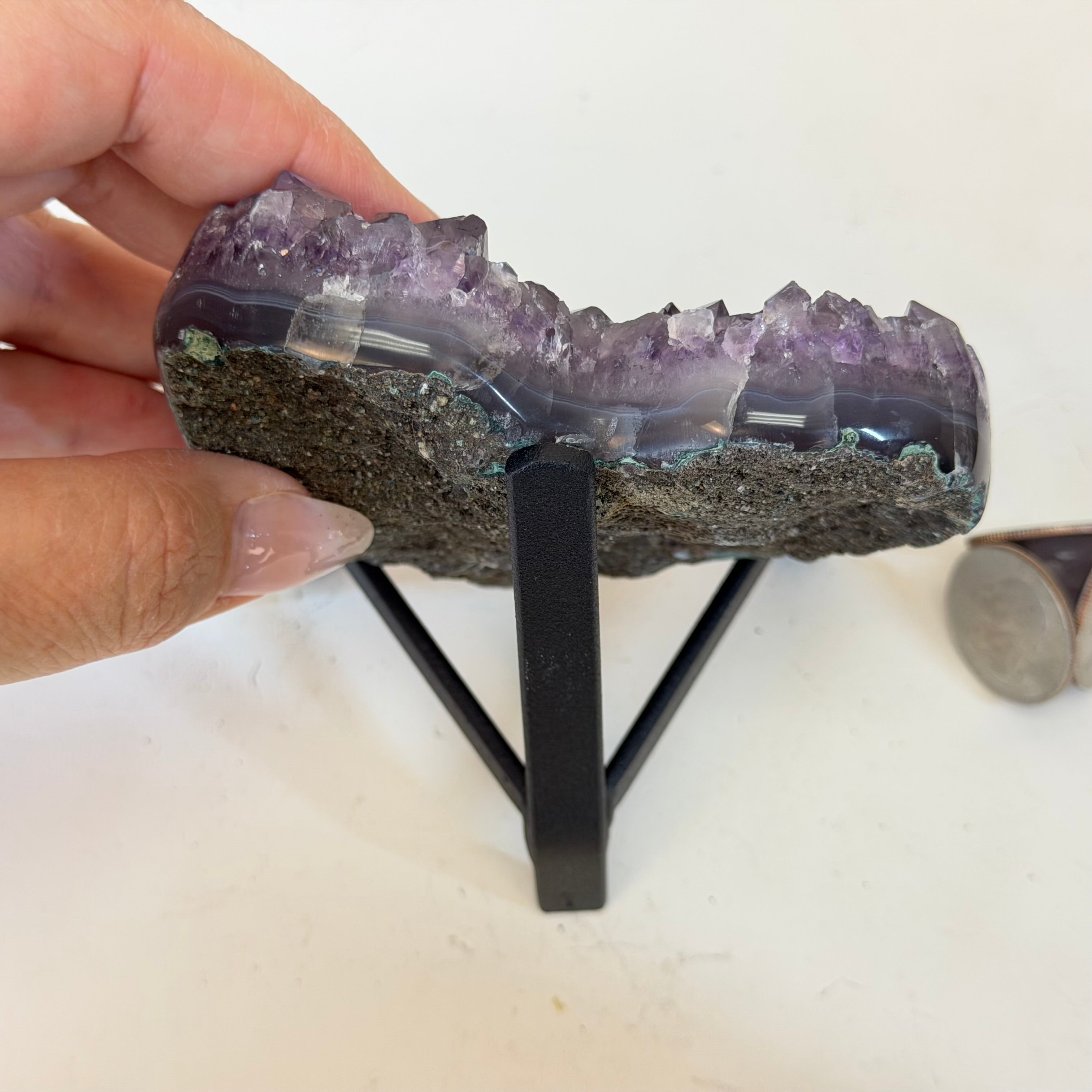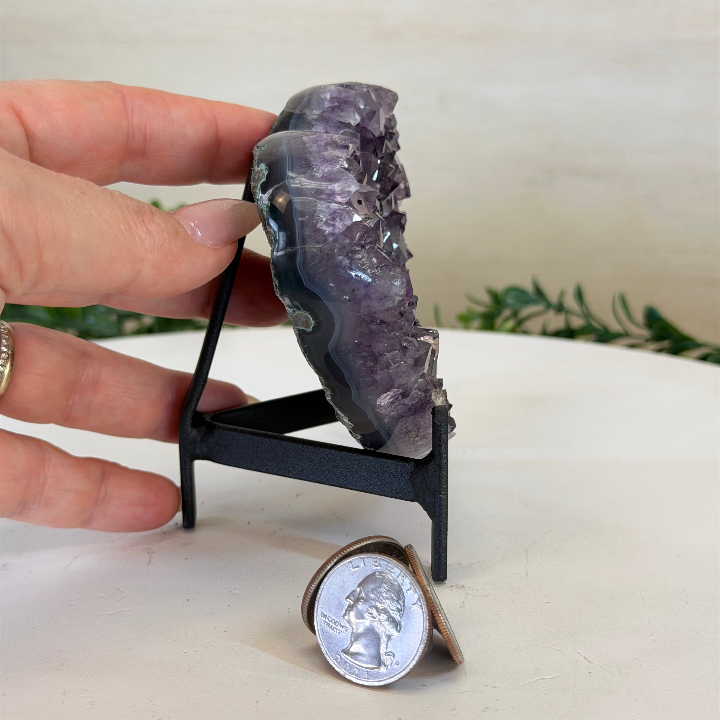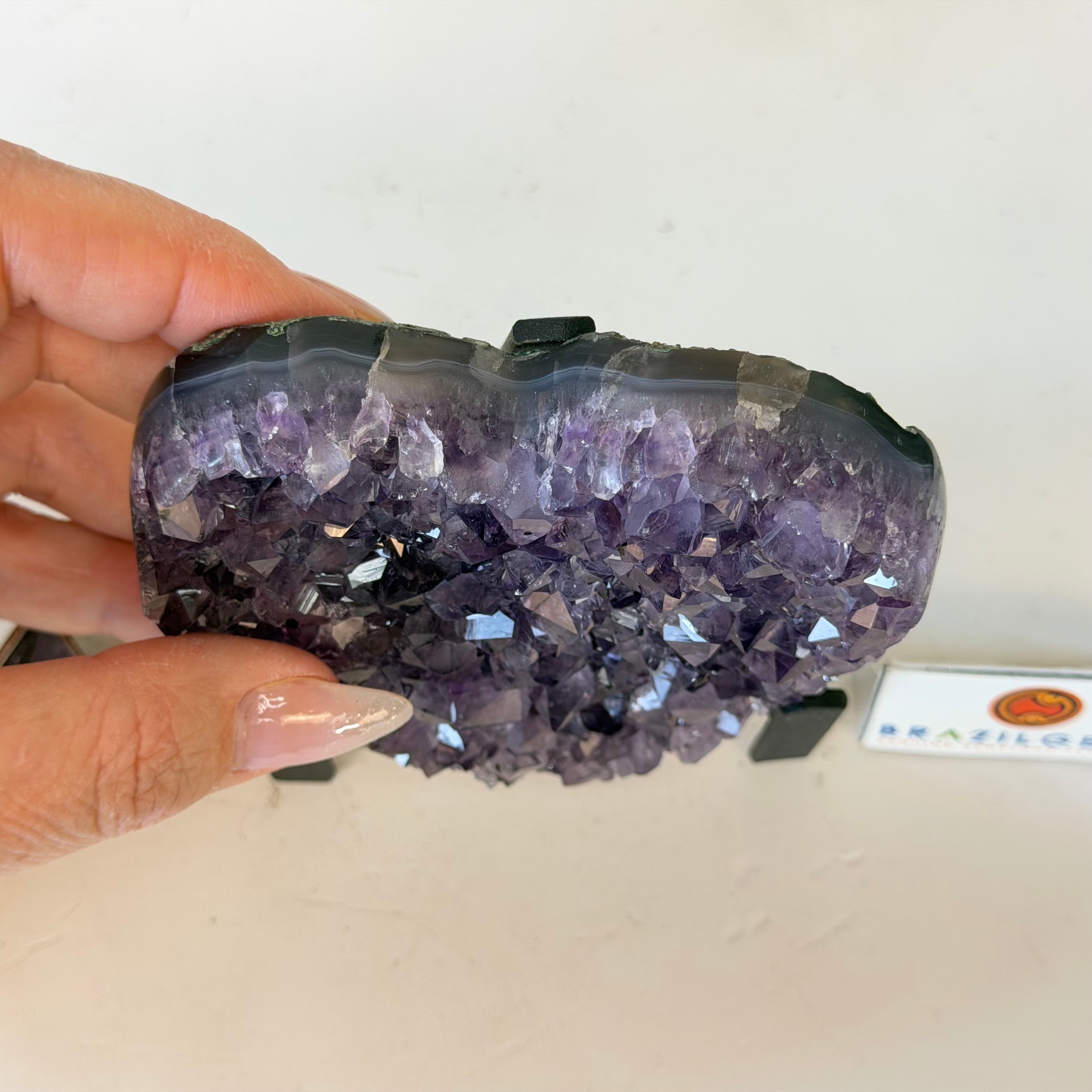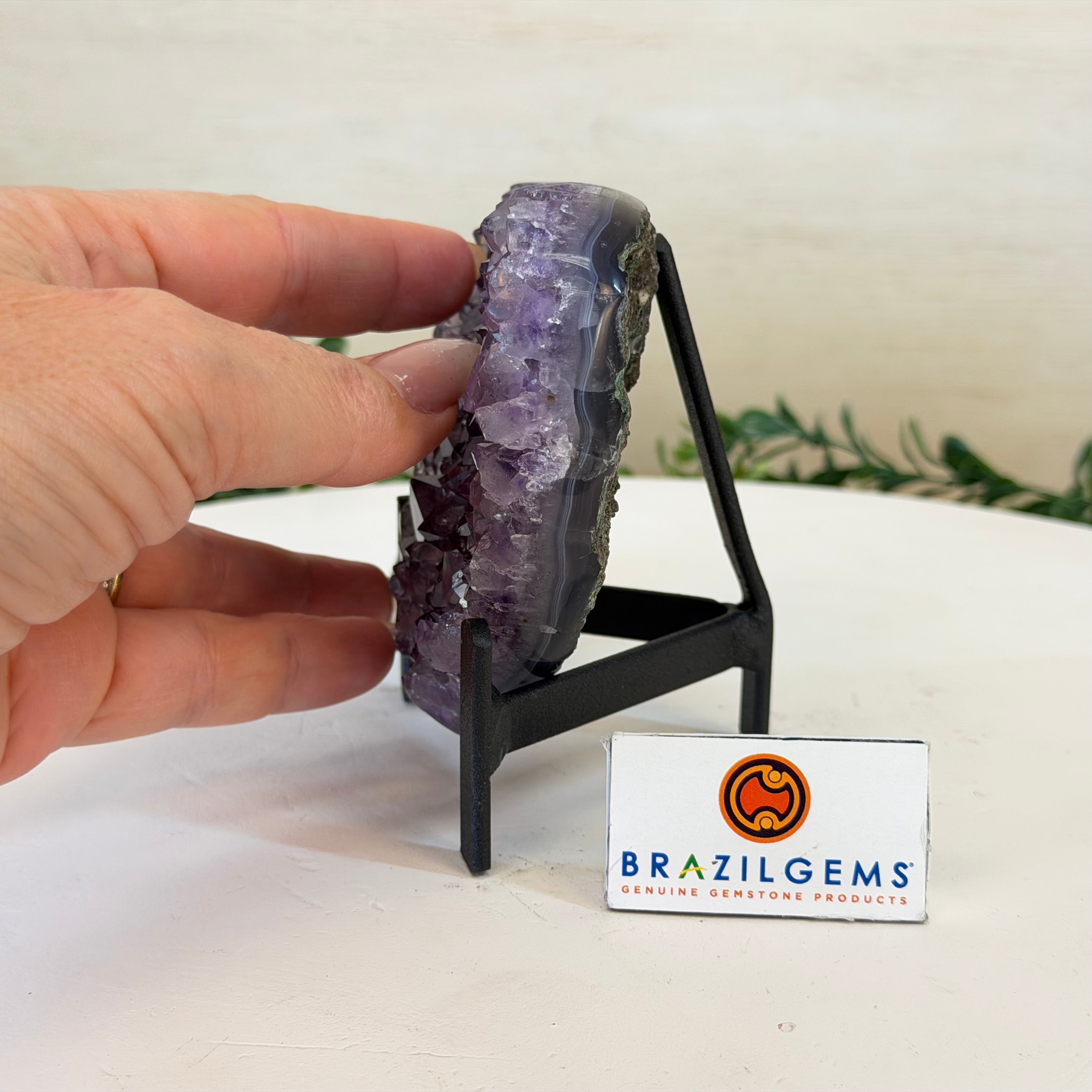 Disclaimer: This is a natural gemstone crystal sold by Brazil Gems® as is and as you see it in its images and video. It is the exact one you will receive. It may contain natural imperfections as well as imperfections, broken edges and repairs from the extraction, polishing, prepping and mounting processes. The metal stand is custom made to fit this gemstone and painted black. At Brazil Gems® we make every effort to get measurements as exact as possible but they are done by human hands and eyes and therefore may have minor discrepancies.
