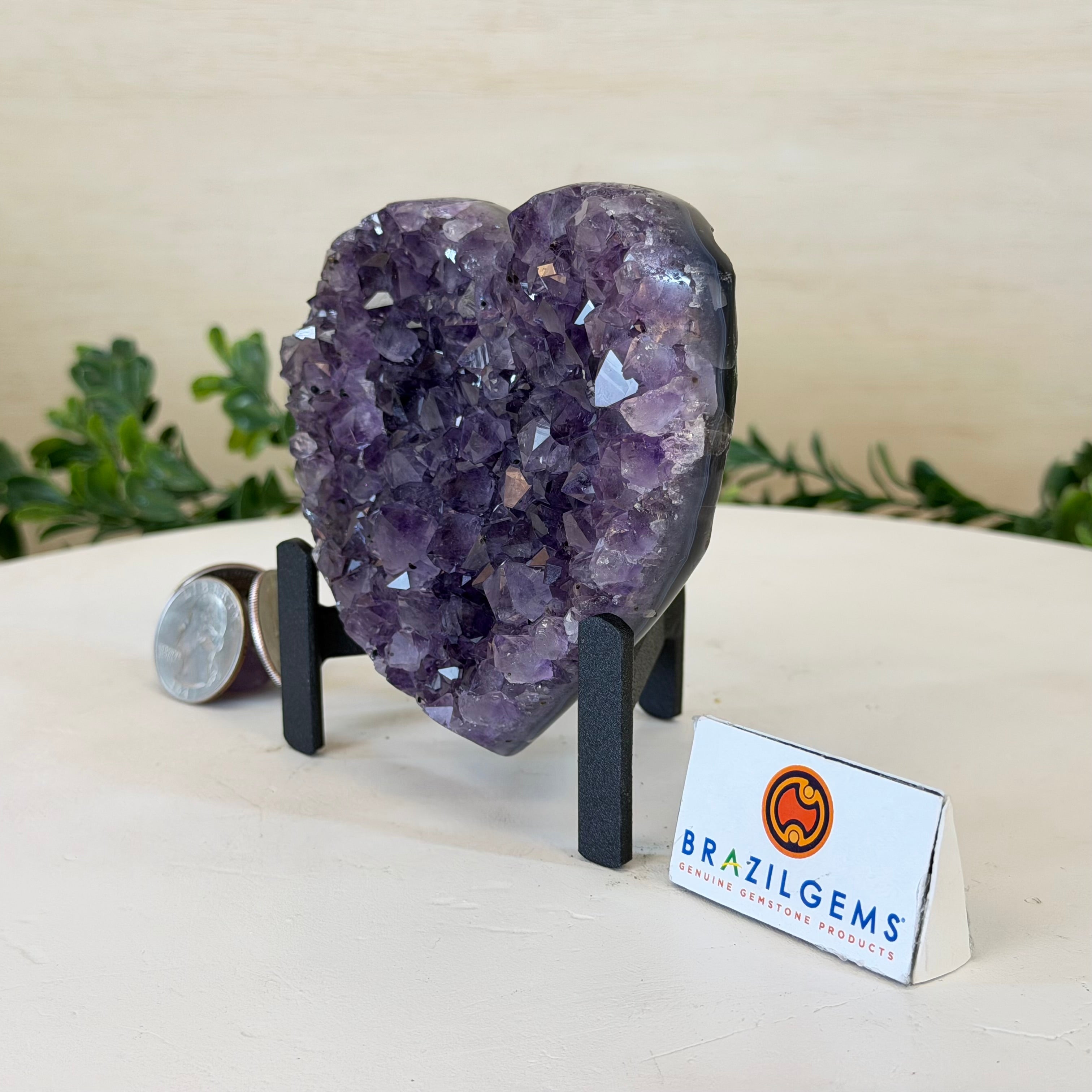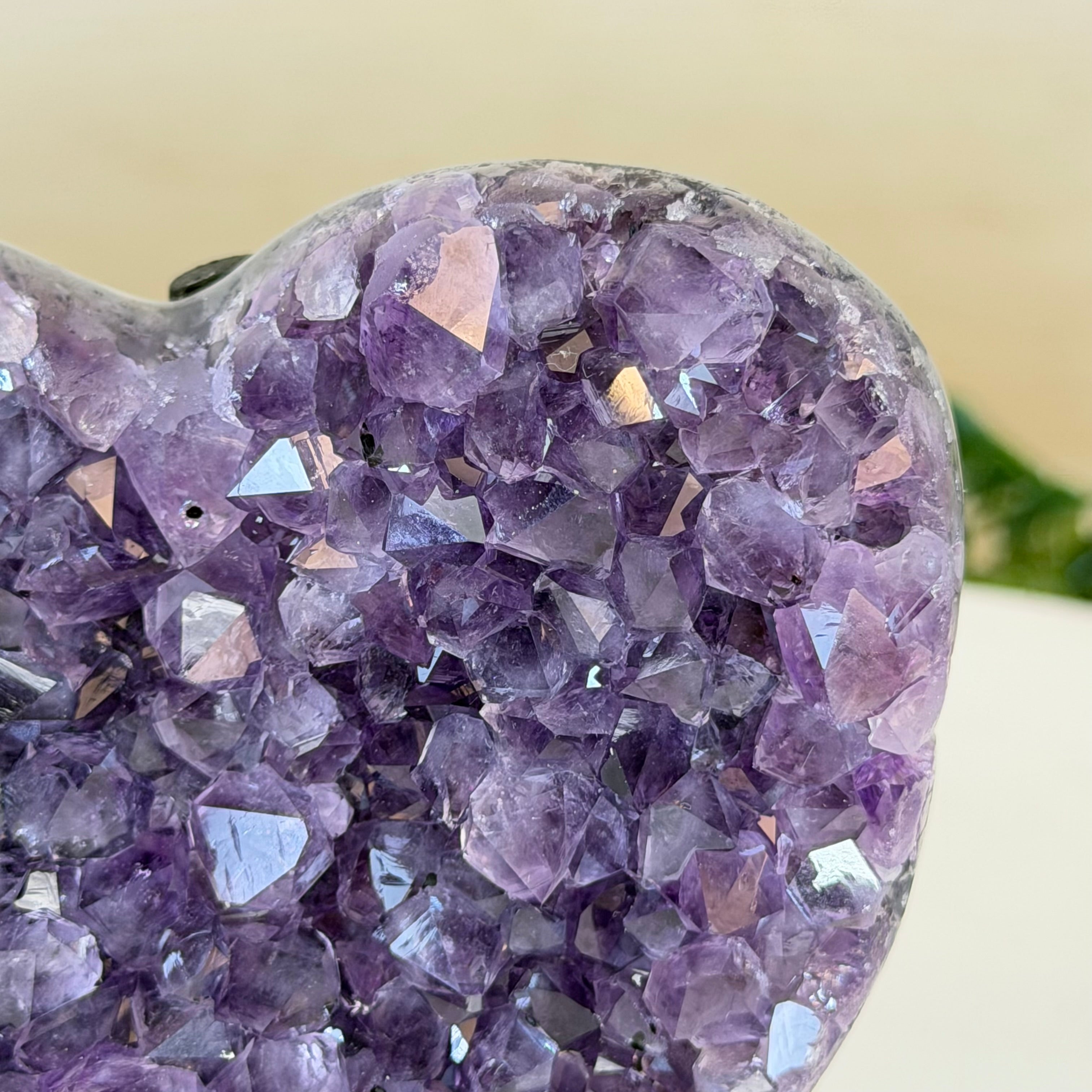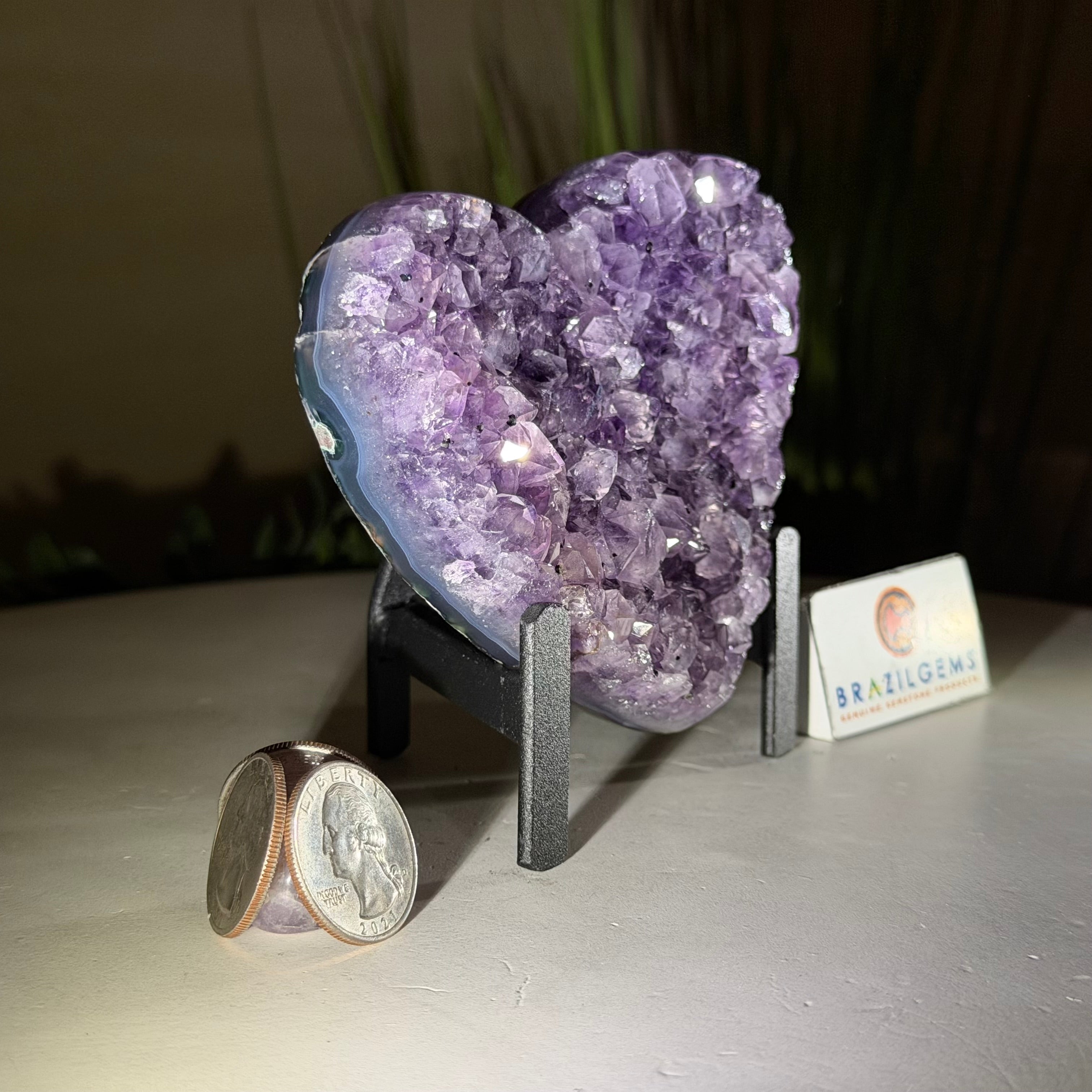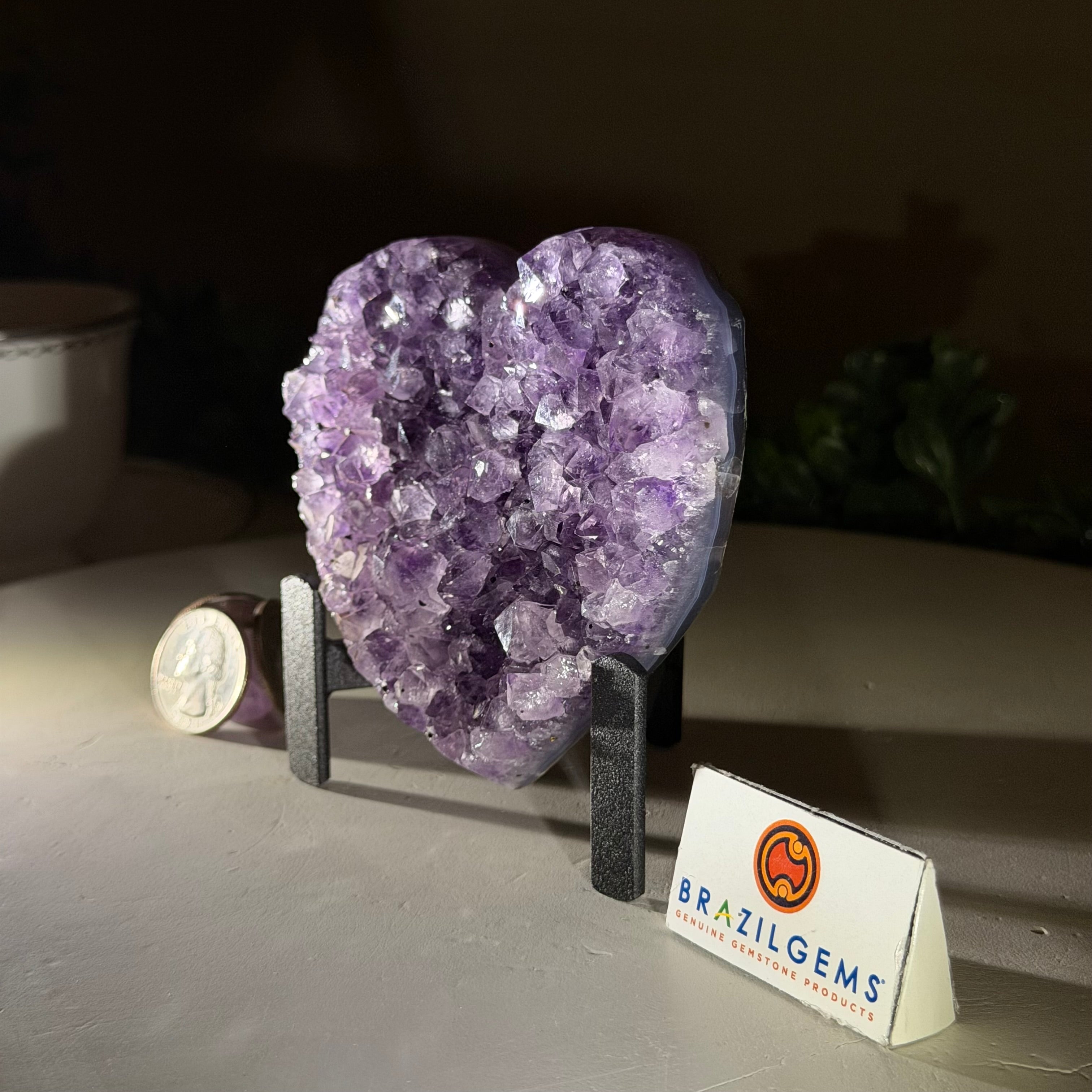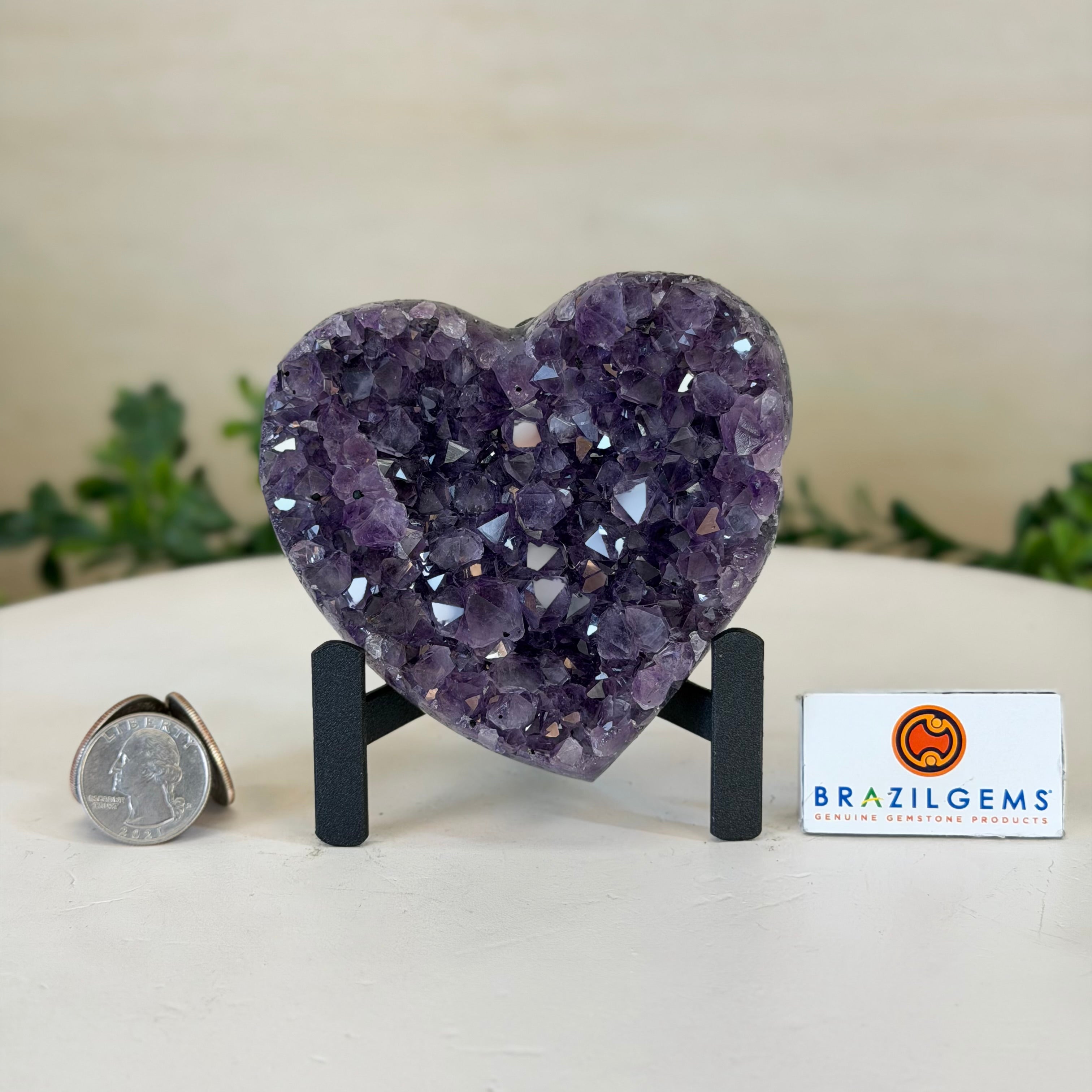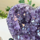 Experience the captivating beauty of this Extra Plus Quality Heart-Shaped Amethyst Geode by Brazil Gems®. Elegantly displayed on a sleek black metal stand, this stunning gemstone showcases polished edges that highlight its vibrant violet hues, while the natural rough stone on the backside adds a touch of raw authenticity. Each crystal point sparkles with the unique, untouched beauty crafted by Mother Nature herself.
