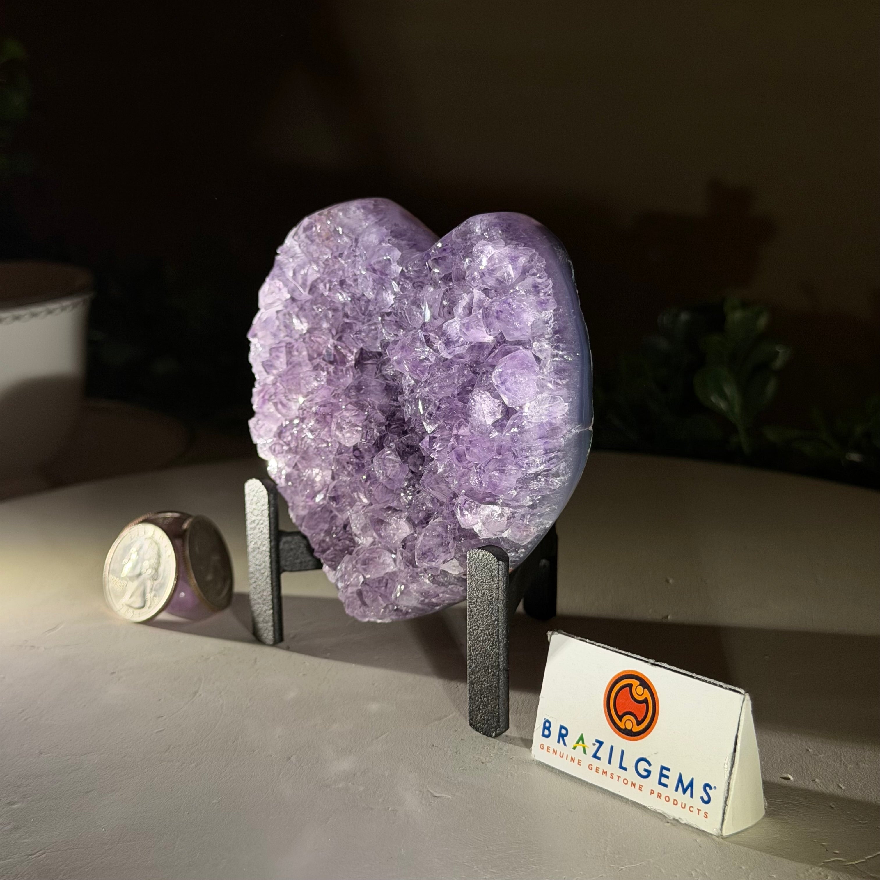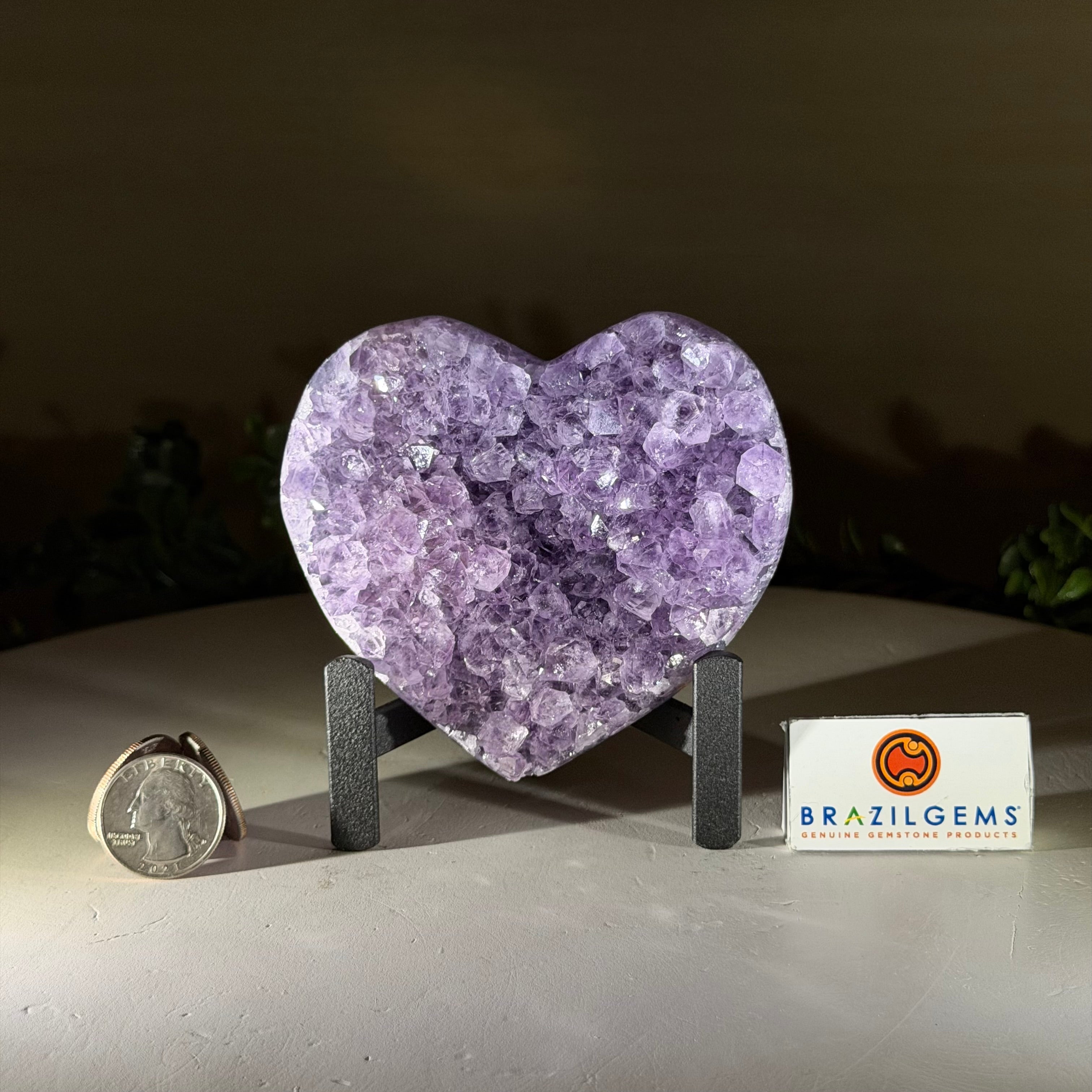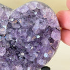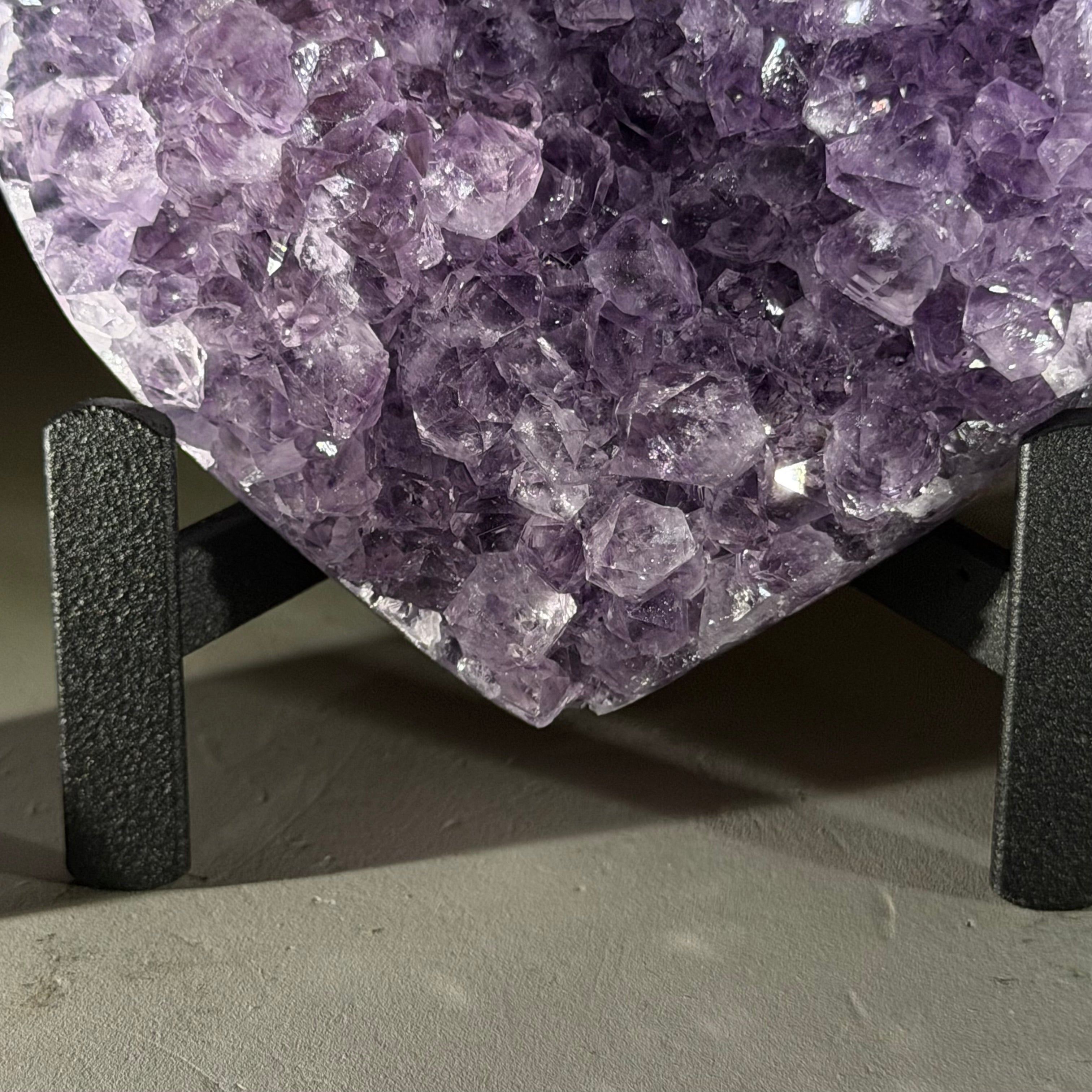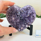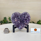 Experience the captivating beauty of this Extra Quality Heart-Shaped Amethyst Geode by Brazil Gems®. Elegantly displayed on a sleek black metal stand, this stunning gemstone showcases polished edges that highlight its vibrant violet hues, while the natural rough stone on the backside adds a touch of raw authenticity. Each crystal point sparkles with the unique, untouched beauty crafted by Mother Nature herself.