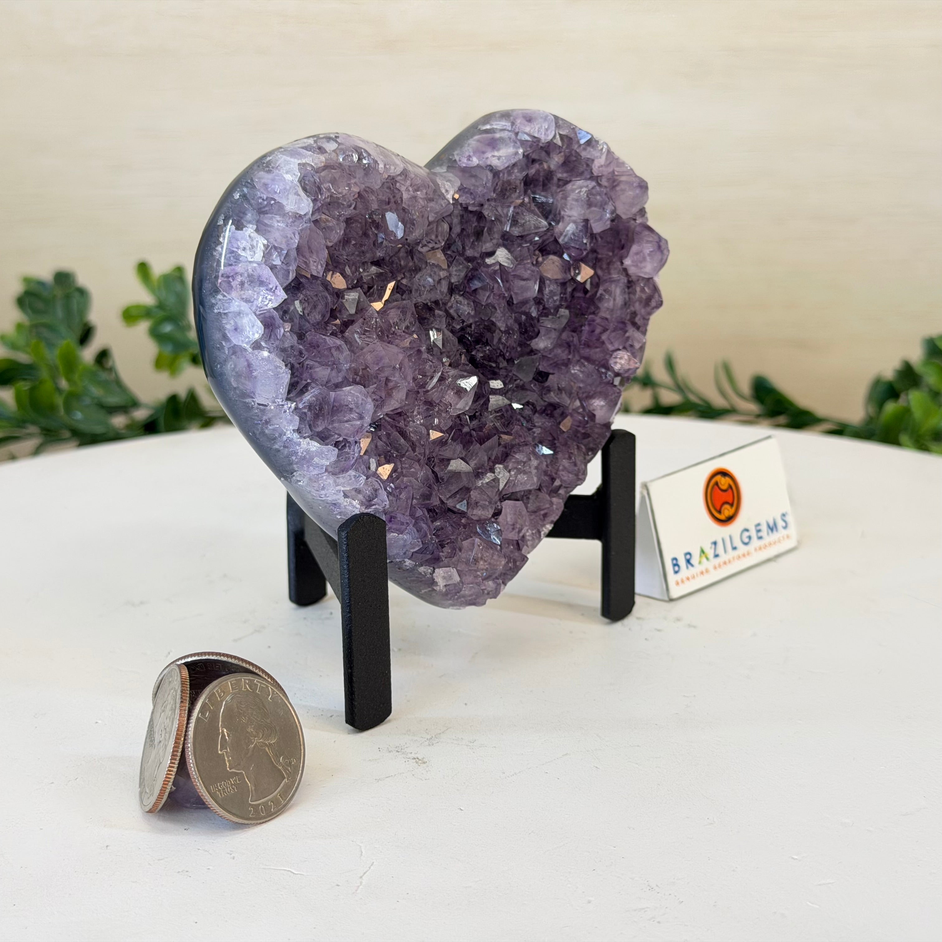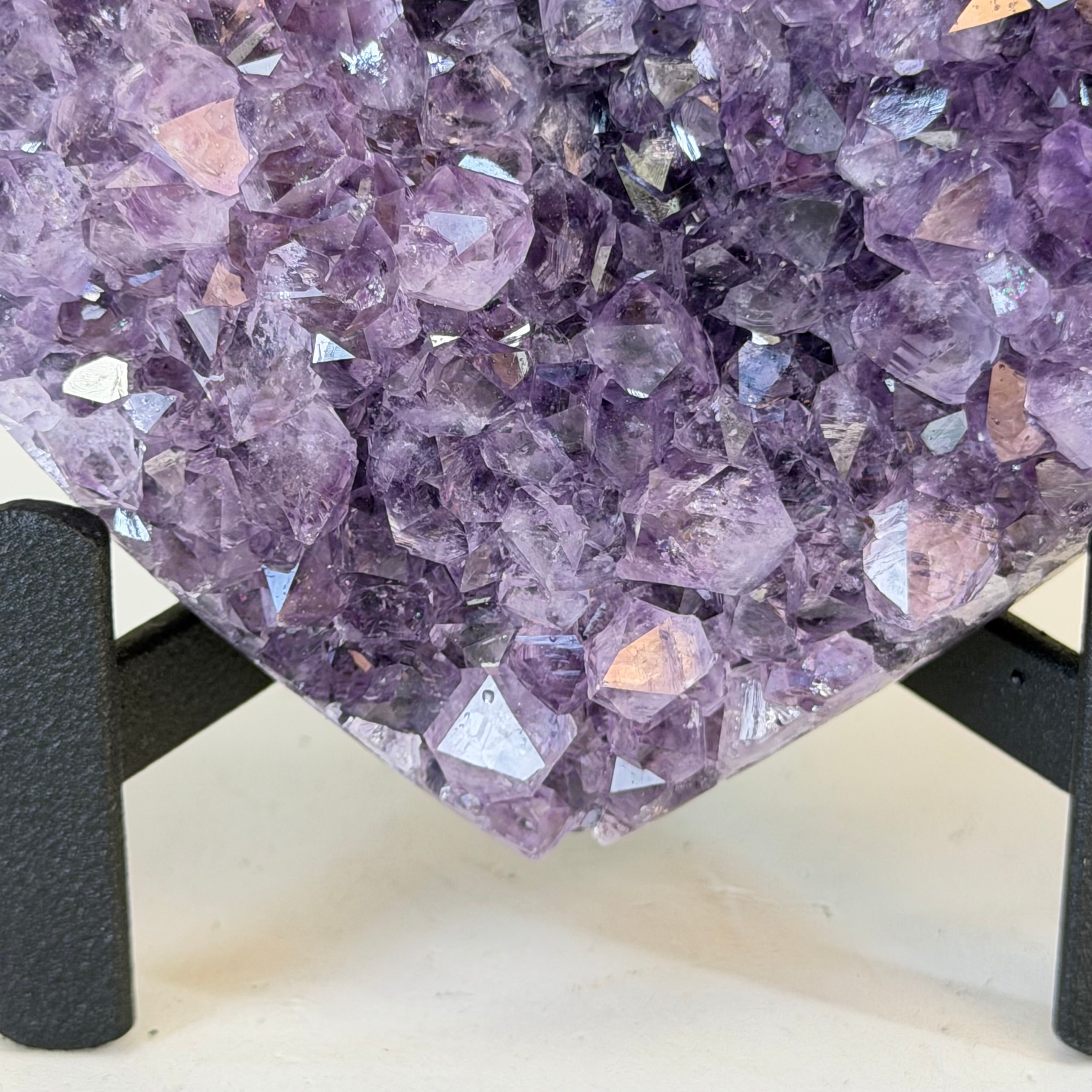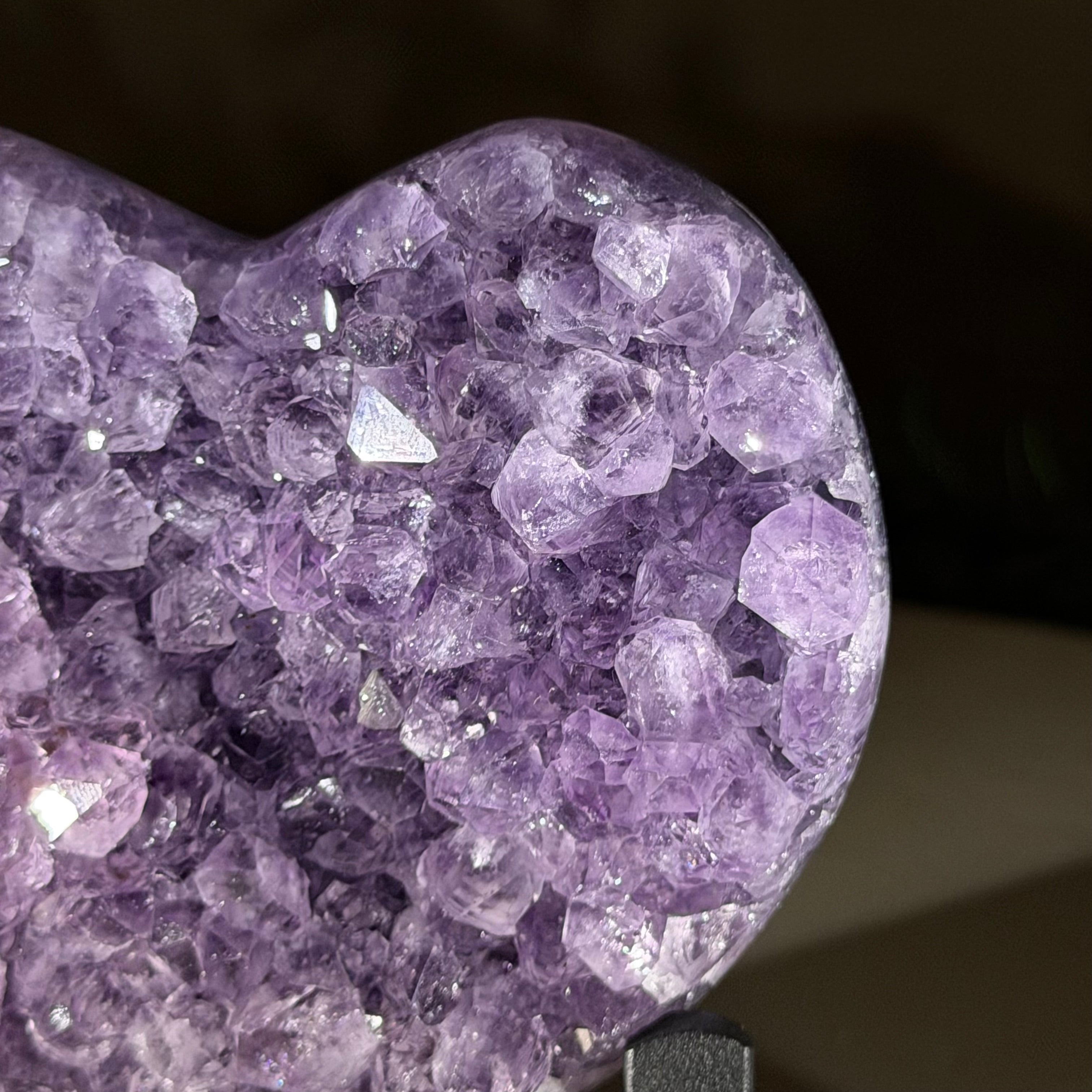 Experience the captivating beauty of this Extra Quality Heart-Shaped Amethyst Geode by Brazil Gems®. Elegantly displayed on a sleek black metal stand, this stunning gemstone showcases polished edges that highlight its vibrant violet hues, while the natural rough stone on the backside adds a touch of raw authenticity. Each crystal point sparkles with the unique, untouched beauty crafted by Mother Nature herself.