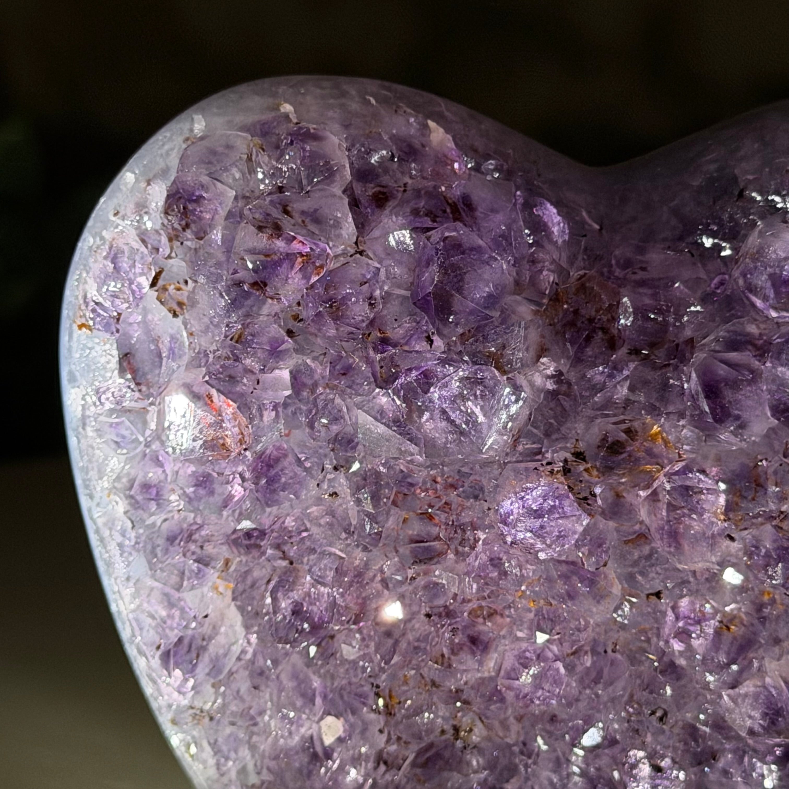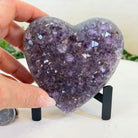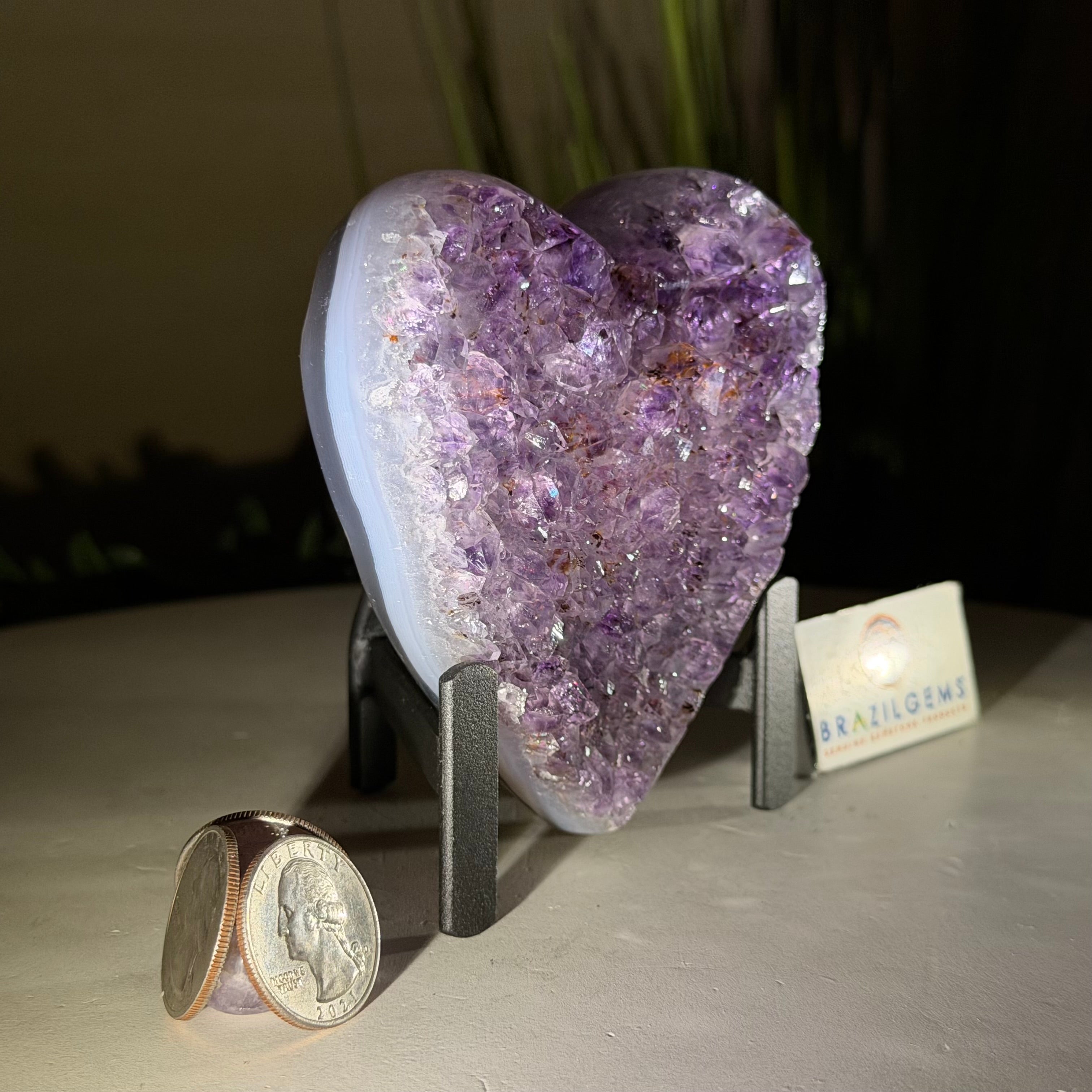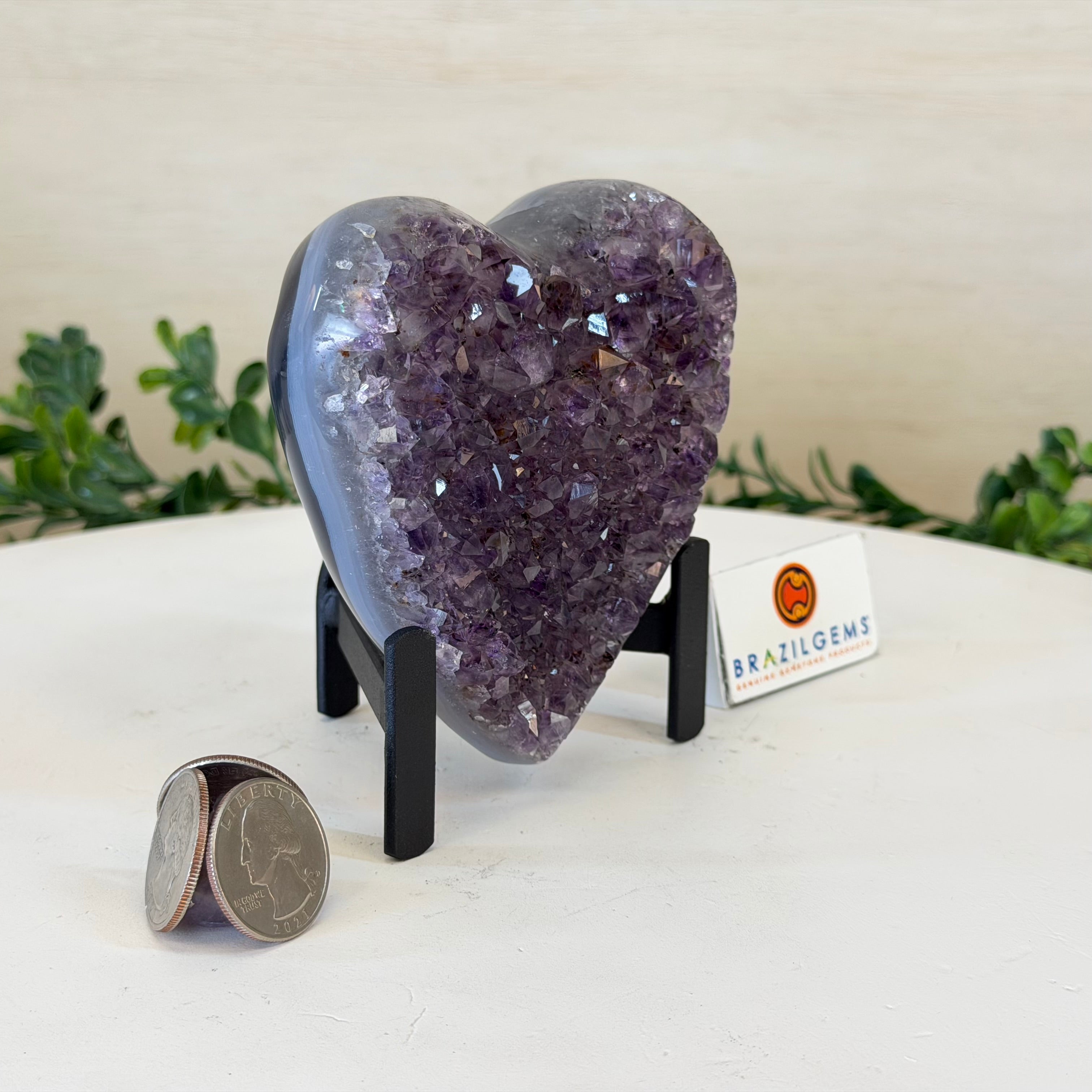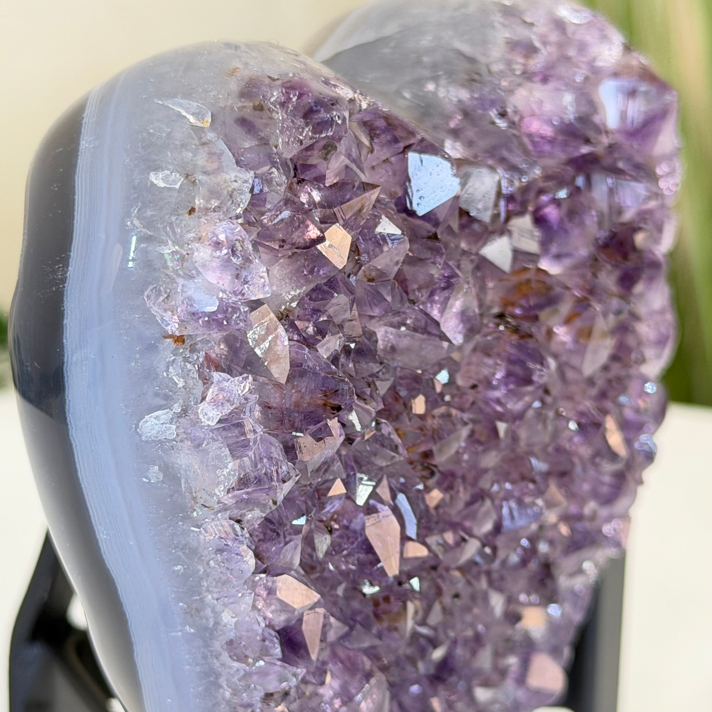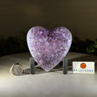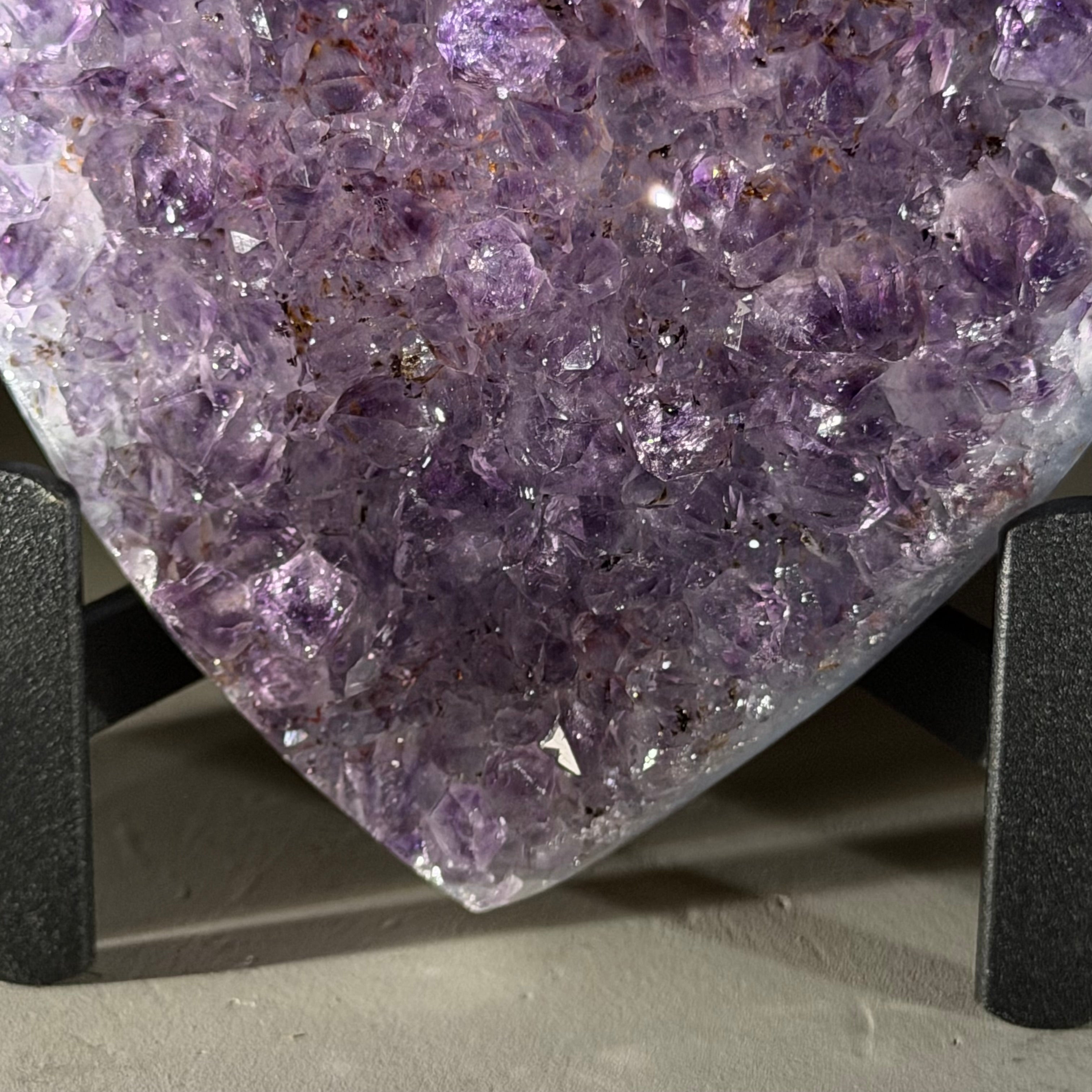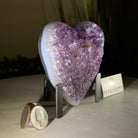 Experience the captivating beauty of this Extra Quality Heart-Shaped Amethyst Geode by Brazil Gems®. Elegantly displayed on a sleek black metal stand, this stunning gemstone showcases polished edges that highlight its vibrant violet hues, while the natural rough stone on the backside adds a touch of raw authenticity. Each crystal point sparkles with the unique, untouched beauty crafted by Mother Nature herself.