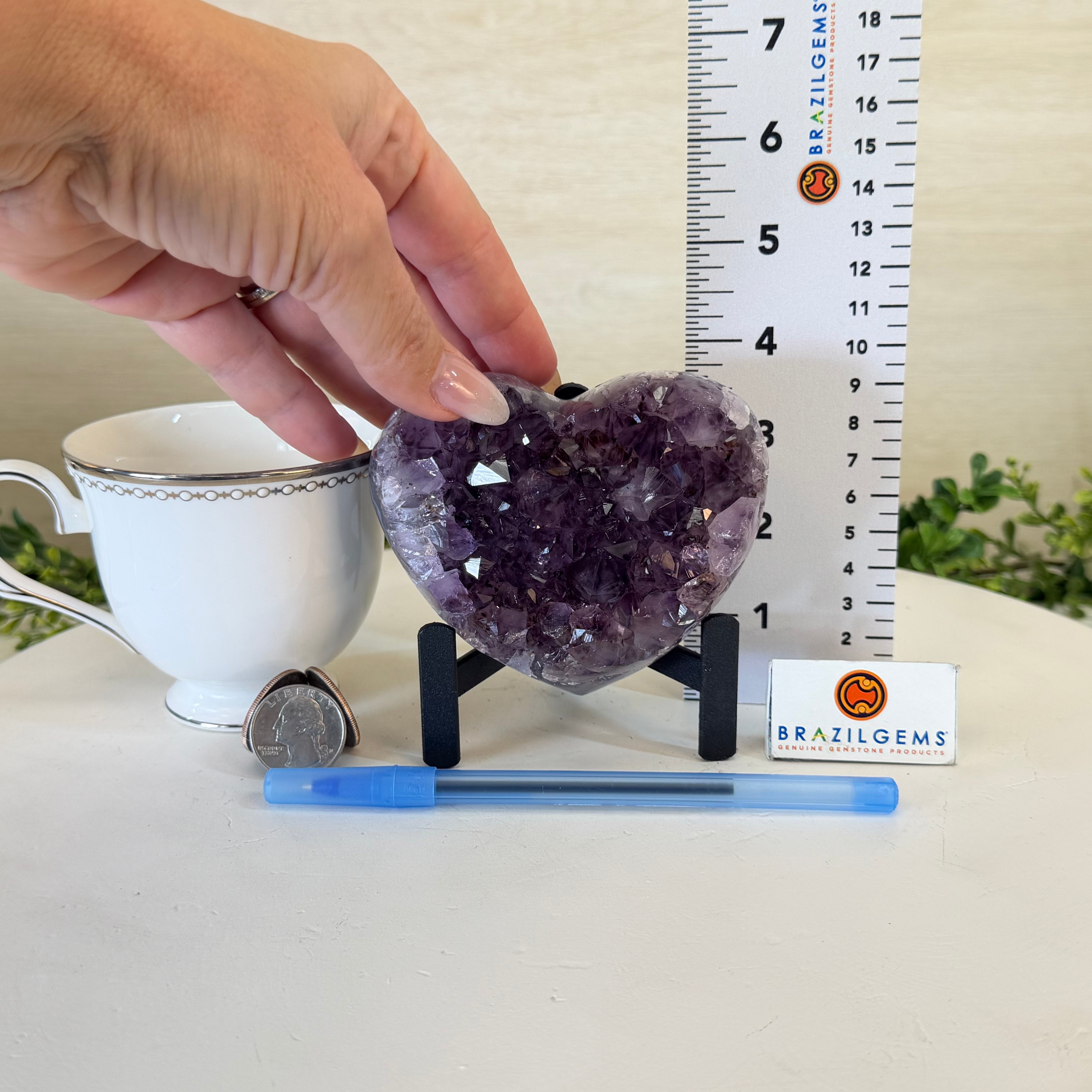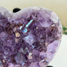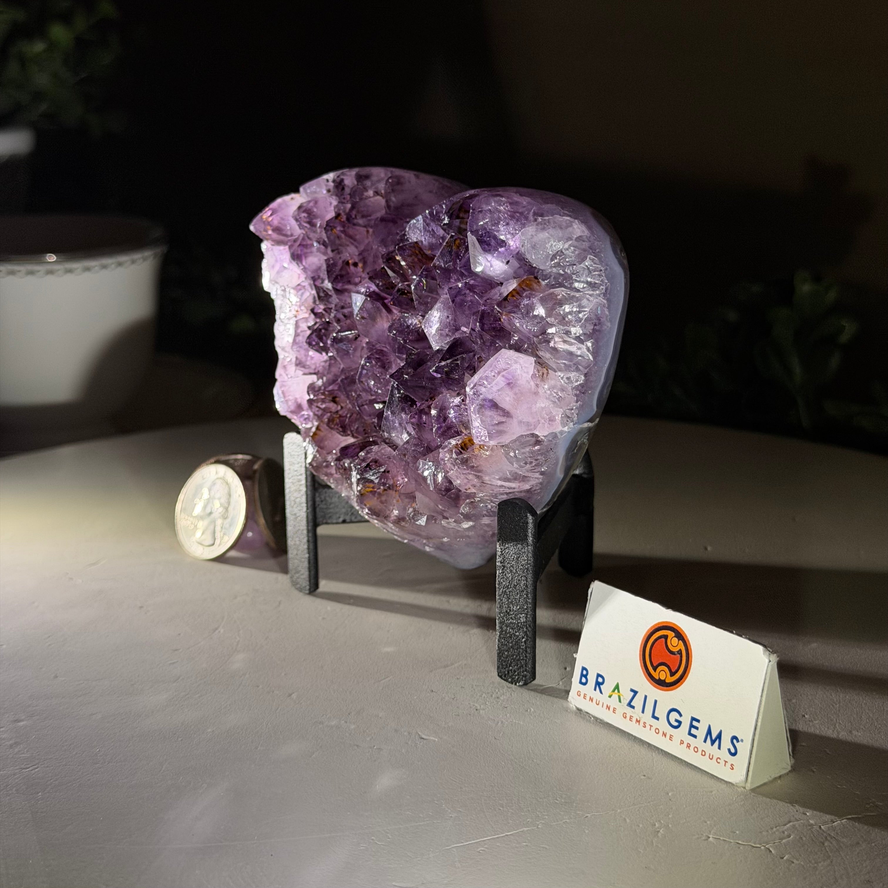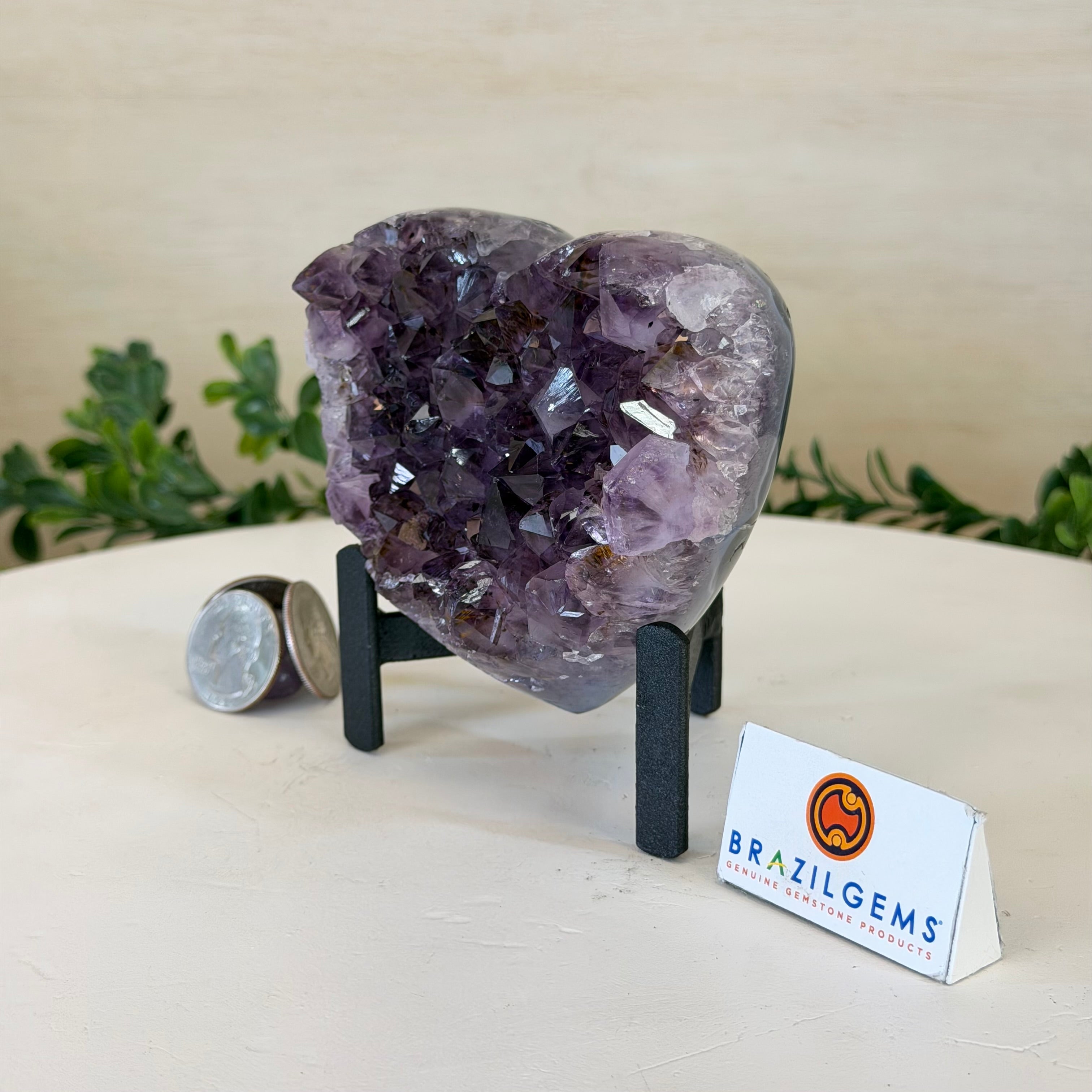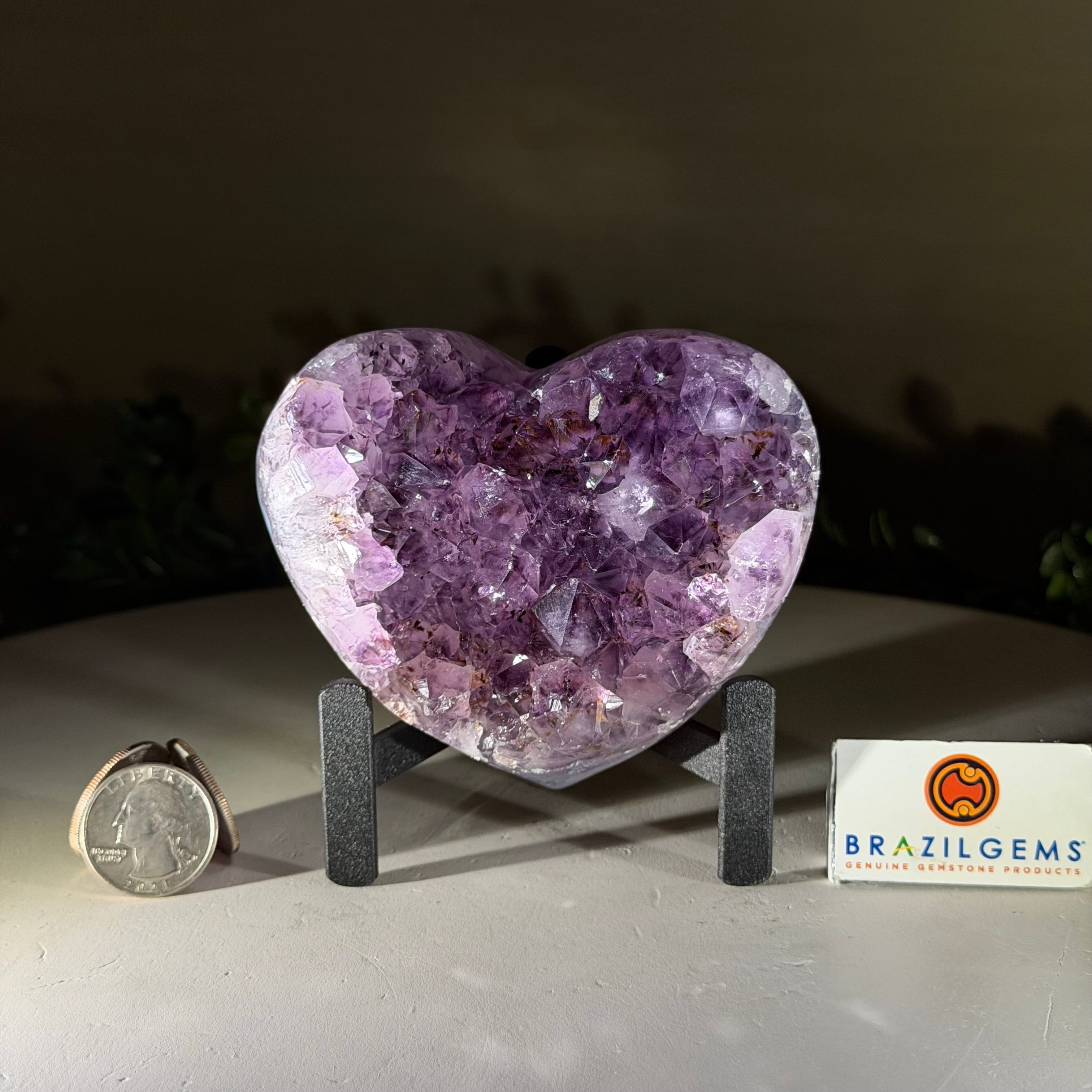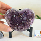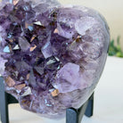 Experience the captivating beauty of this Extra Quality Heart-Shaped Amethyst Geode by Brazil Gems®. Elegantly displayed on a sleek black metal stand, this stunning gemstone showcases polished edges that highlight its vibrant violet hues, while the natural rough stone on the backside adds a touch of raw authenticity. Each crystal point sparkles with the unique, untouched beauty crafted by Mother Nature herself.