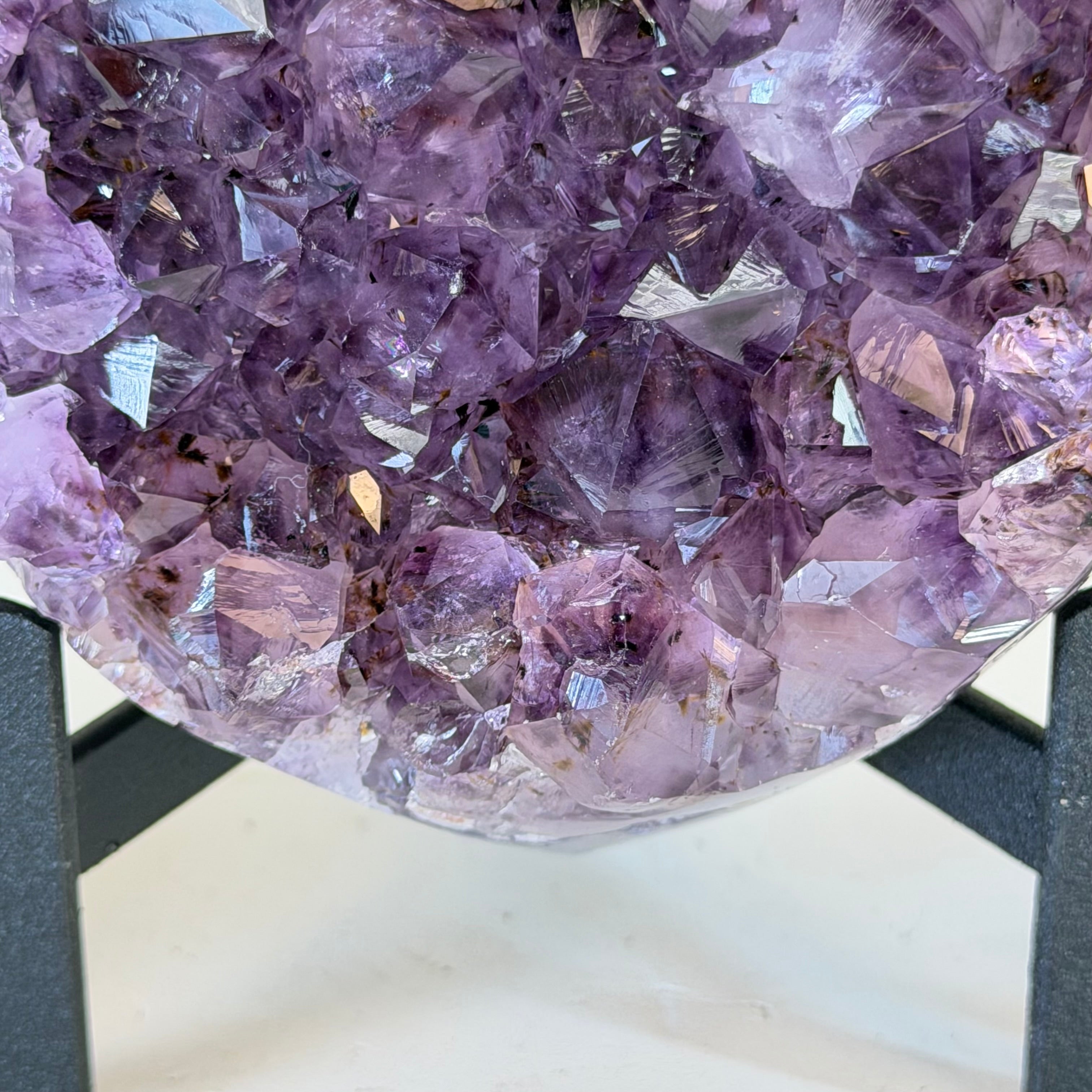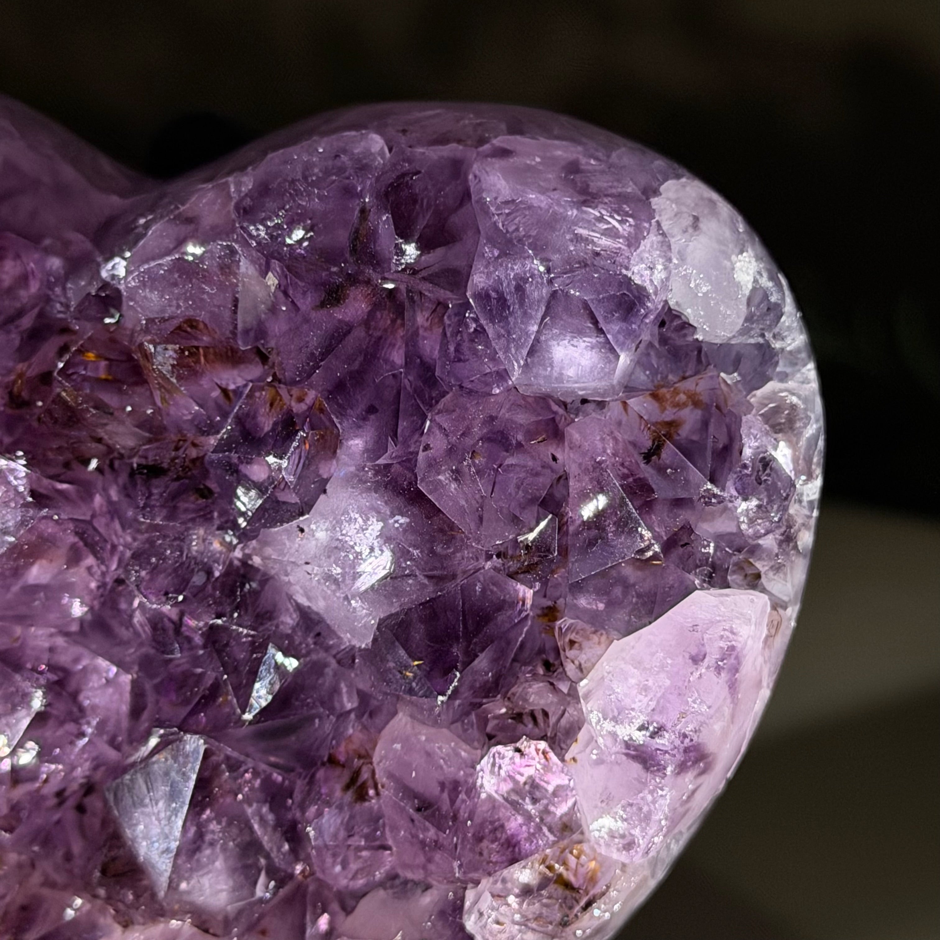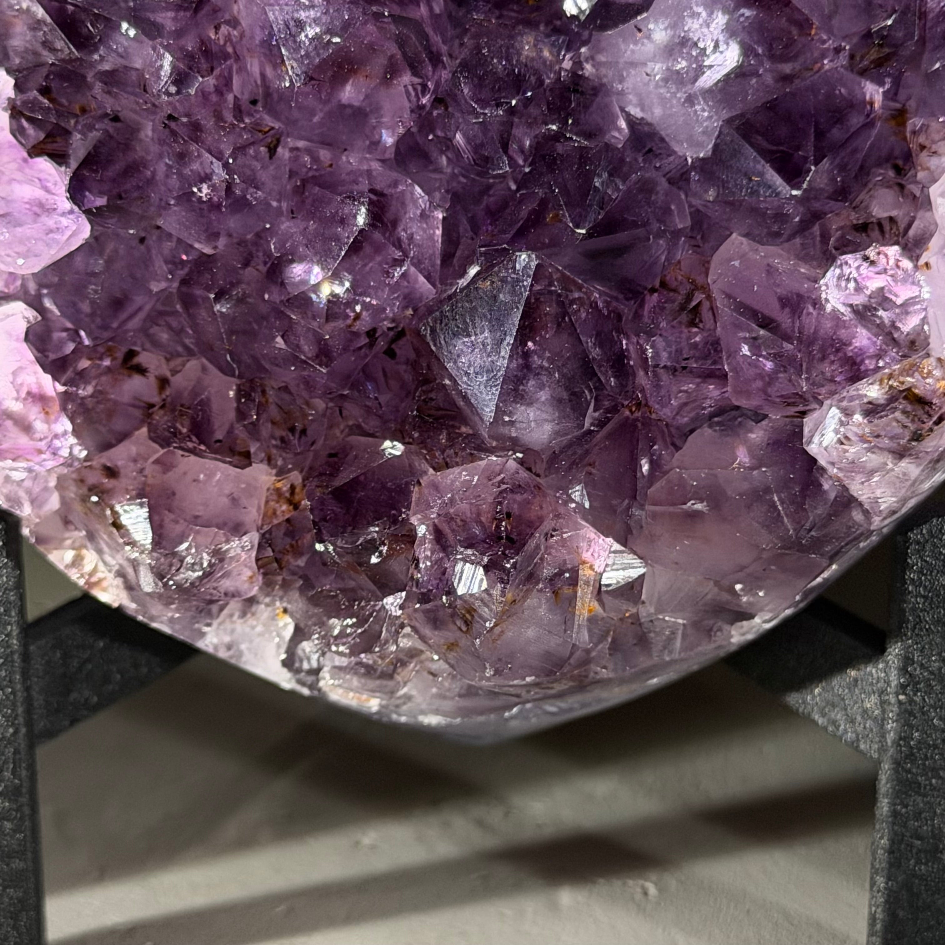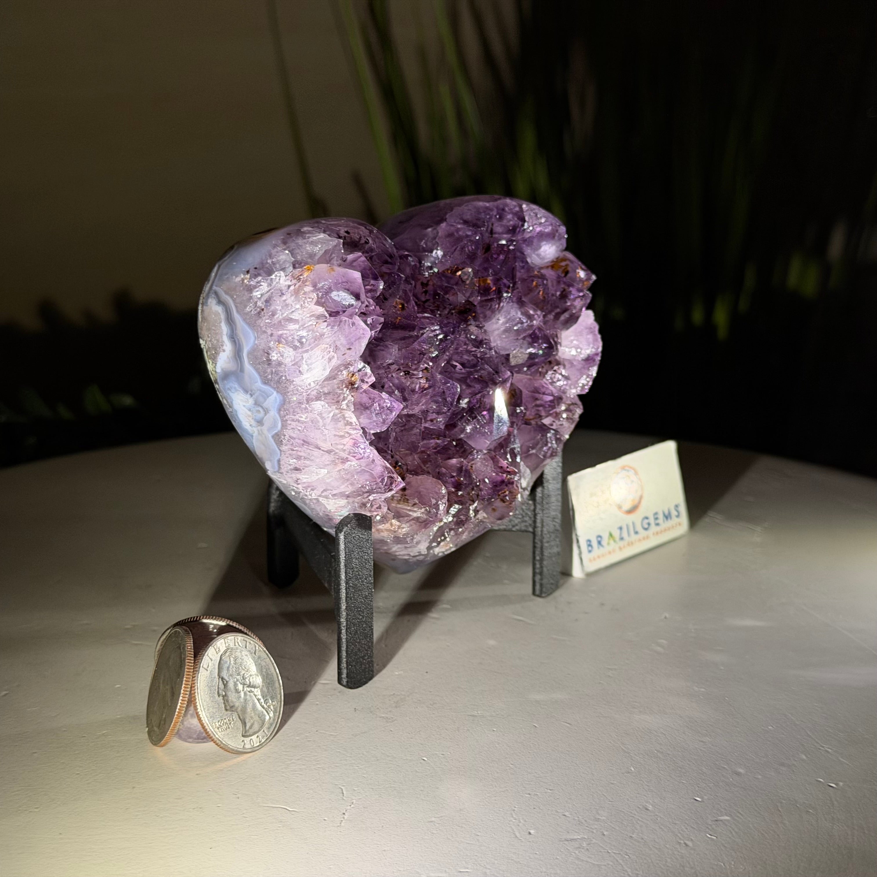 Experience the captivating beauty of this Extra Quality Heart-Shaped Amethyst Geode by Brazil Gems®. Elegantly displayed on a sleek black metal stand, this stunning gemstone showcases polished edges that highlight its vibrant violet hues, while the natural rough stone on the backside adds a touch of raw authenticity. Each crystal point sparkles with the unique, untouched beauty crafted by Mother Nature herself.