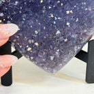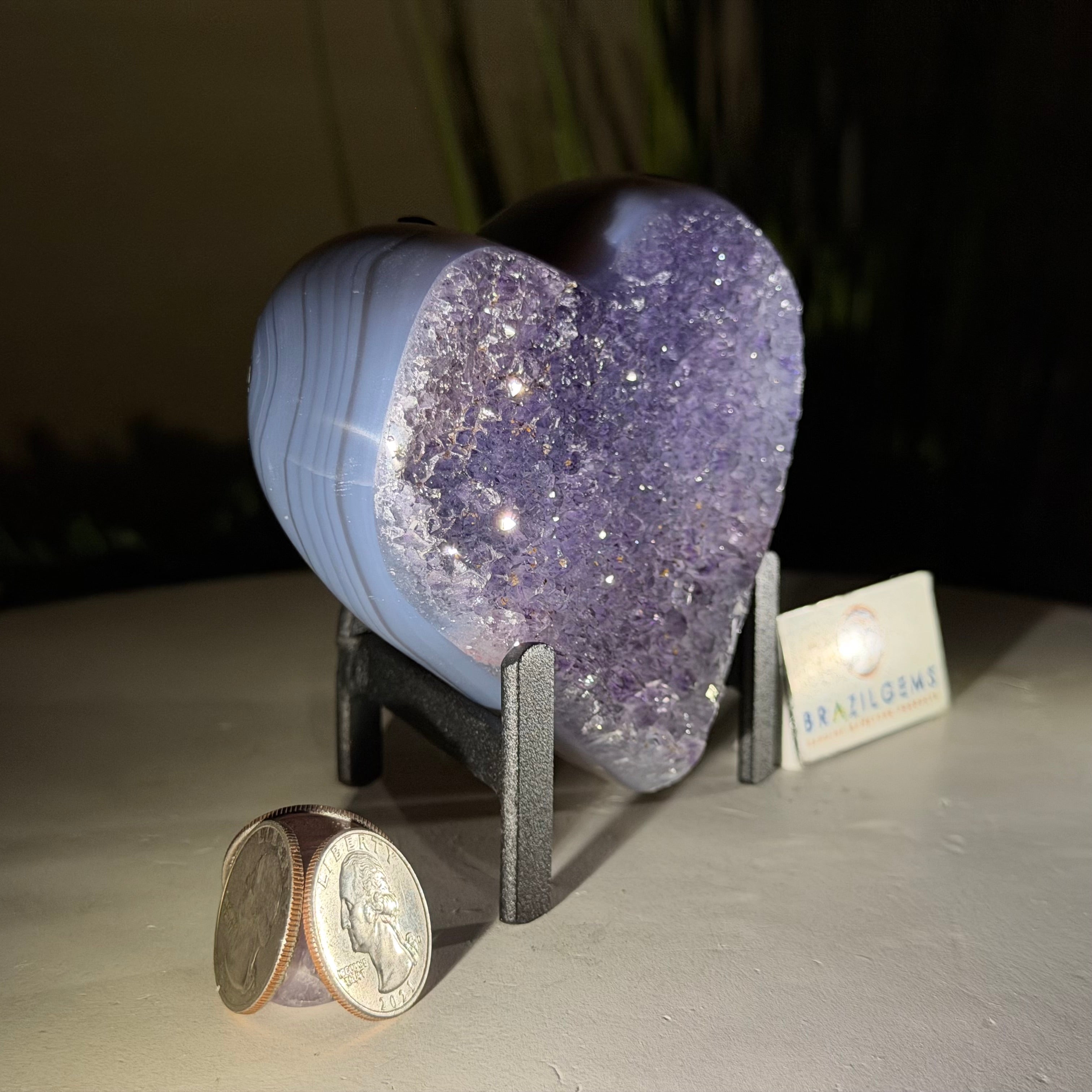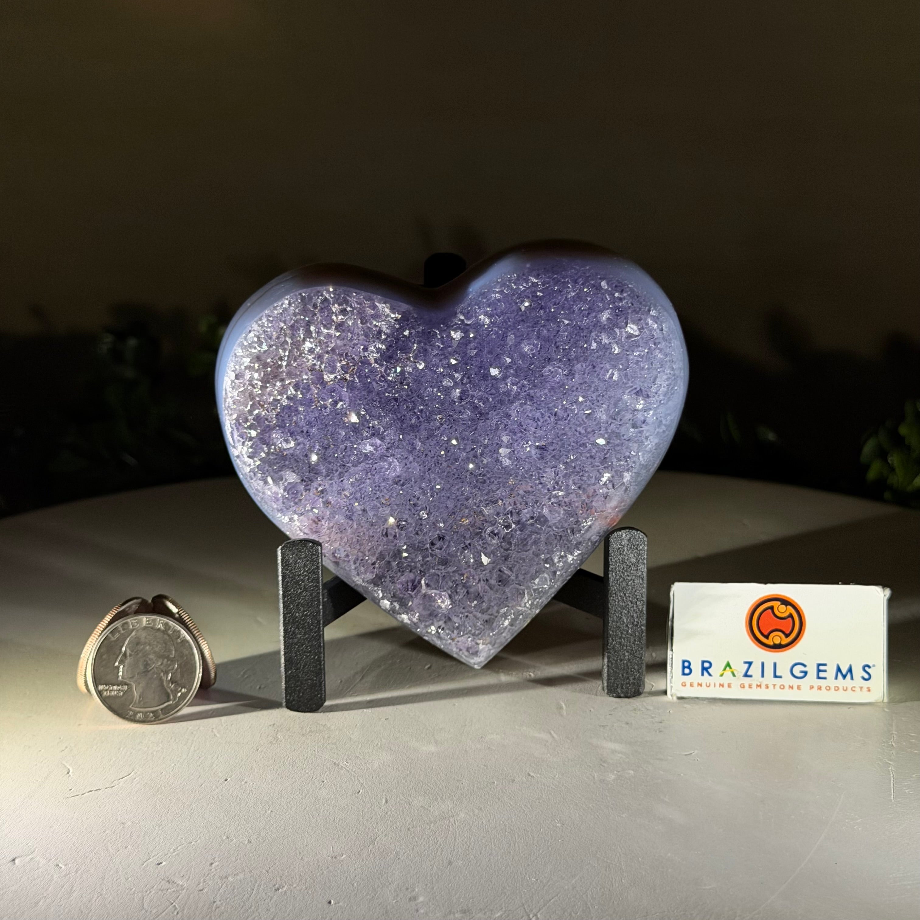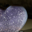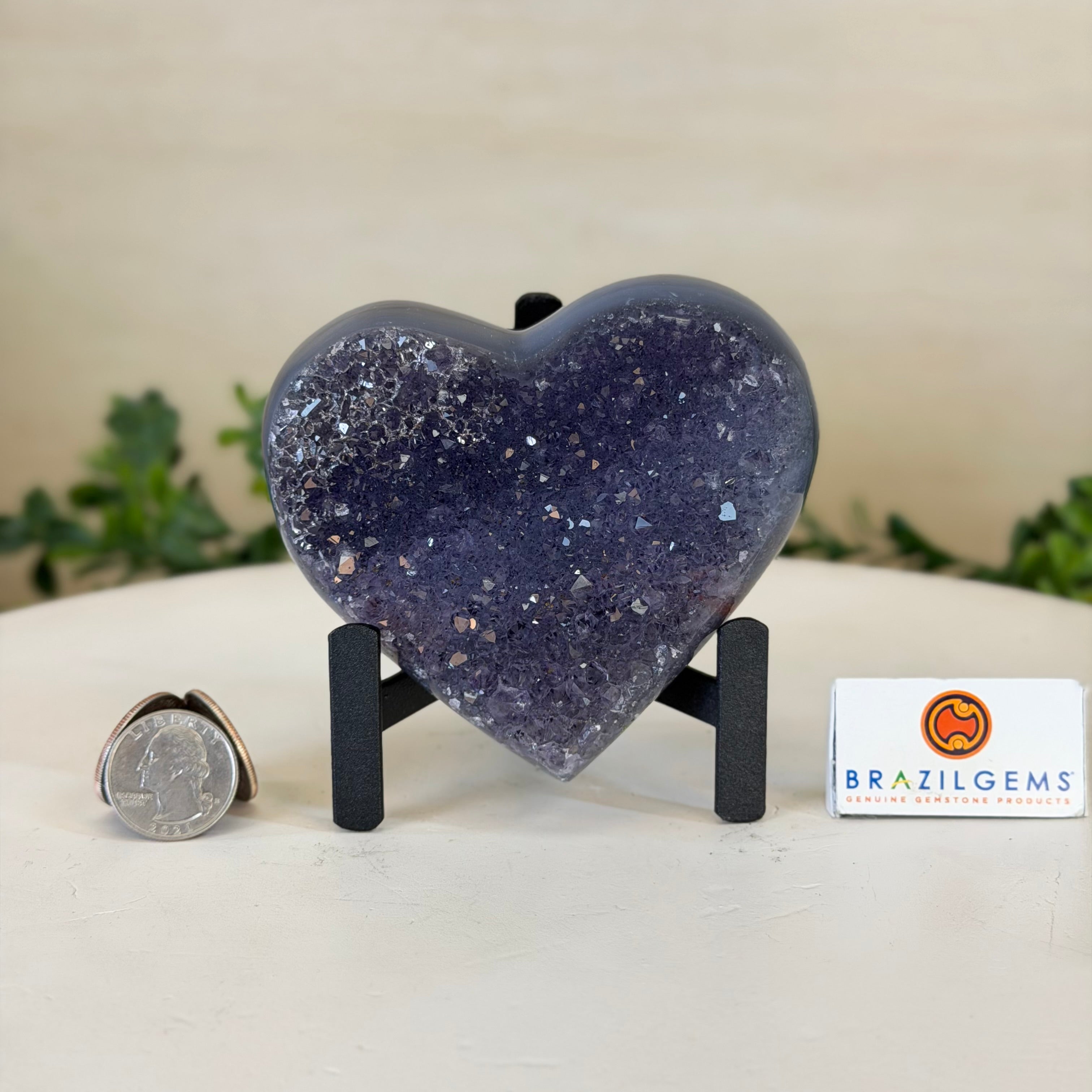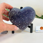 Experience the captivating beauty of this Extra Plus Quality Heart-Shaped Amethyst Geode by Brazil Gems®. Elegantly displayed on a sleek black metal stand, this stunning gemstone showcases polished edges that highlight its vibrant violet hues, while the natural rough stone on the backside adds a touch of raw authenticity. Each crystal point sparkles with the unique, untouched beauty crafted by Mother Nature herself.