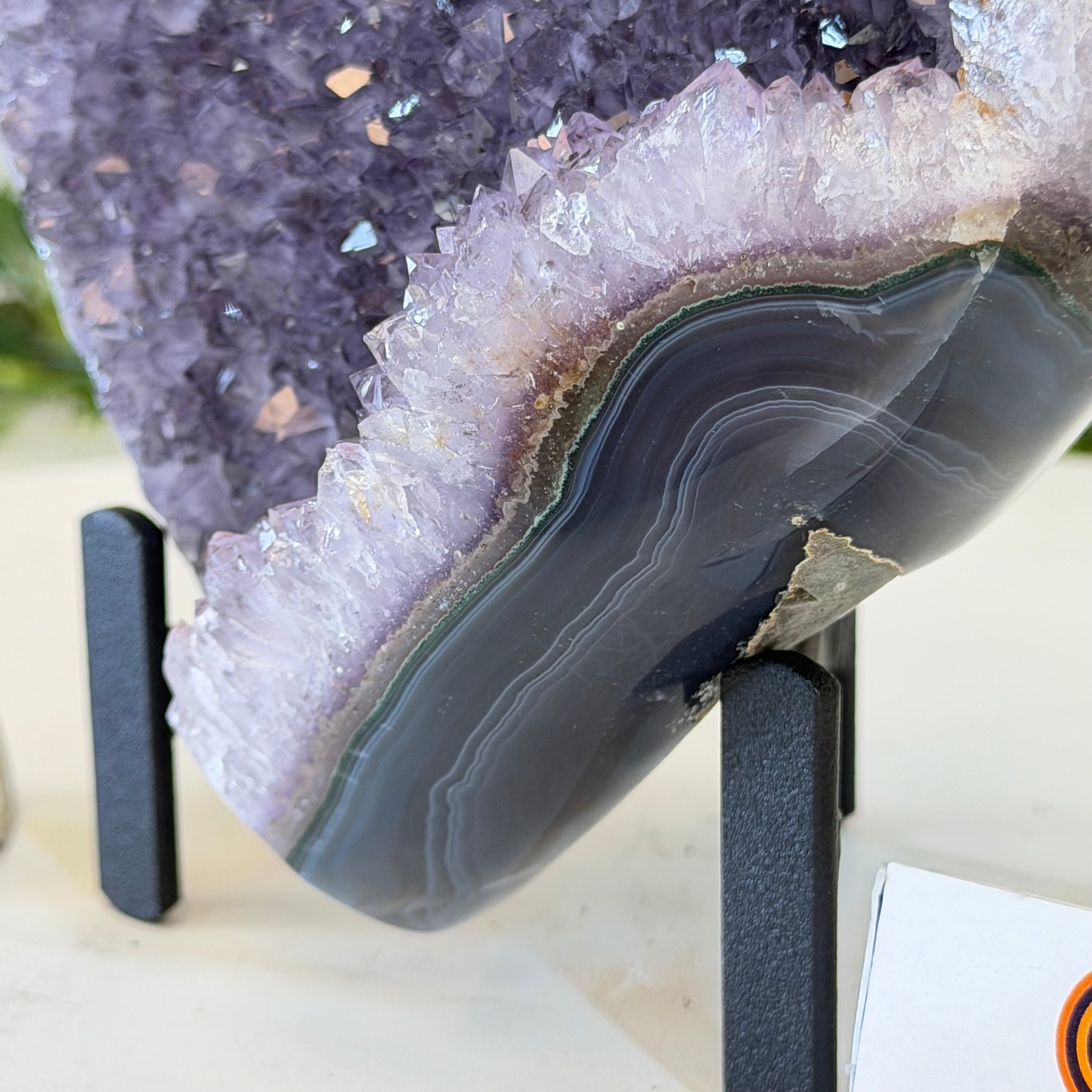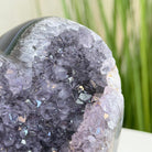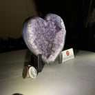 Experience the captivating beauty of this Extra Quality Heart-Shaped Amethyst Geode by Brazil Gems®. Elegantly displayed on a sleek black metal stand, this stunning gemstone showcases polished edges that highlight its vibrant violet hues, while the natural rough stone on the backside adds a touch of raw authenticity. Each crystal point sparkles with the unique, untouched beauty crafted by Mother Nature herself.