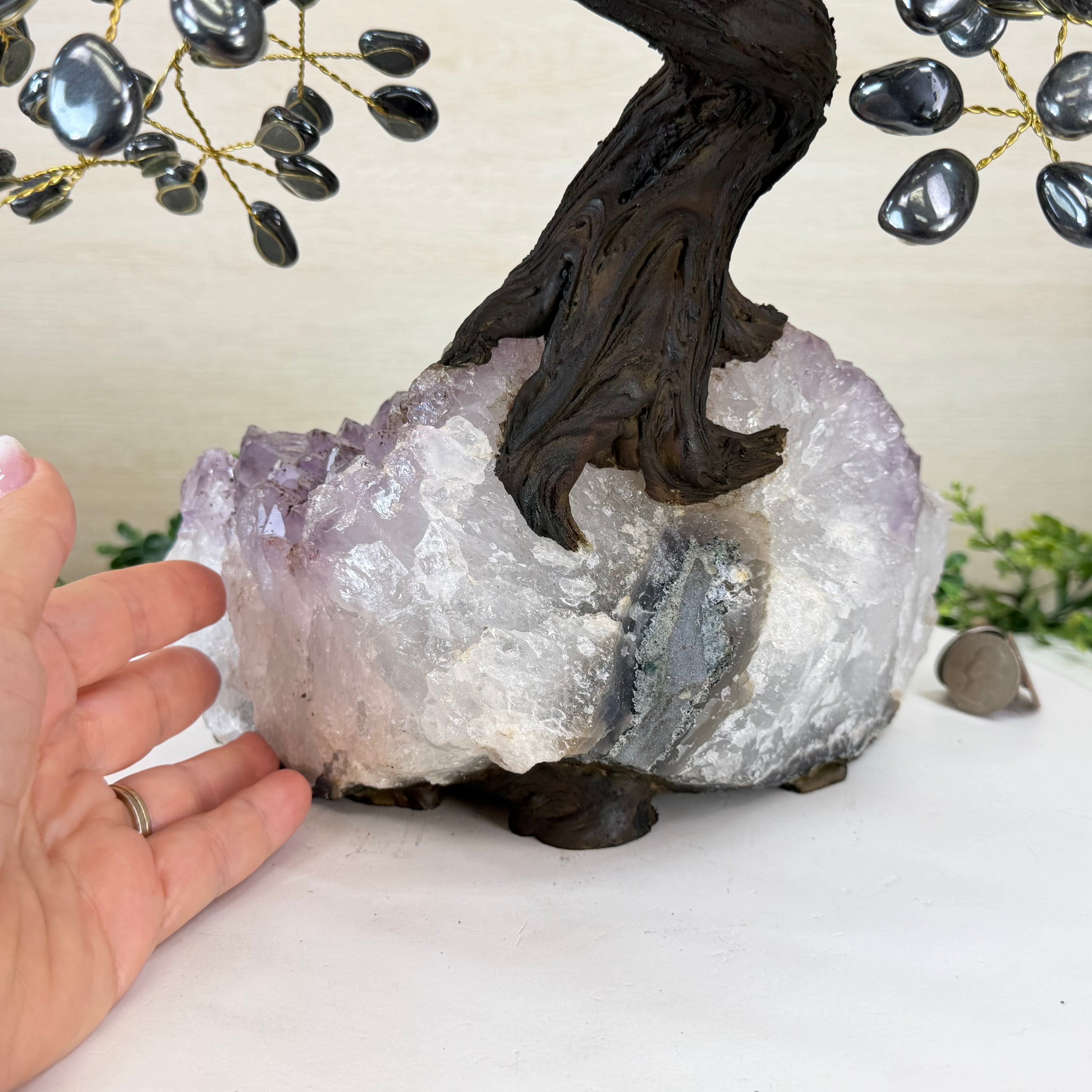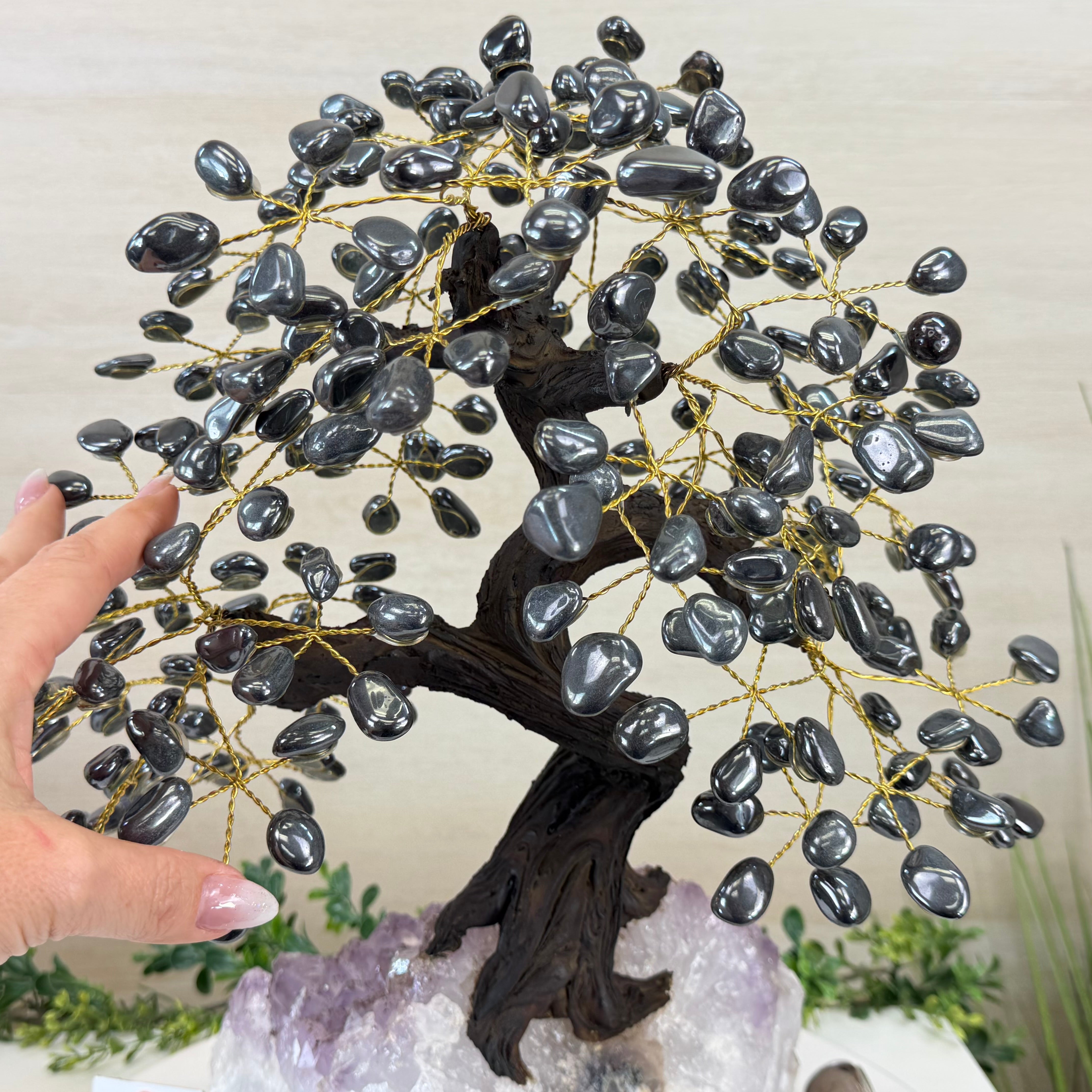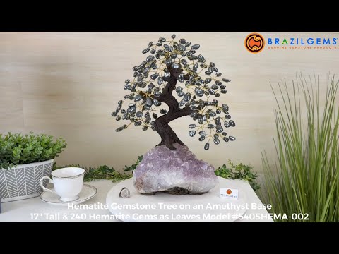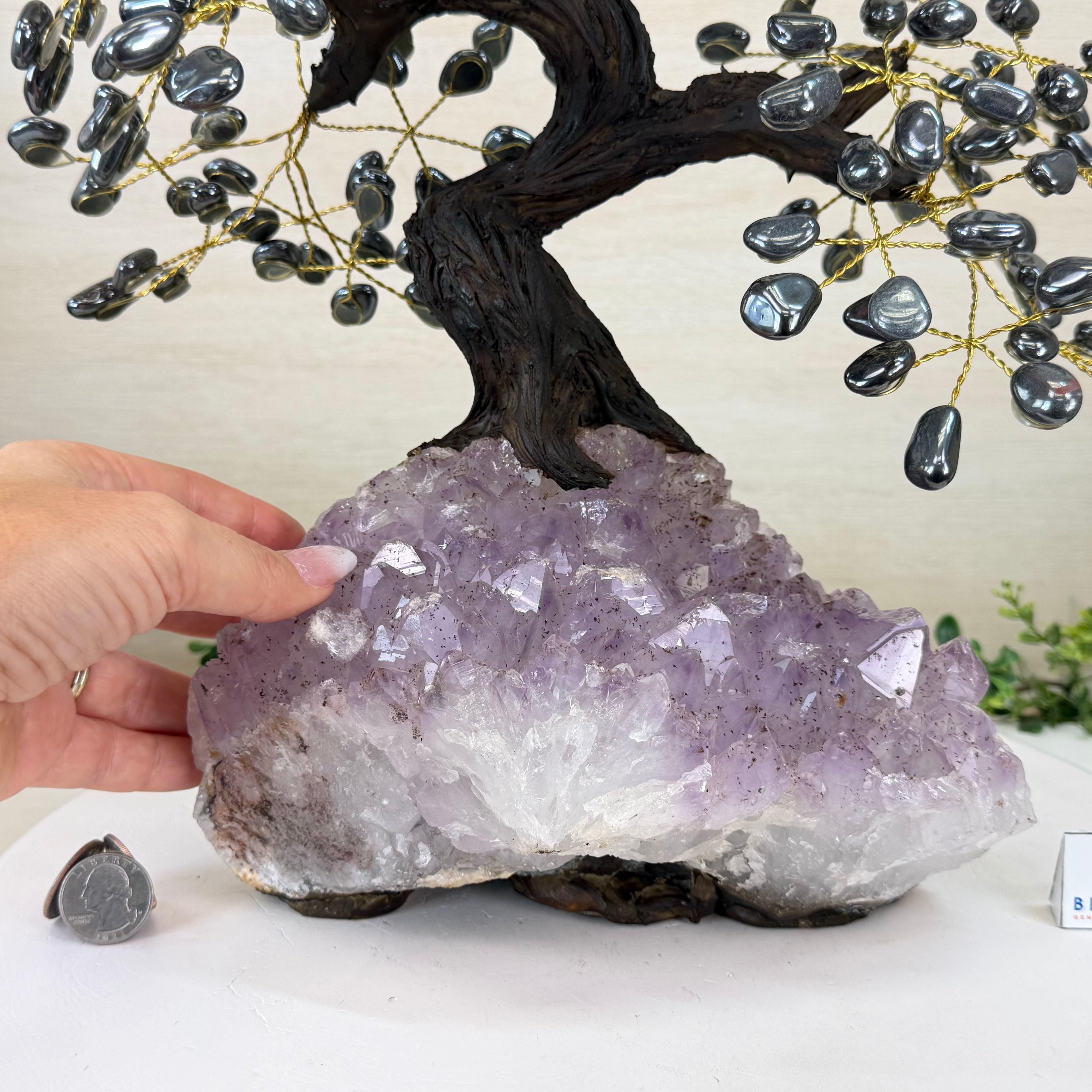 Hematite Bonsai Gemstone Tree on an Amethyst Cluster Base Handcrafted in Brazil, this striking gemstone tree stands approximately 17" tall and features a sturdy bonsai style trunk and branches adorned with 240 tumbled Hematite gemstones as leaves.