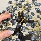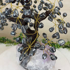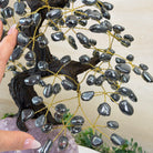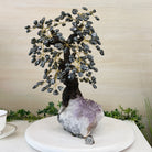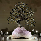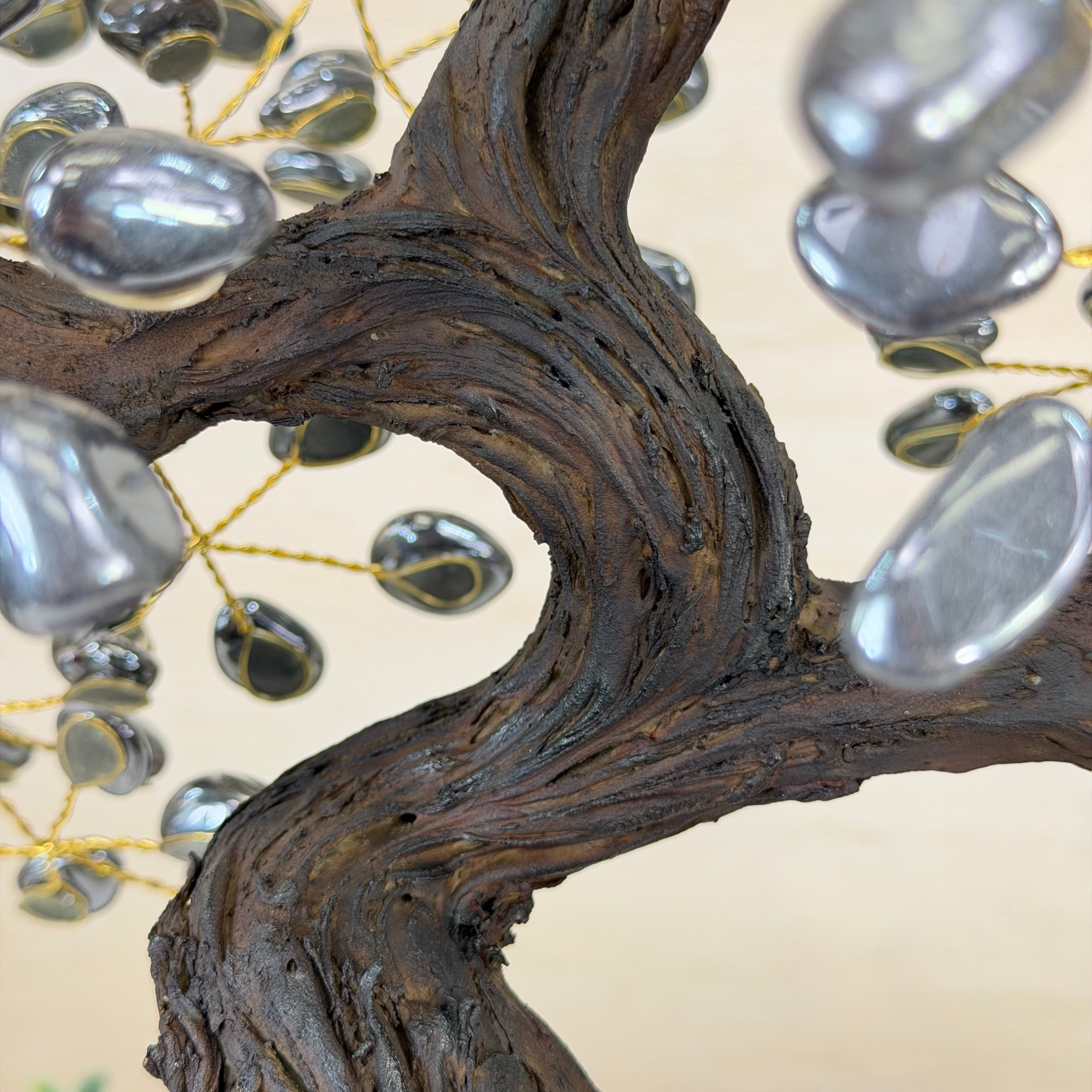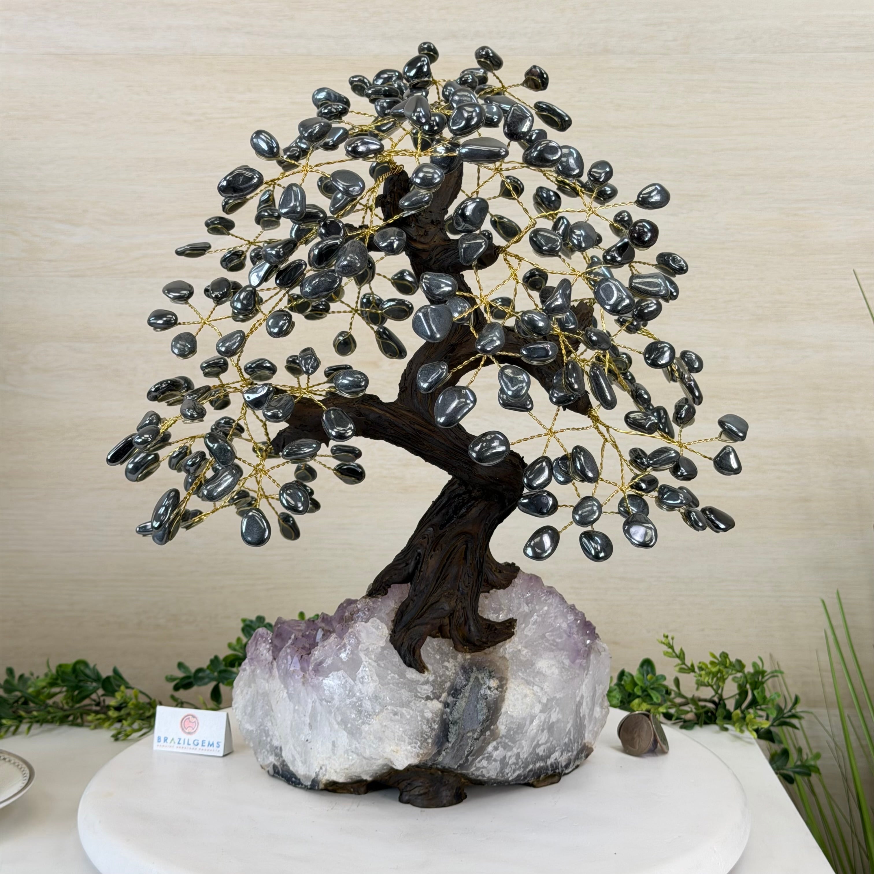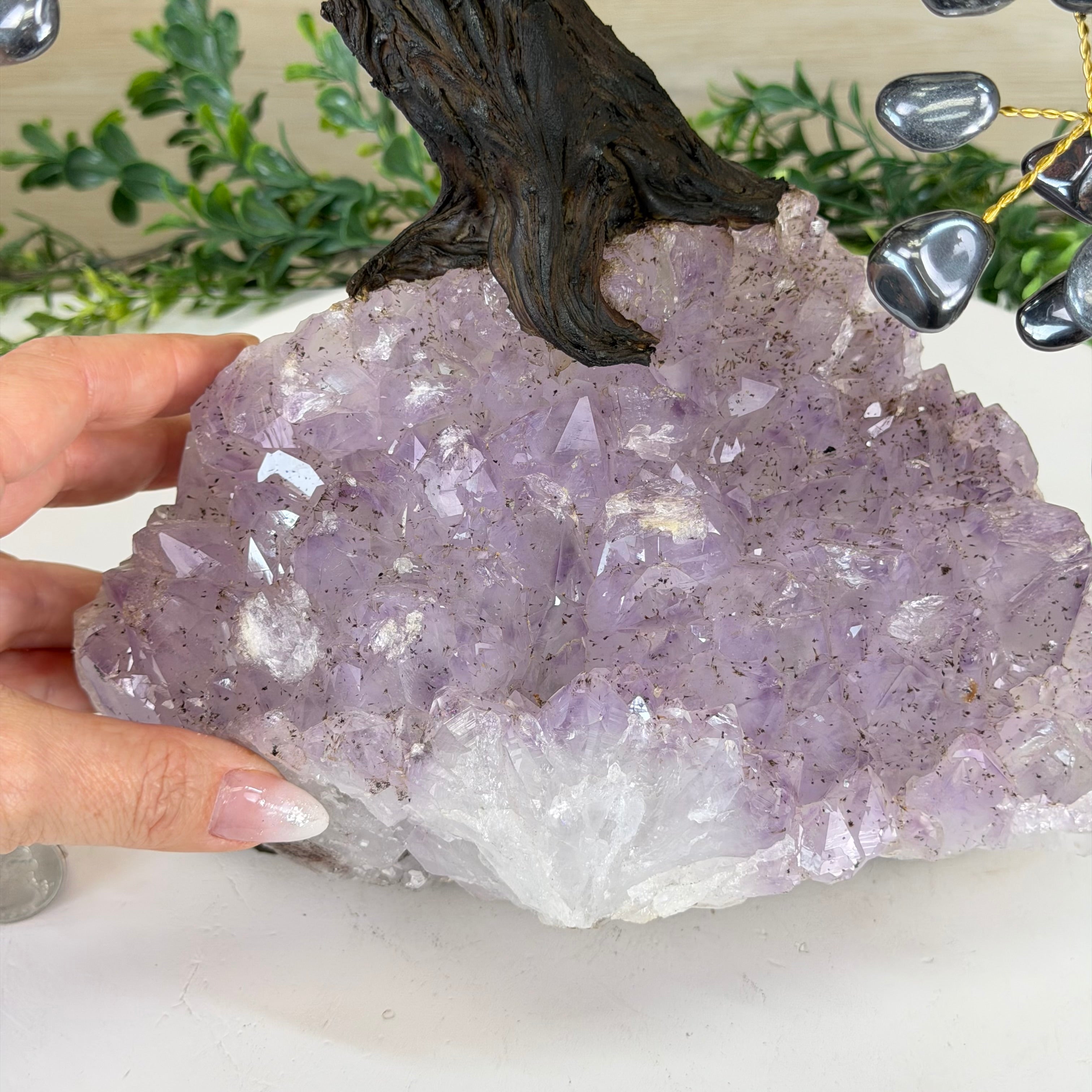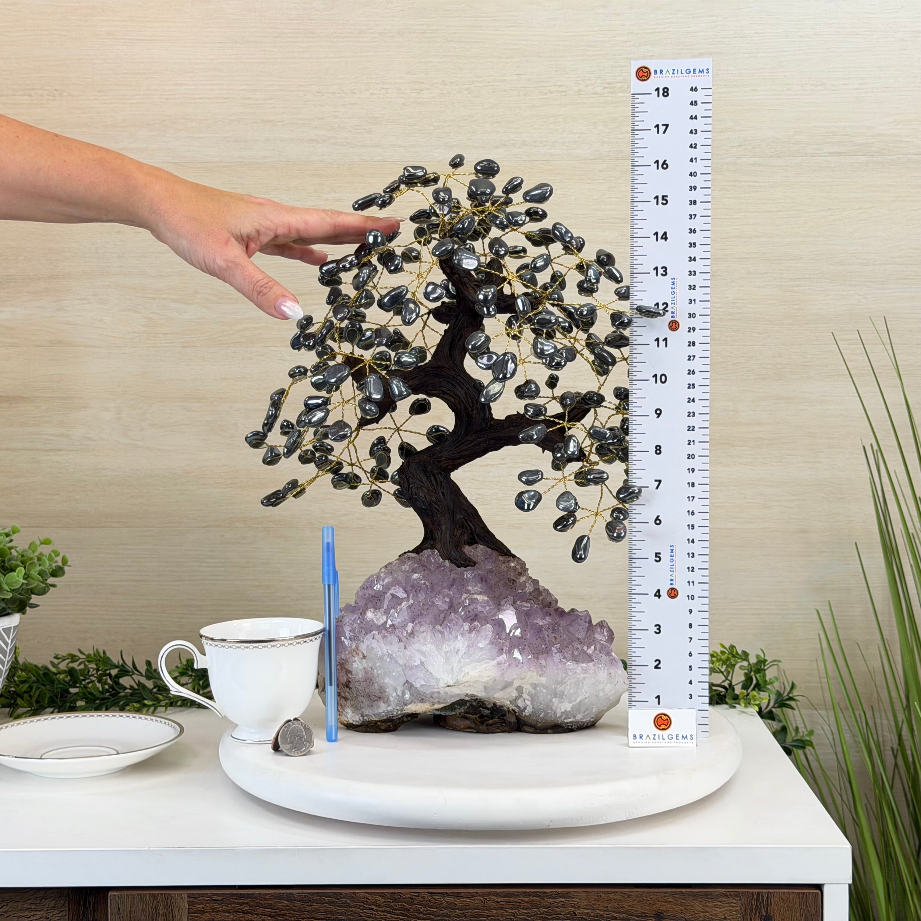 Hematite Bonsai Gemstone Tree on an Amethyst Cluster Base Handcrafted in Brazil, this striking gemstone tree stands approximately 17" tall and features a sturdy bonsai style trunk and branches adorned with 240 tumbled Hematite gemstones as leaves.