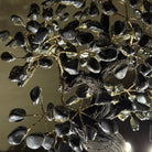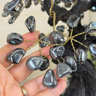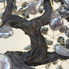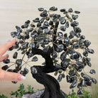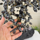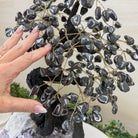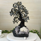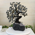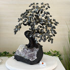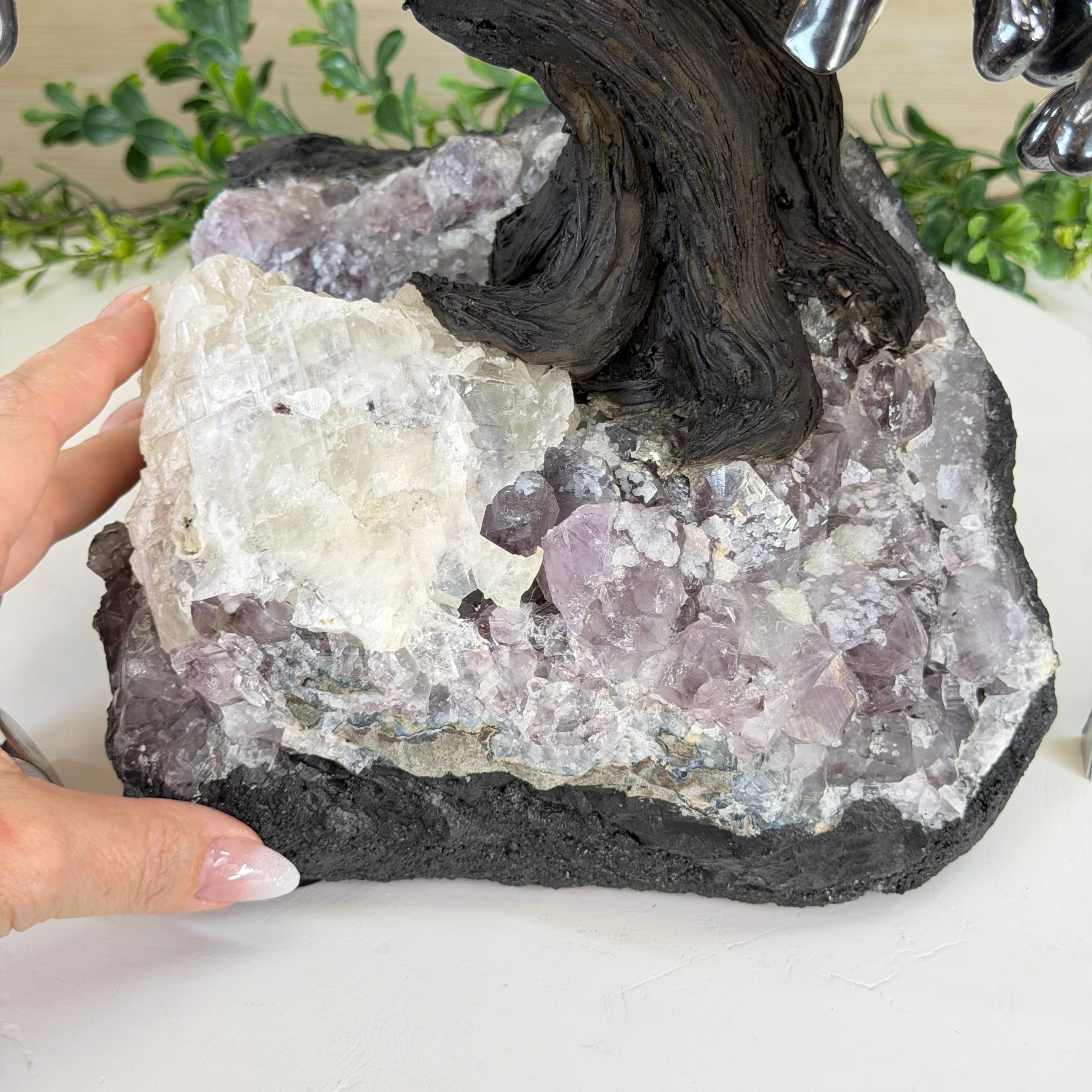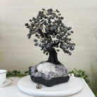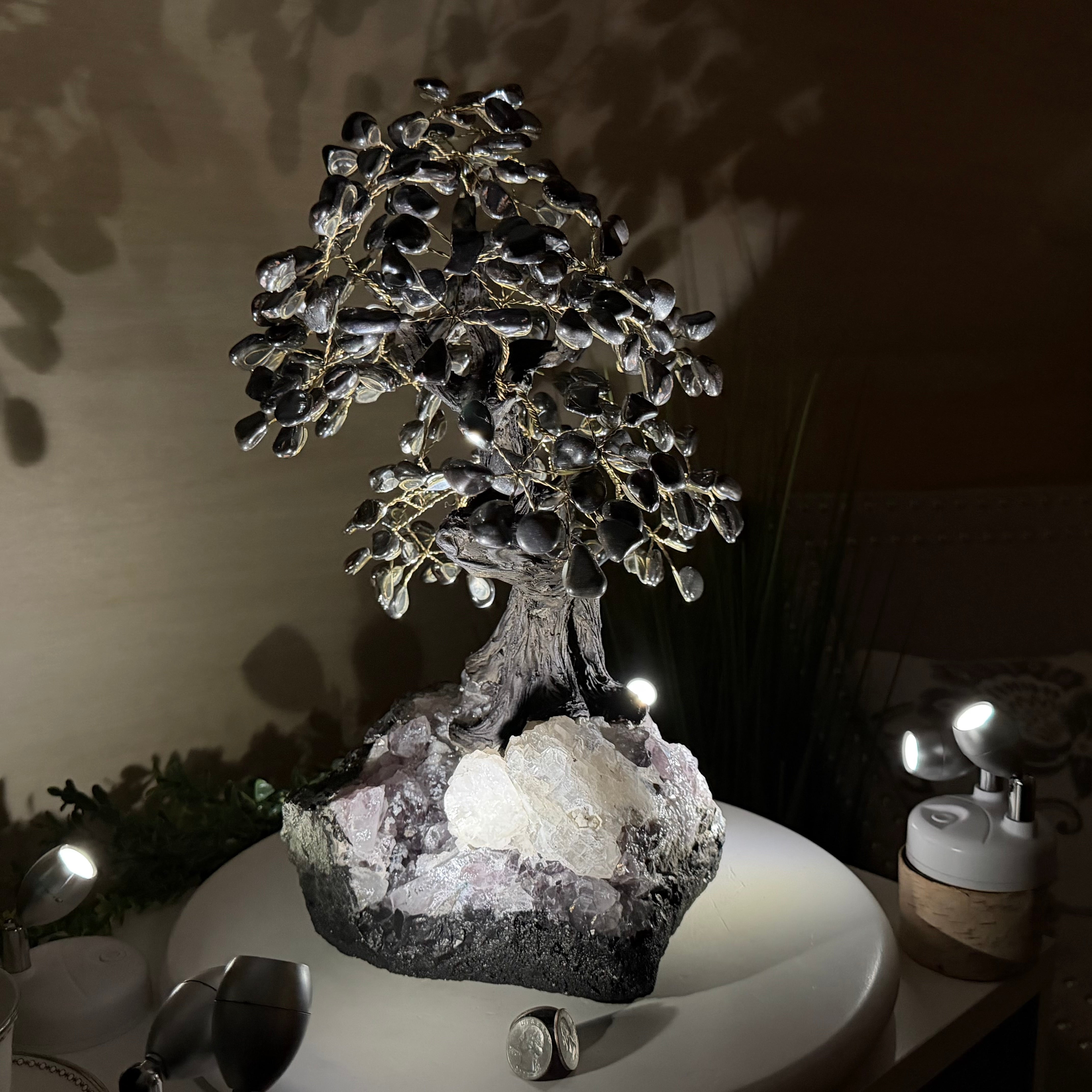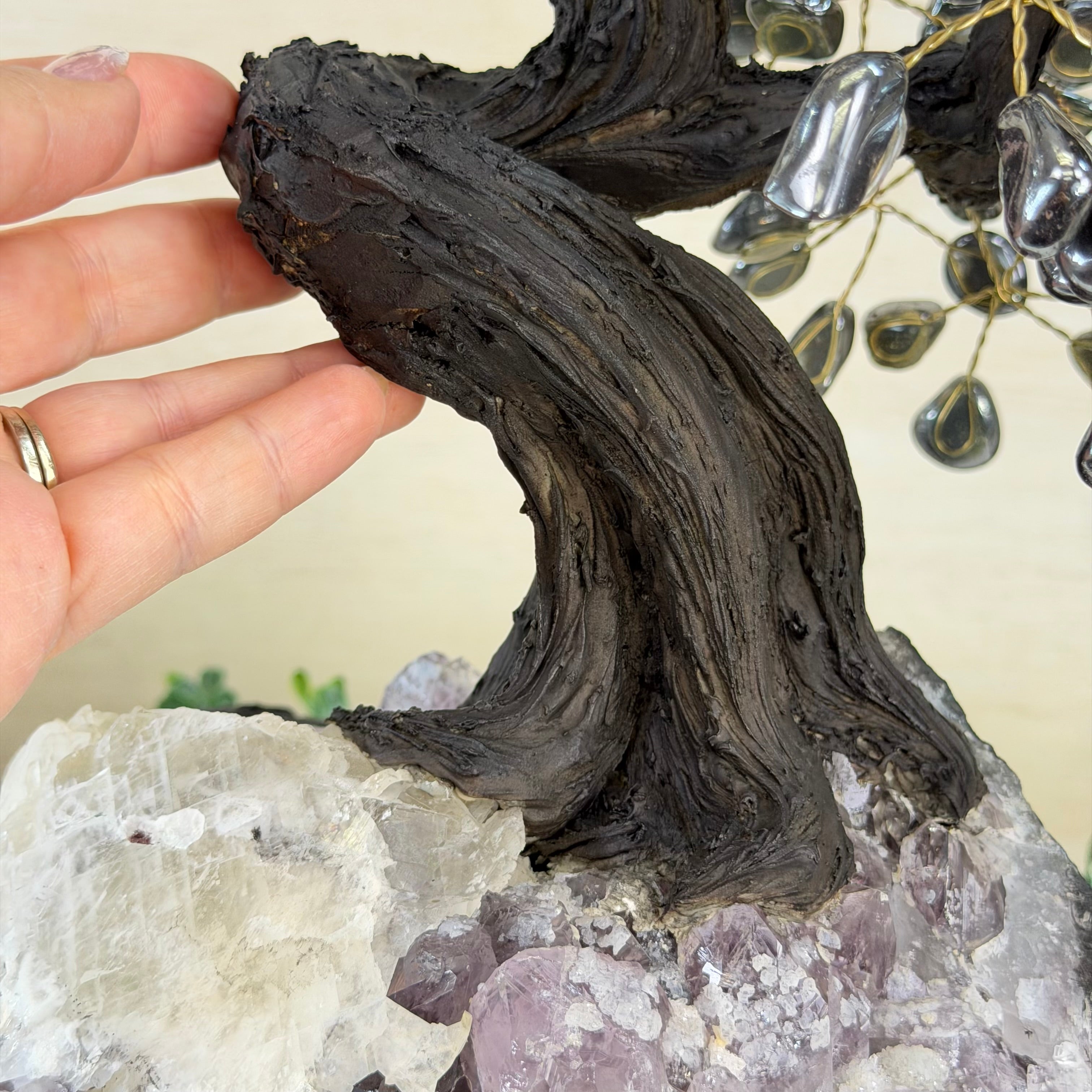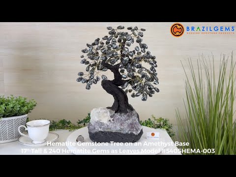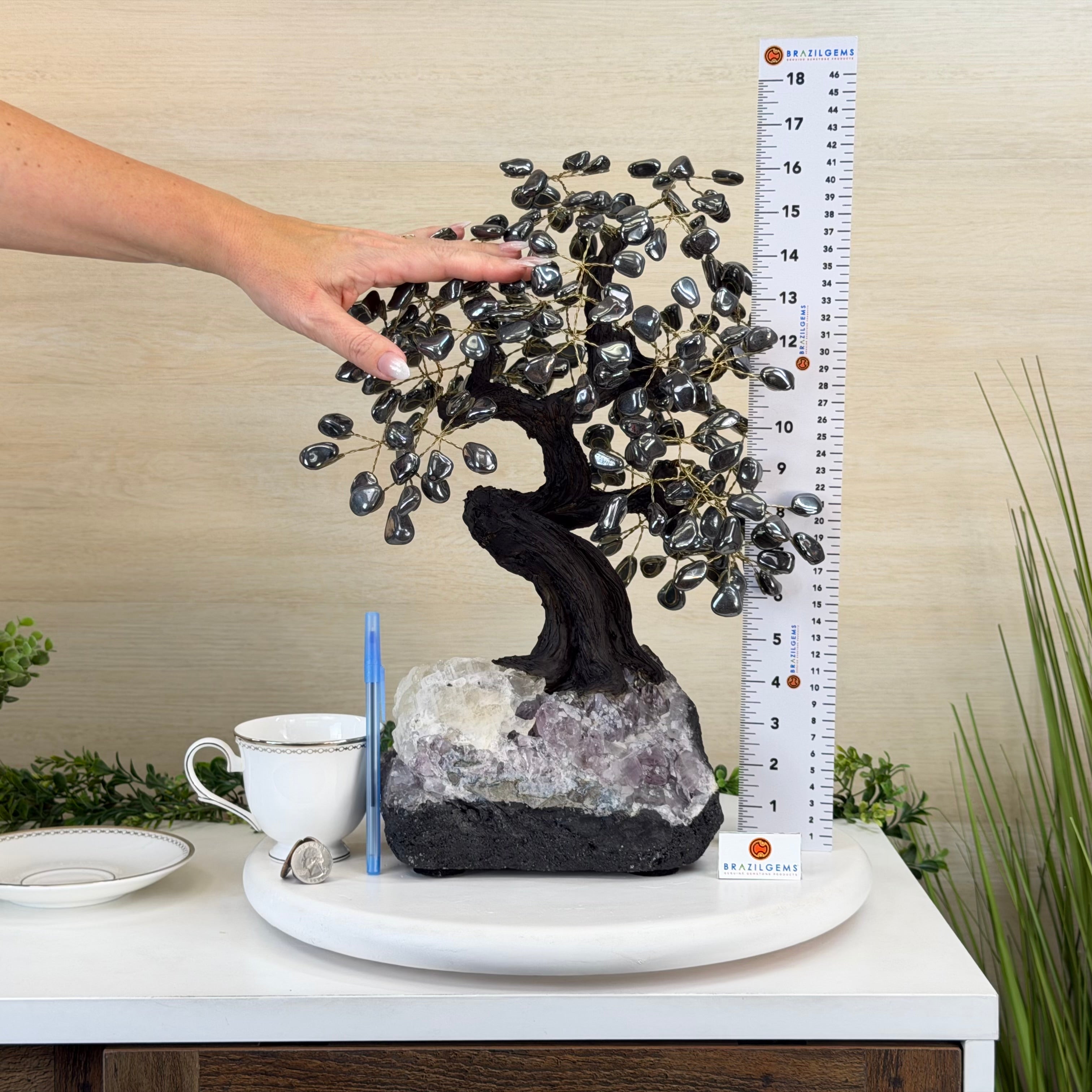 Hematite Bonsai Gemstone Tree on an Amethyst Cluster Base Handcrafted in Brazil, this striking gemstone tree stands approximately 17" tall and features a sturdy bonsai style trunk and branches adorned with 240 tumbled Hematite gemstones as leaves.