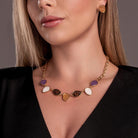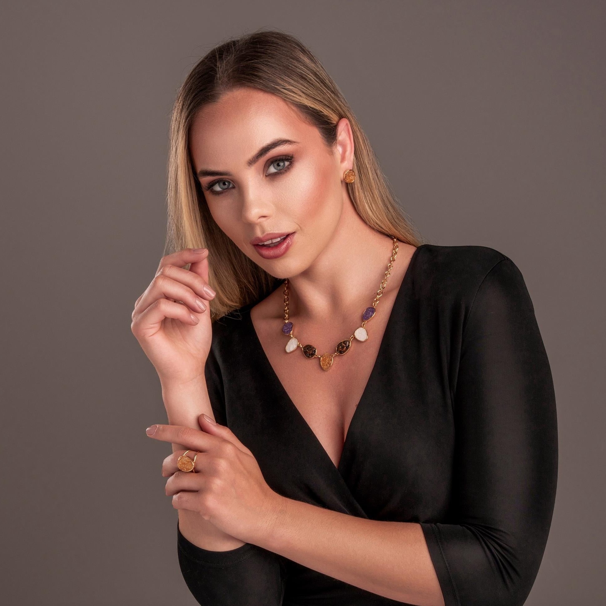 Embody grace and sophistication with this gorgeous 18k Gold Plated Necklace & Earring Set with small fragments of natural gemstones in oval-shaped gold plated casings. A clear resin layer over the gemstone fragments elegantly displays the artisan process to make each piece a wearable piece of art. This riviera collar style necklace includes 7 stones in a 18k Gold Plated cable chain completing the look of this charming set. Earrings stone vary by set.