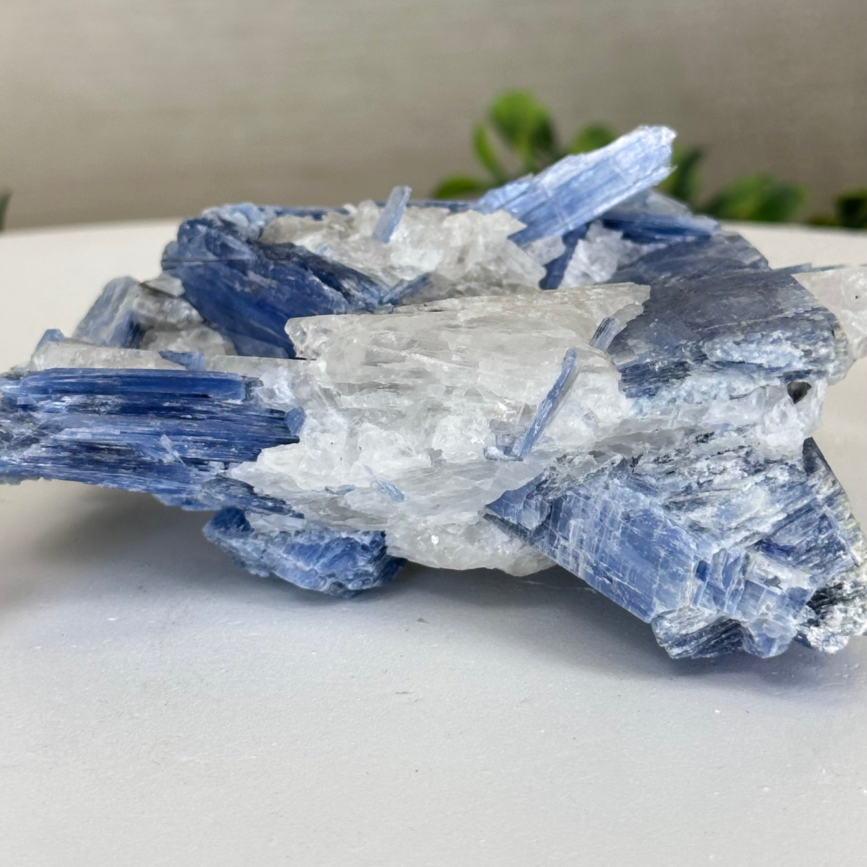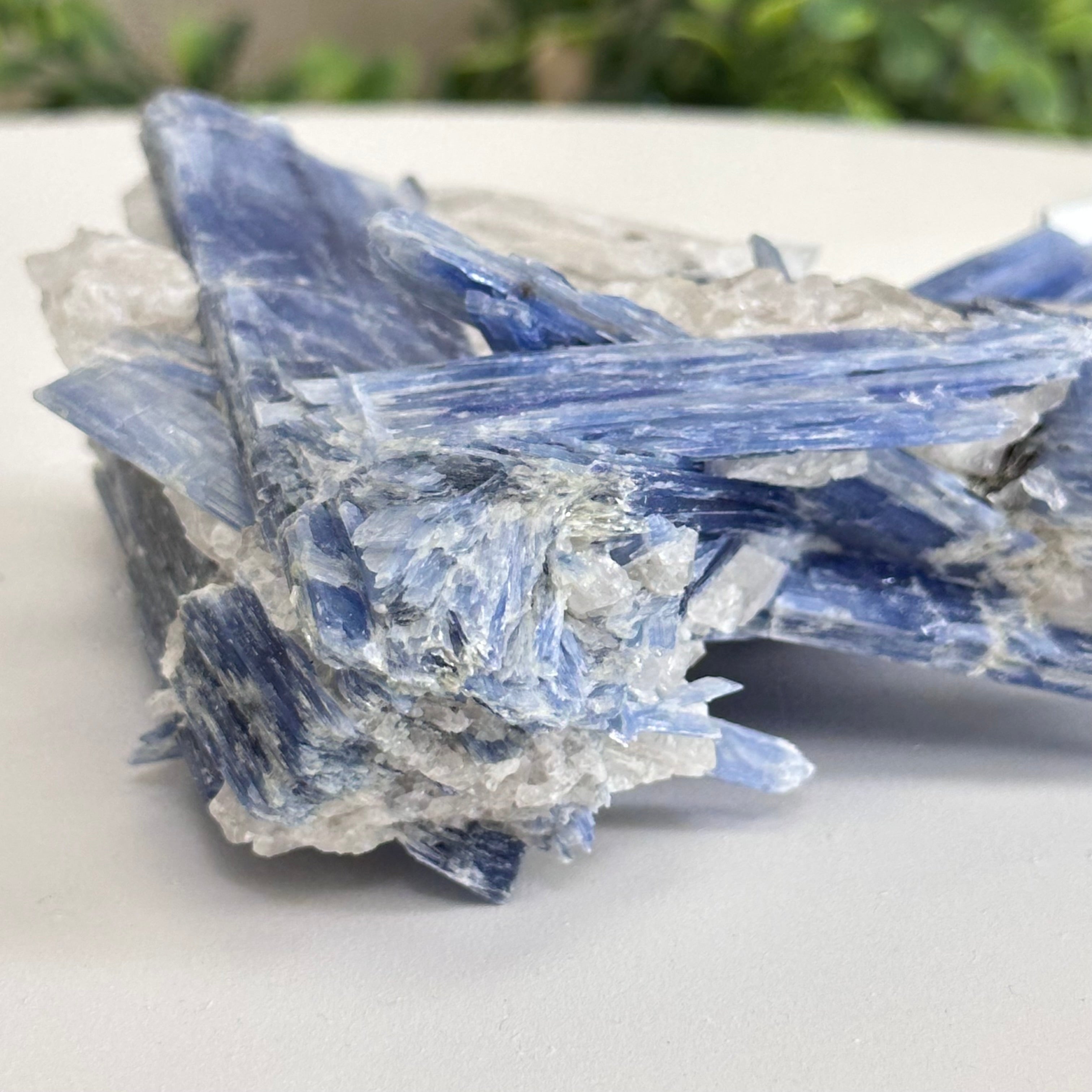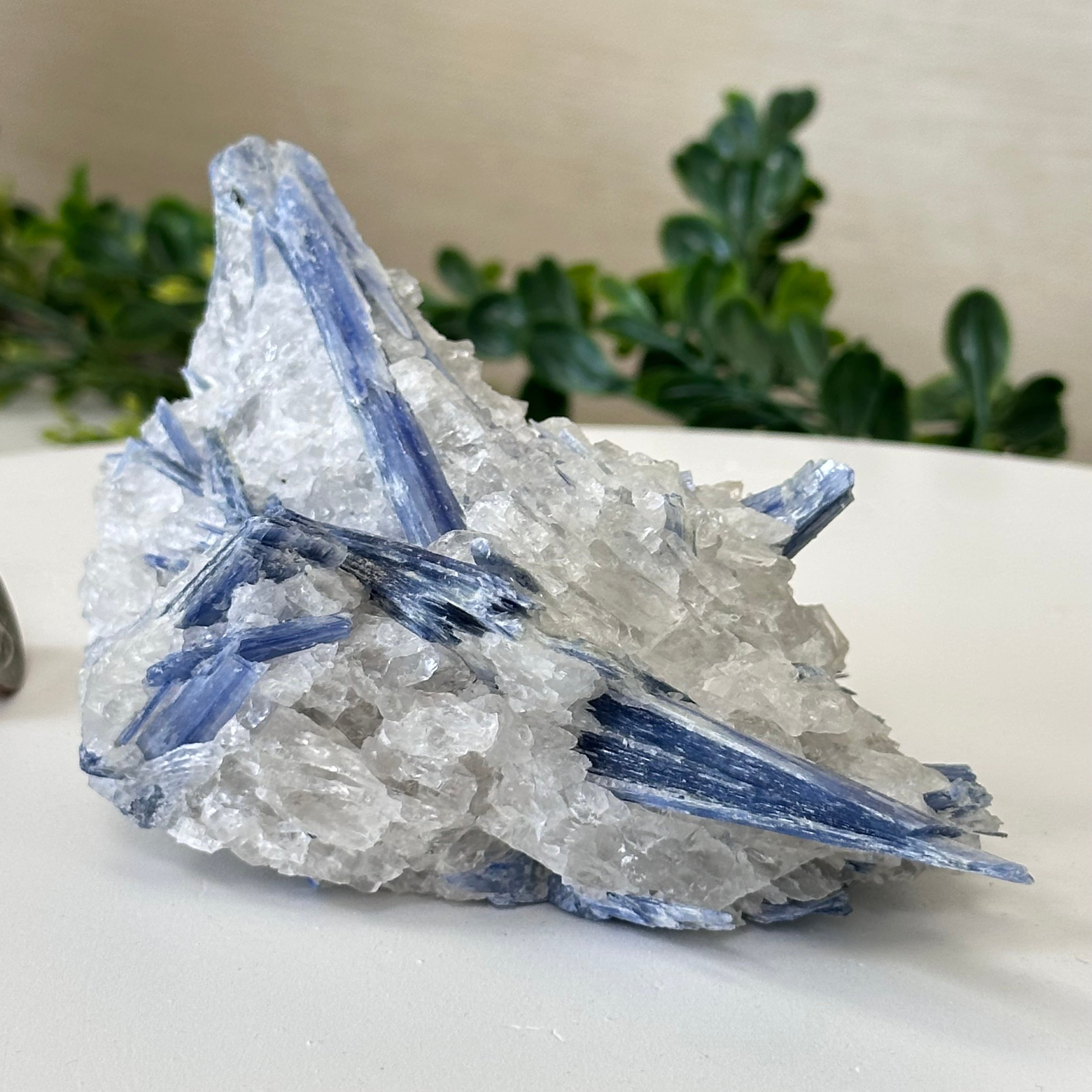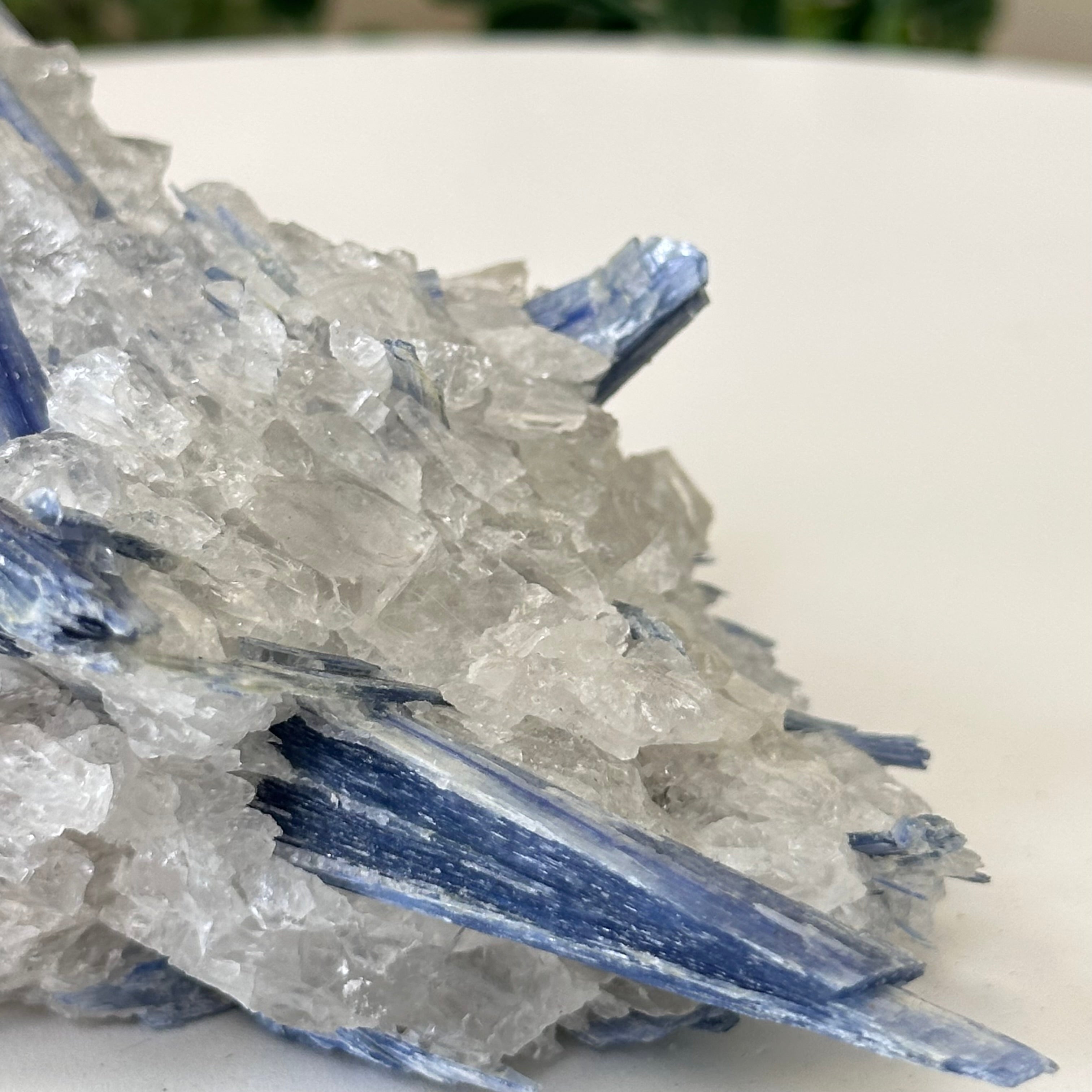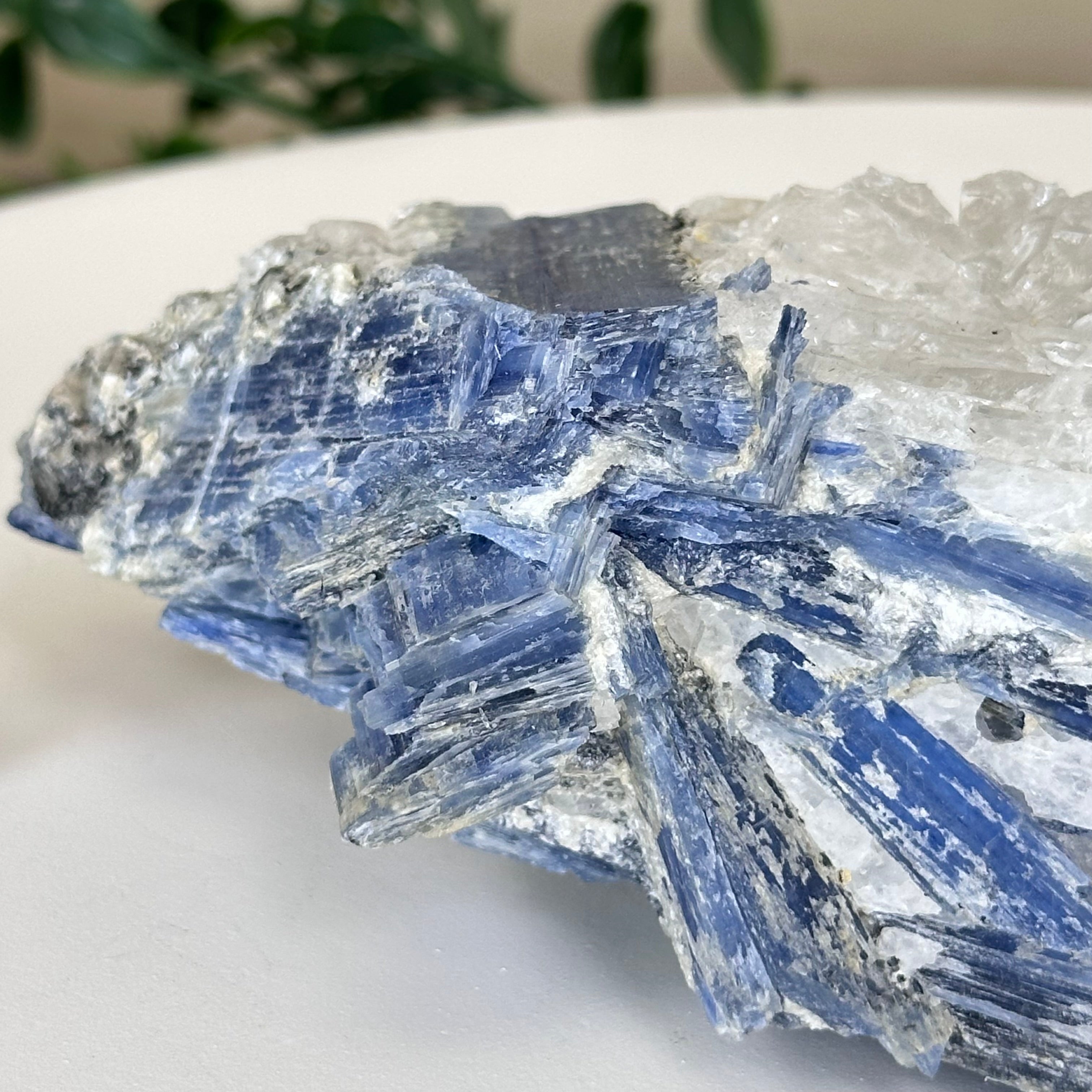 Kyanite clusters, characterized by their vivid blue hues and distinctive blade-like crystal formations, serve as striking natural accents in home décor.