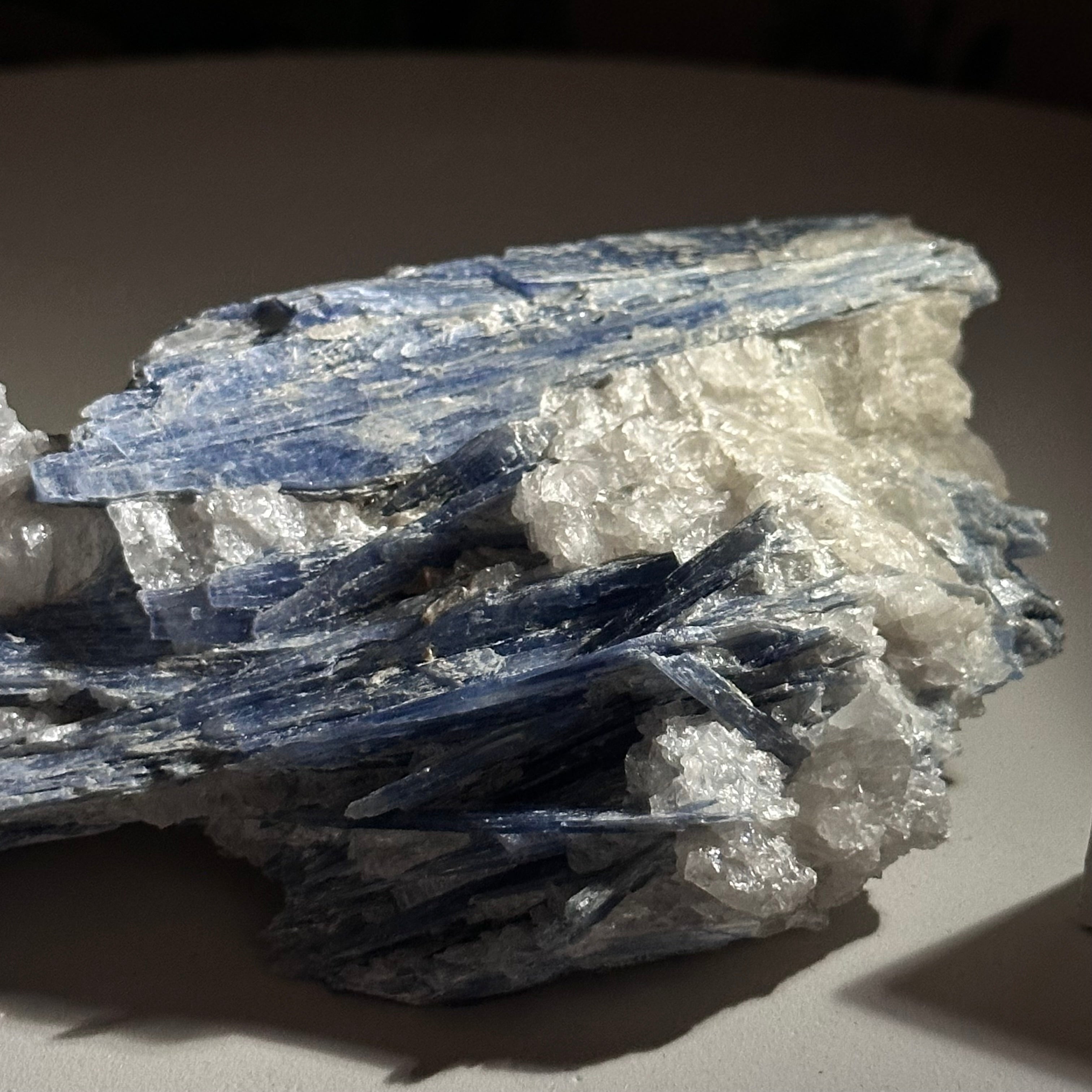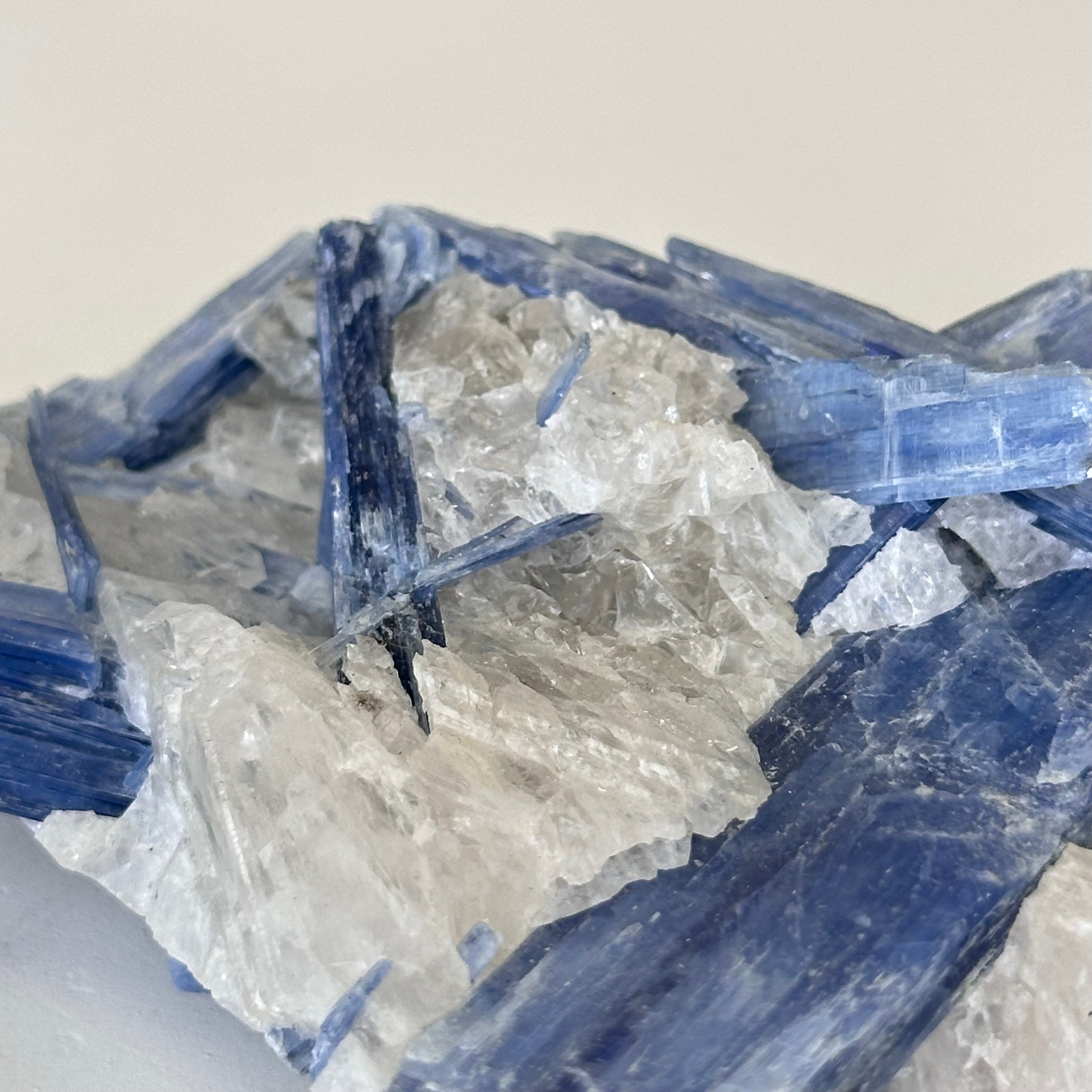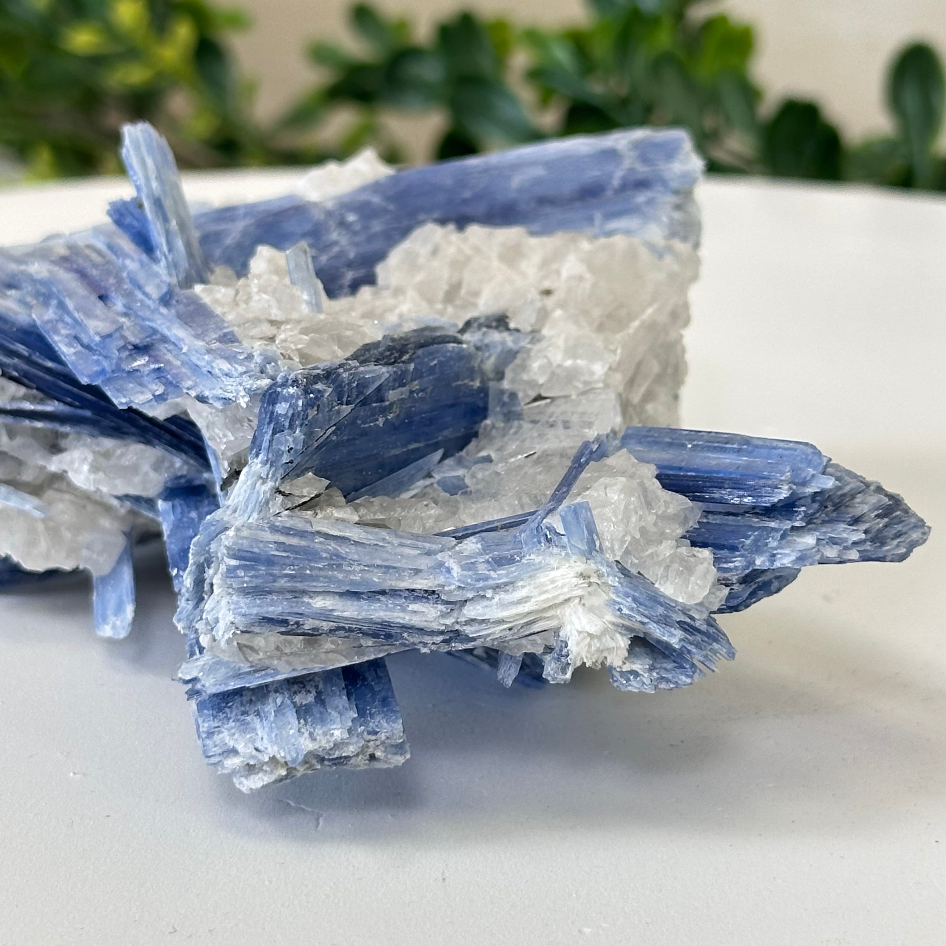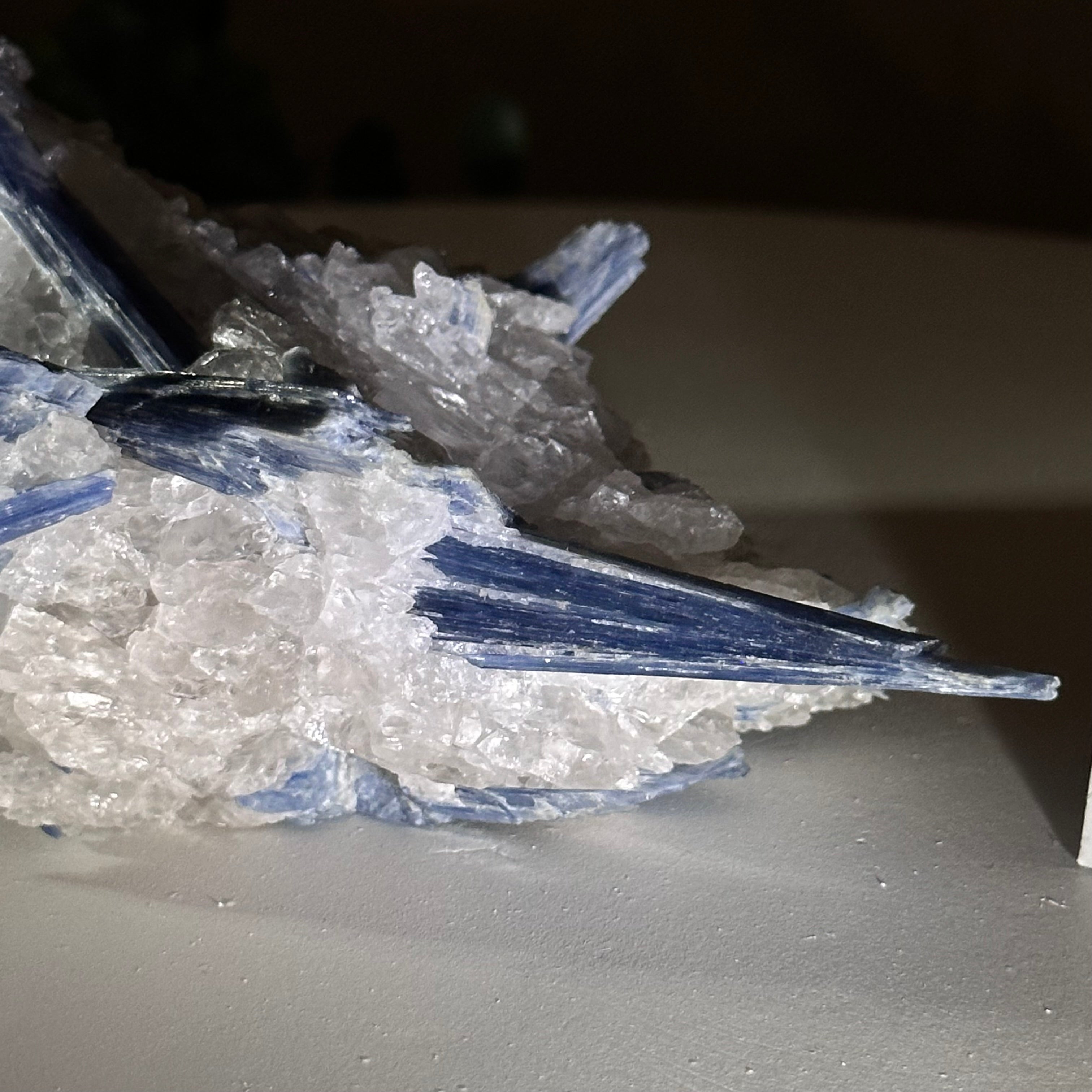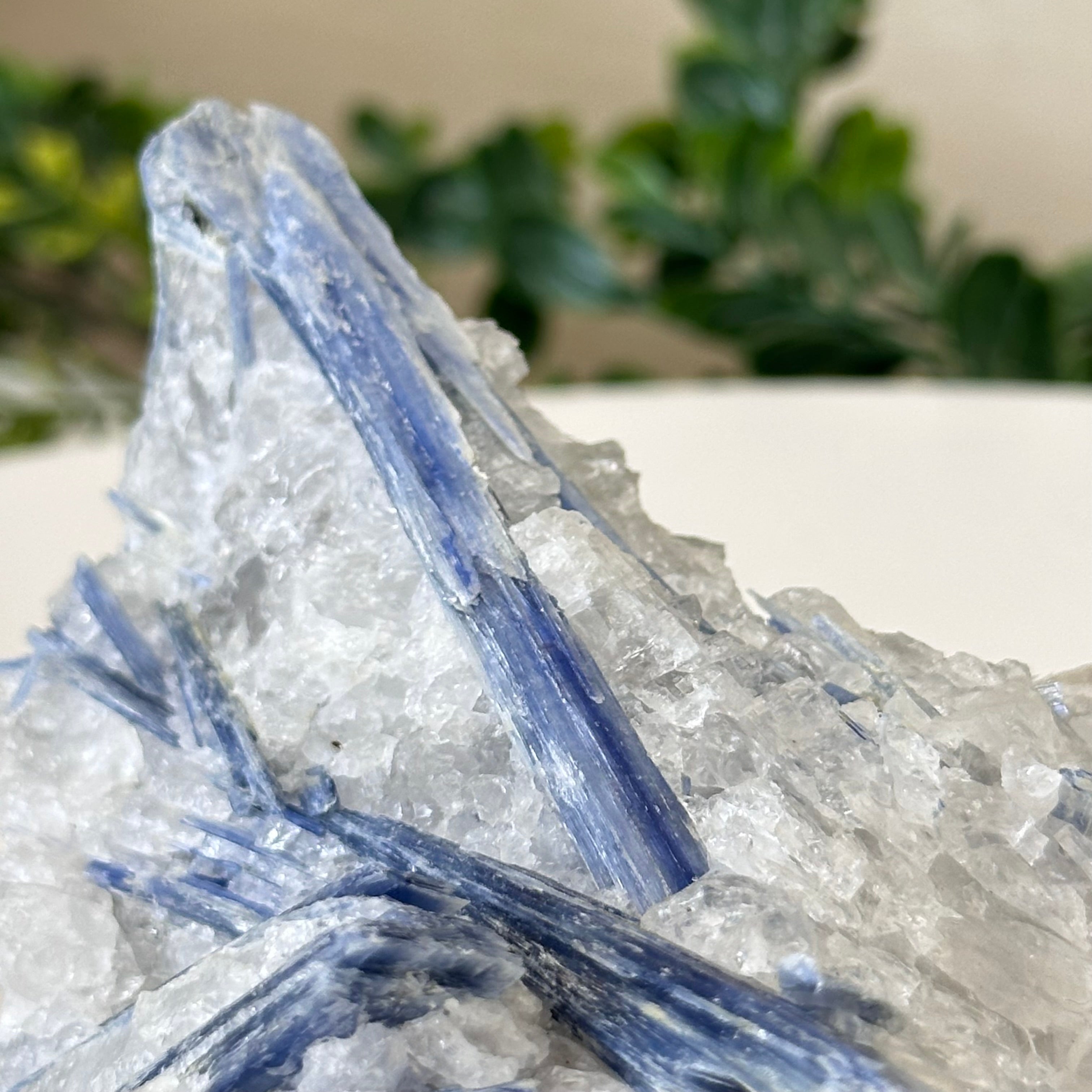 Kyanite clusters, characterized by their vivid blue hues and distinctive blade-like crystal formations, serve as striking natural accents in home décor.