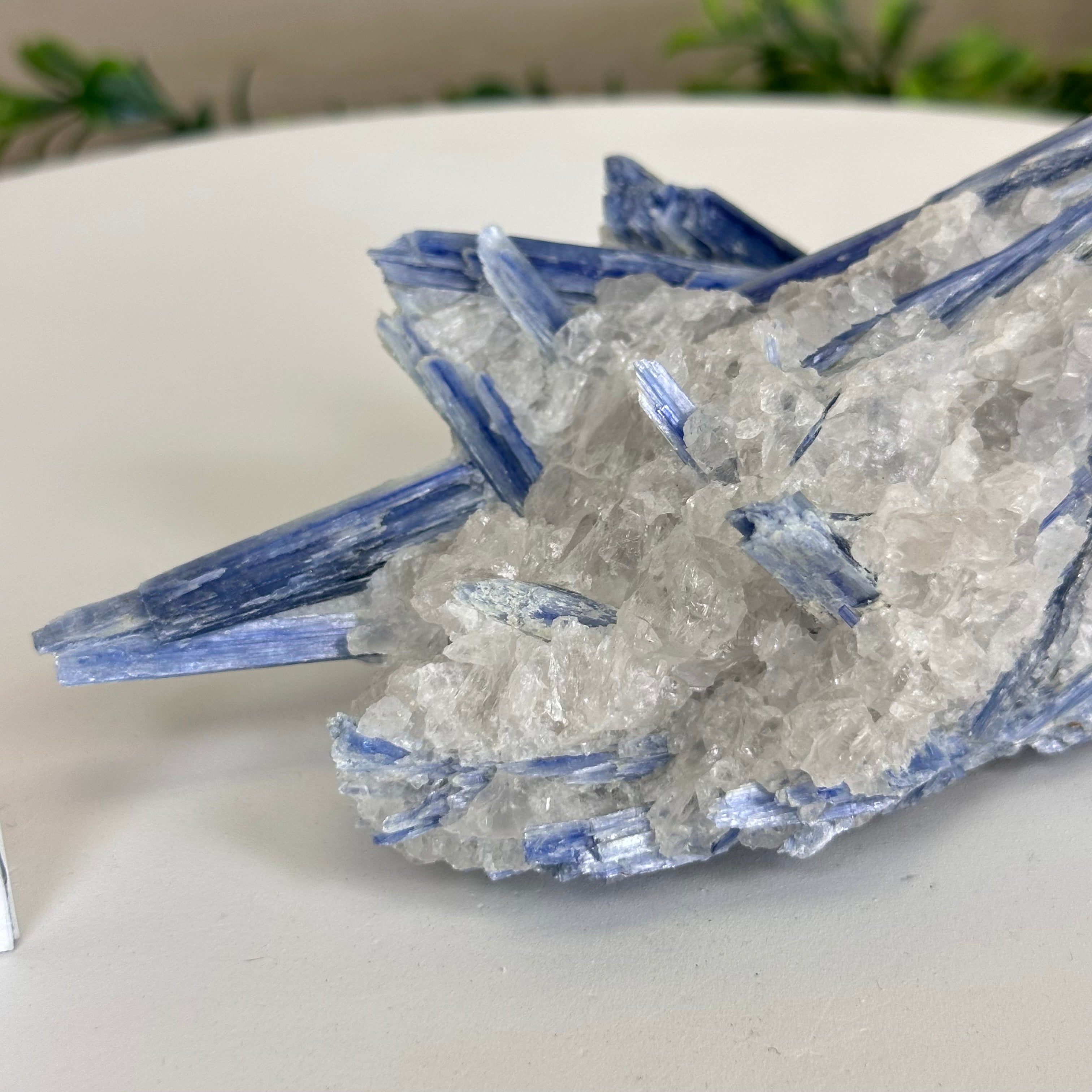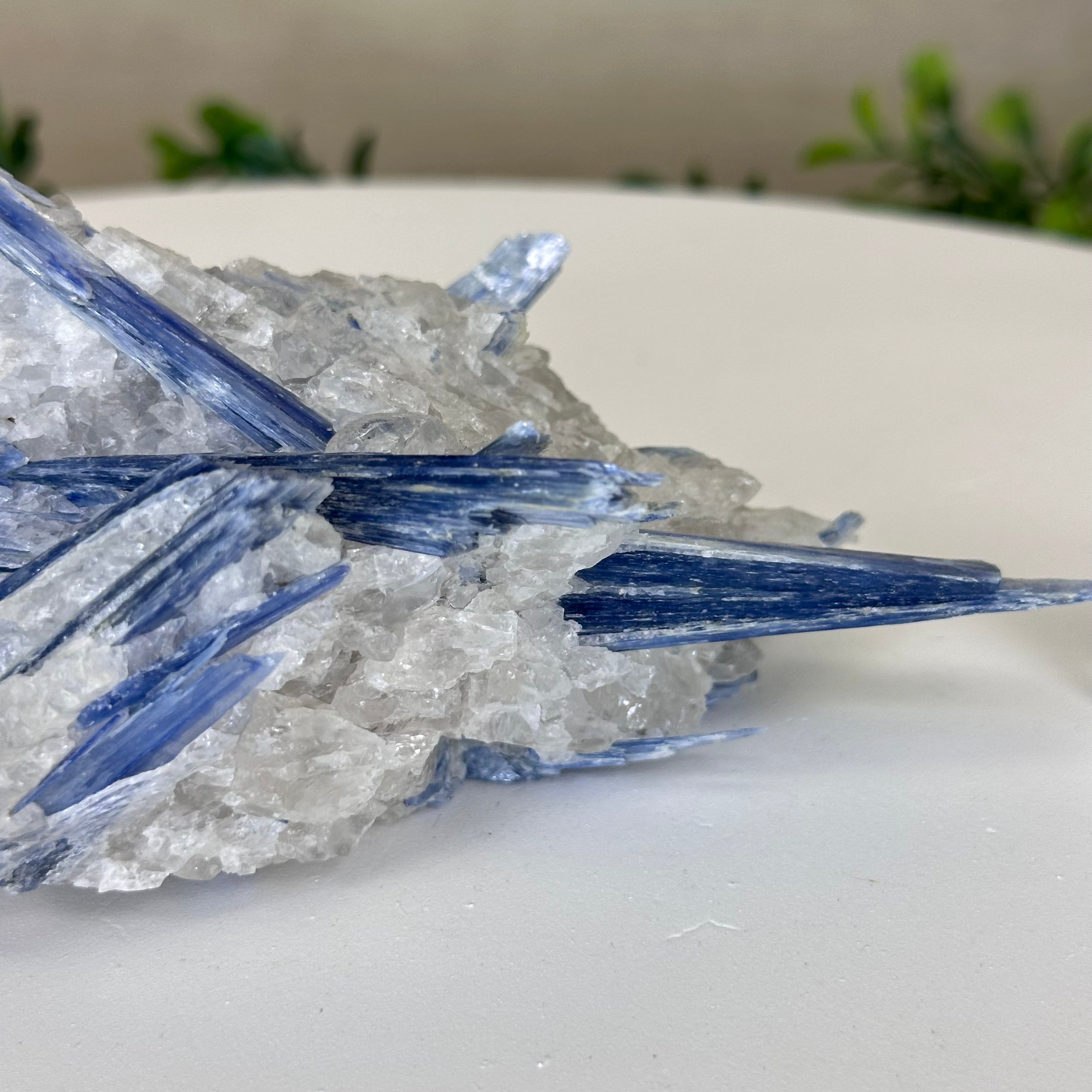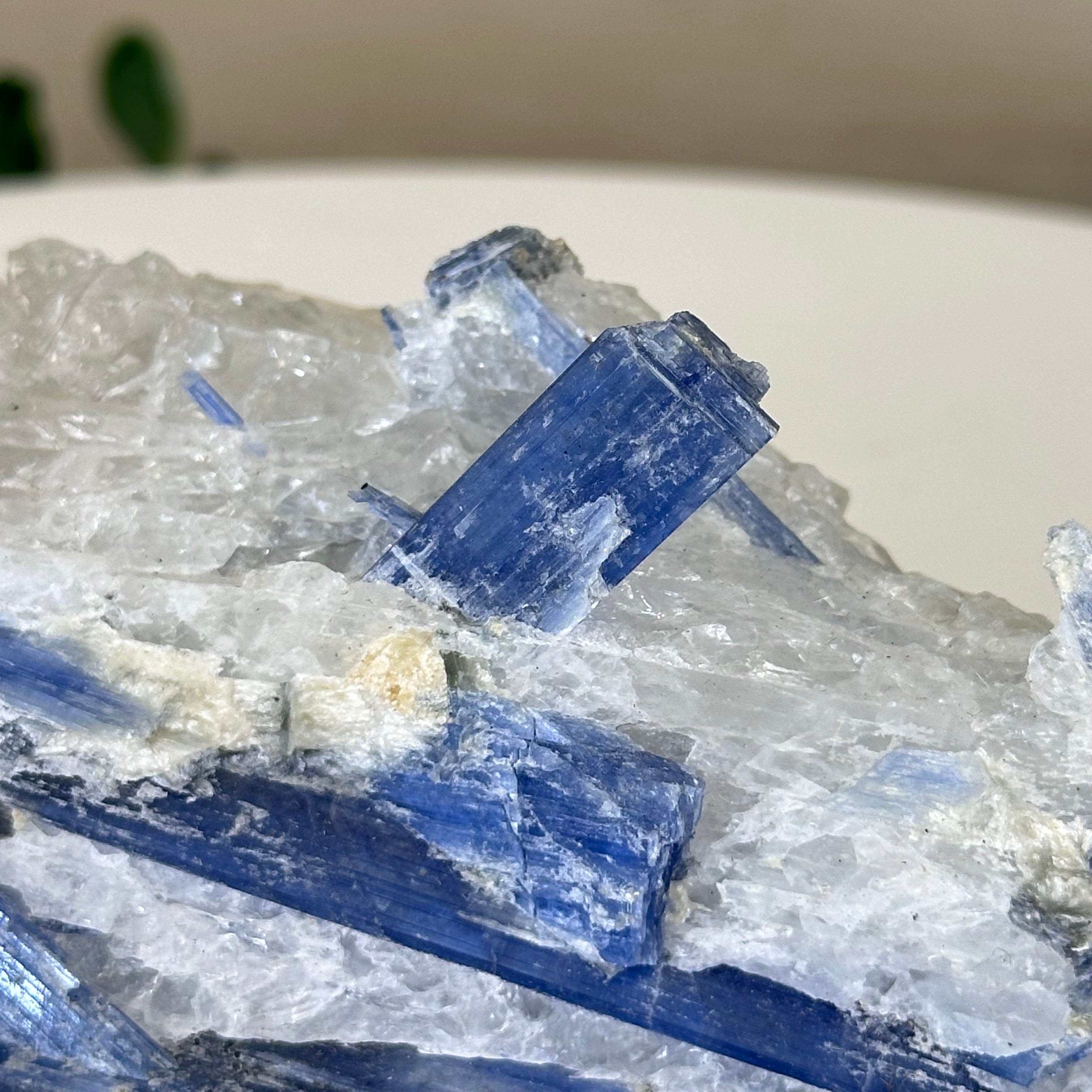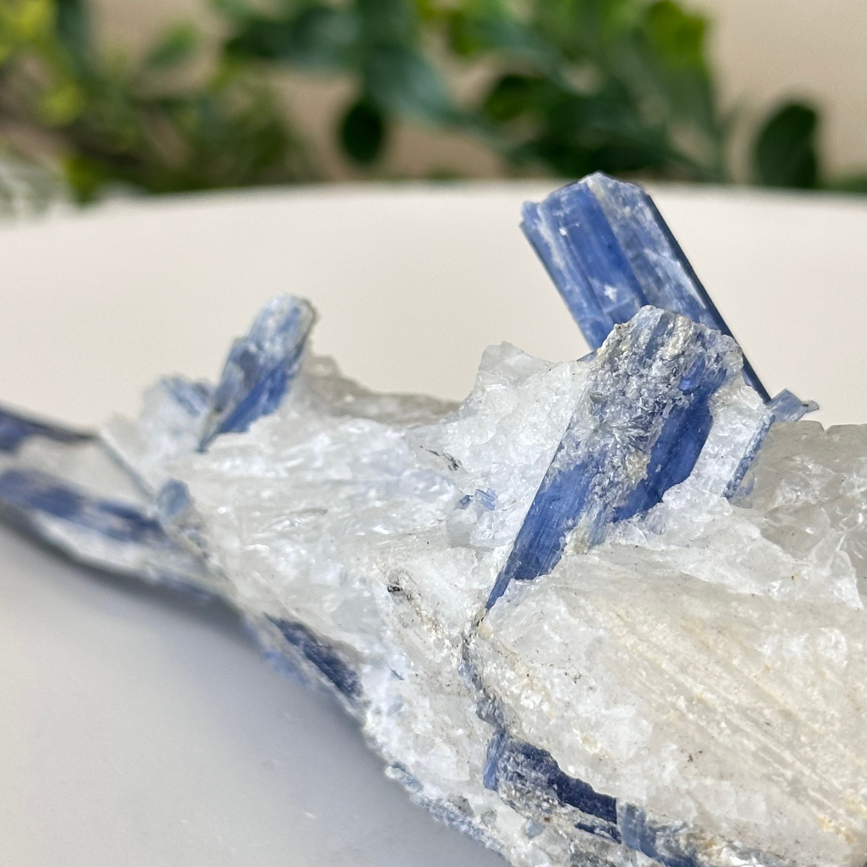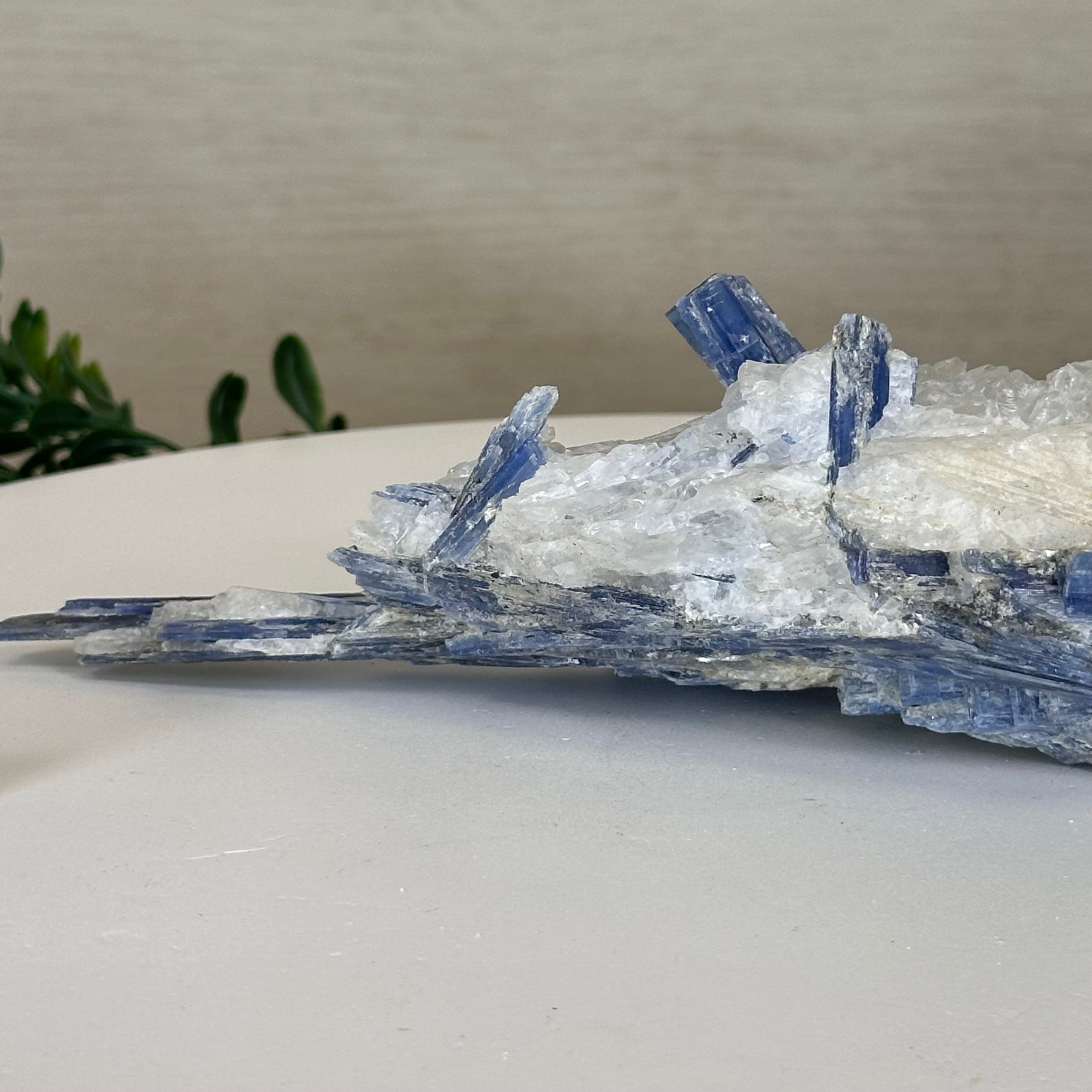 Kyanite clusters, characterized by their vivid blue hues and distinctive blade-like crystal formations, serve as striking natural accents in home décor.