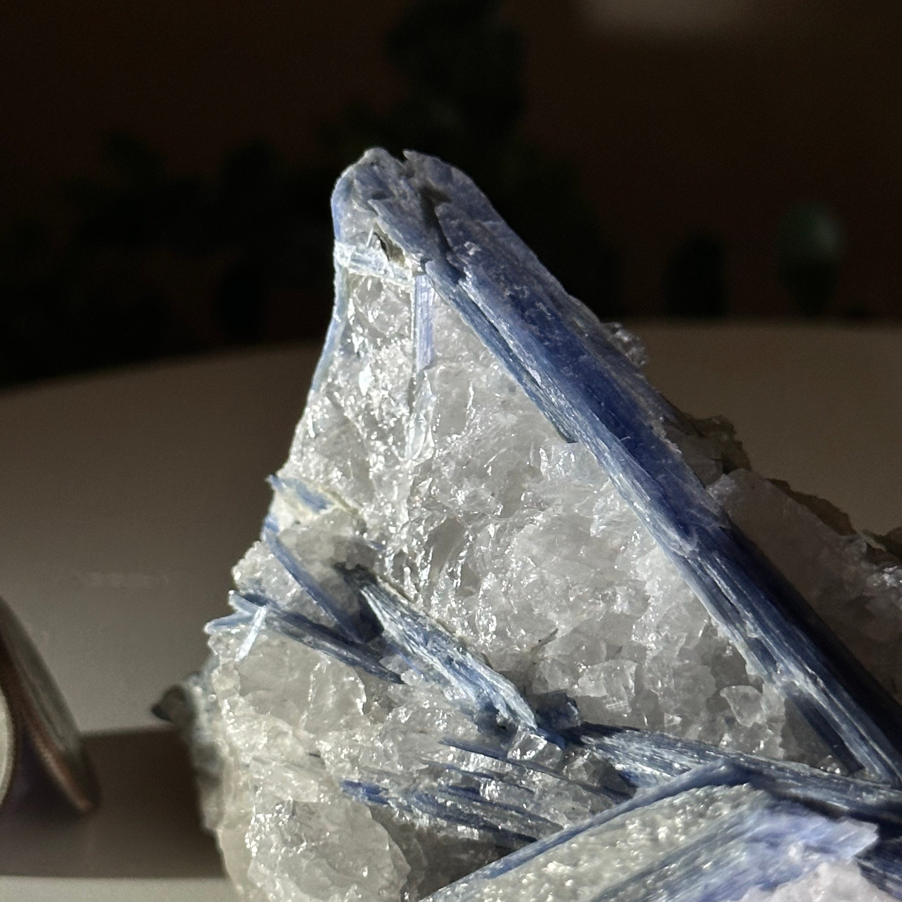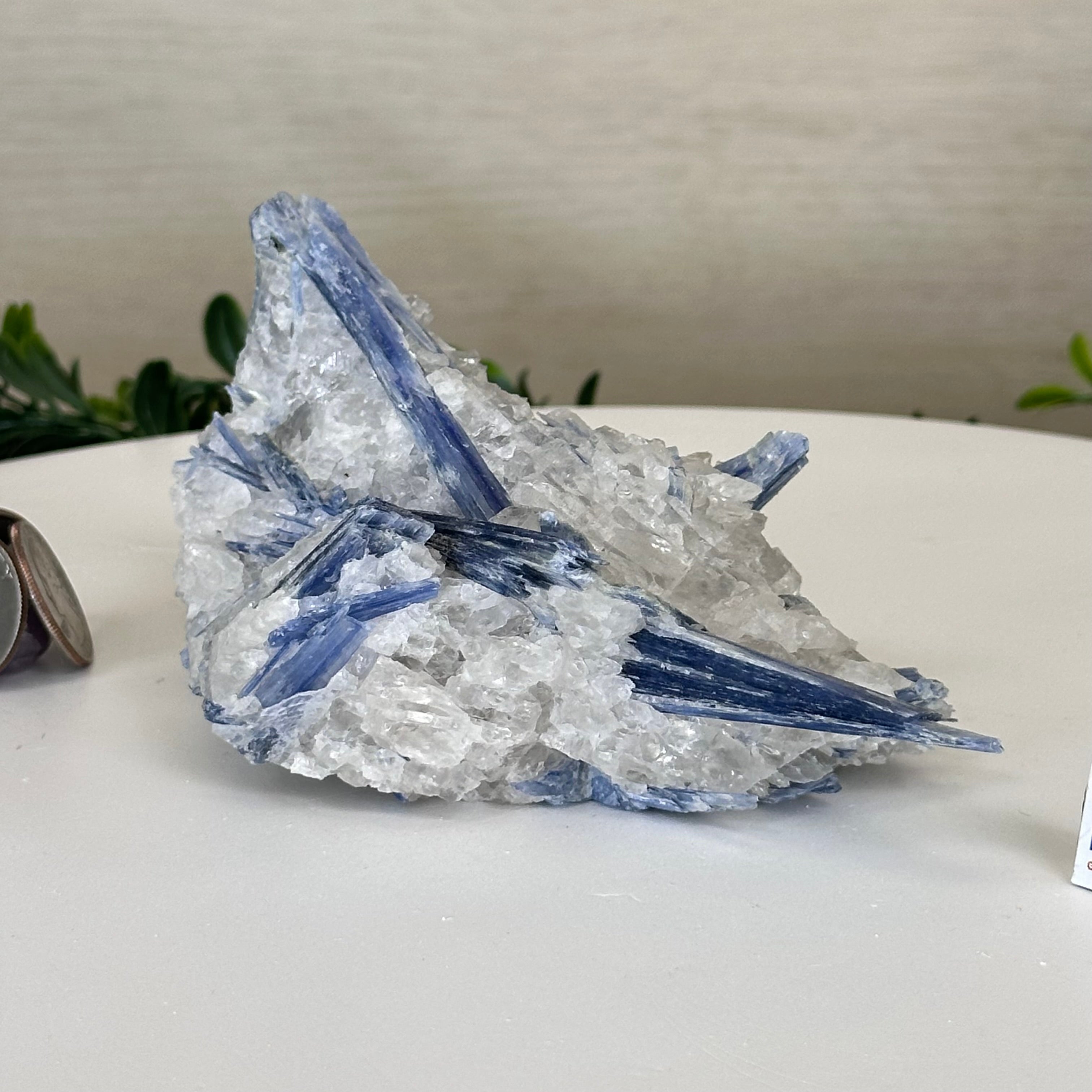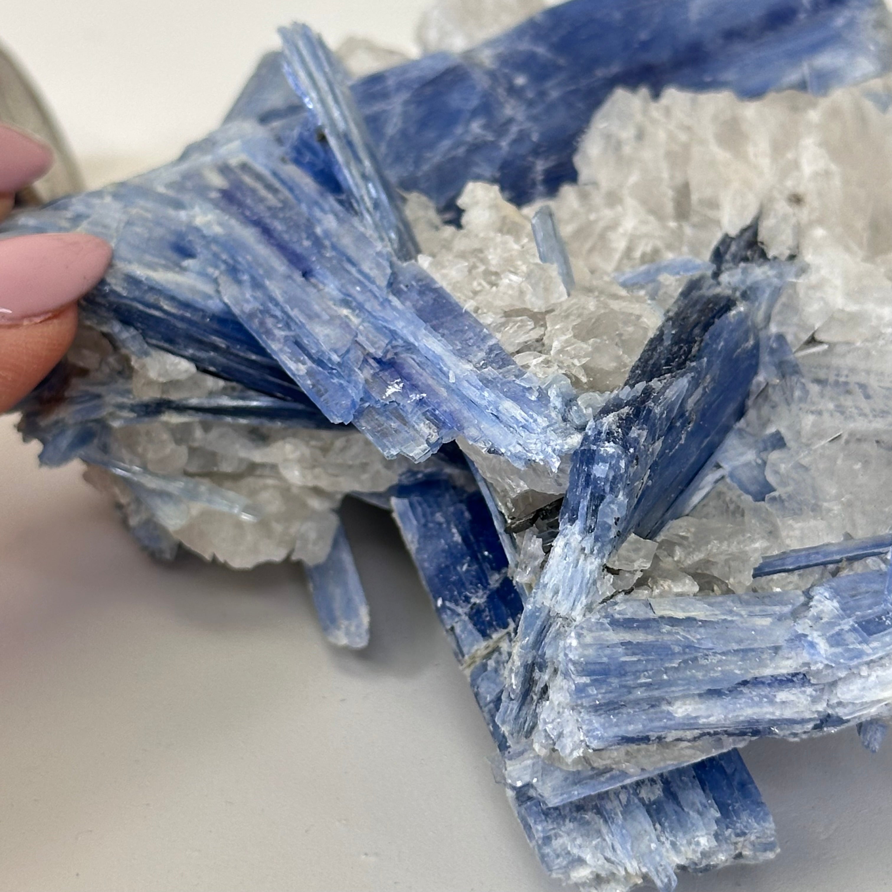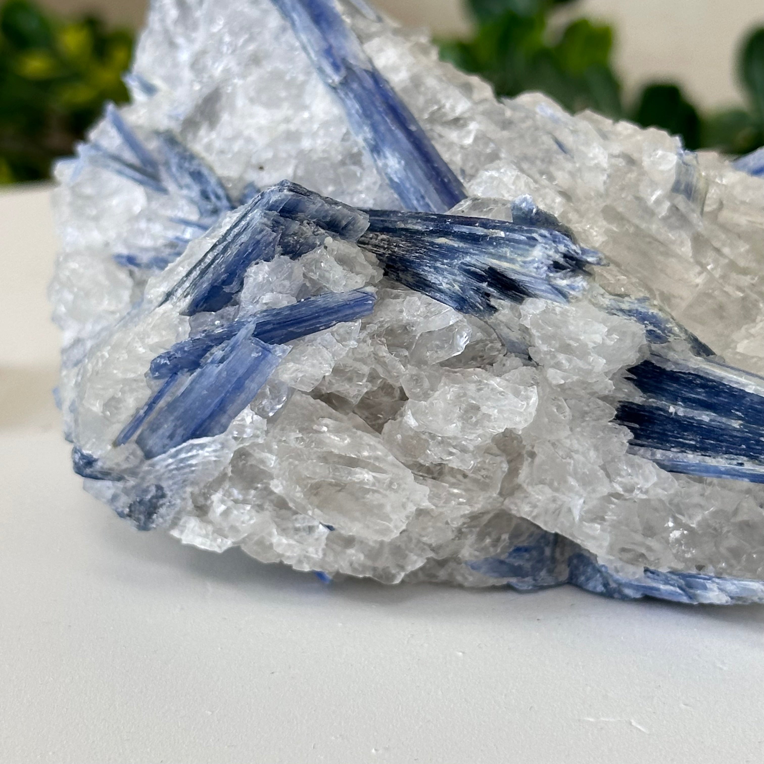 Kyanite clusters, characterized by their vivid blue hues and distinctive blade-like crystal formations, serve as striking natural accents in home décor.