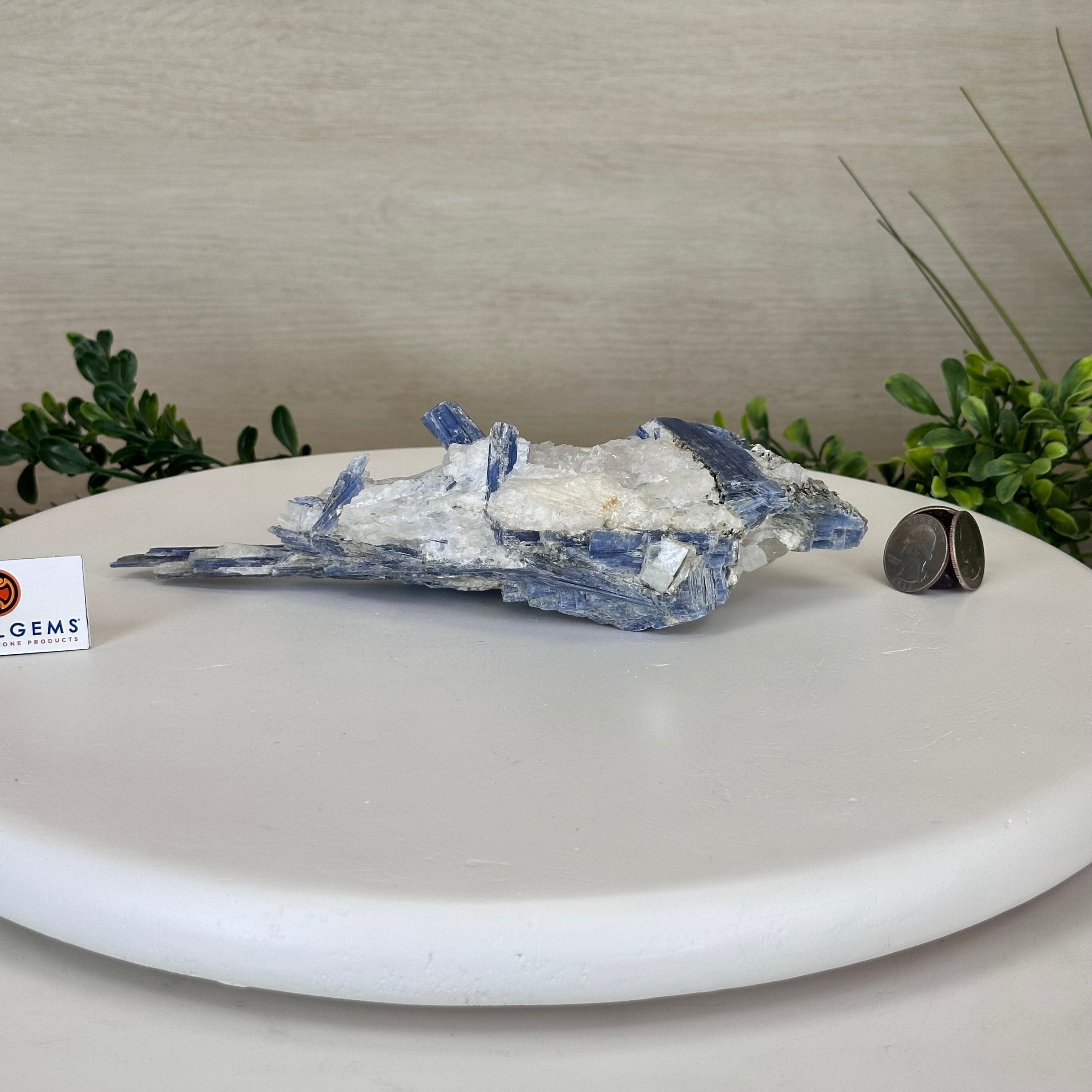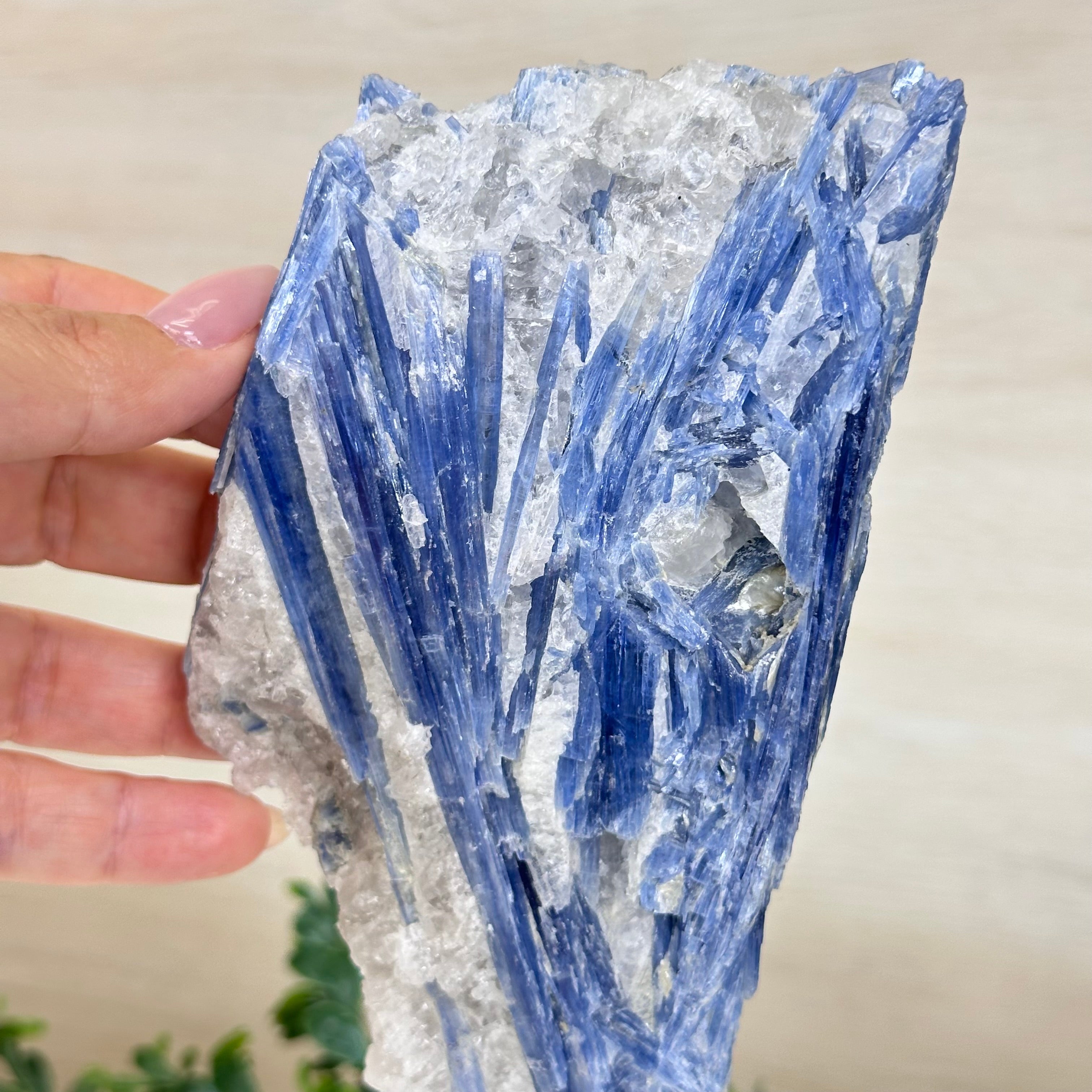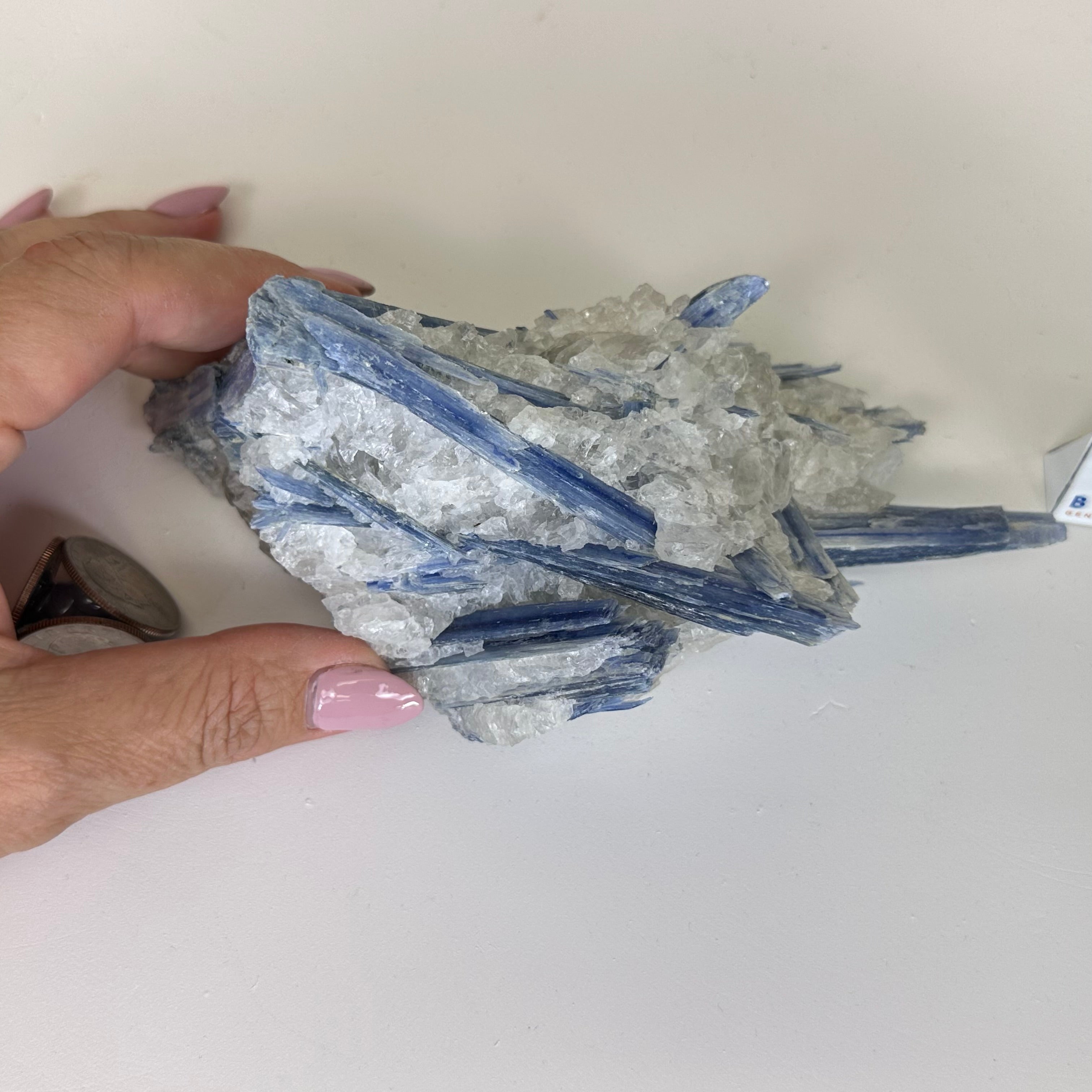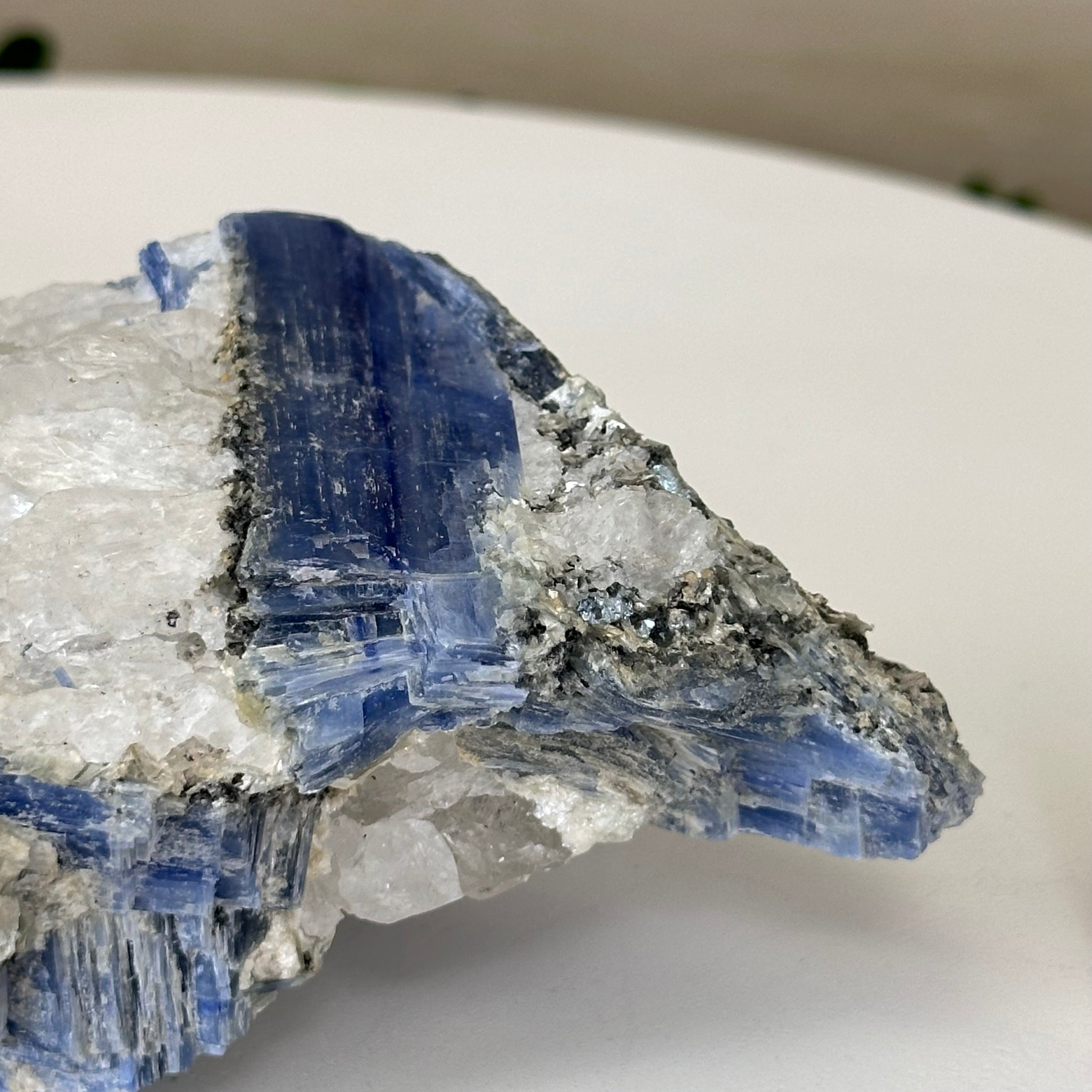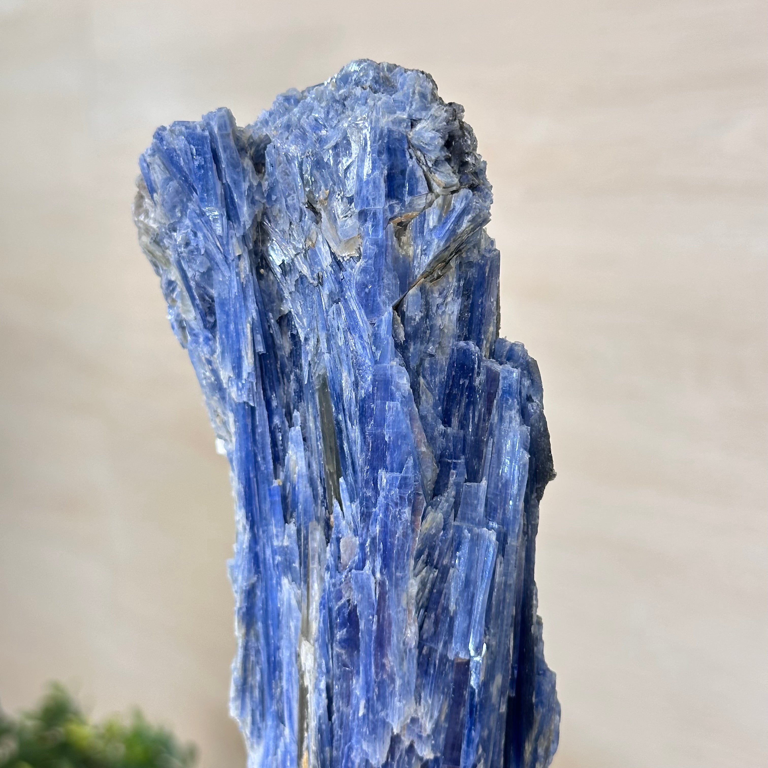Kyanite clusters, characterized by their vivid blue hues and distinctive blade-like crystal formations, serve as striking natural accents in home décor.